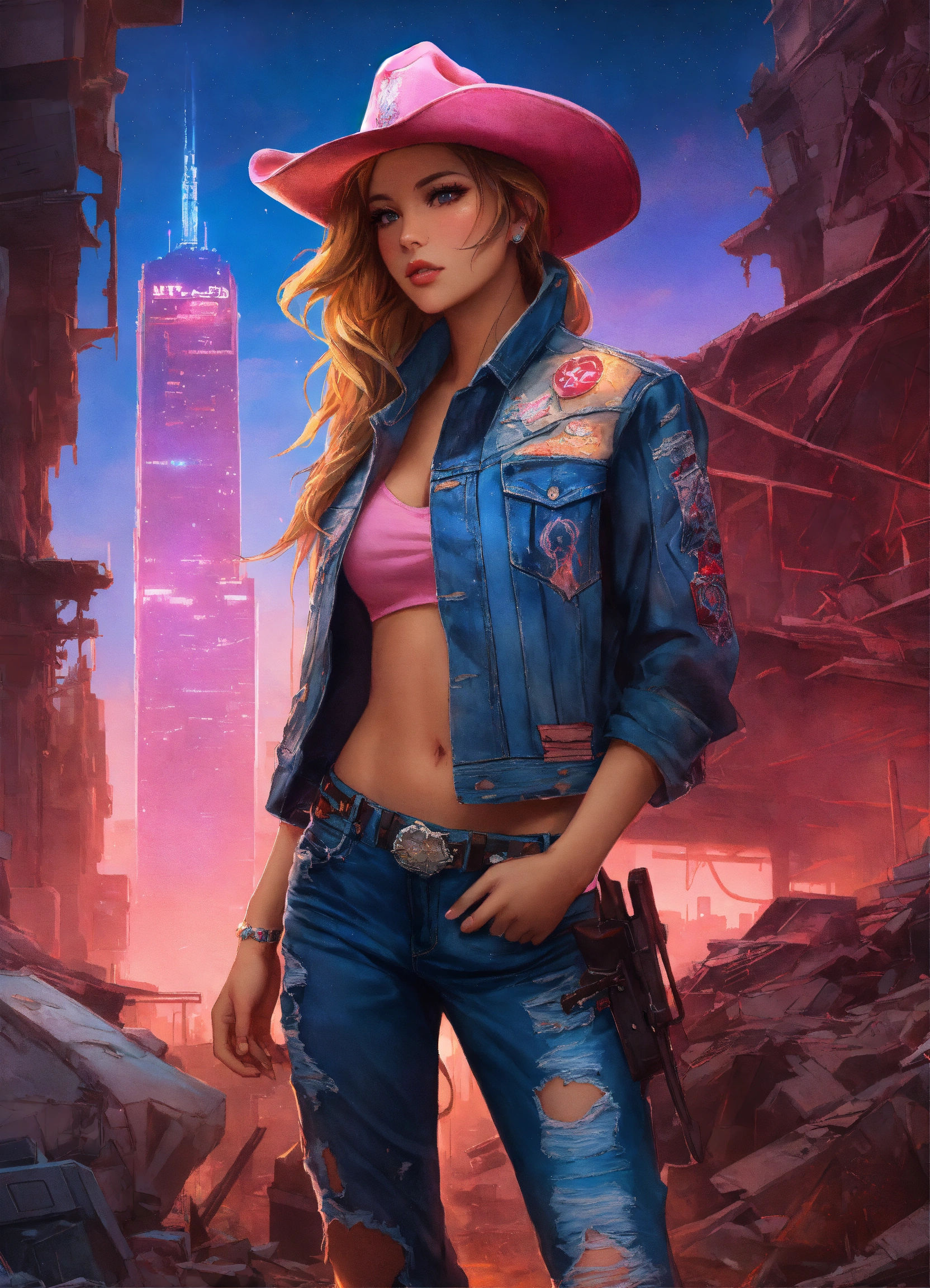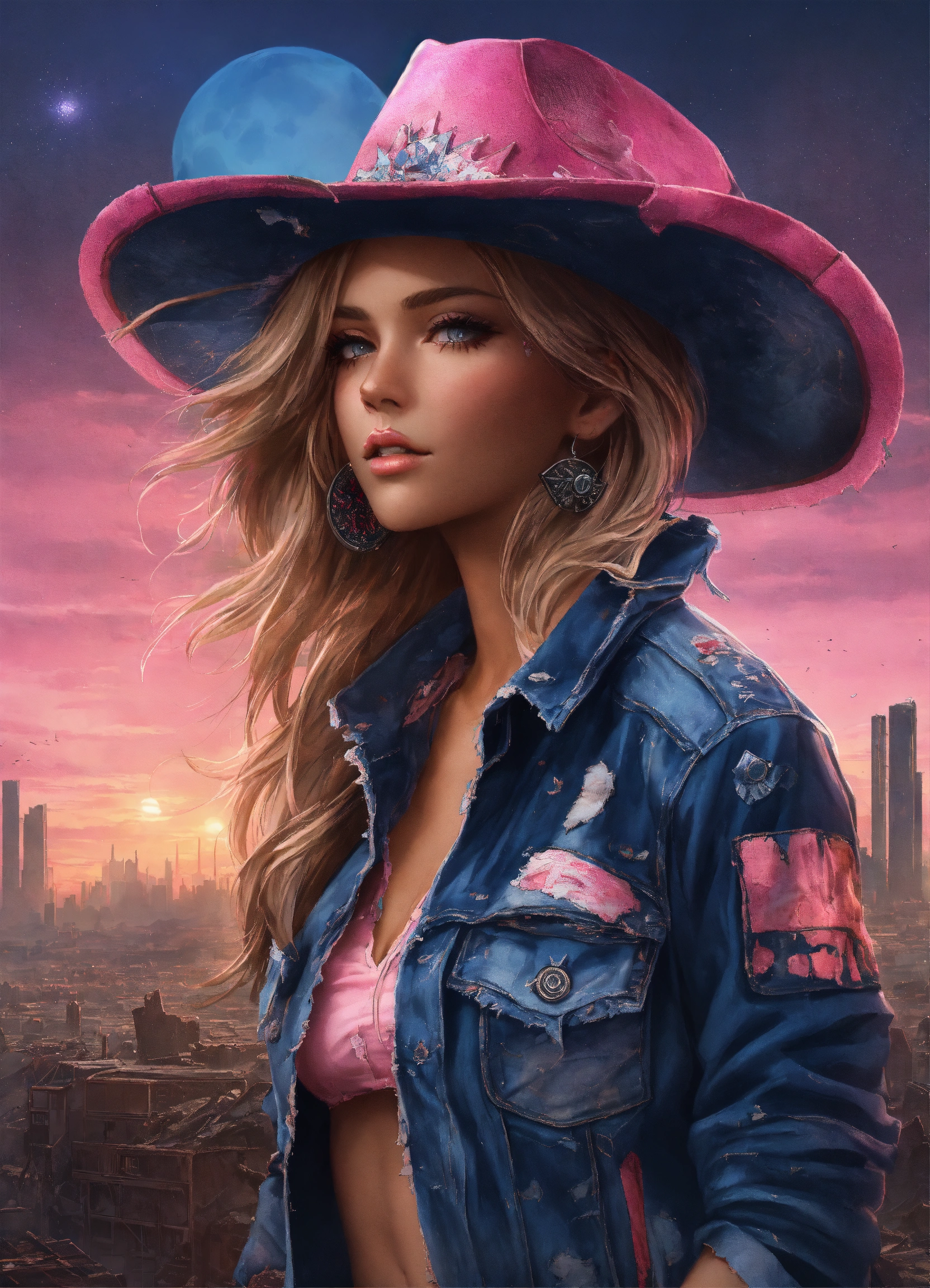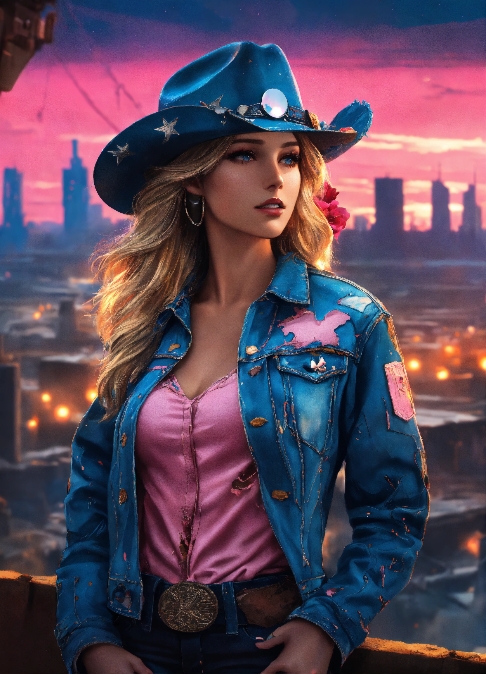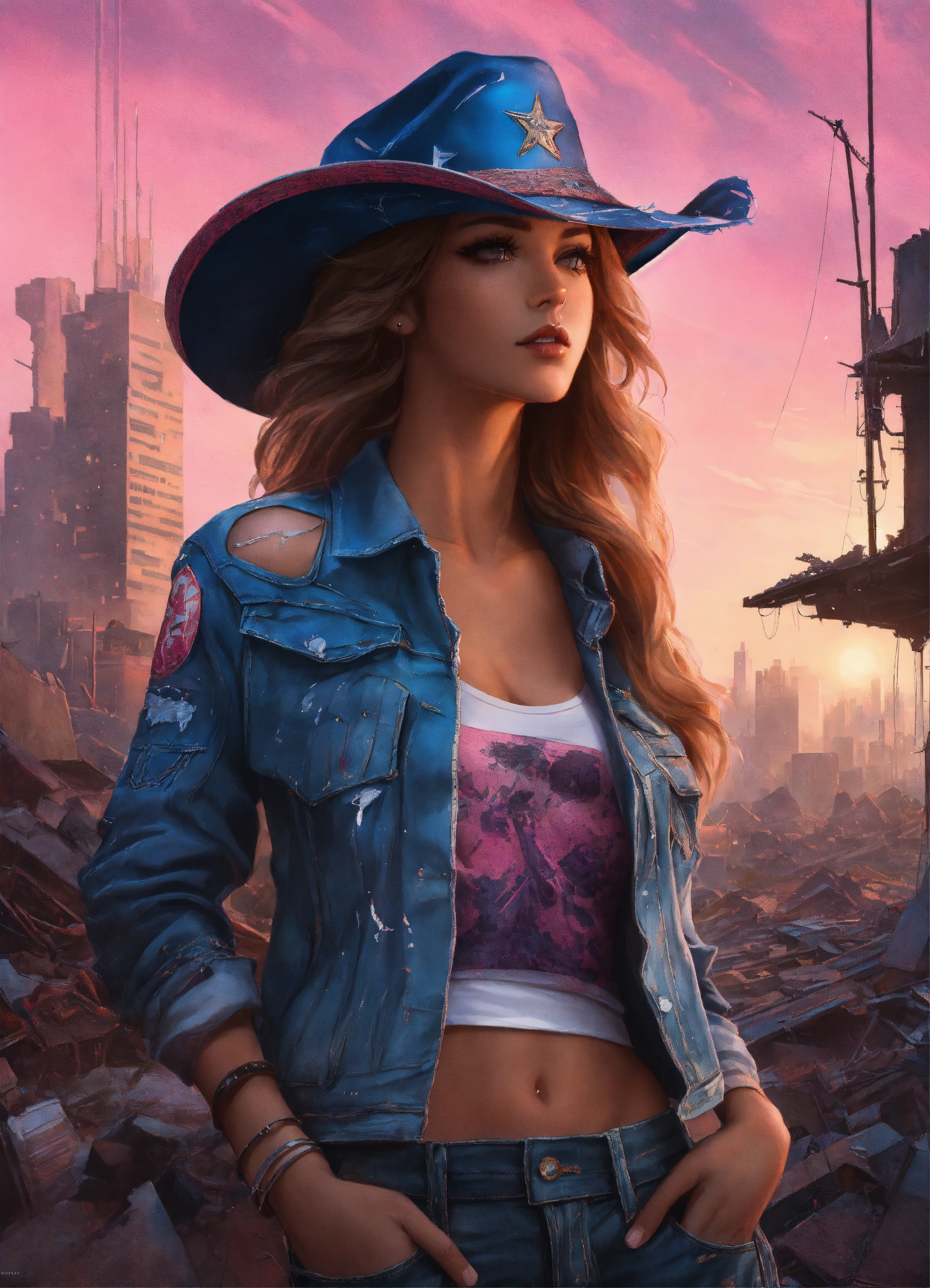 A southern beauty queen wearing a tattered, torn denim jacket and a cowboy hat. the scene is set in the ruins of a futuristic cyberpunk cityscape, in a cyberpunk dystopia rising above the great plains, with the midnight blue star-studded night sky turning into a pink dawn as the sun rises. the artwork is highly detailed and intricate, this piece is trending on artstation
