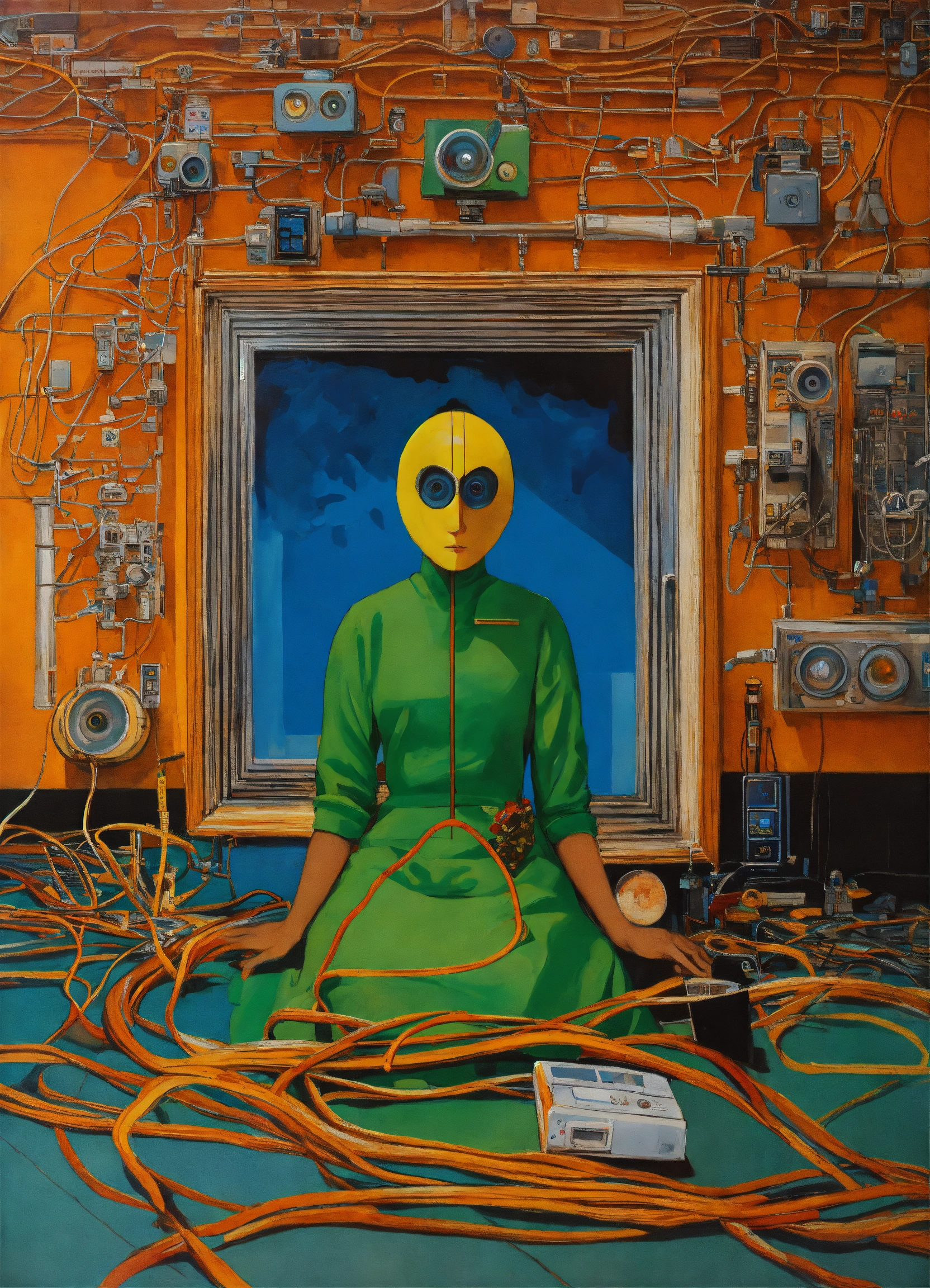 Masterpiece fine art photography harpers bazaar about naive art, post internet cybernetic cctv cables dystopian painting 16k