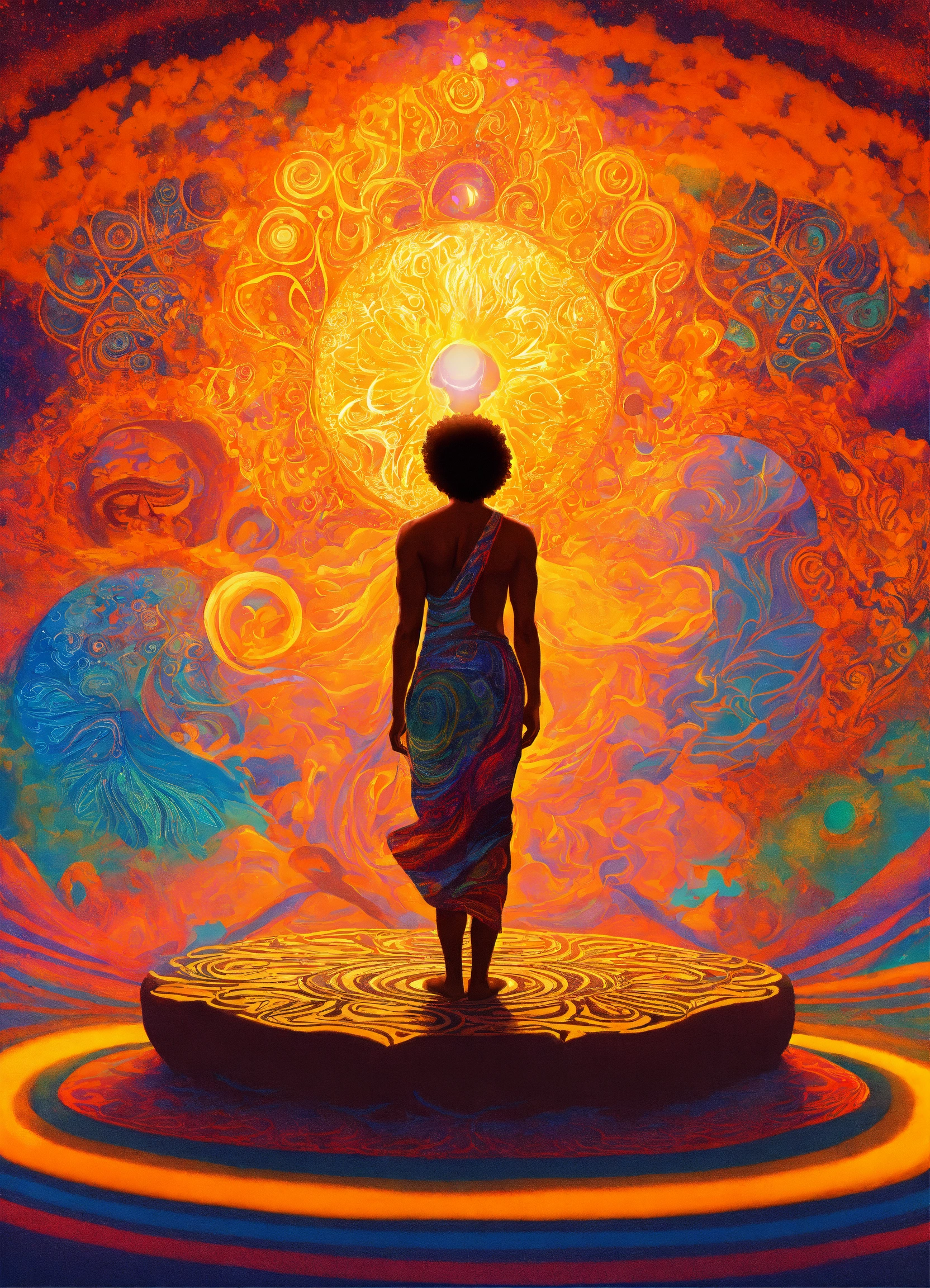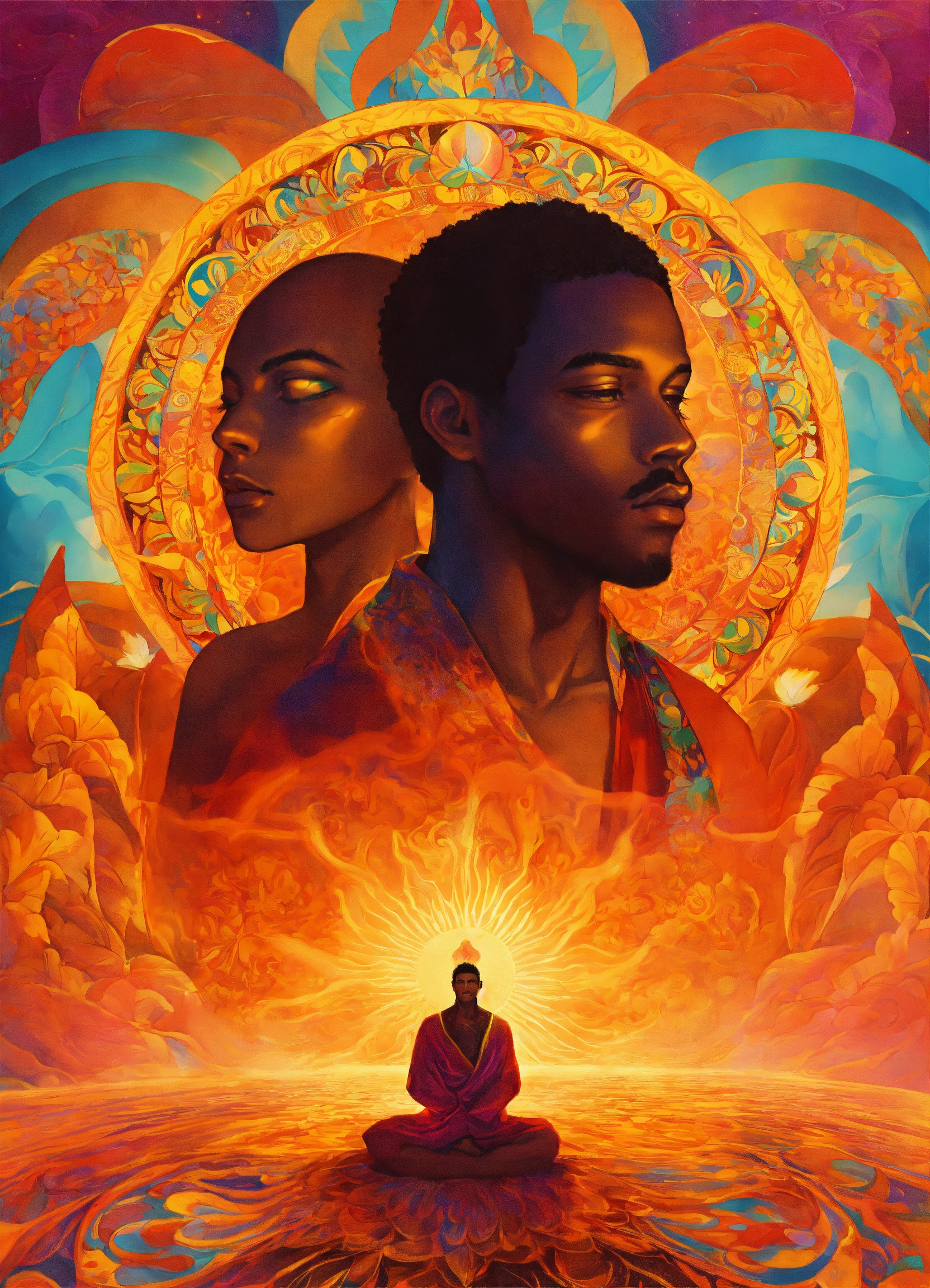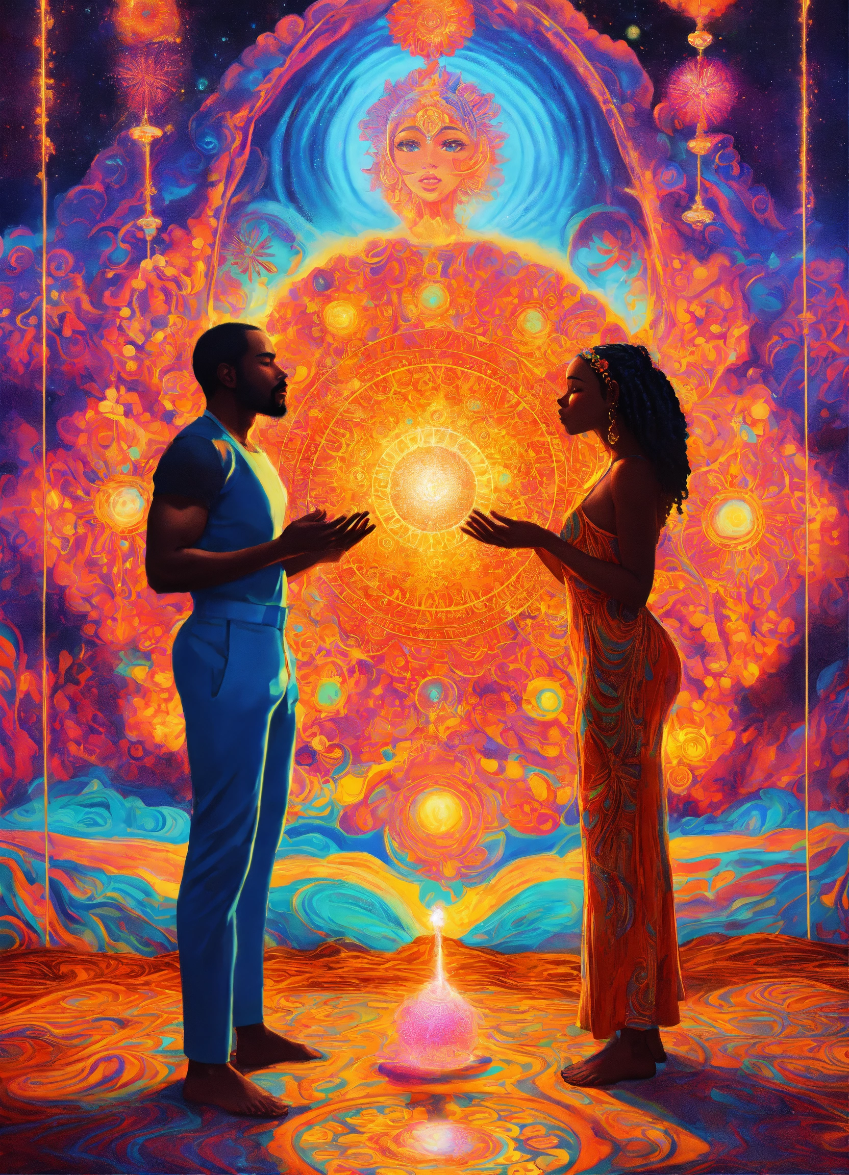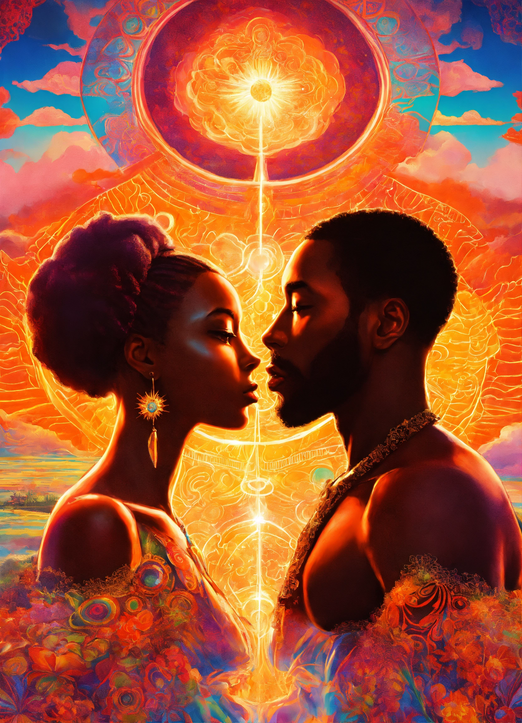 Psychedelic art image of black man and woman receiving spiritual enlightenment