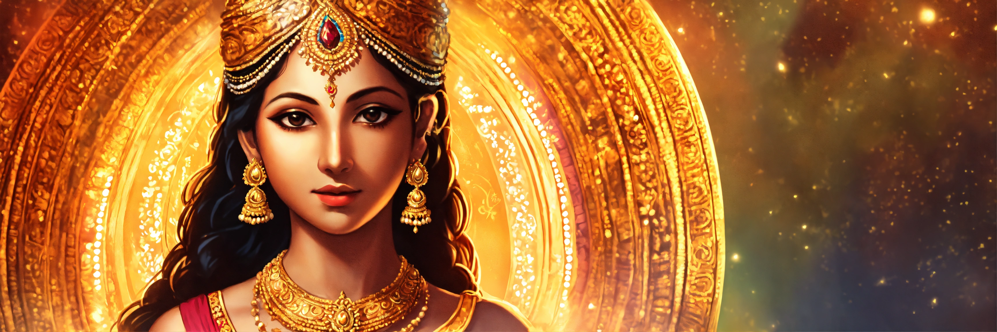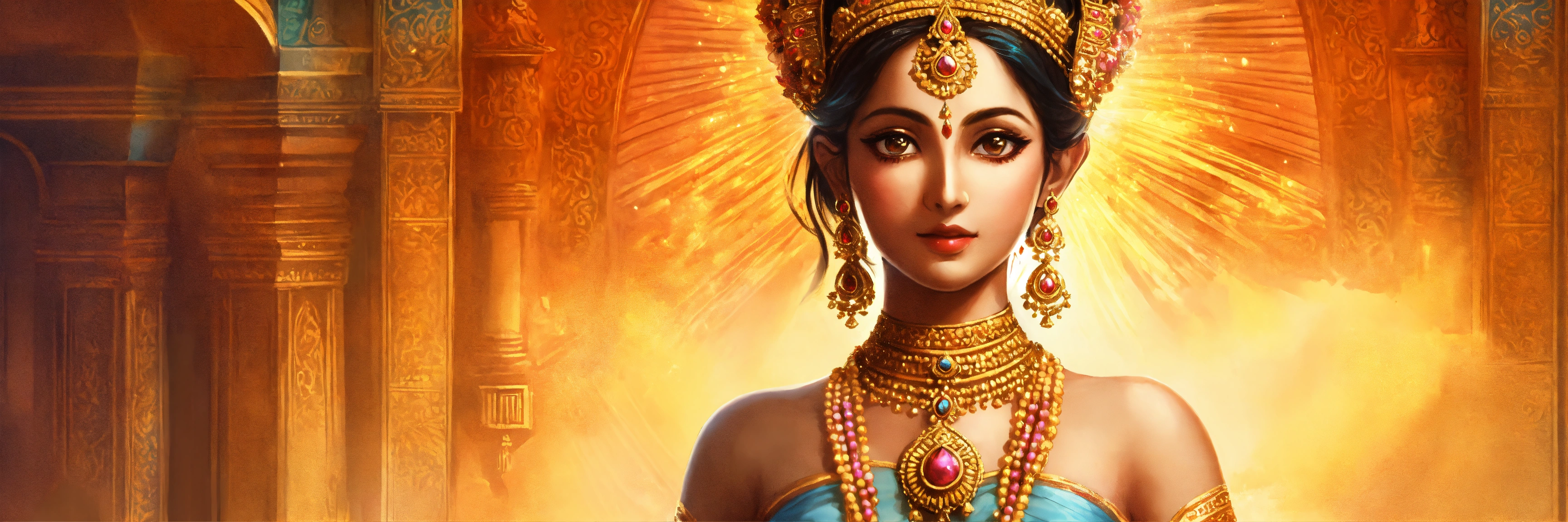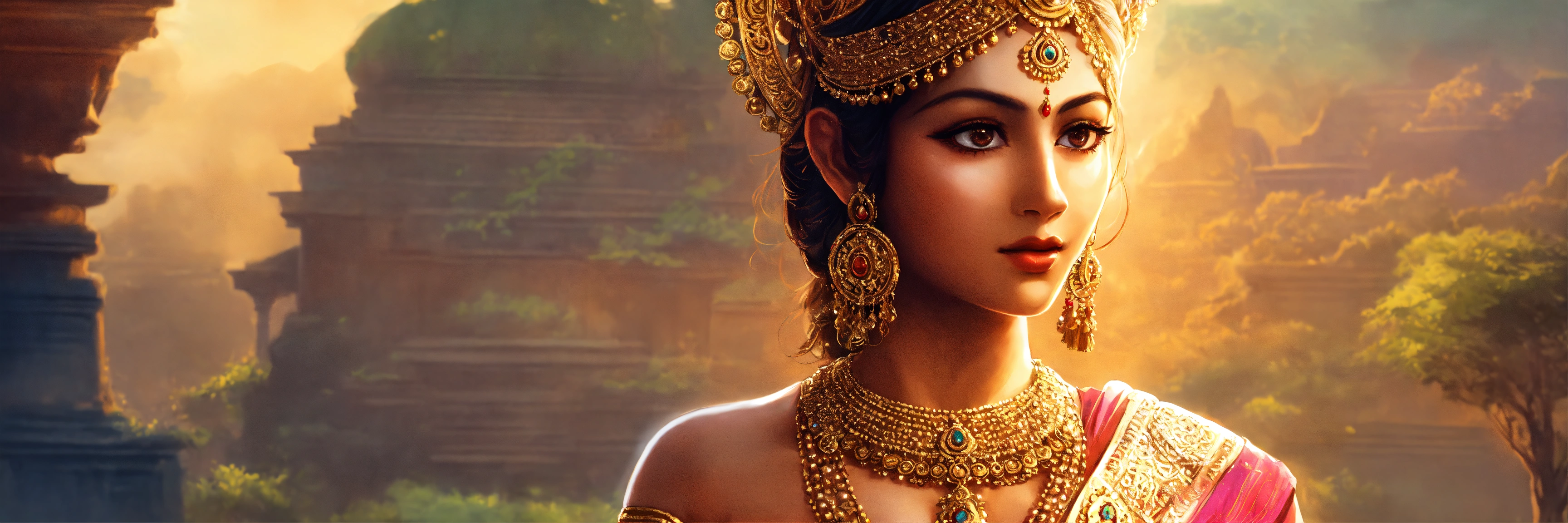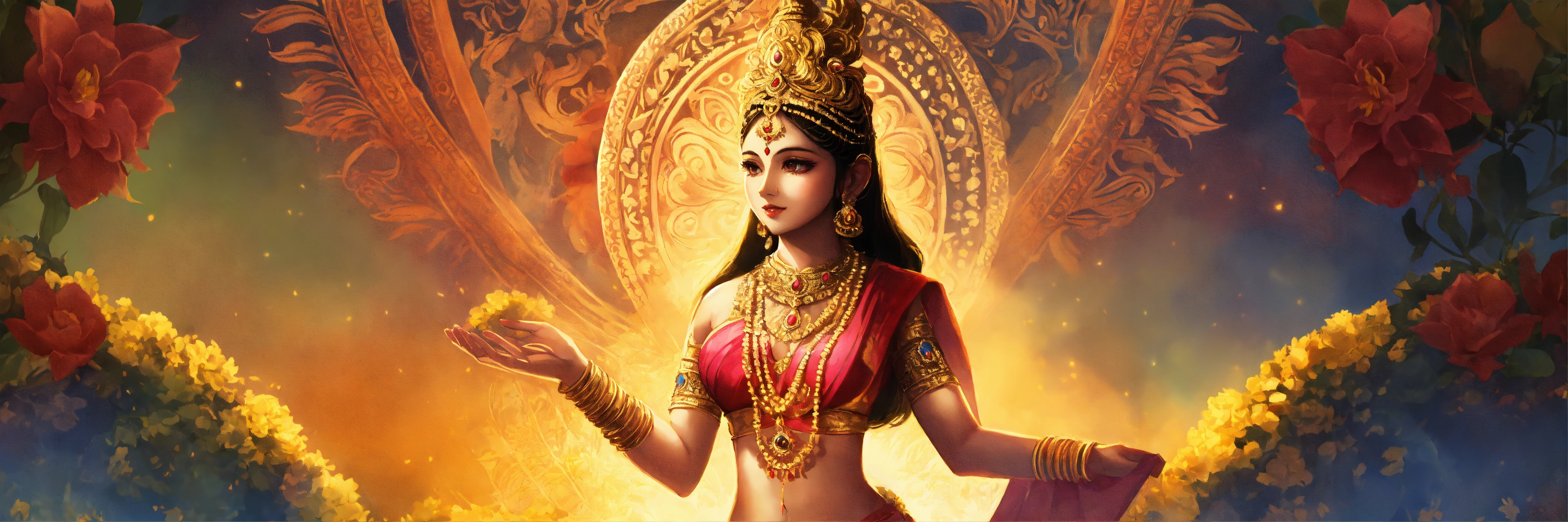 Llustration of an apsara from hindu mythology. she radiates an ethereal beauty and divine aura, standing gracefully with a slender form. her attire is a traditional celestial garment adorned with heavenly jewelry, and her presence captivates the viewer with its otherworldly charm.