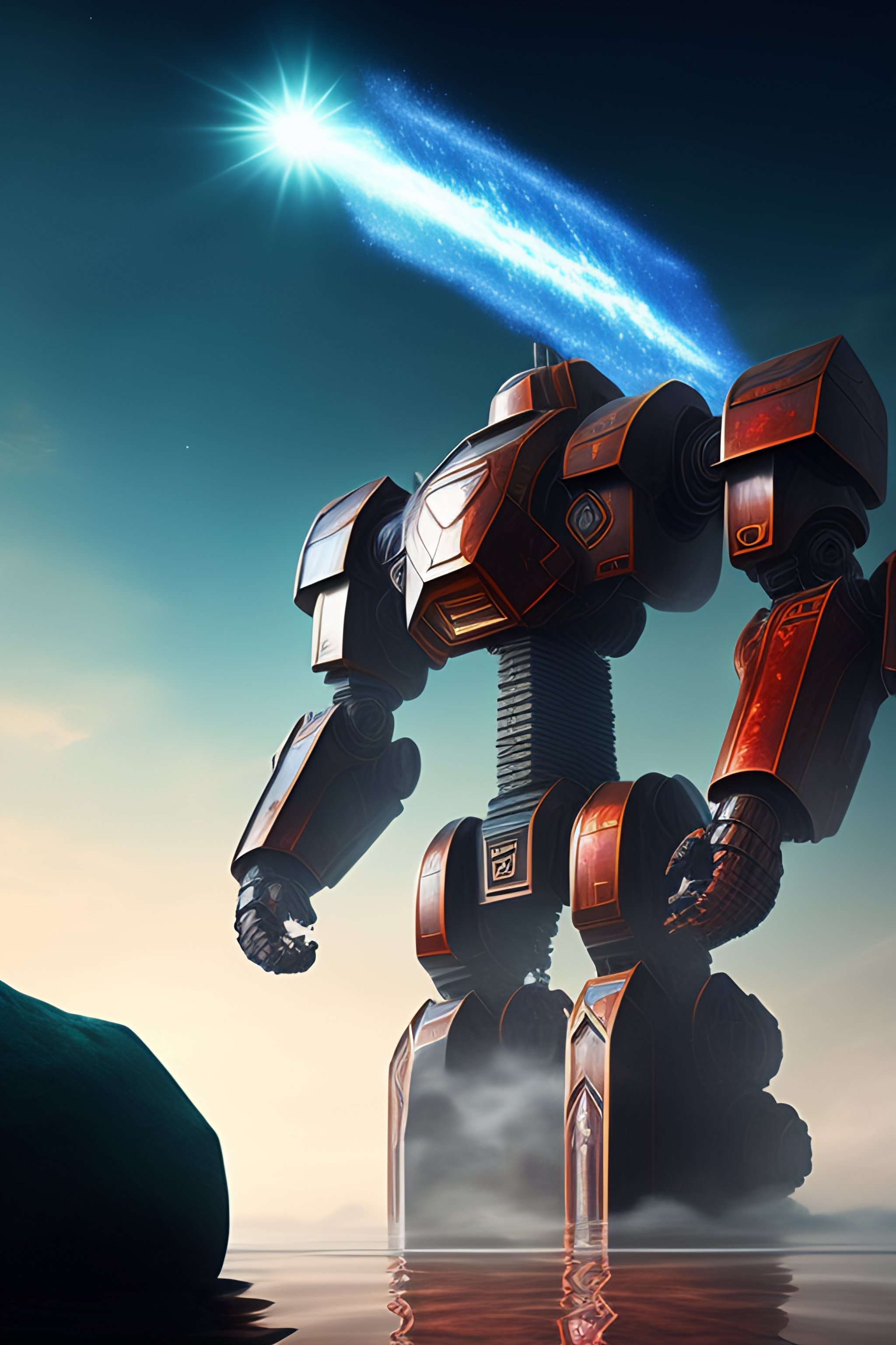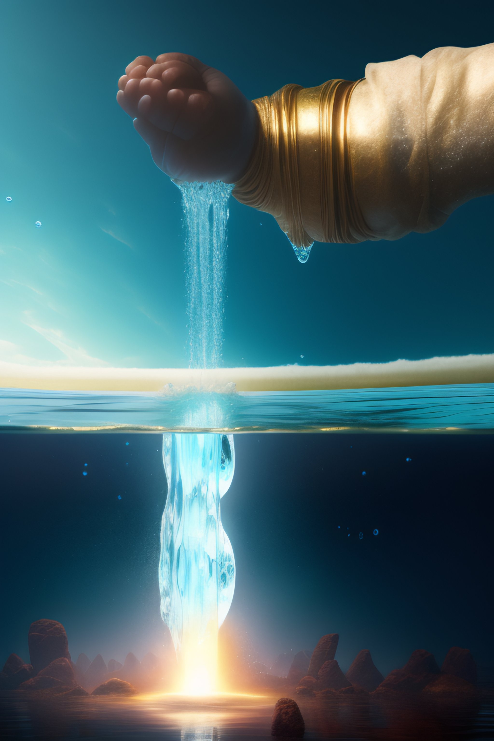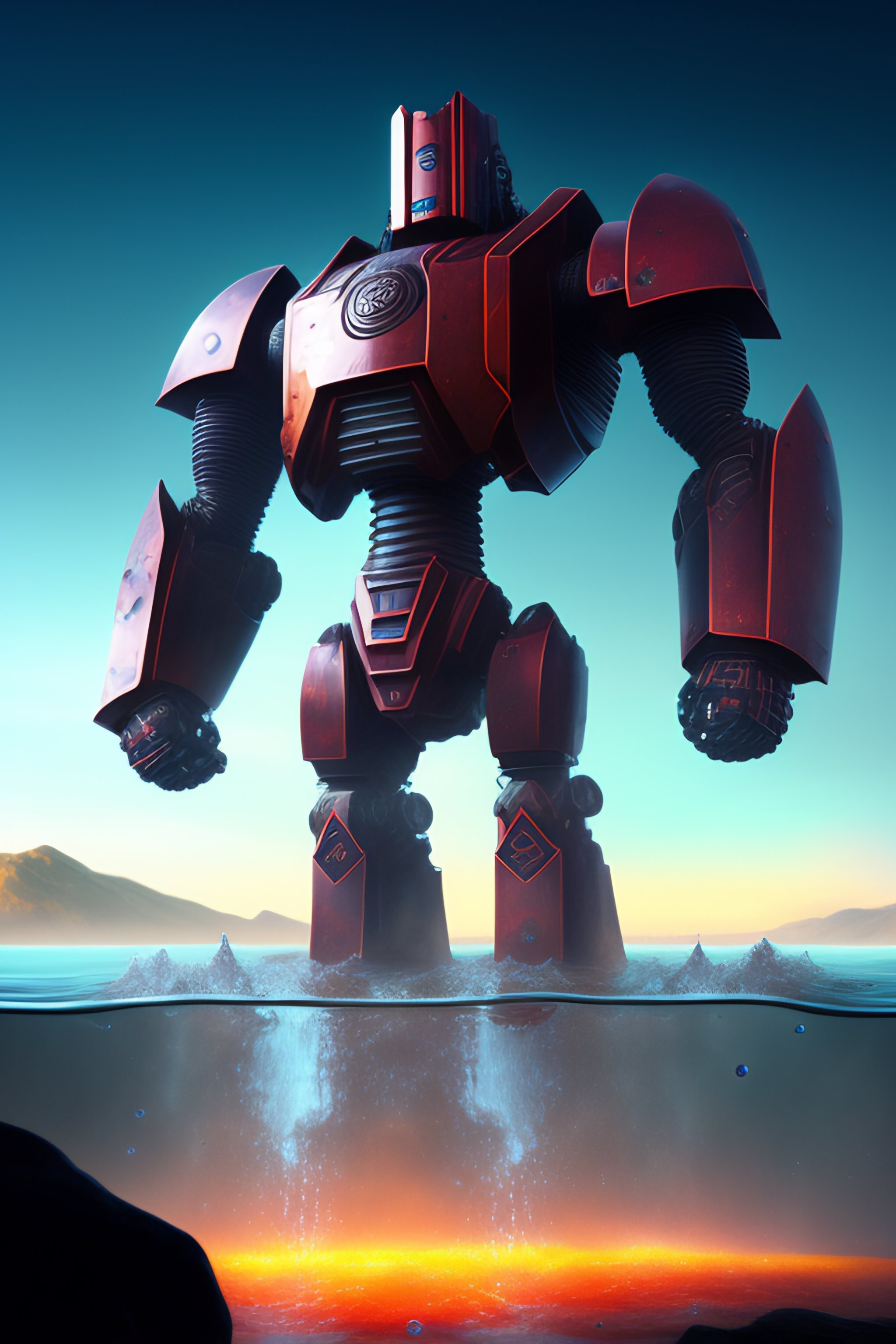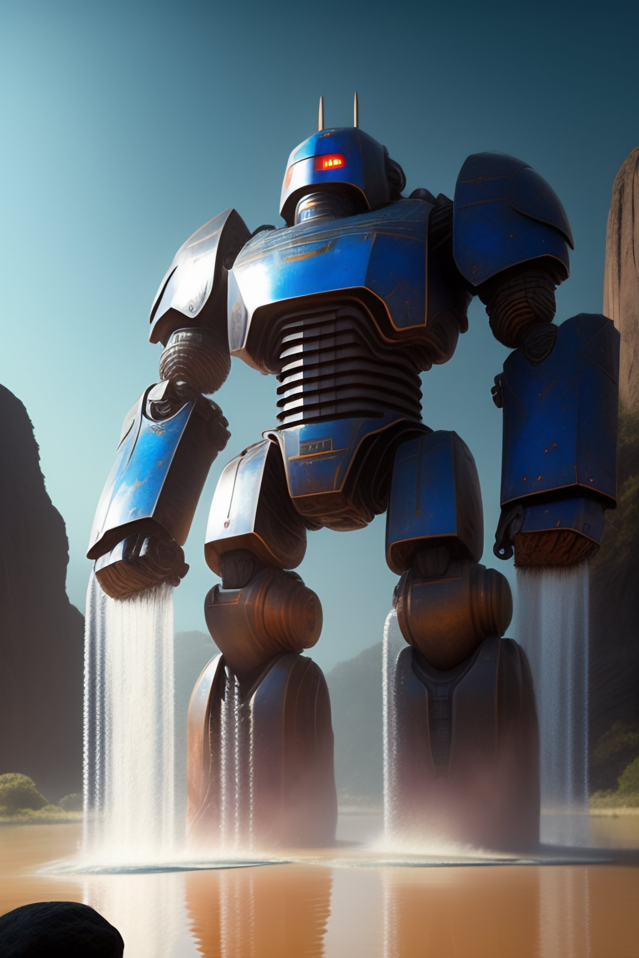 The huge stone golem robot with water wrapped around its body was steaming from many places. the parts of the eyes shone red, and the parts under the ankles were flooded with splashes of water. the forearm is thicker and longer than the upper arm. inlaid on the chest is a huge gemstone that emits shining blue light. the surrounding water floats in the air without the influence of gravity. one of the raised fists was covered by spherical liquid, and the other palm opened downwards, and some huge water droplets were flying towards the opened palm.