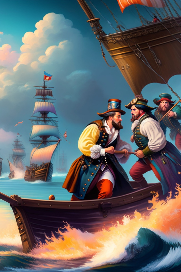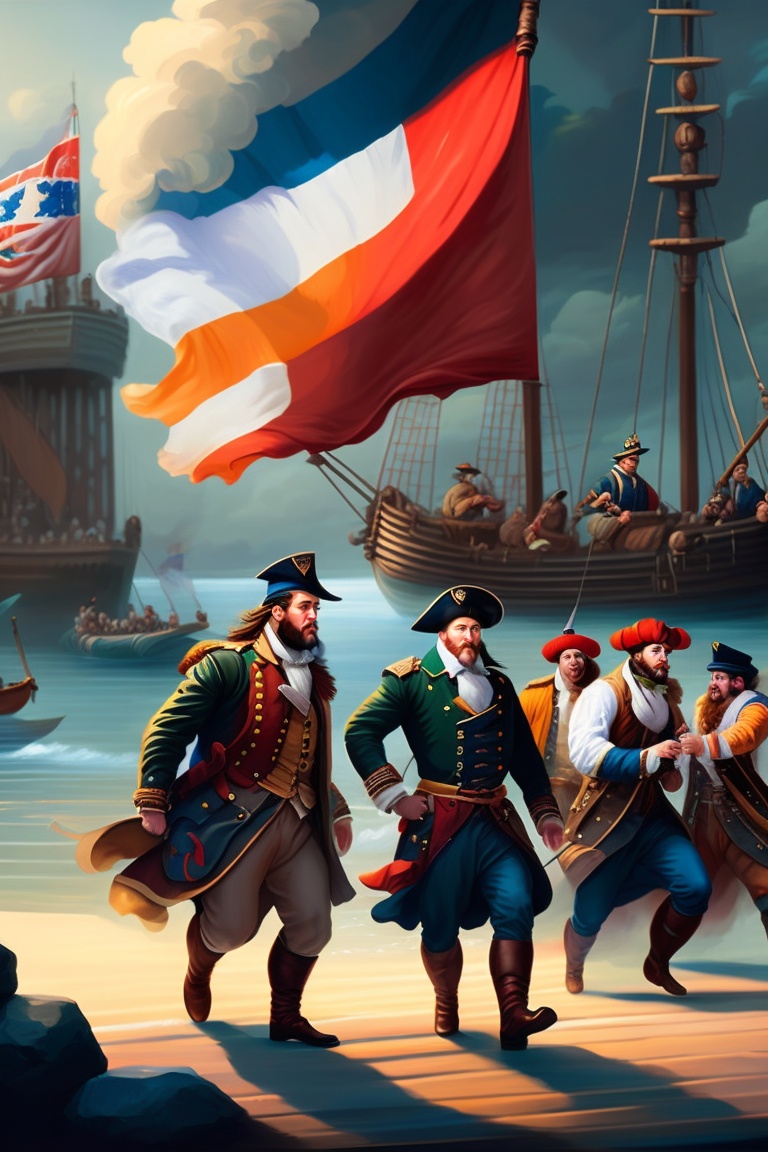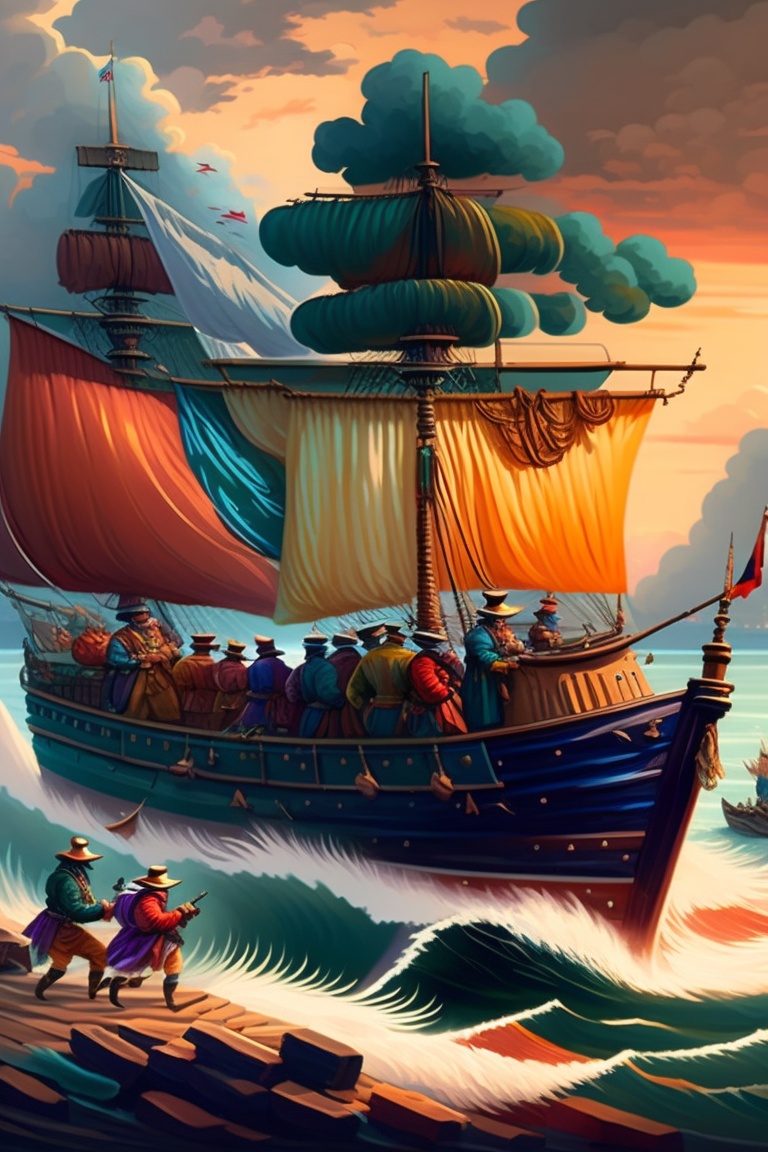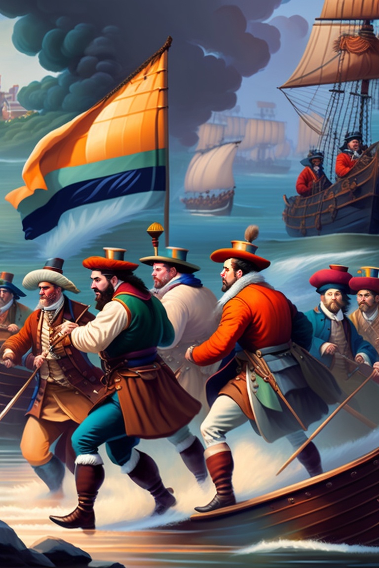 Scene description: a depiction of the boston tea party, showing colonists dressed as native americans dumping tea chests into the harbor. primary elements: colonial protestors, british ships, tea chests, harbor. color scheme & styles: use vibrant colors to make the scene visually striking. incorporate bold, dynamic brush strokes to emphasize the rebellious spirit of the colonists. highly detailed, dramatic lighting, intense expressions, editorial illustration