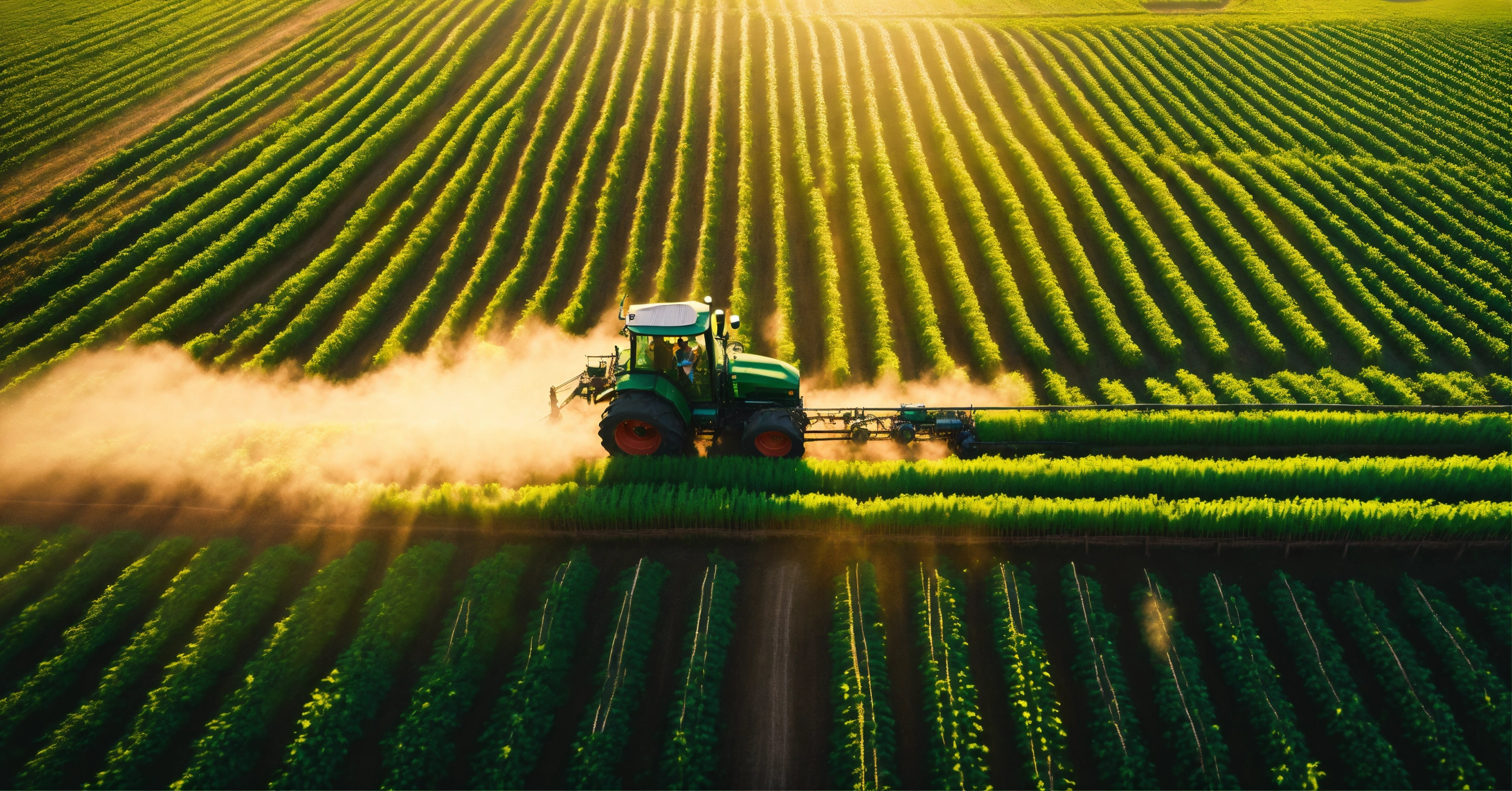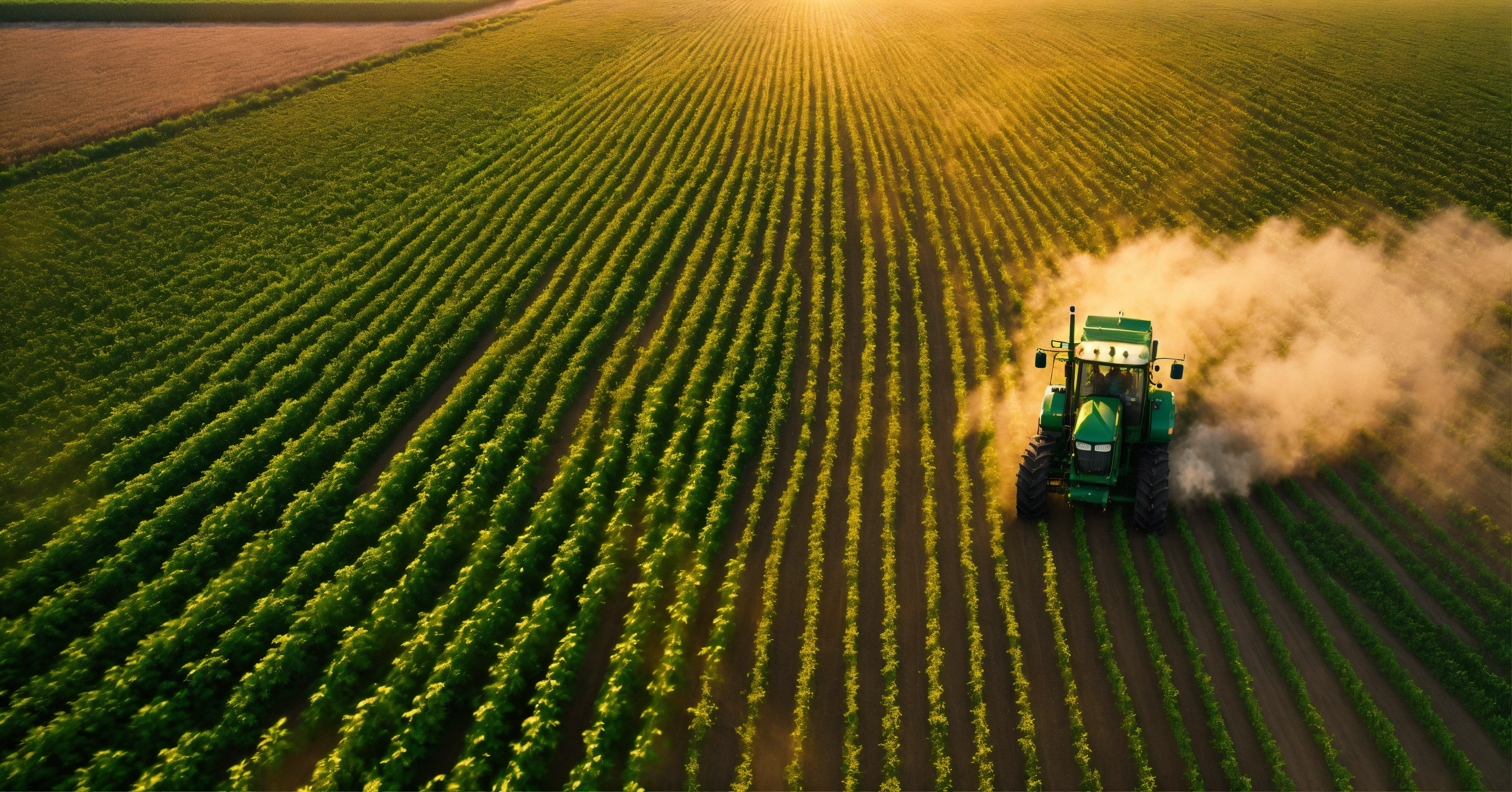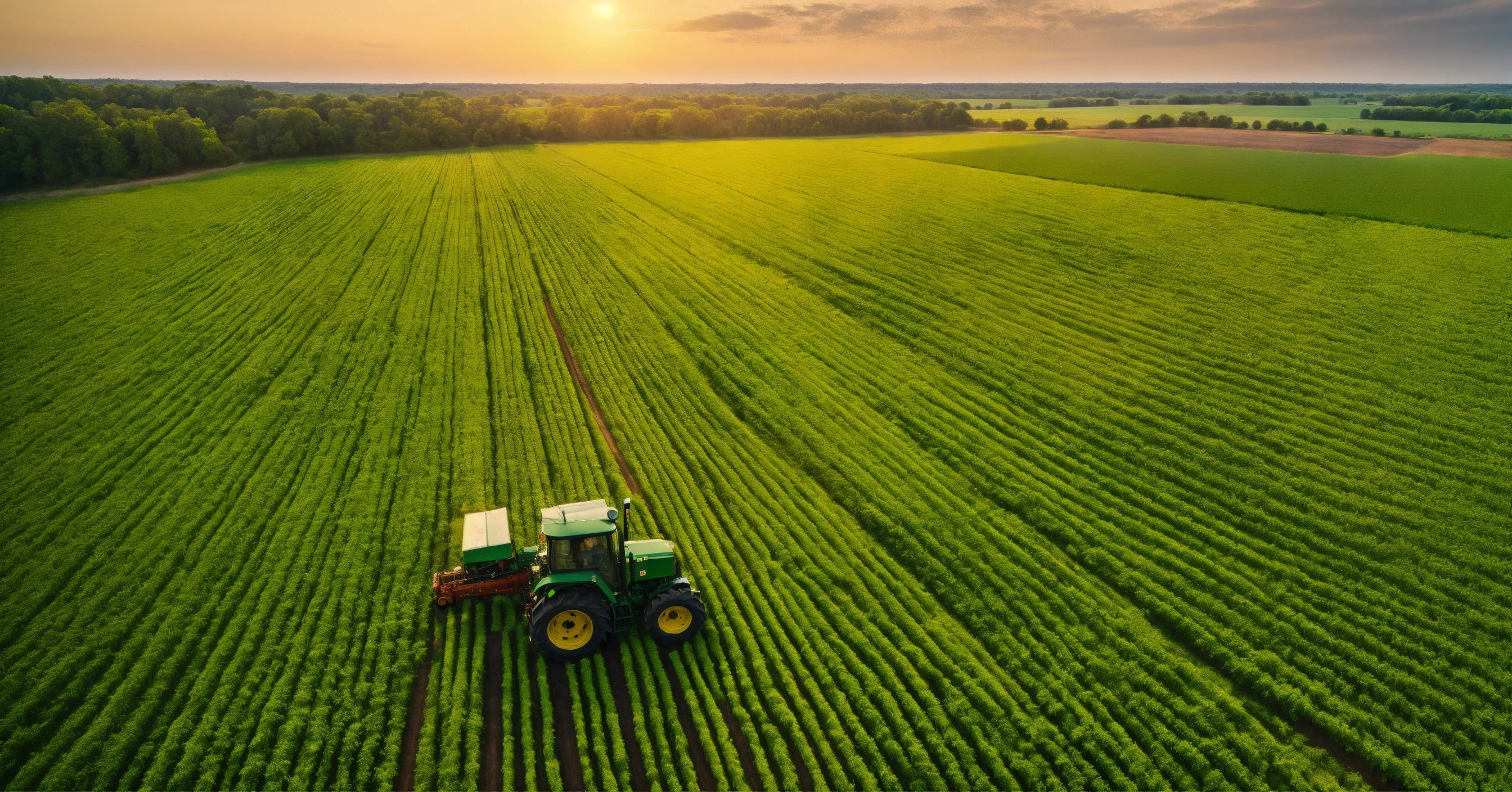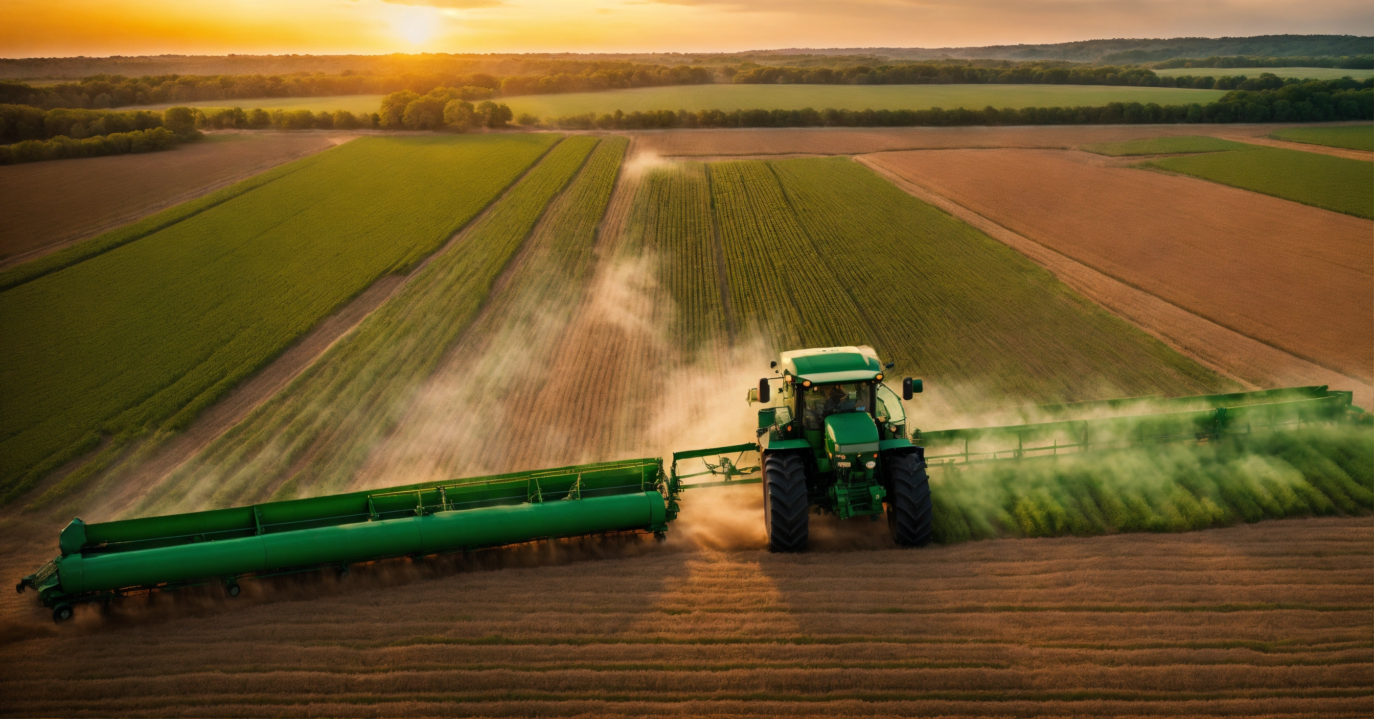 Aerial view of a green tractor is driving through a field of soybeans under the sunset light, high quality photo, cinematic shot, cinematic, realistic, film grain, volumetric light, imax, photorealistic, hyperdetailed textures, sharp focus, studio photo