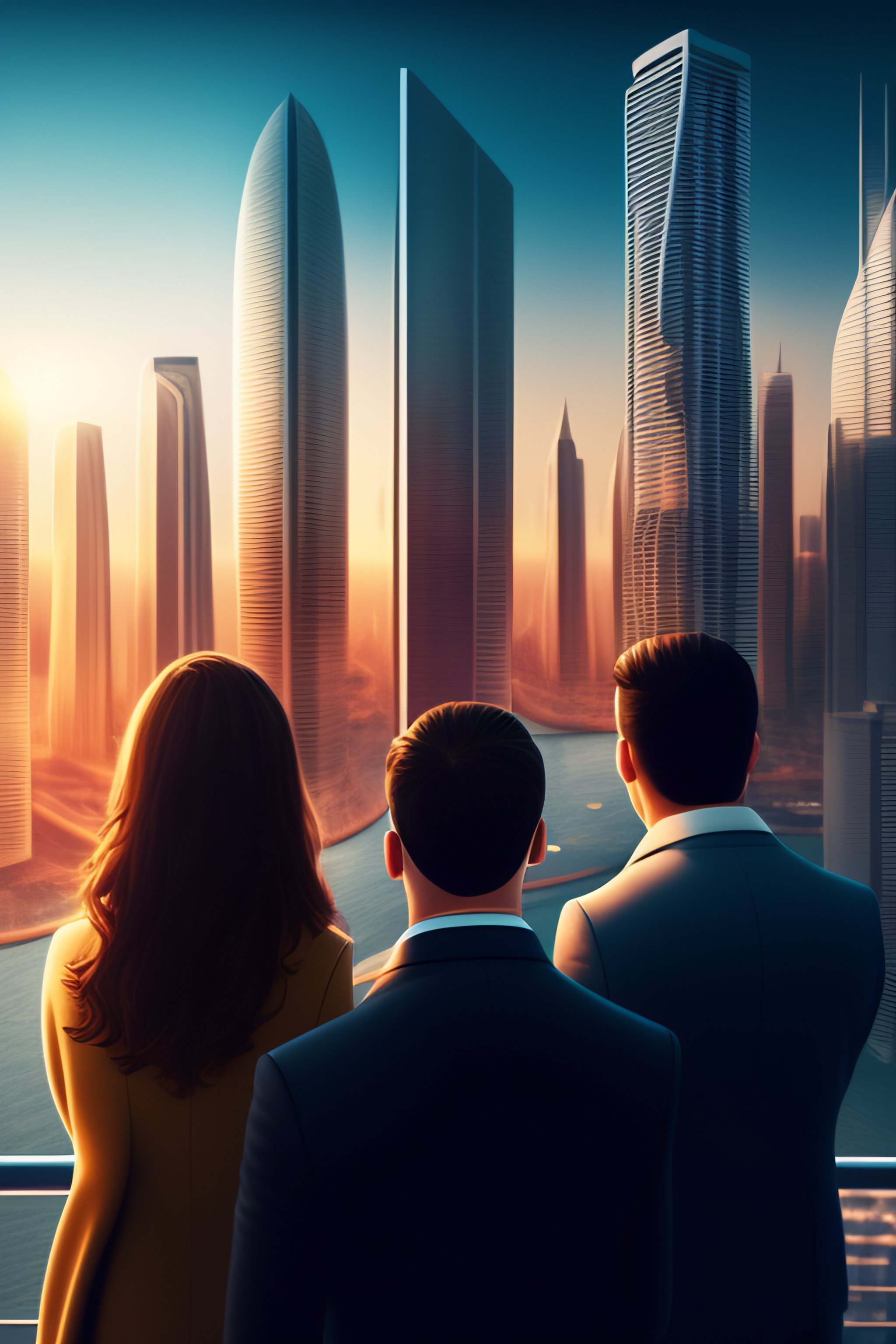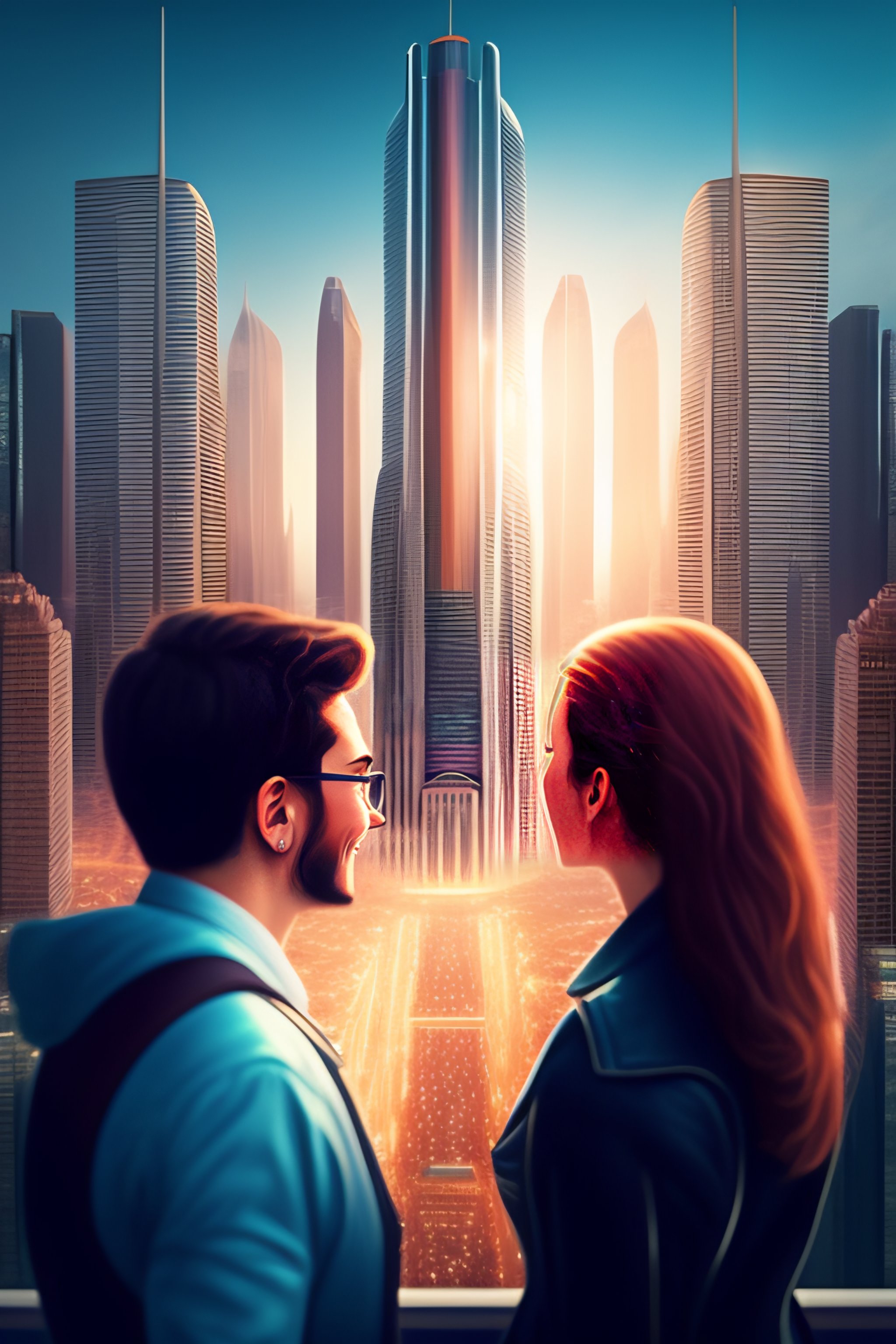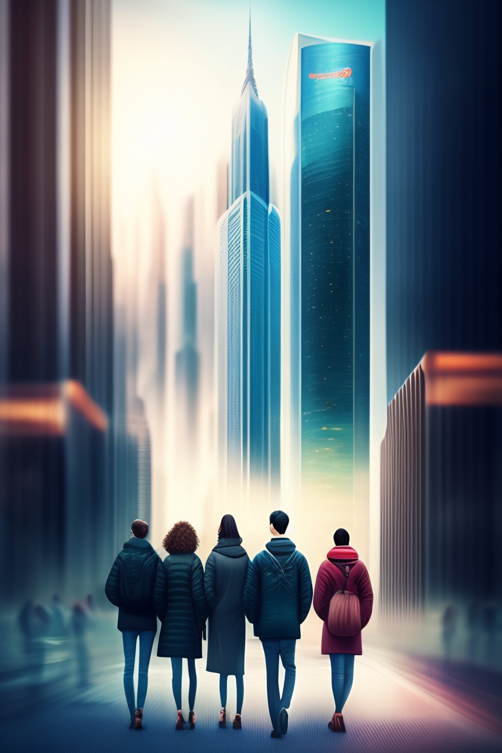 A stylized image of a group of people excitedly looking towards the future, with a futuristic cityscape in the background