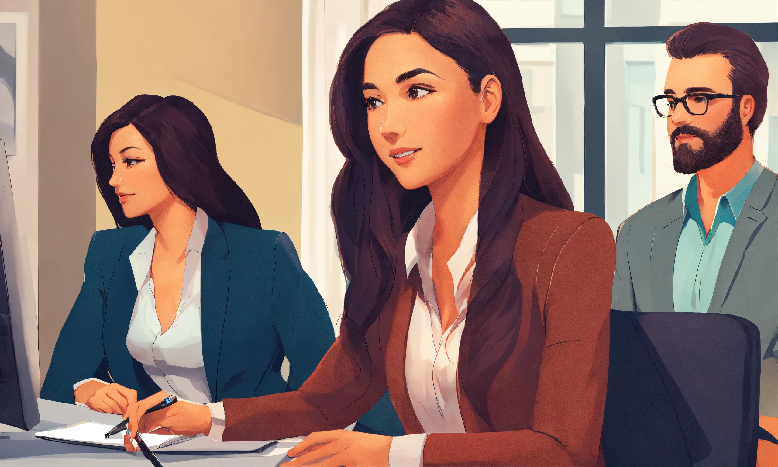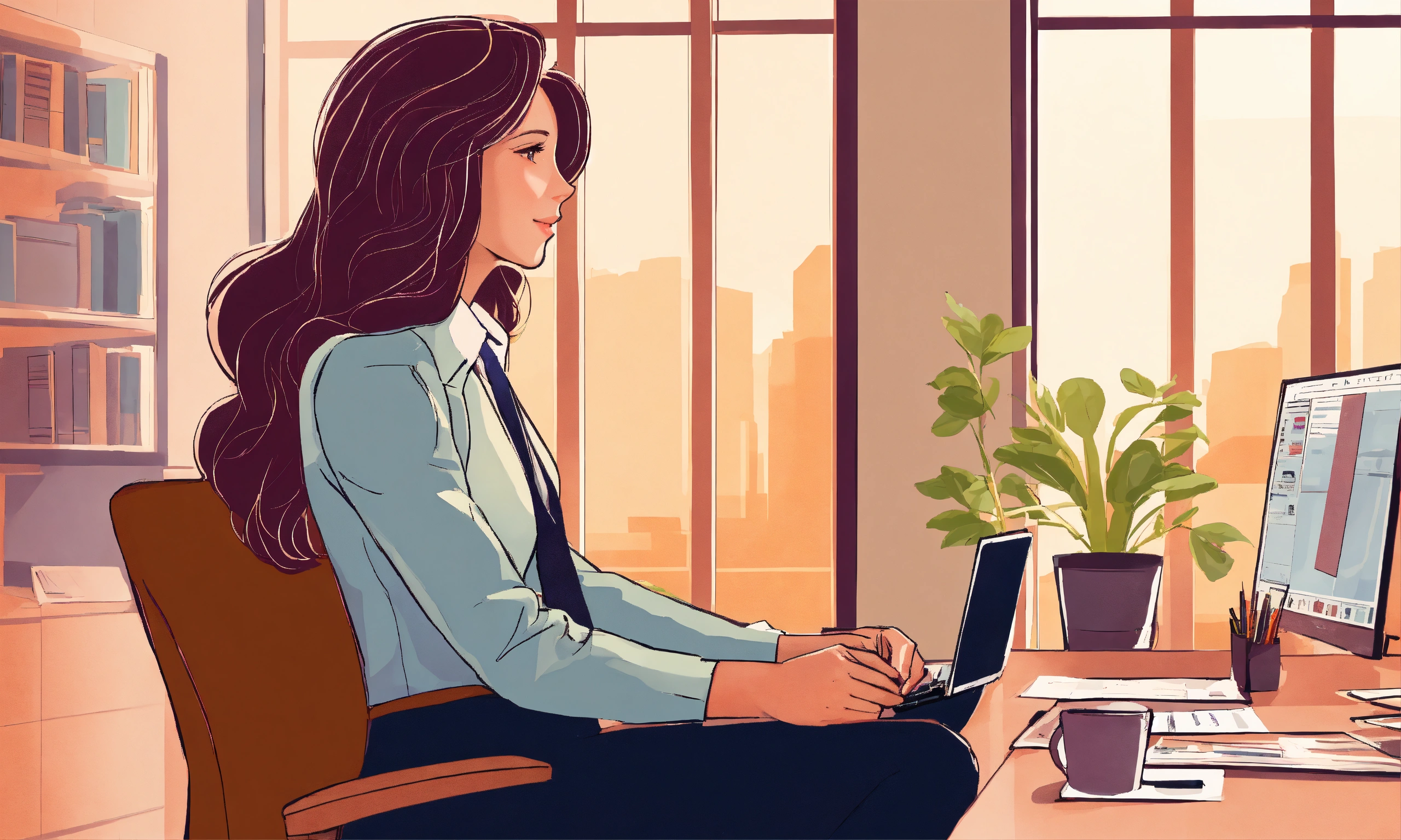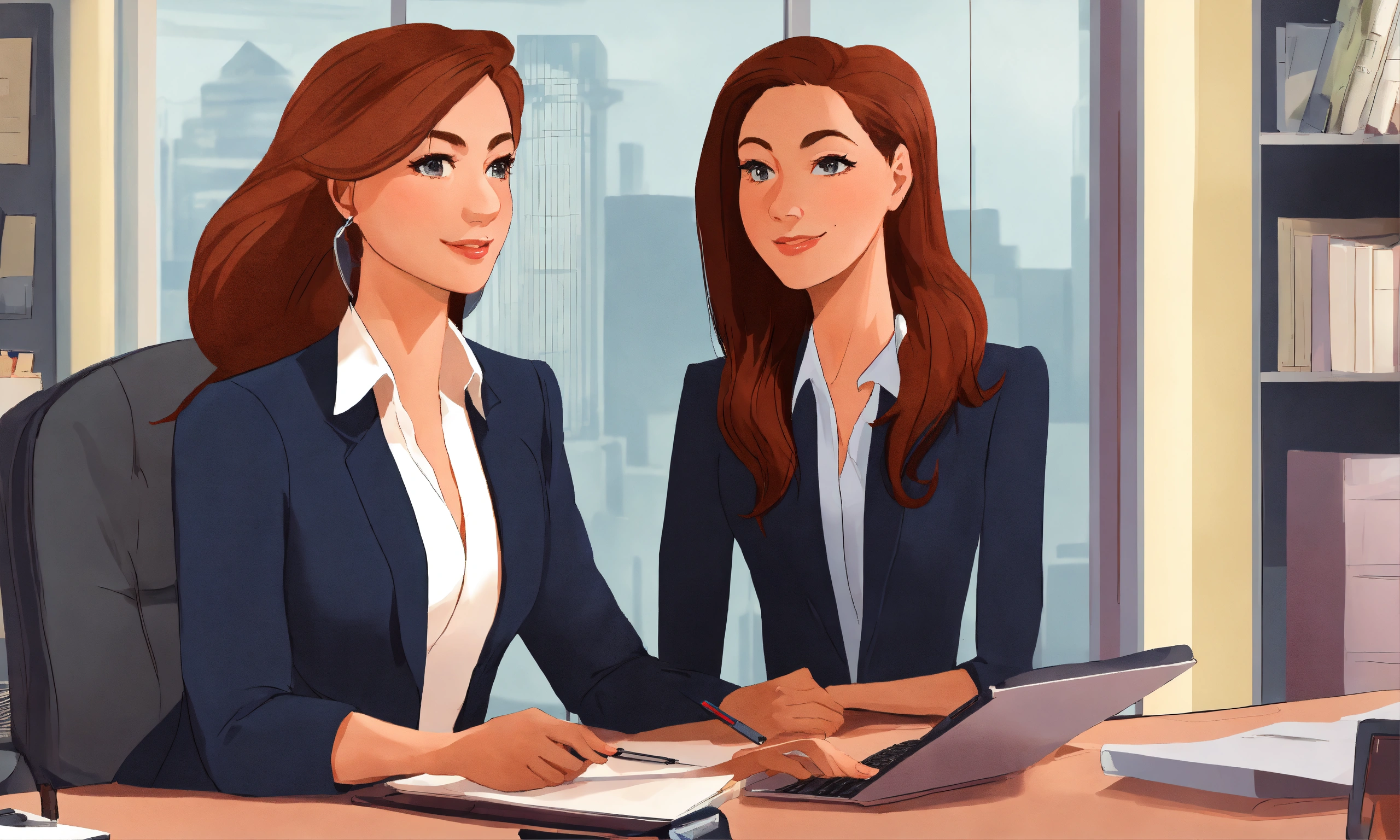 Create an illustration of women age 40, with long hair, sitting in office talking to manager, dressed in formals, in multiple poses, looking confident
