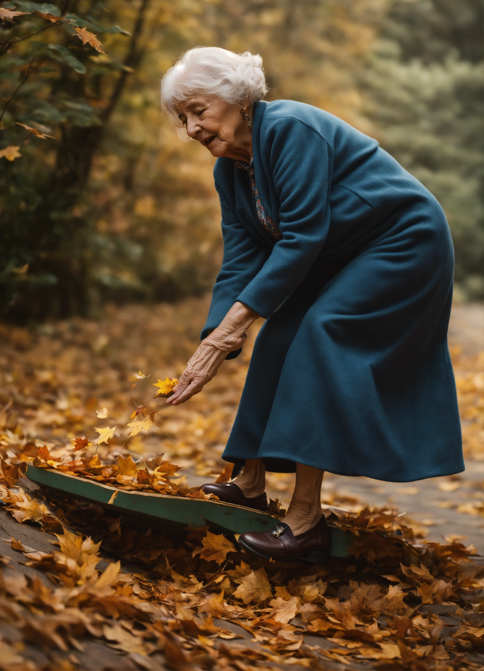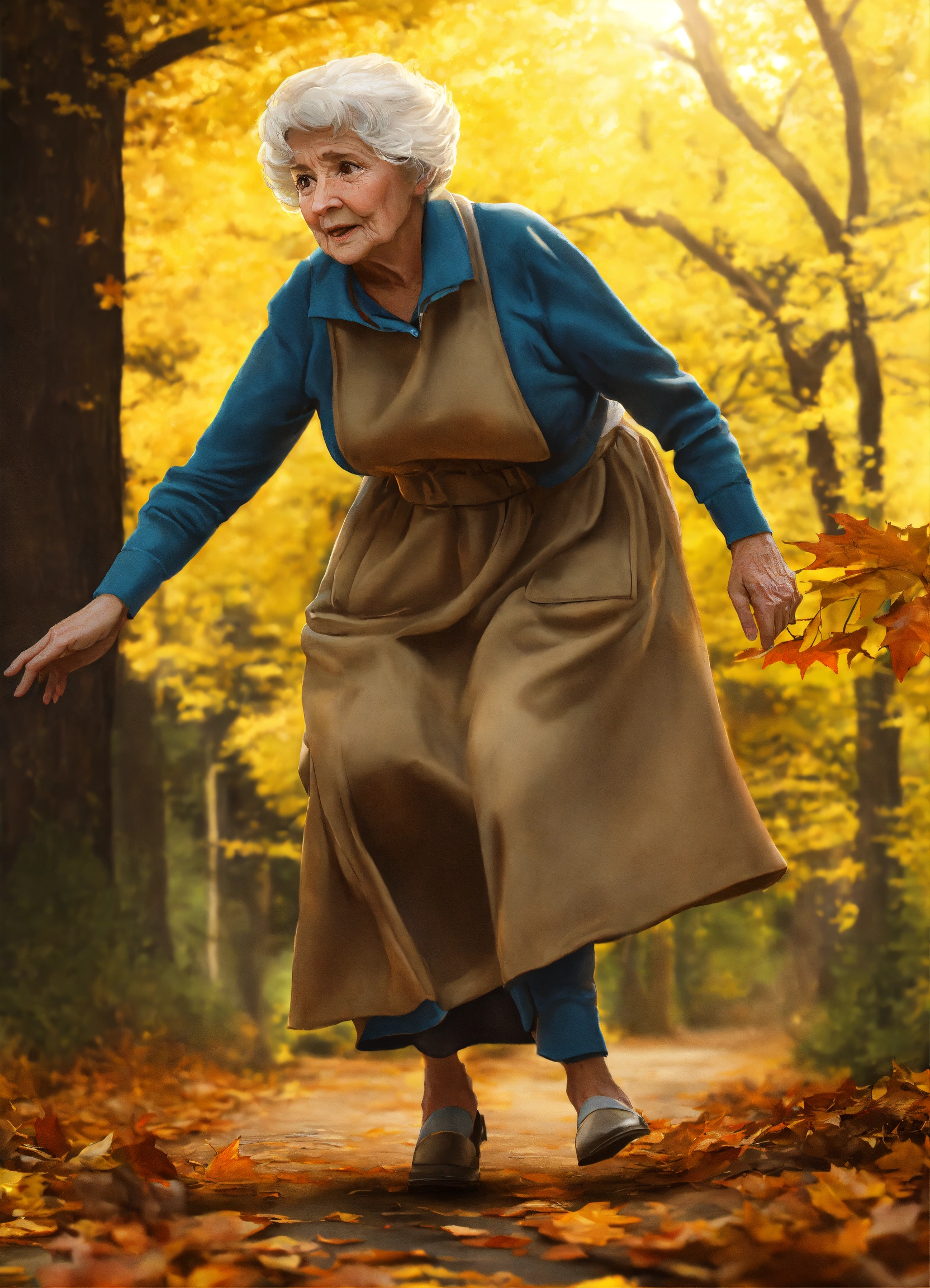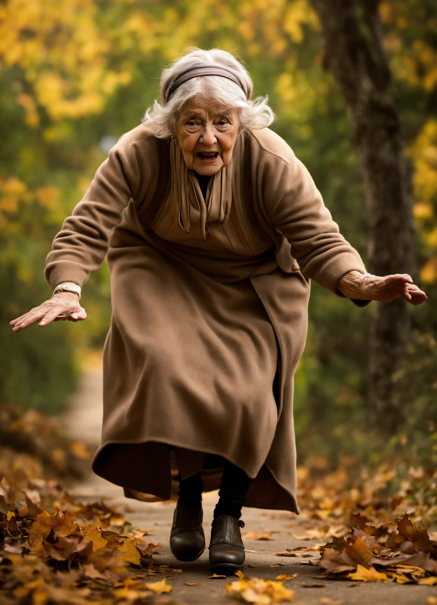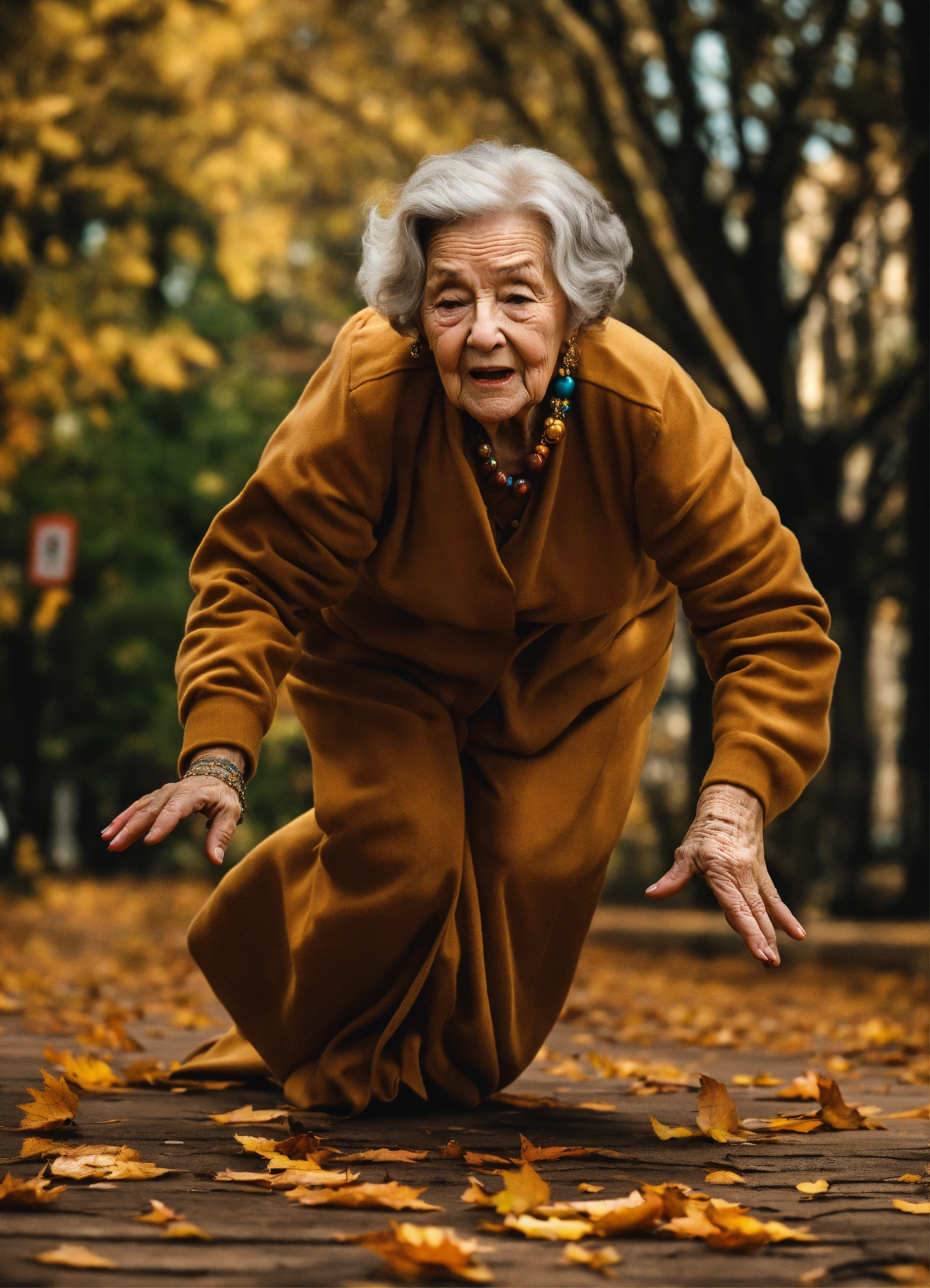 A photrealistic depiction of an old lady tripping over and stopping her fall on her out streched hand