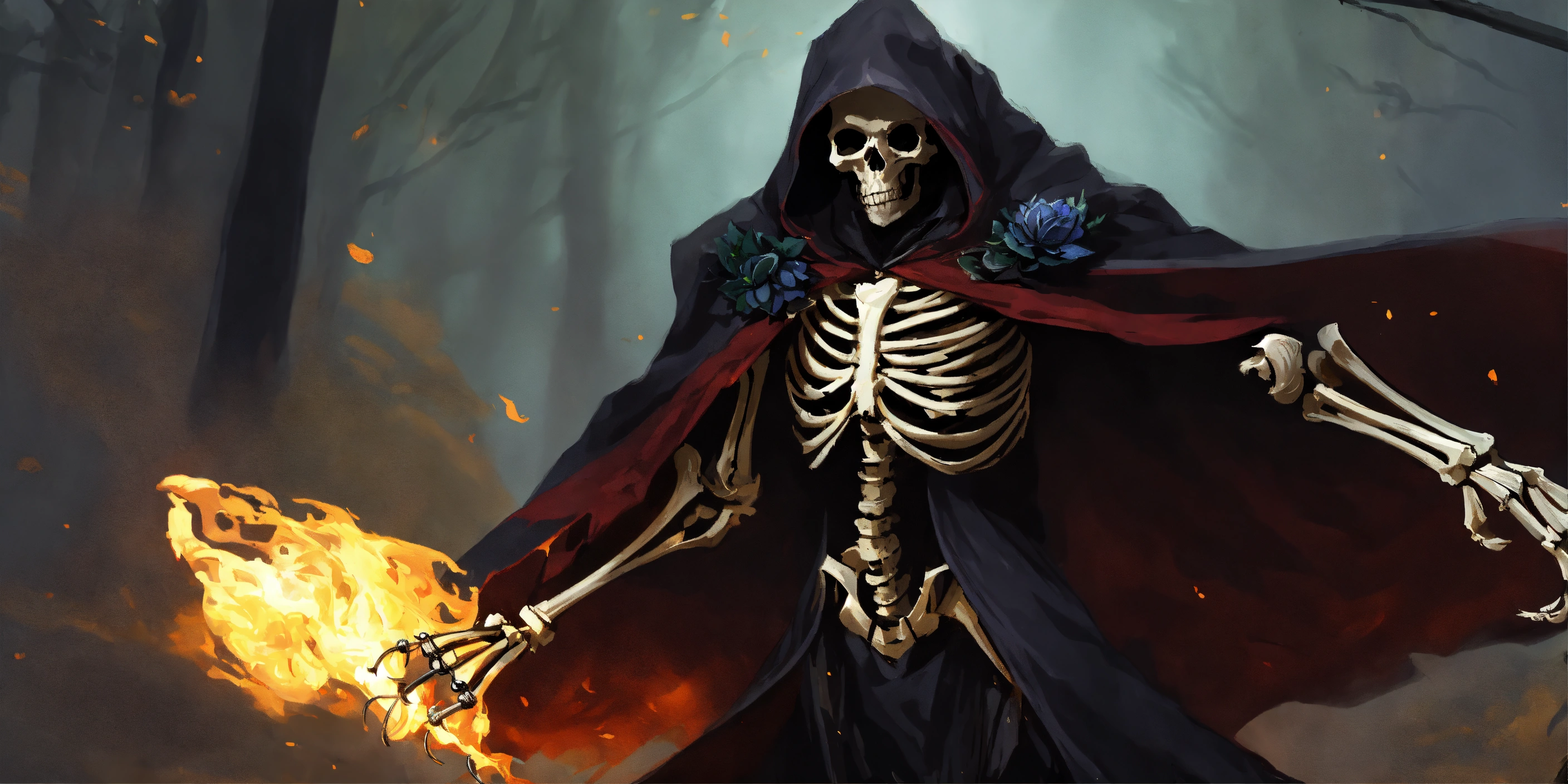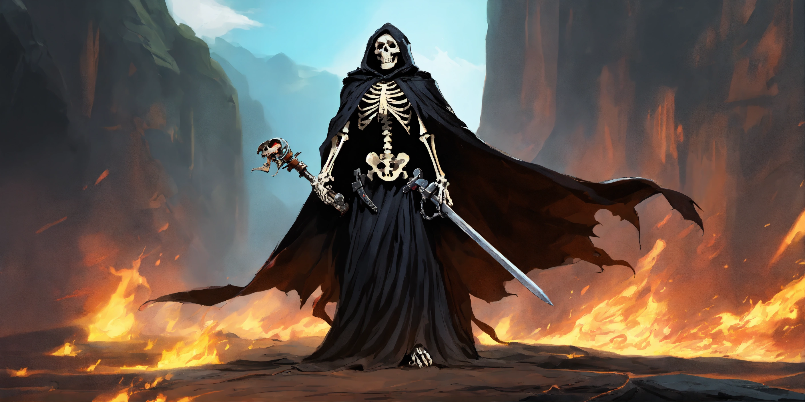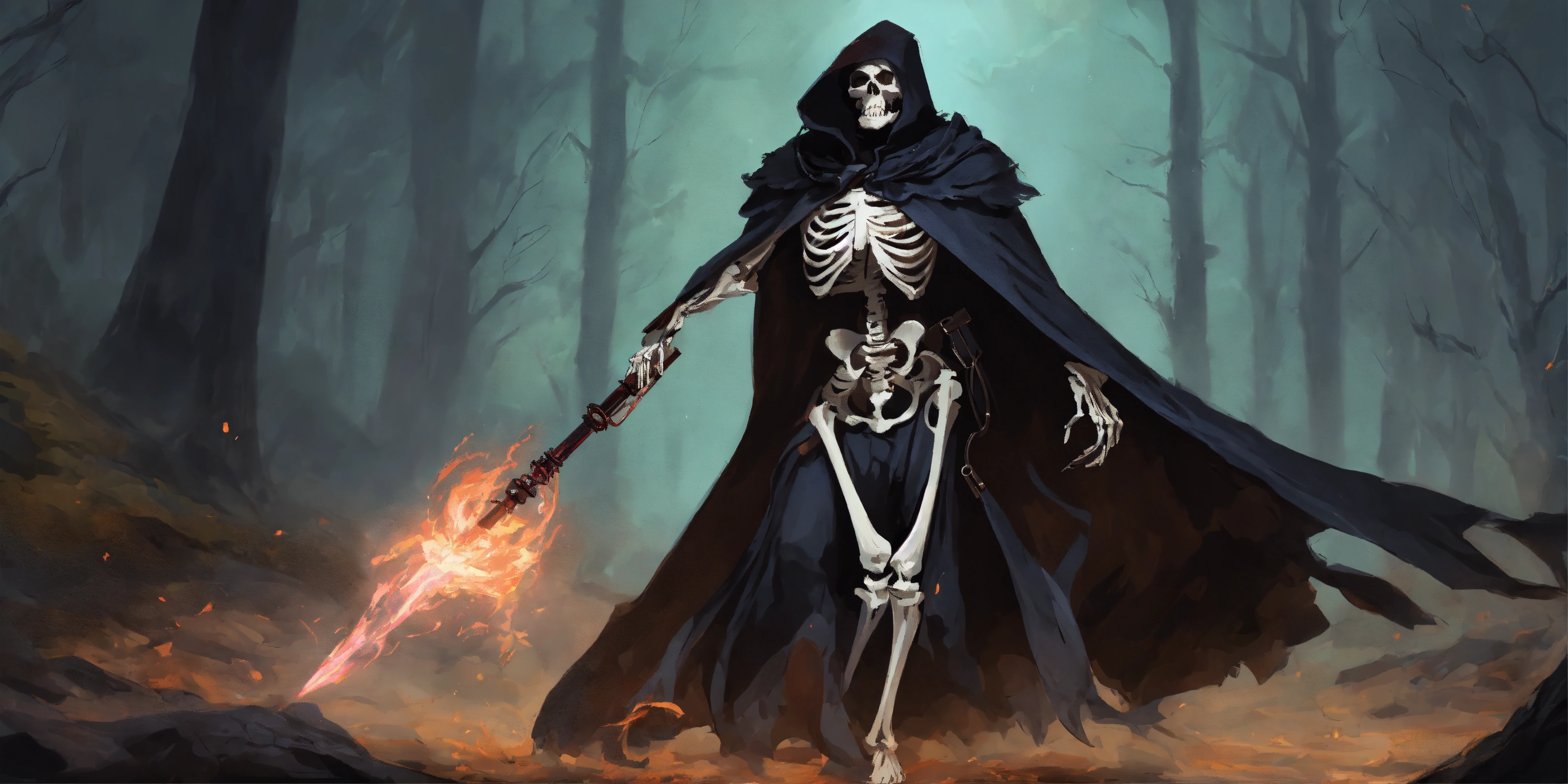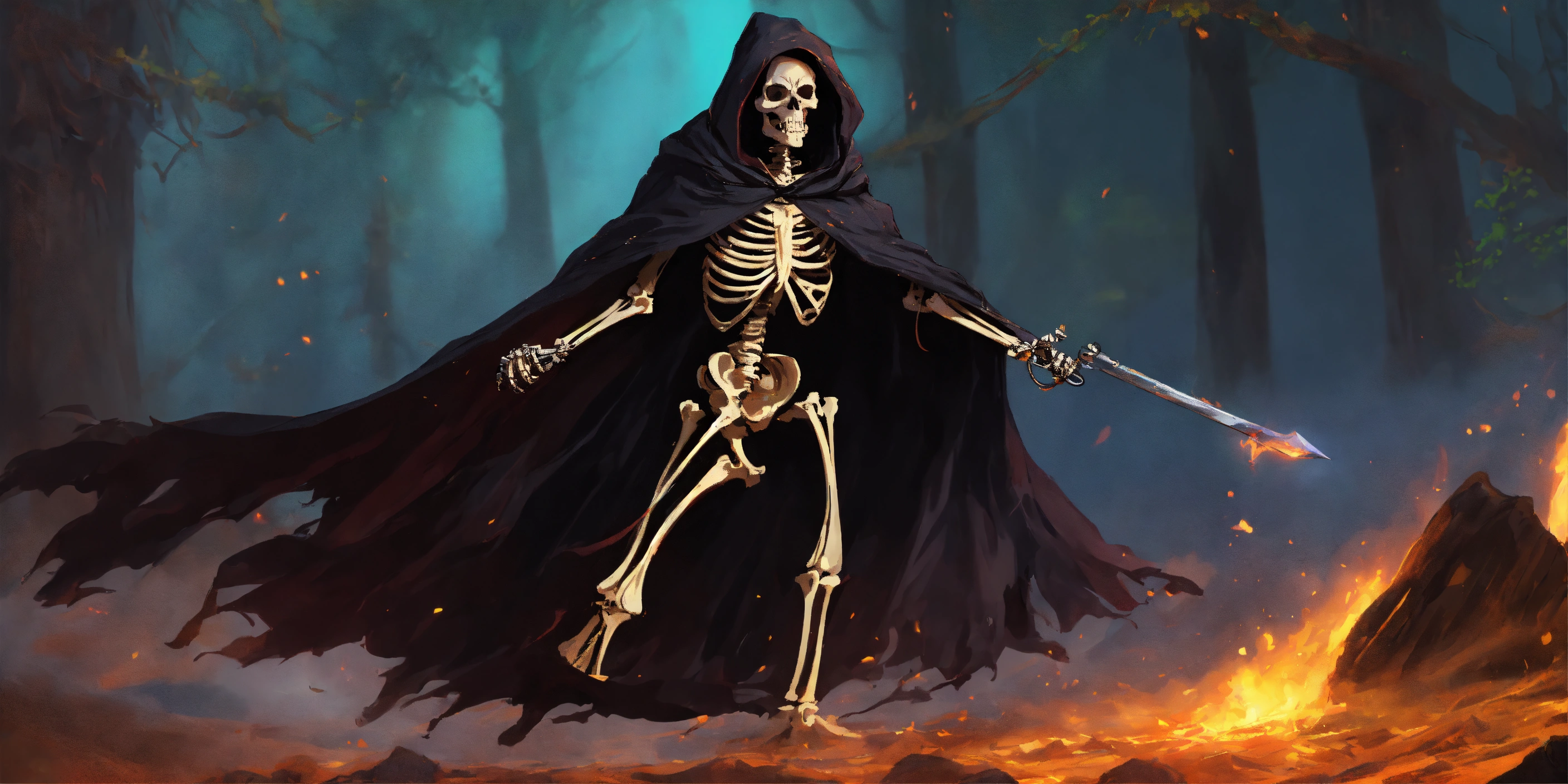 Body shot, enraged, boneclaw skeleton contruct monster, with hooks for hands, 5e dnd, wearing a long black cloak, digital art