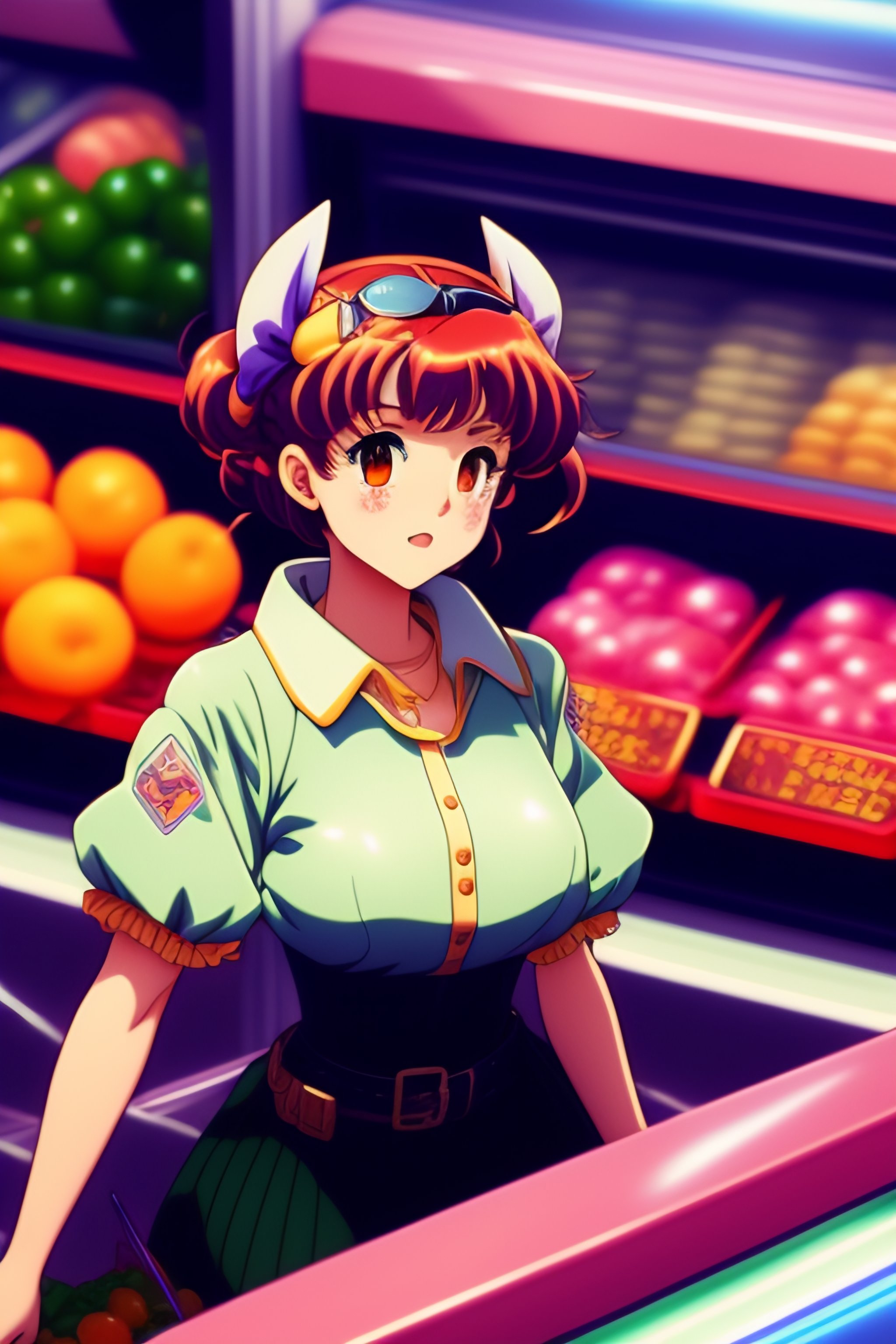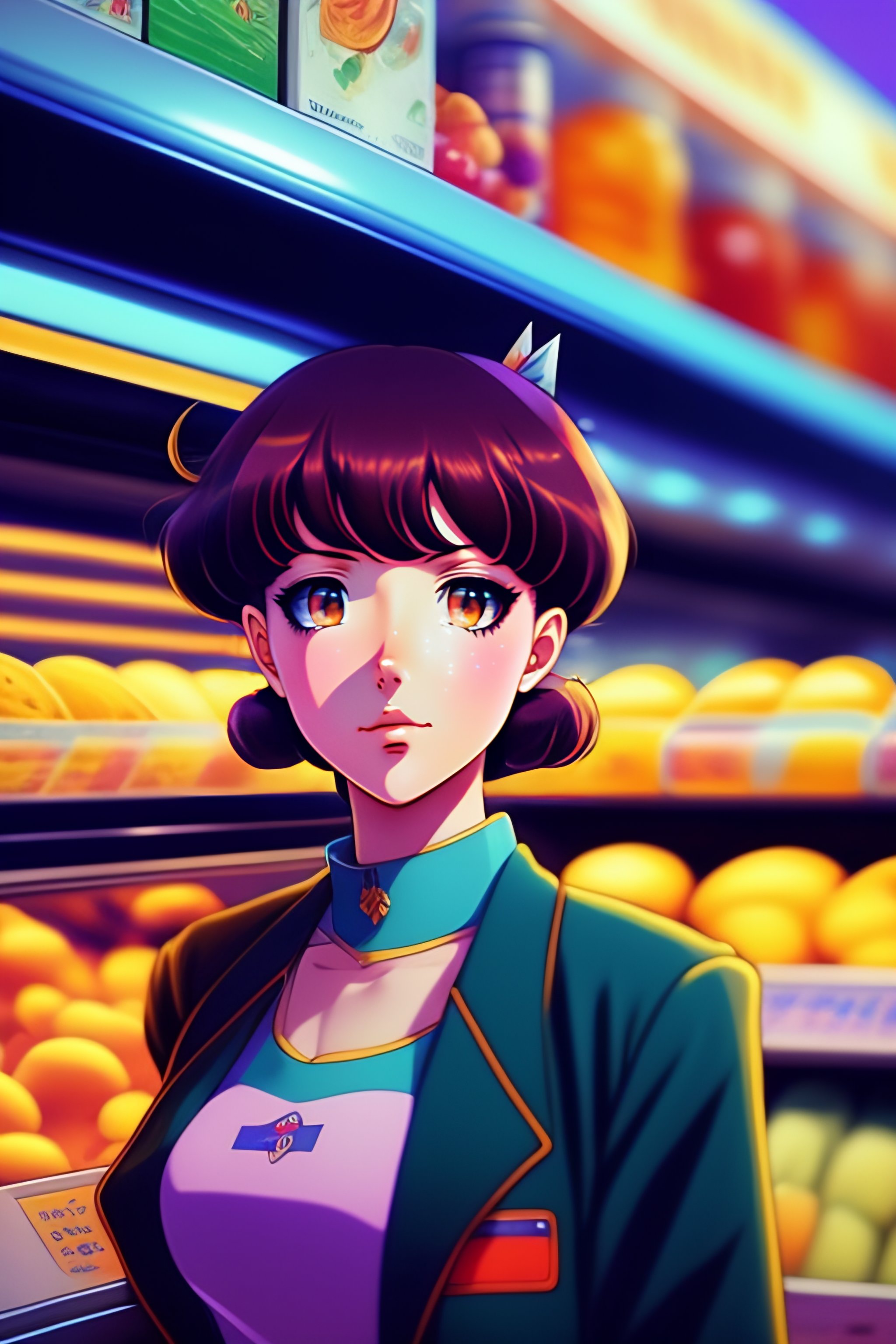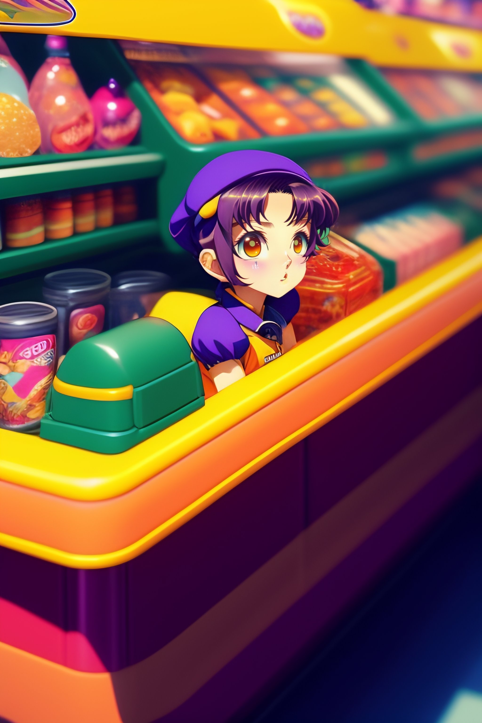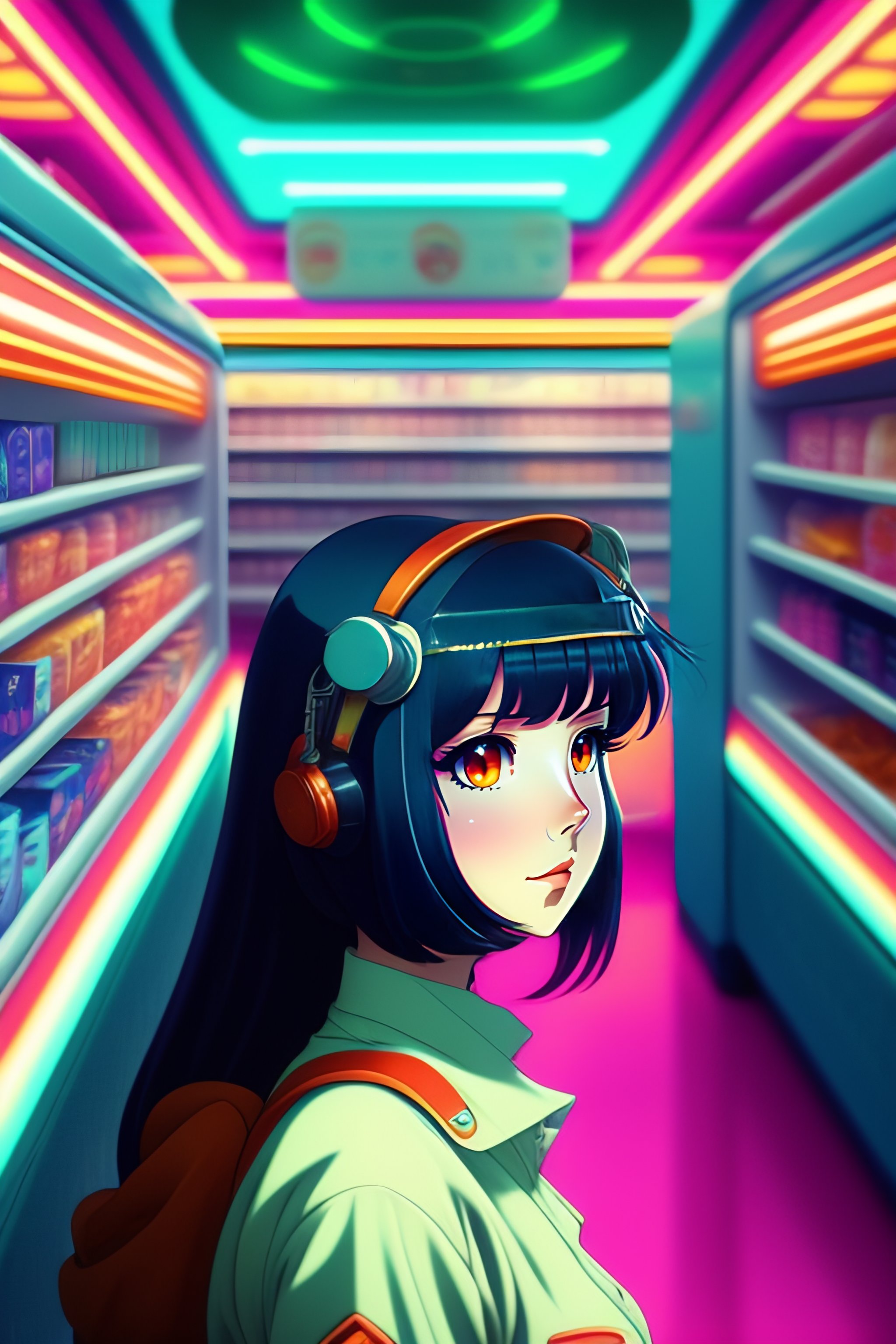 From above, doe eyes, vintage 90's anime style. anime girl posing in convenience store., sci-fi. colors, surreal.