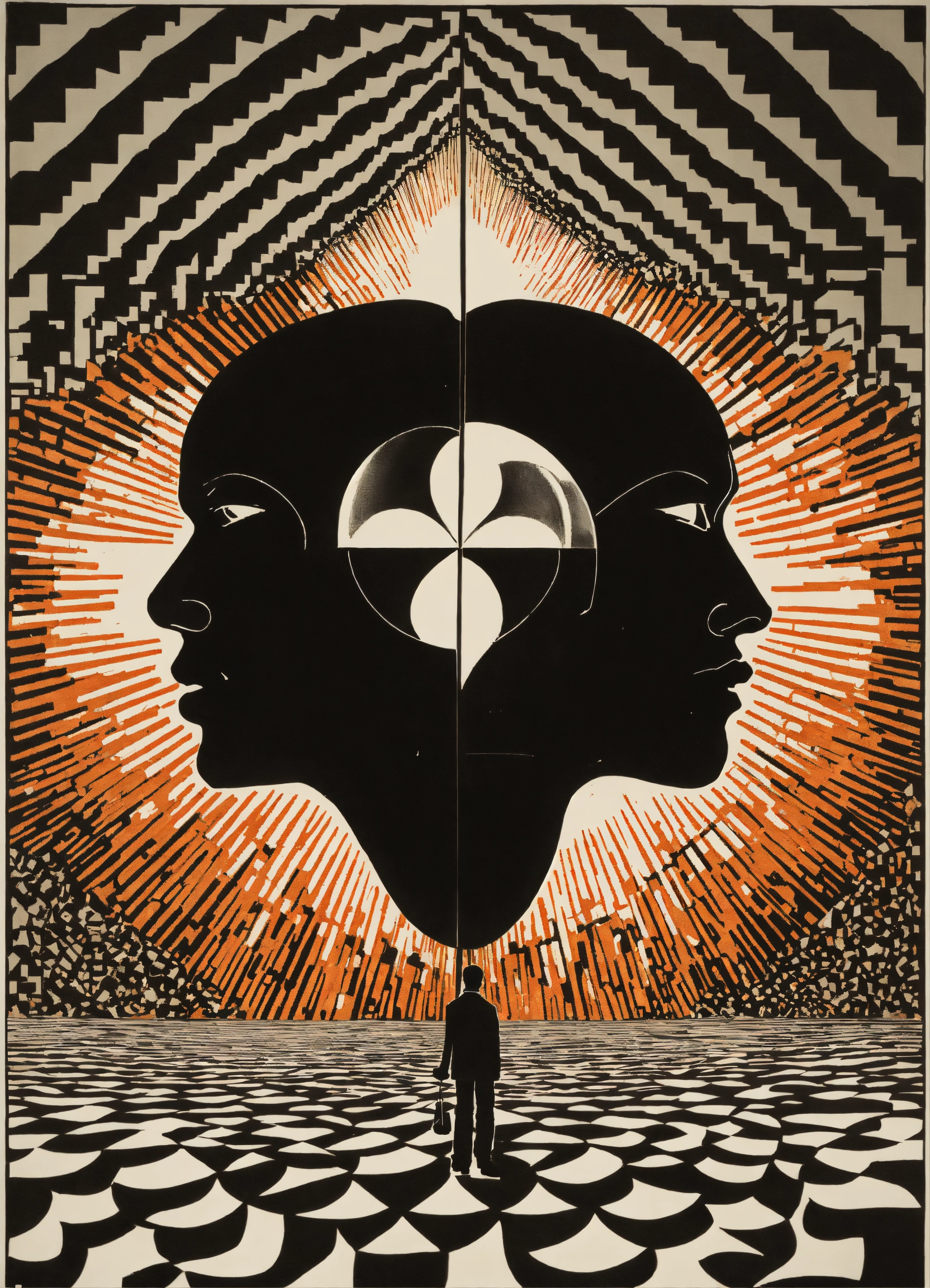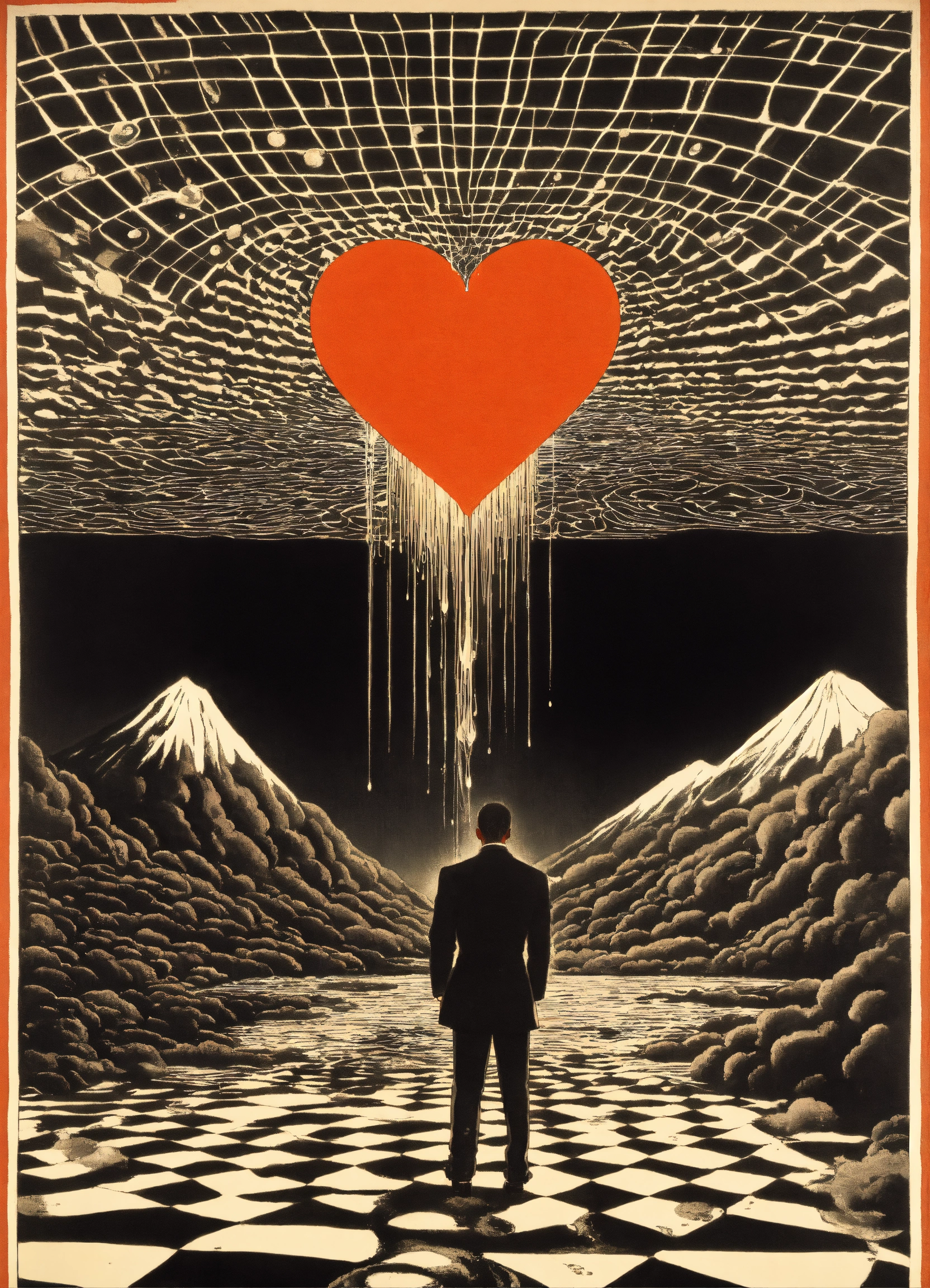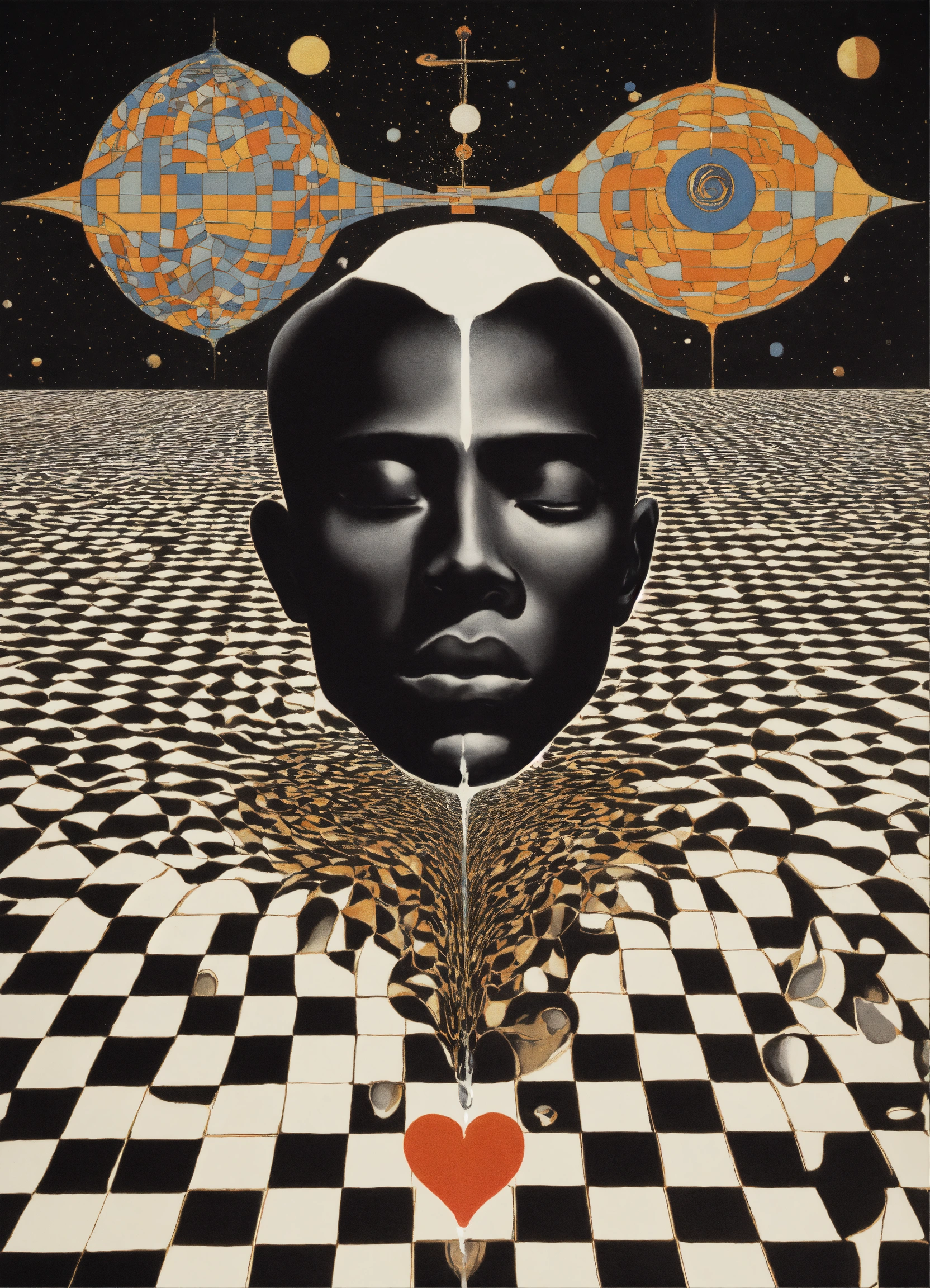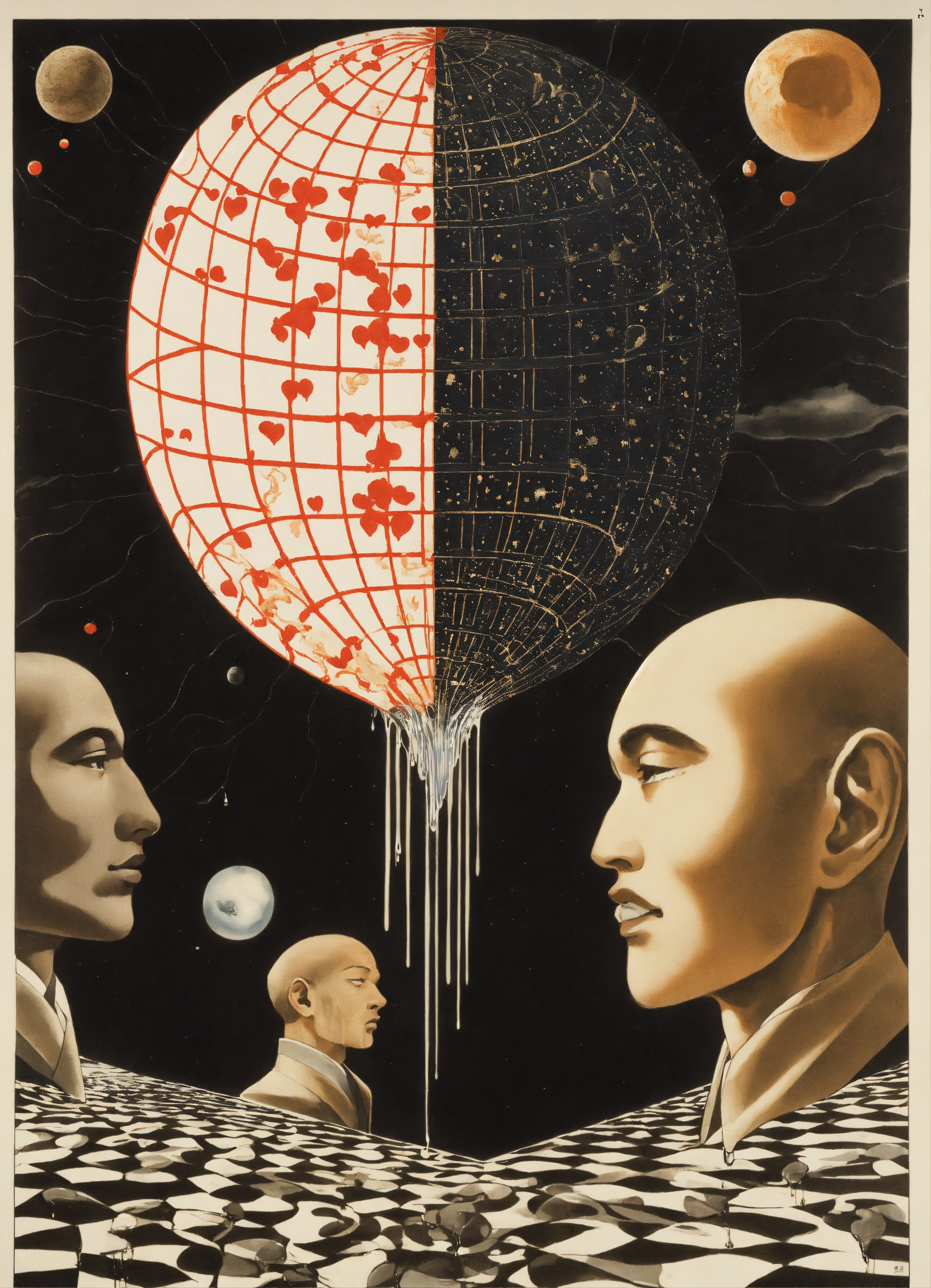 Japanese vintage poster, white man's head merging into black man's head dripping, onto floor containing all four corners of the universe, monochromatic scheme chequer sky containing, astral realm, dripping love heart dripping onto psychedelic background by maurits cornelis escher