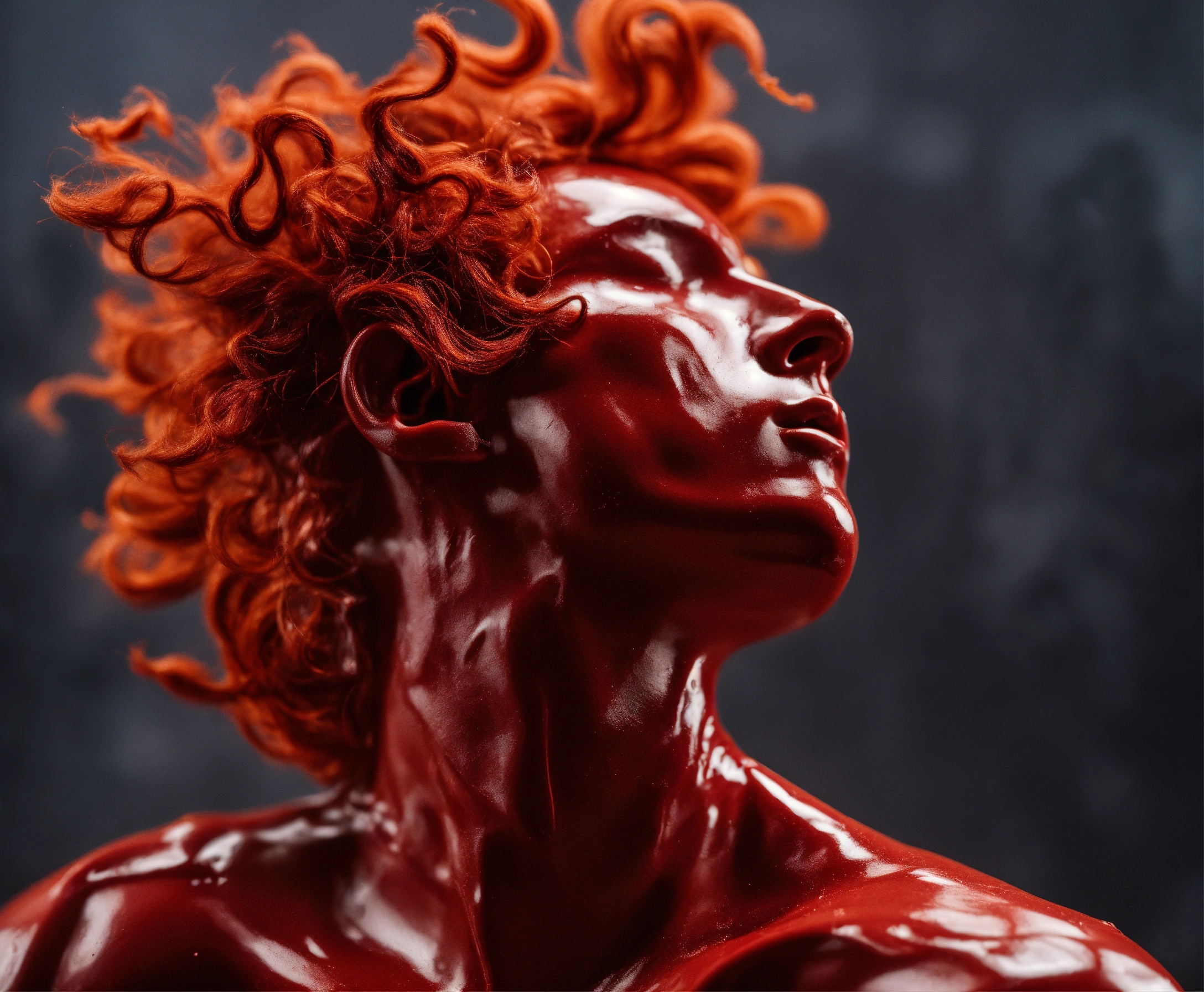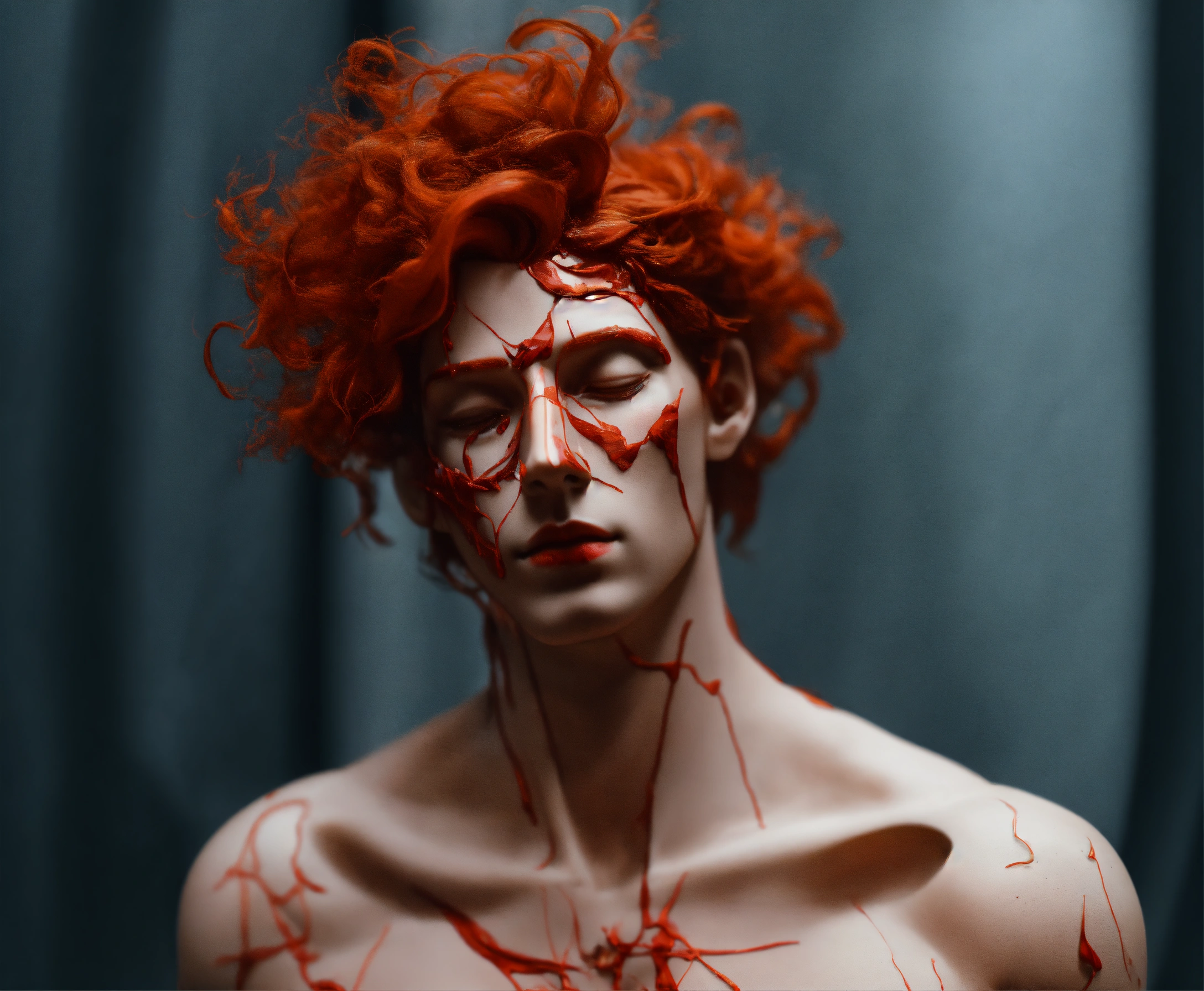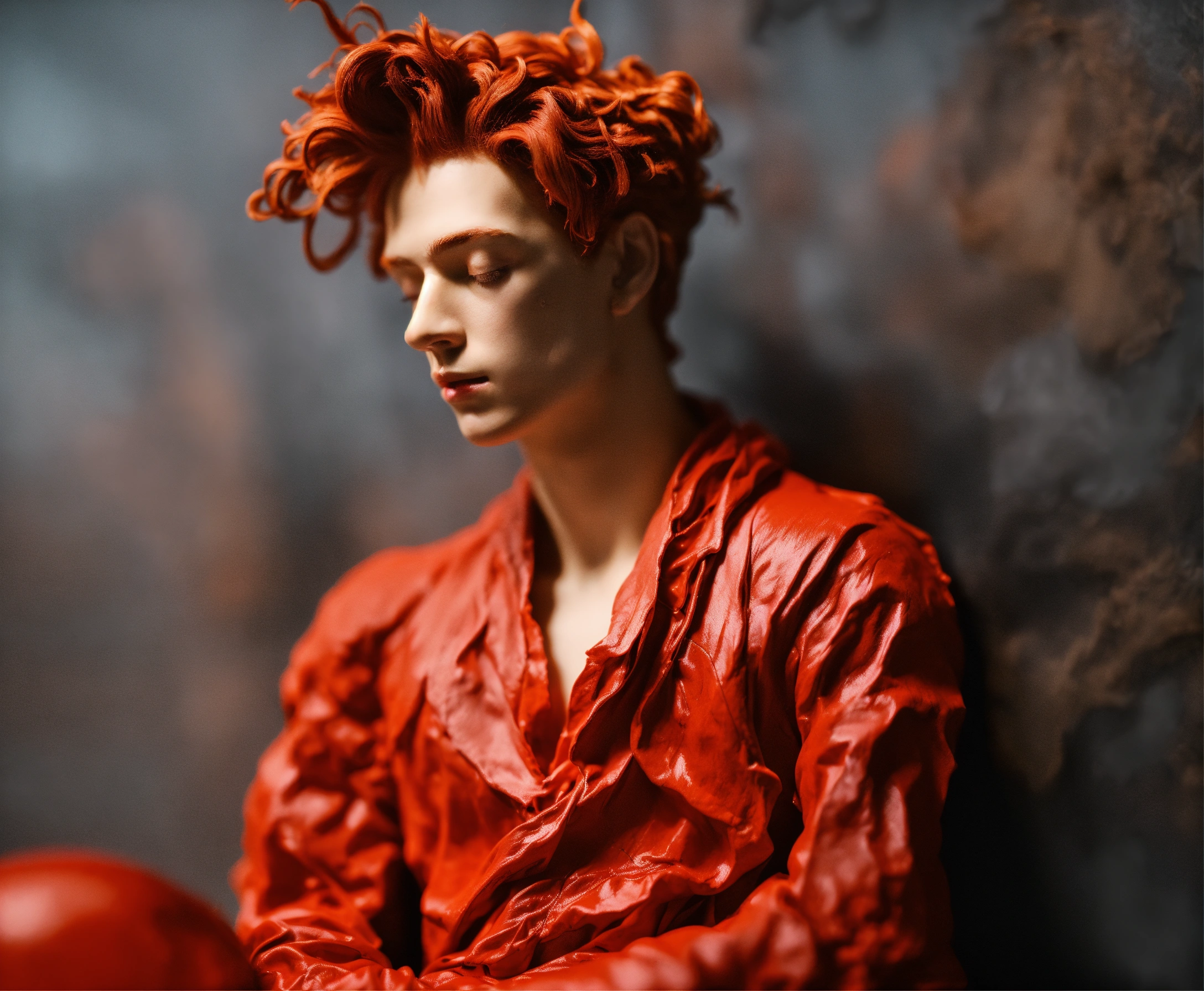 3d abstract modeling clay stuning red hair man body, egon schiele inspiration, skin enveloping experience, dark room inspiration, foreground perfume bottle