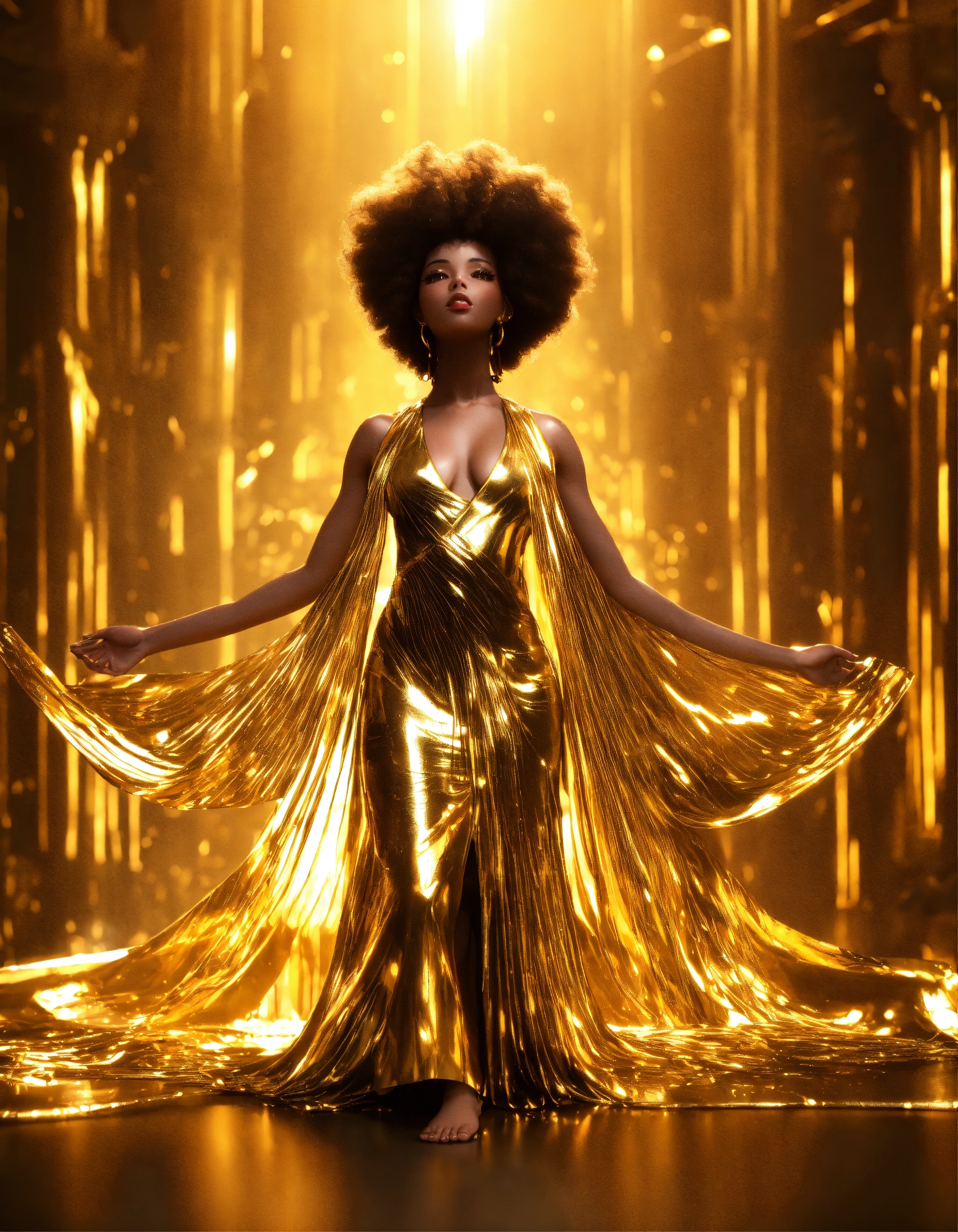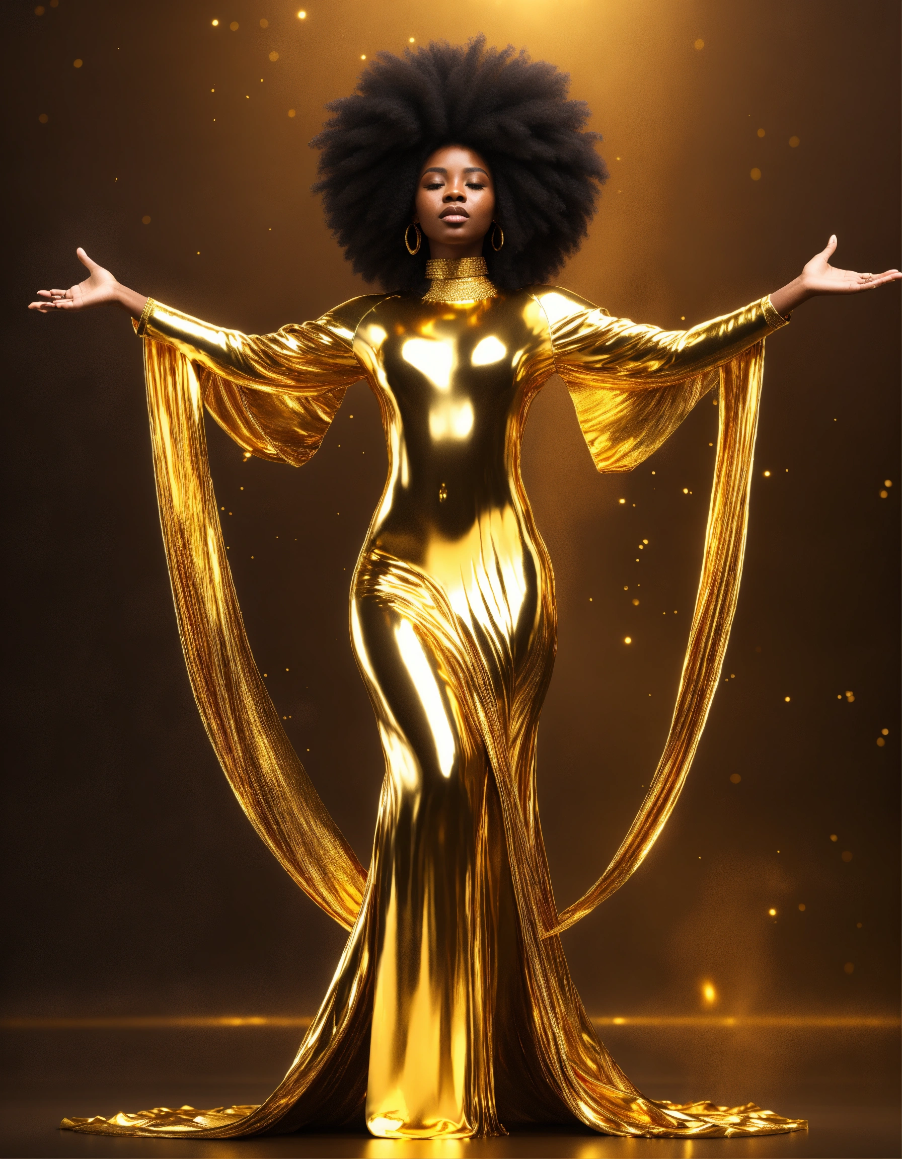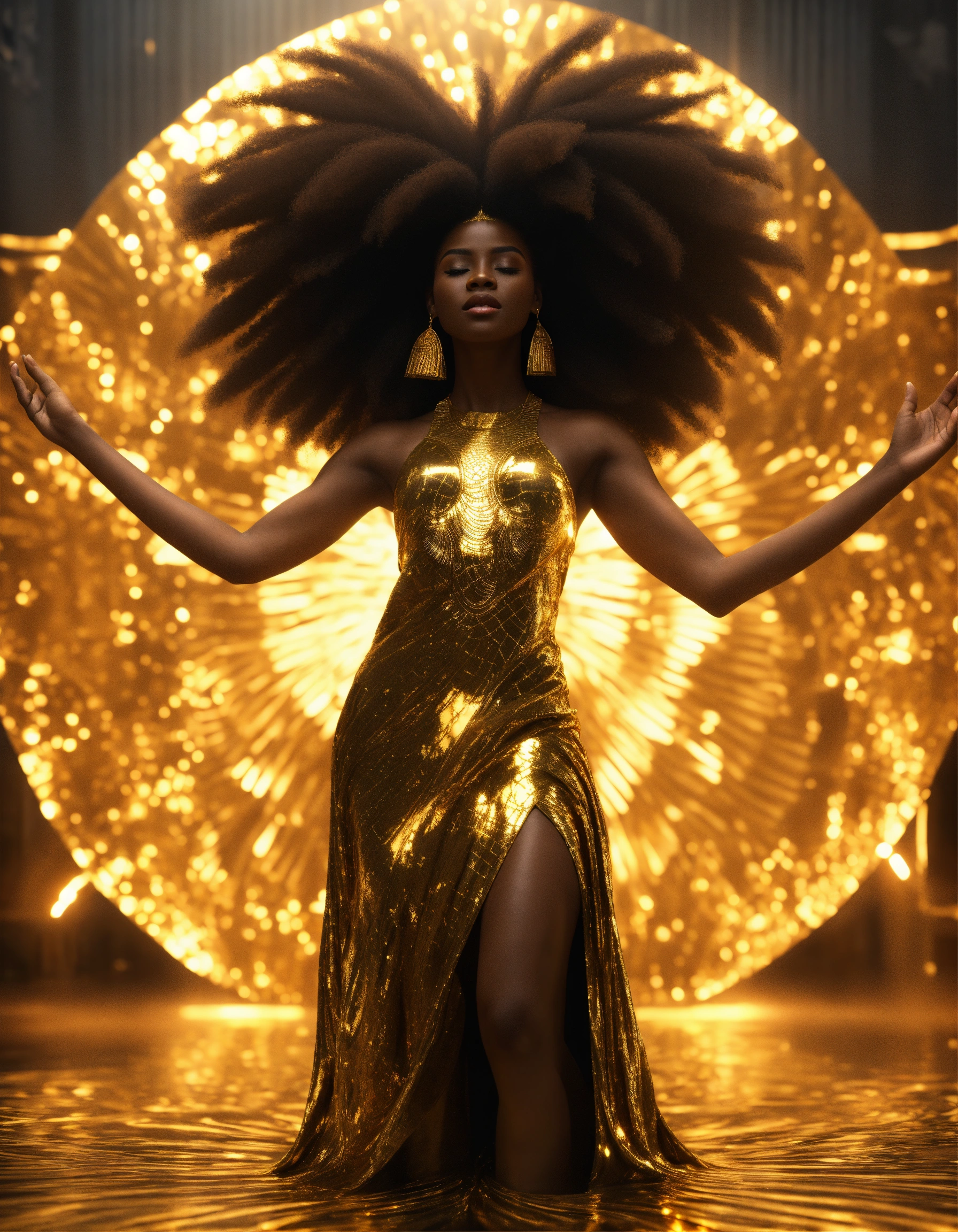 3d render of black woman with afro, full body shot, standing, arms outstretched to sides palms up, eyes open looking directly into camera, liquid gold flows through her entire face and body, illuminating her form from within, wearing long, flowing gold african style clothing