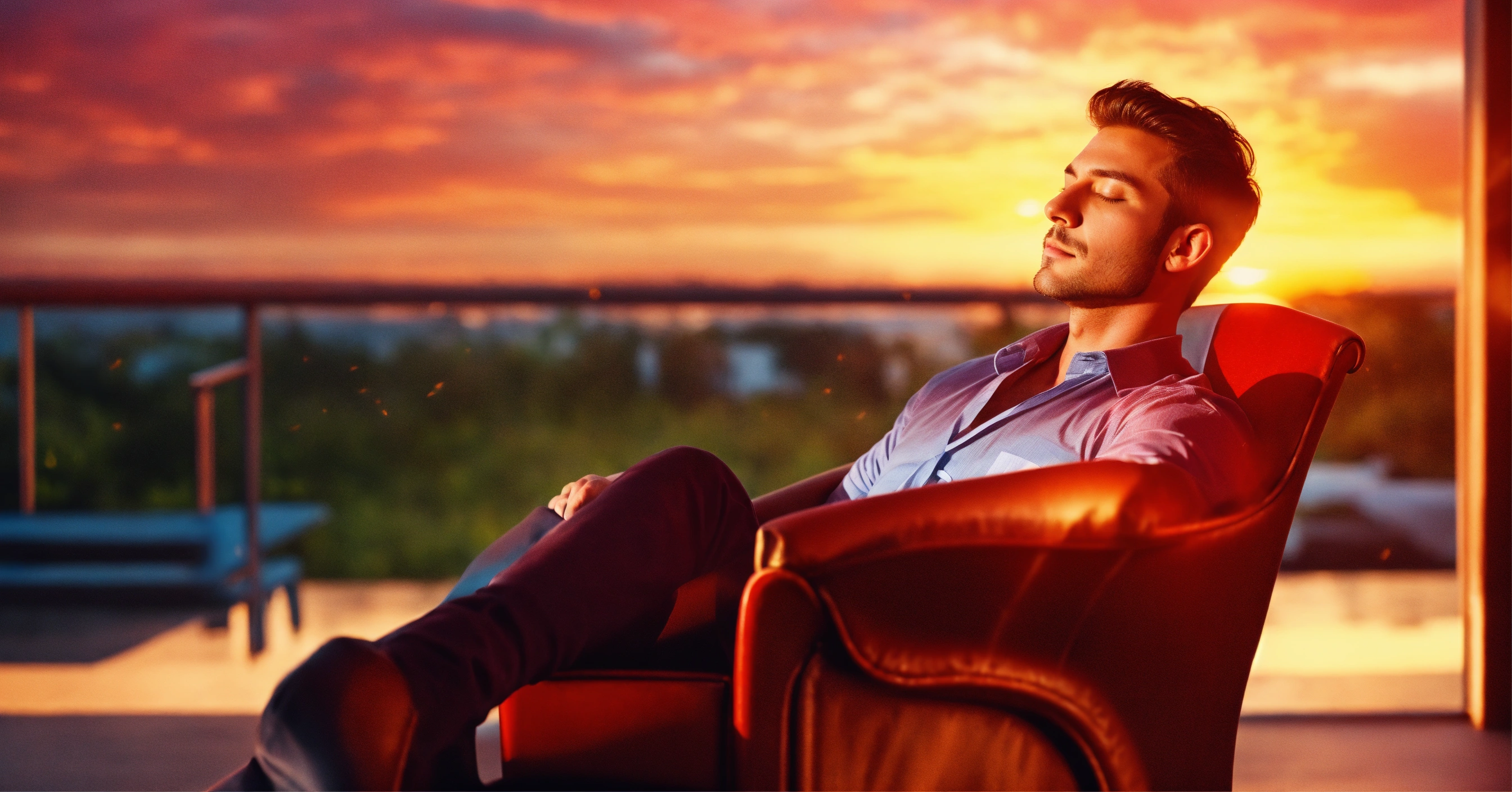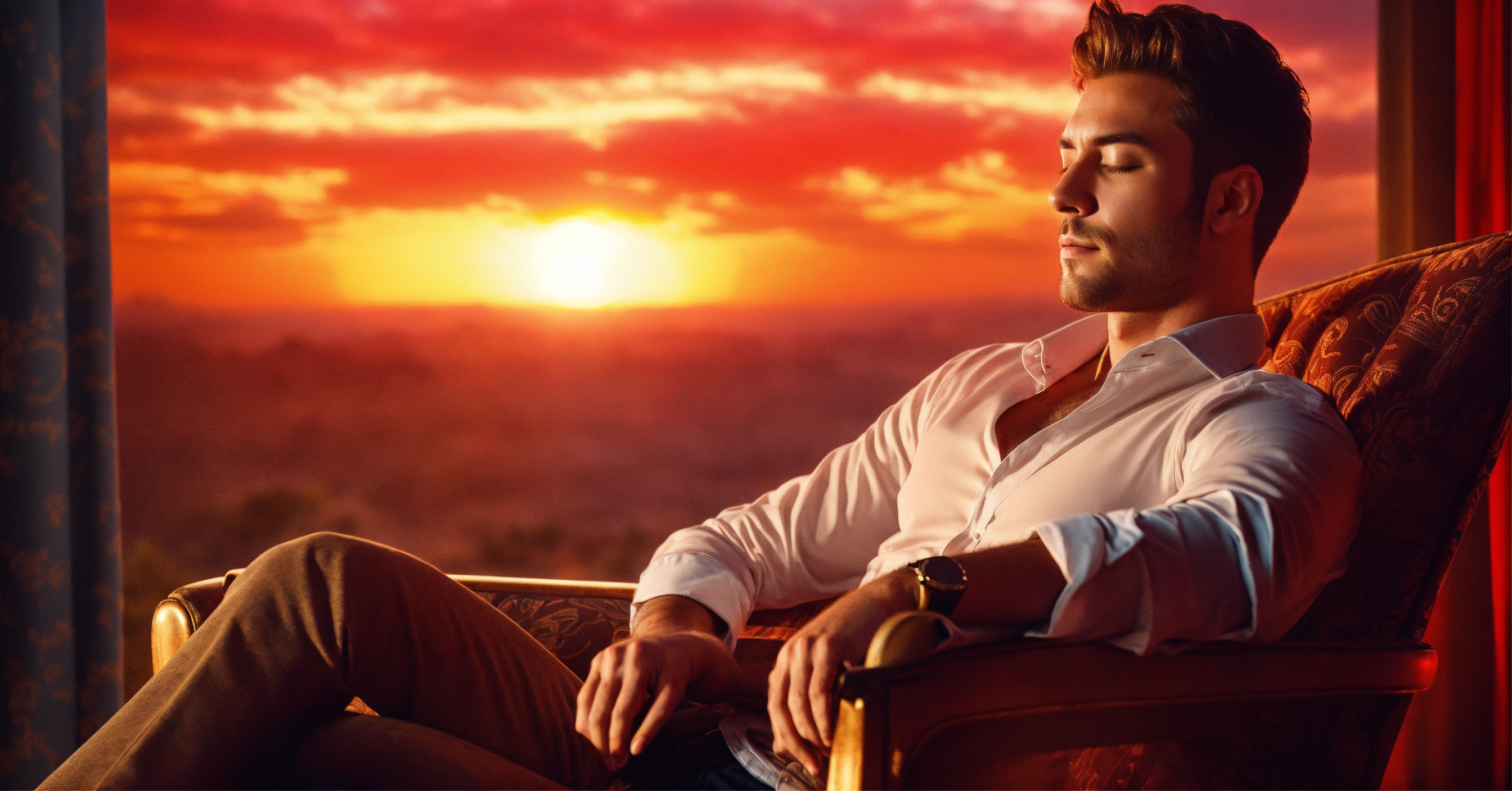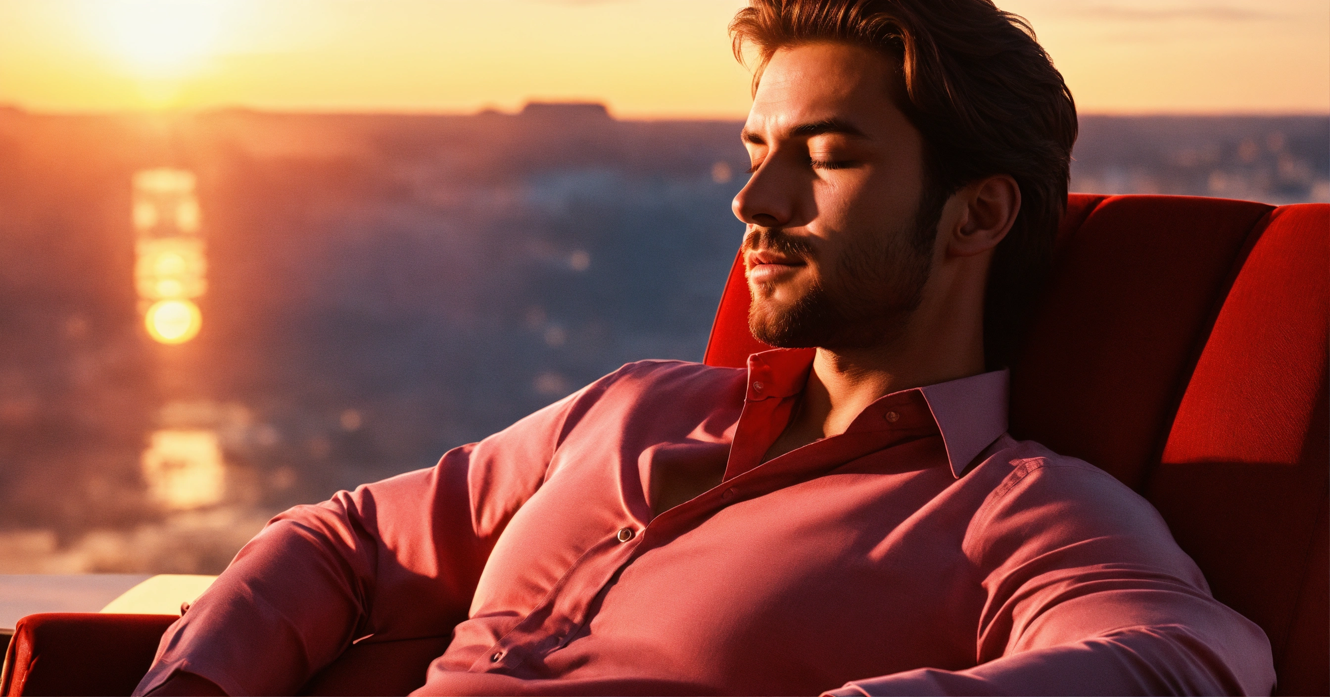 A handsome man relaxing in a chair, eyes closed, shirt unbuttoned, bright red sunrise, a few musical notes visible, 4k resolution, photo realistic, look like a real photo