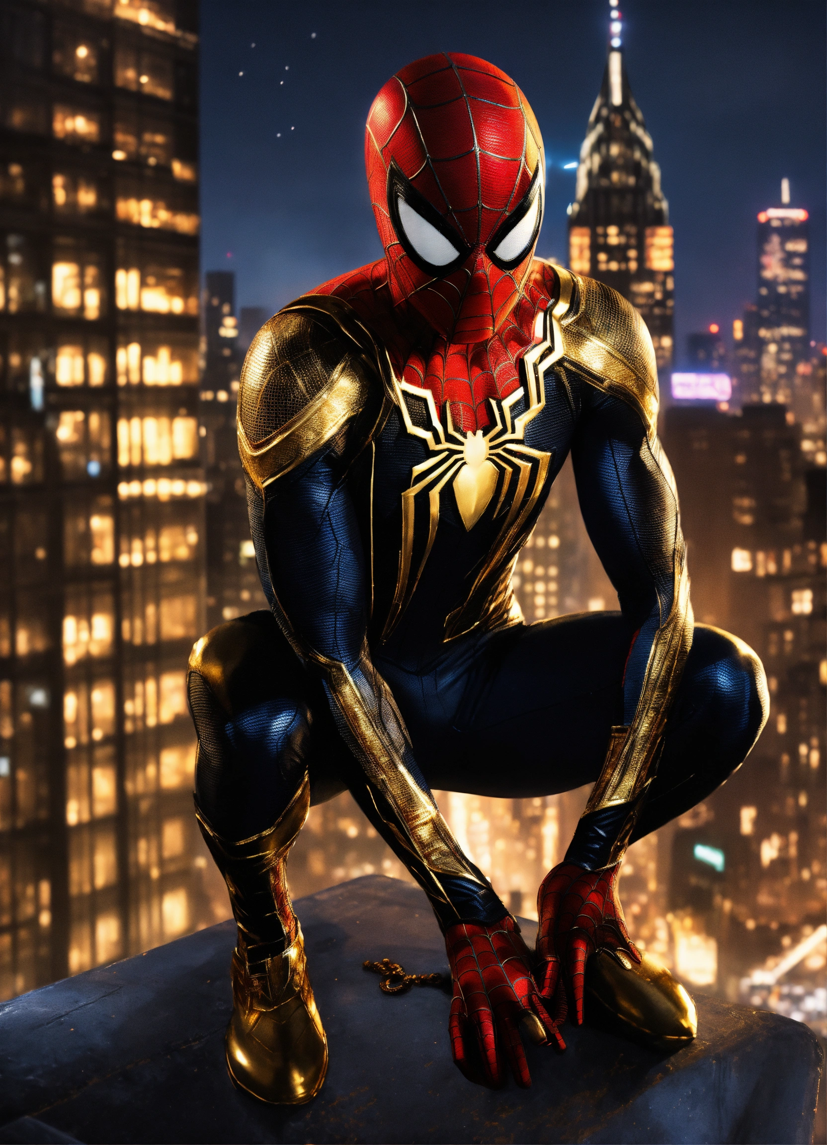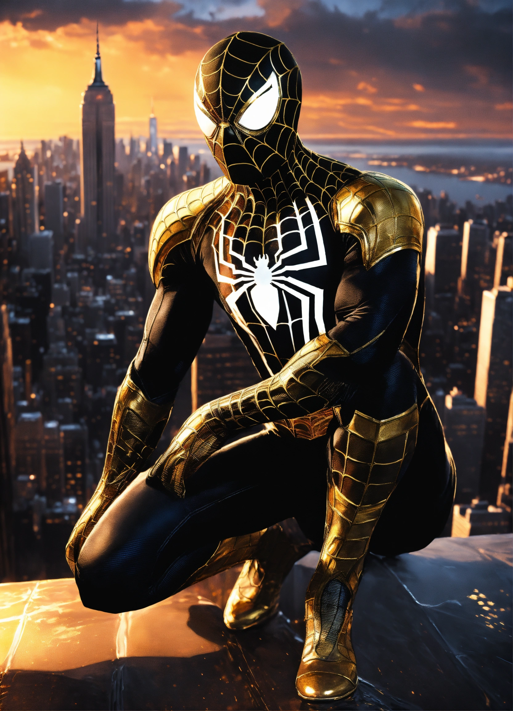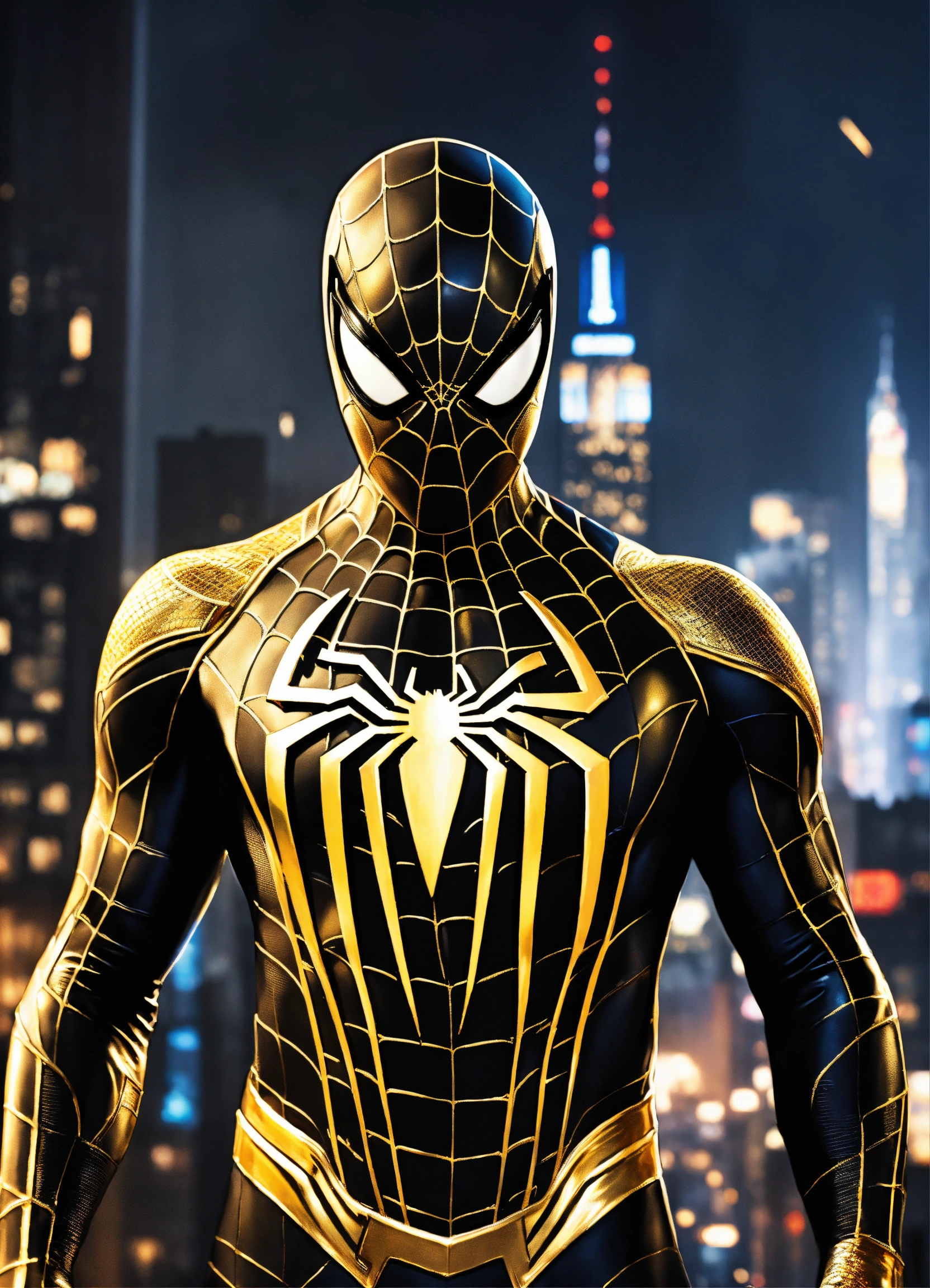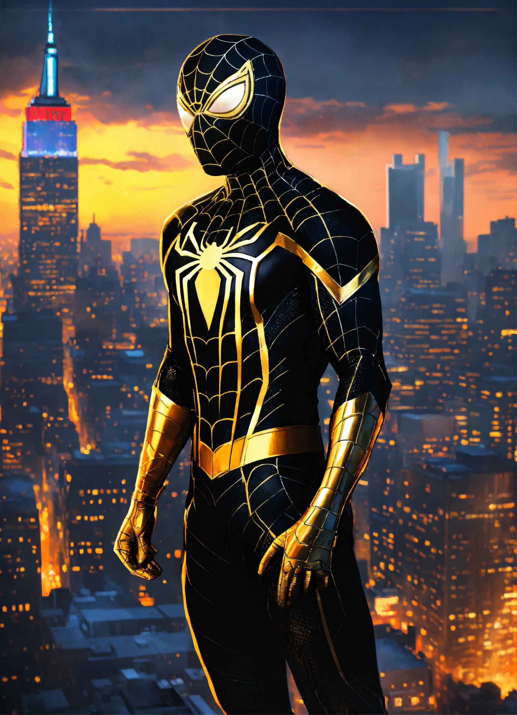 Portrait painting of spider-man wearing a (stunning vanta-black and gold suit), ultra realistic, concept art, intricate details, eerie, highly detailed, photorealistic, octane render, 8k, unreal engine. art by artgerm and jim lee, nyc in the background, full body, night time