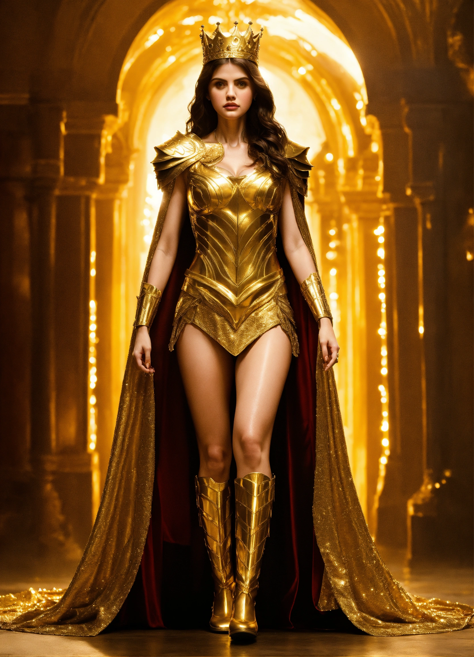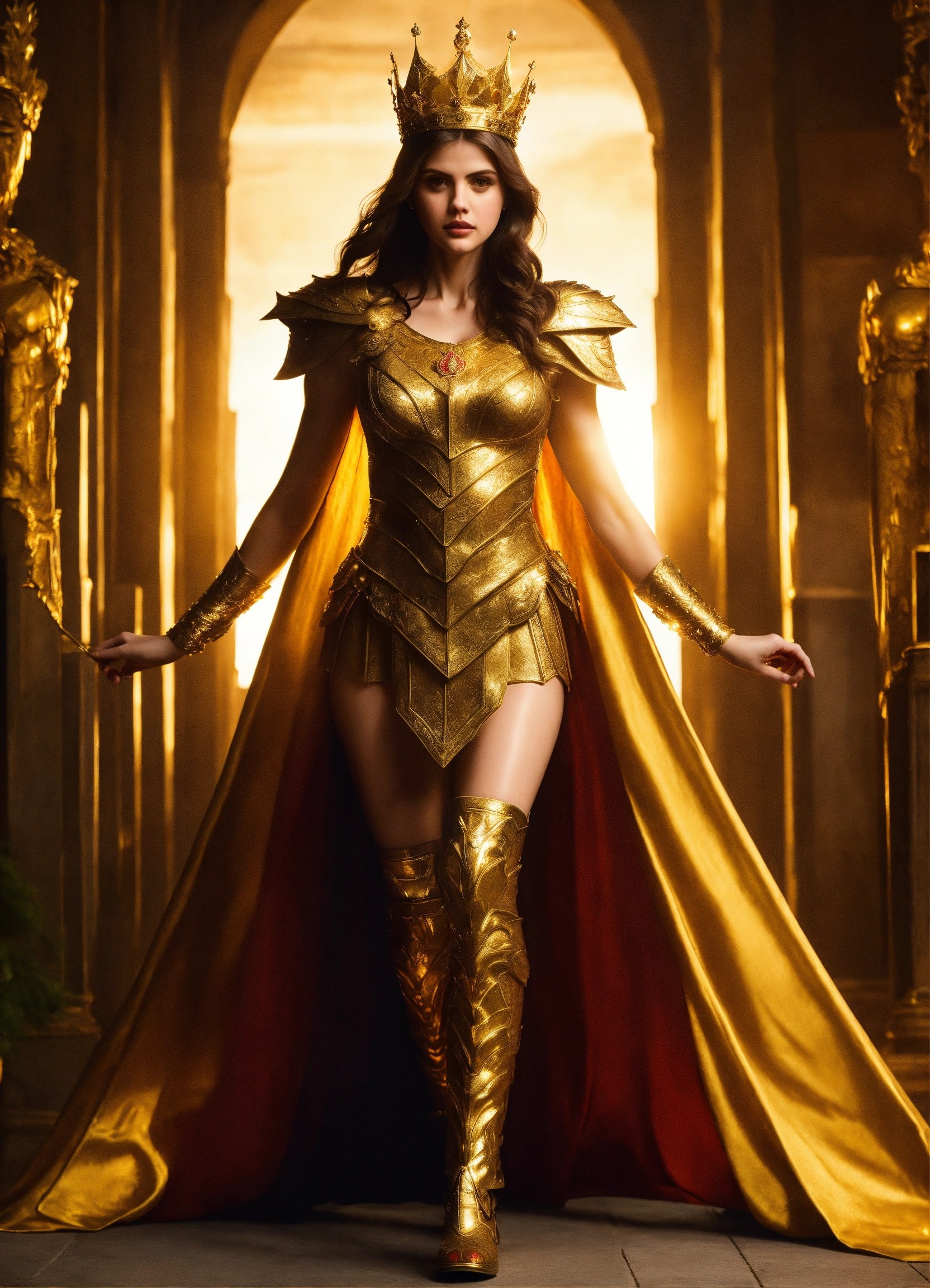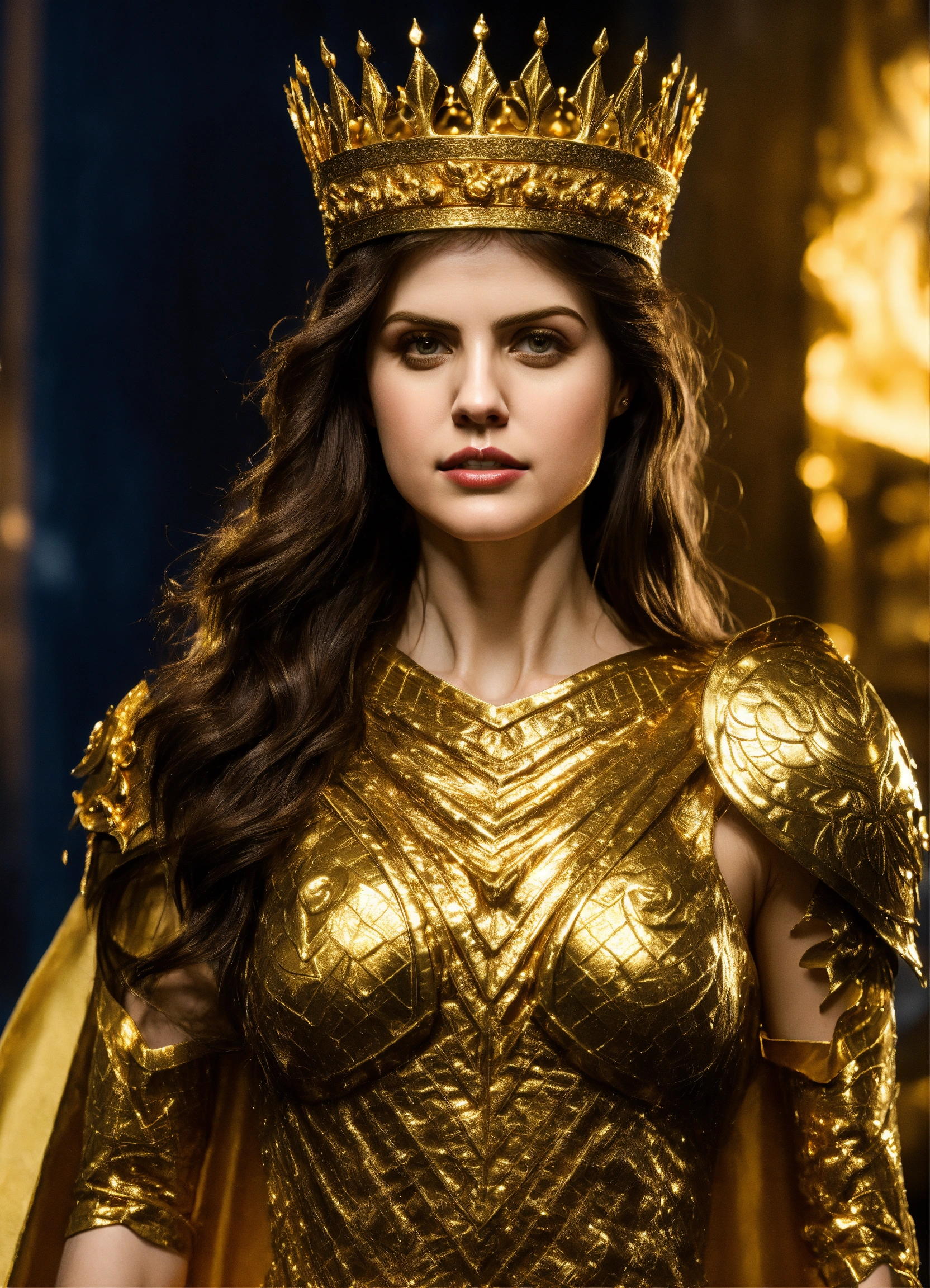 Alexandra daddario as goddess in golden armor with golden cape and crown