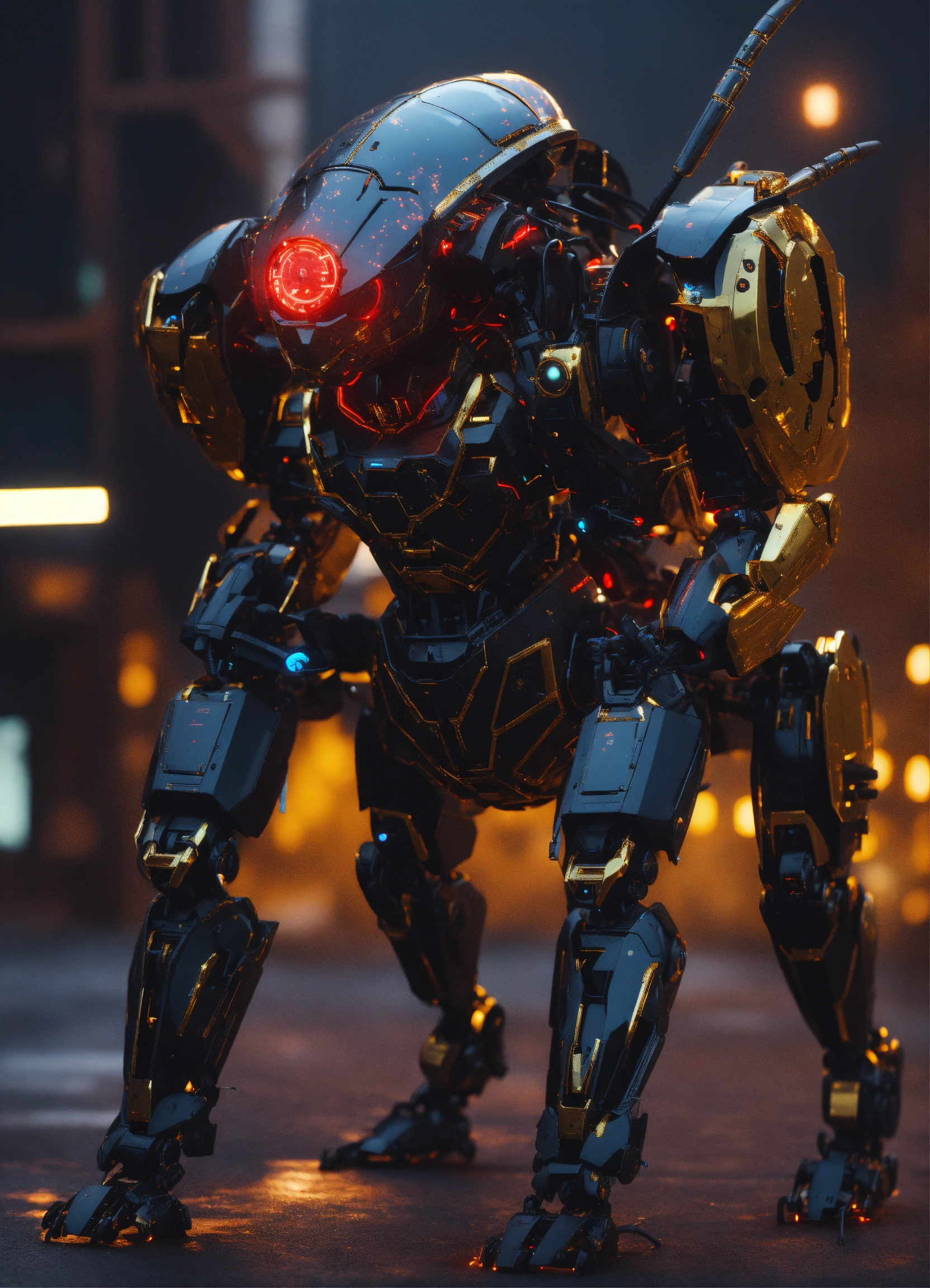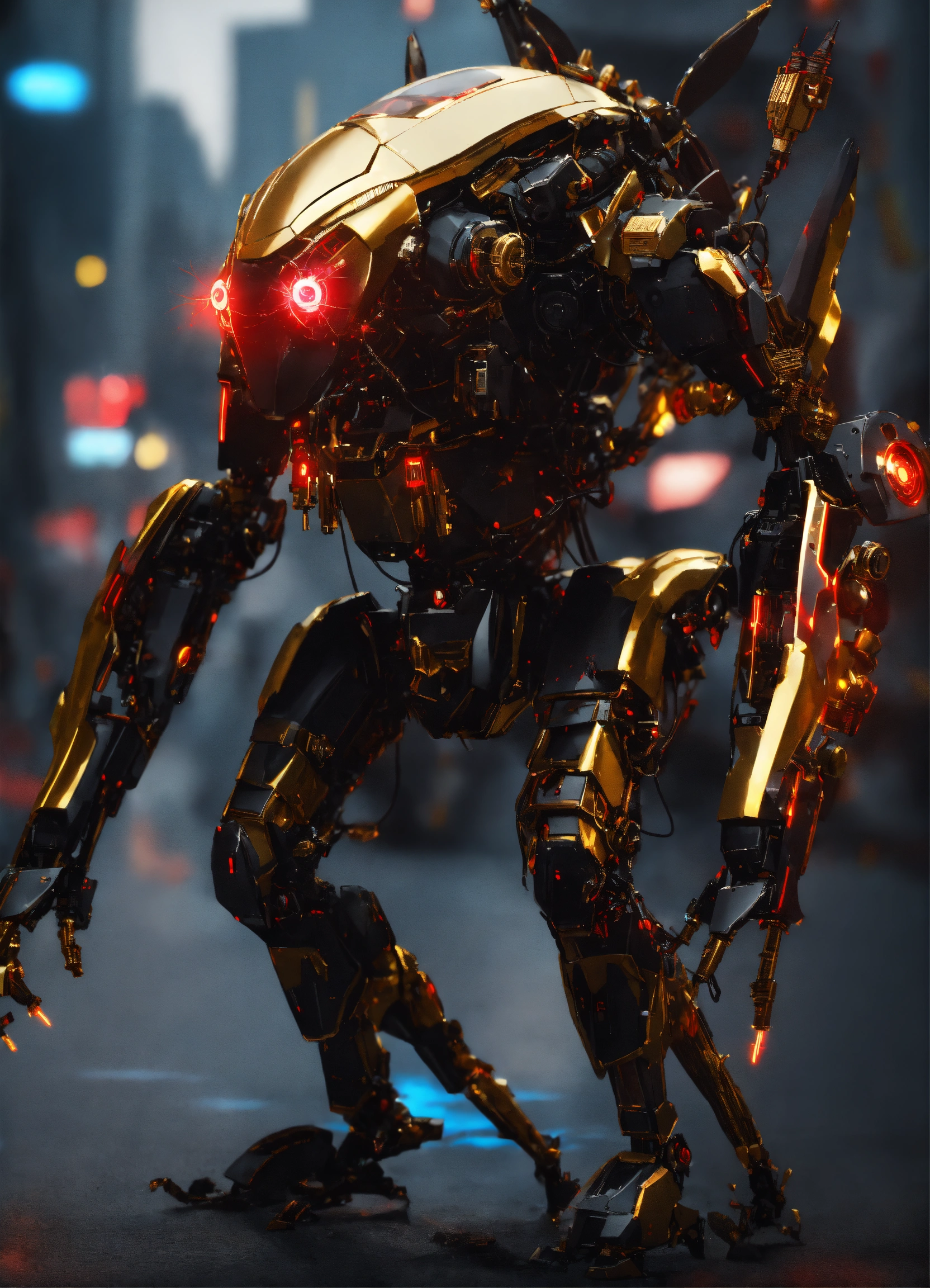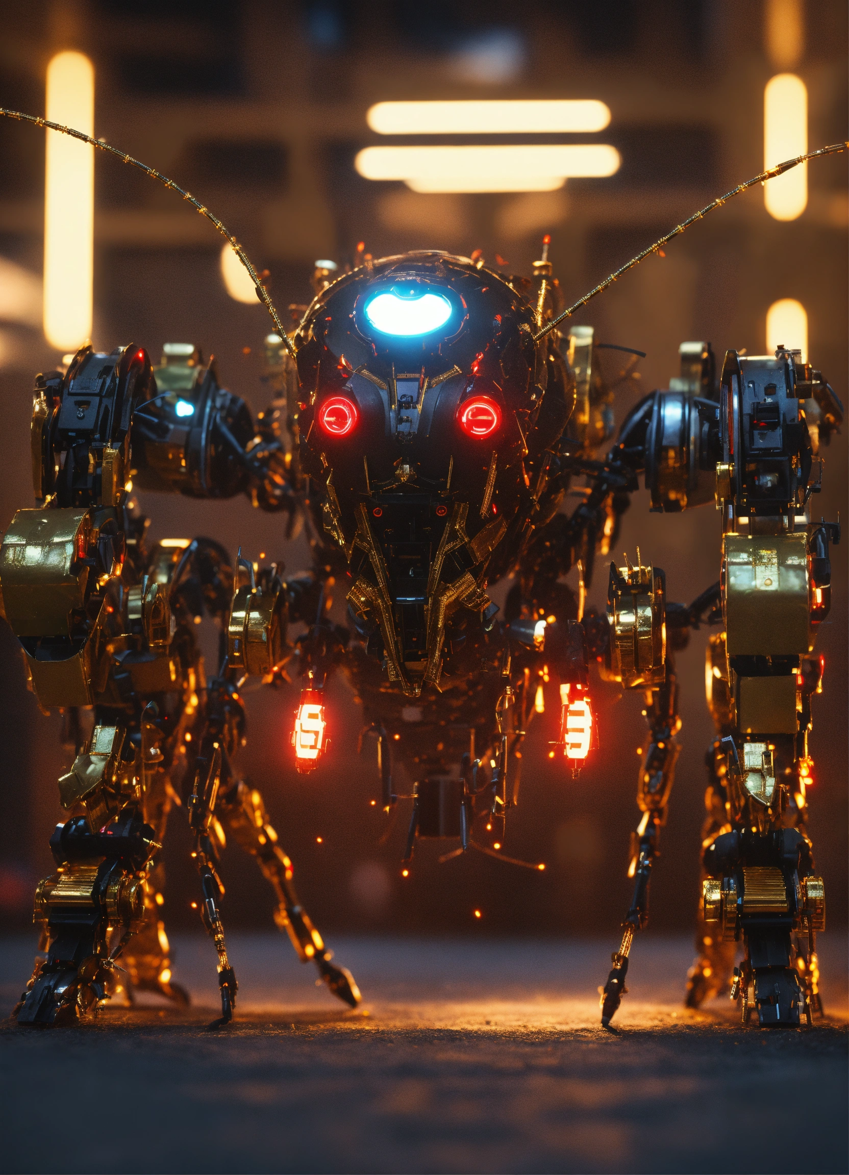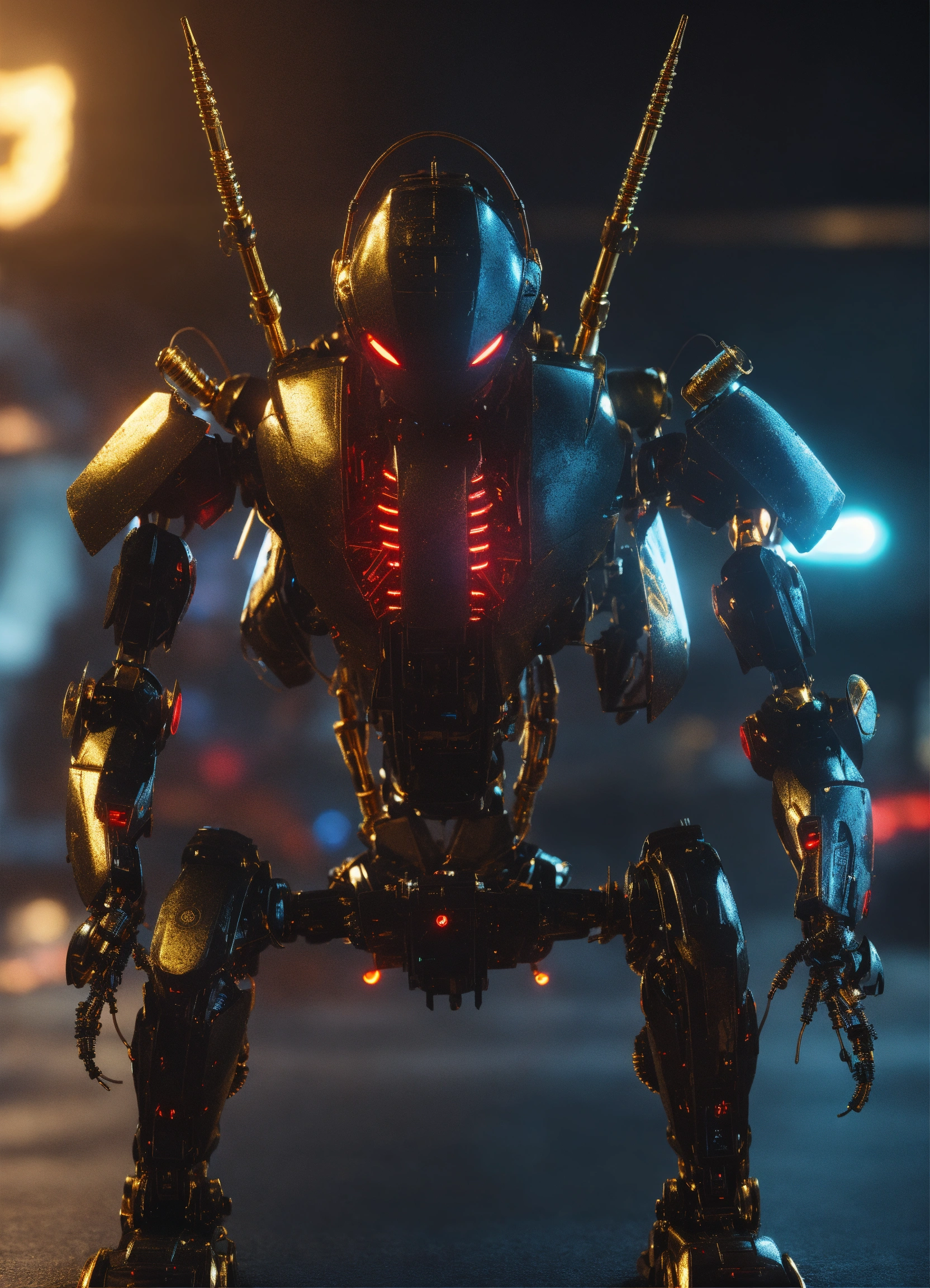 Zoom out of black cockroach faced humanoid robot with red glowing eyes, detailed gold circuitry on it's armor. standing and shooting electricity from his powerful antenna attacking, realistic, 8k