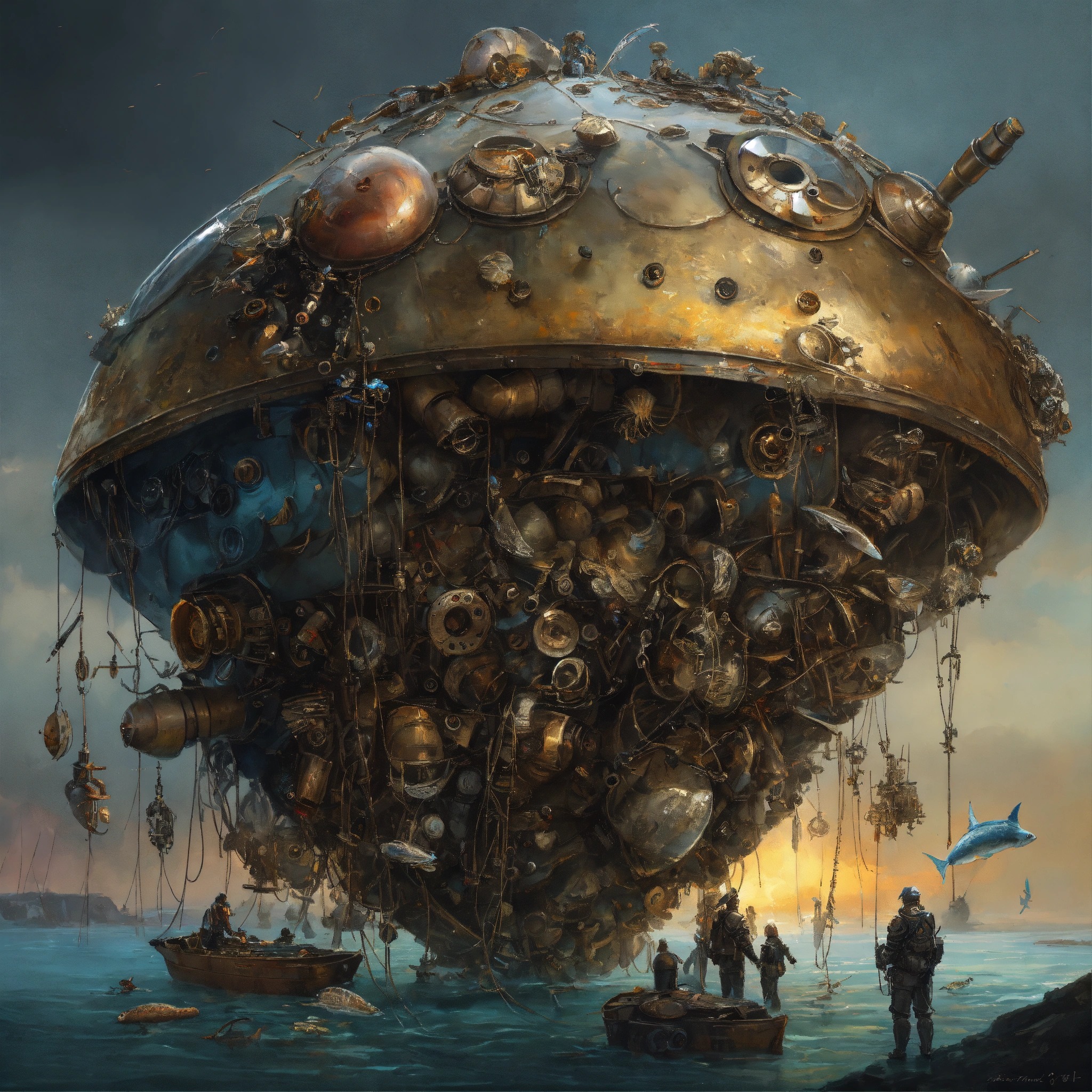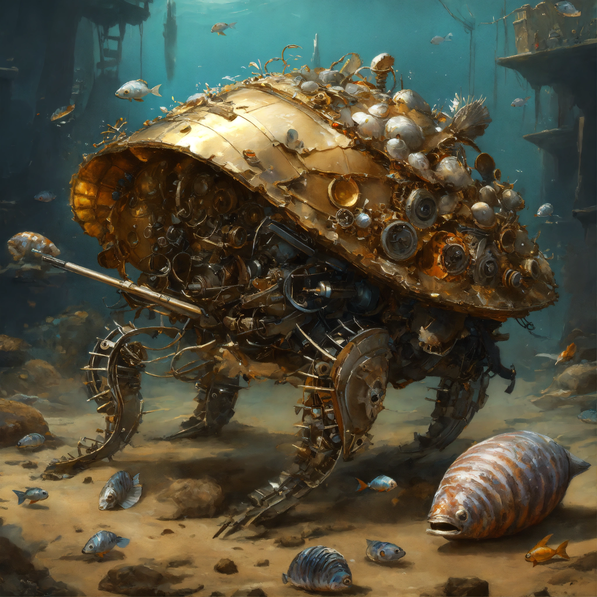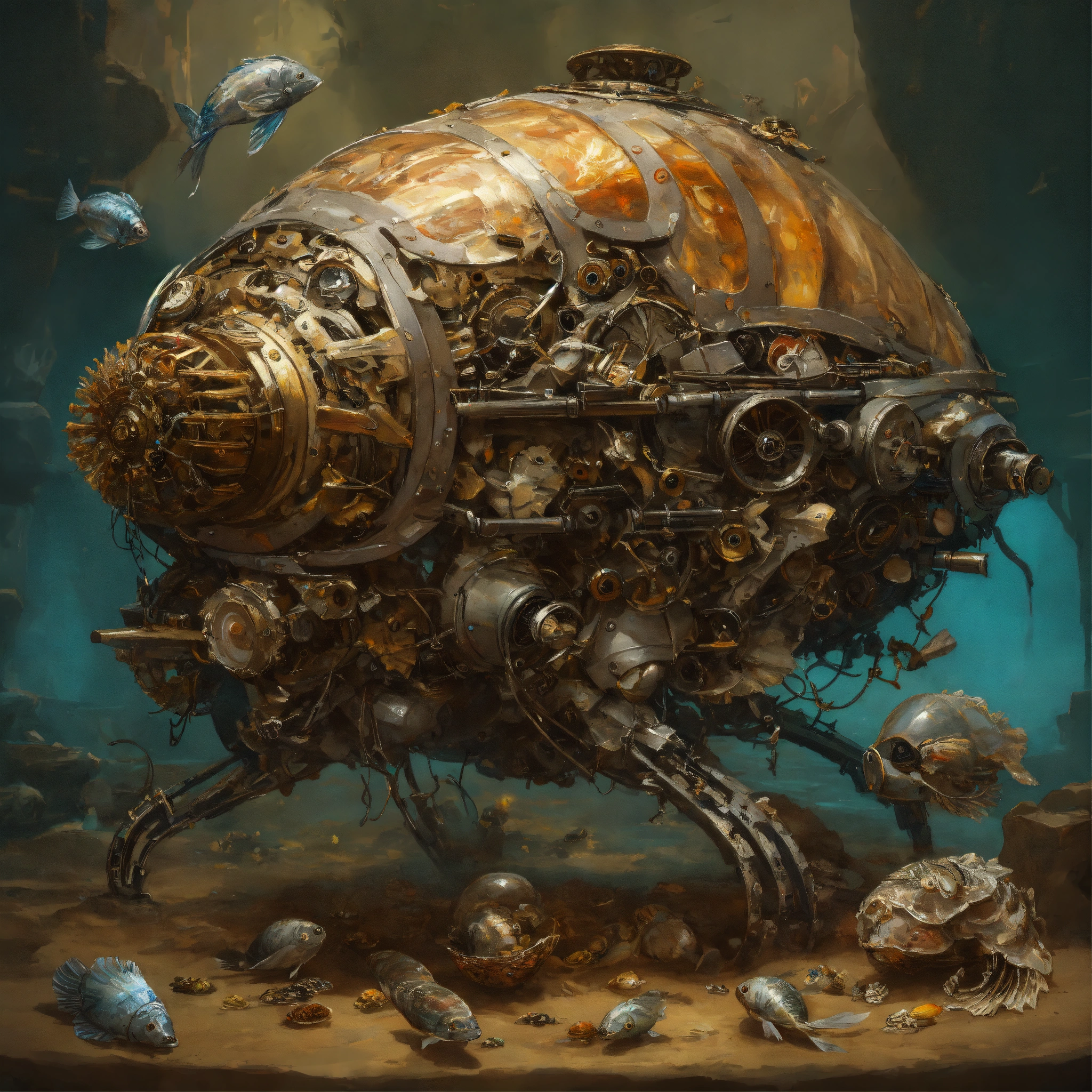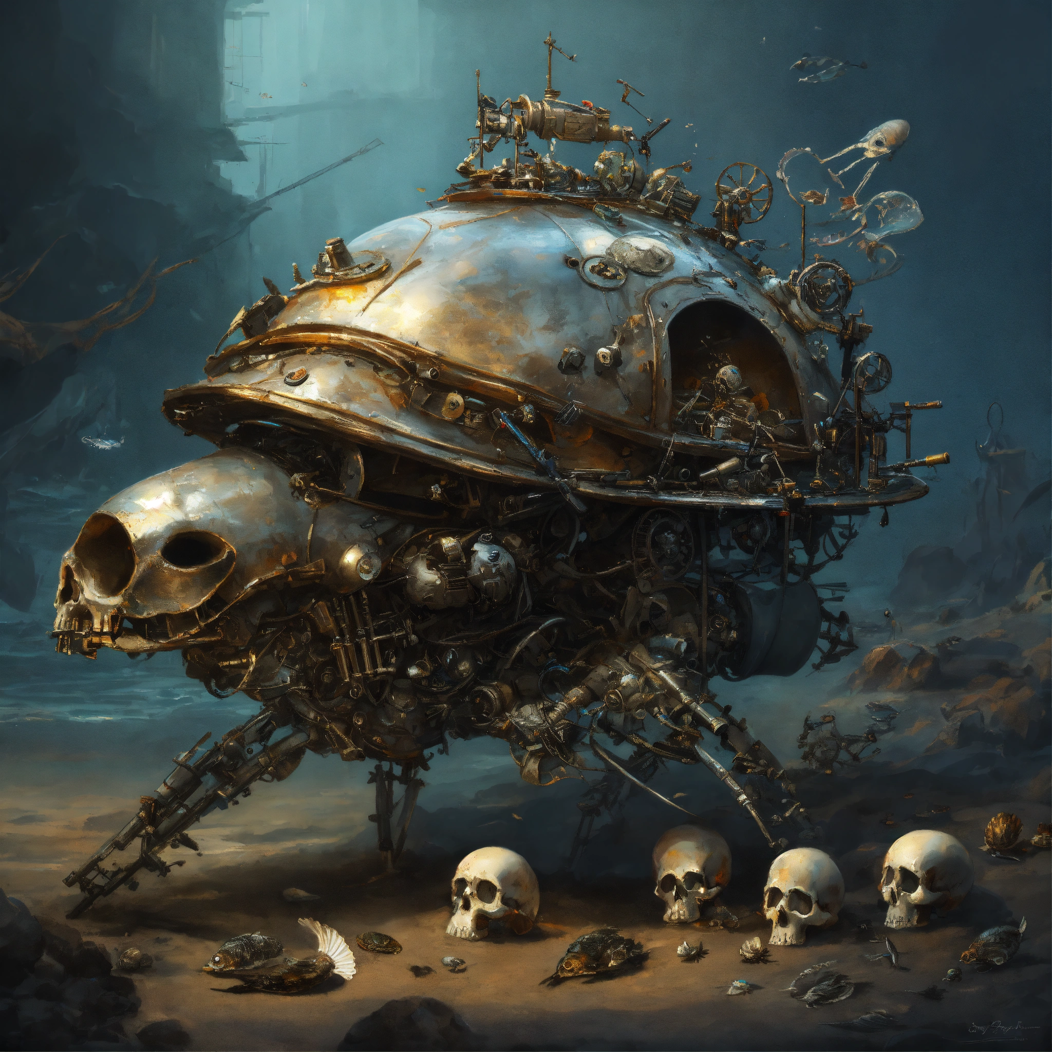 Concept art of an mechanical oyster, shell made out of scrap metal guns armor metal objects, surrounded by dead fish and human skeletons, oil painting style, highly detailed, brush strokes, 8k
