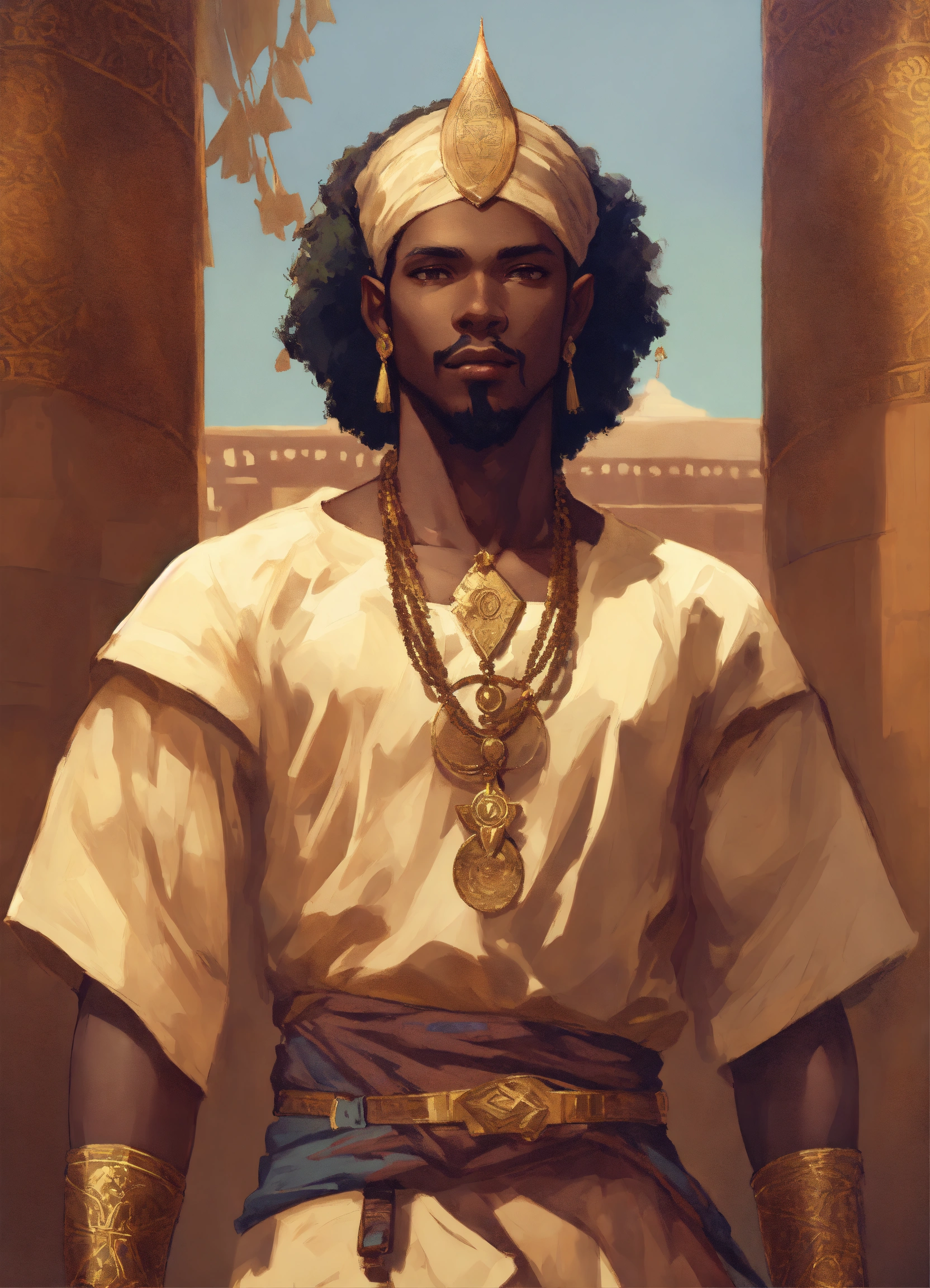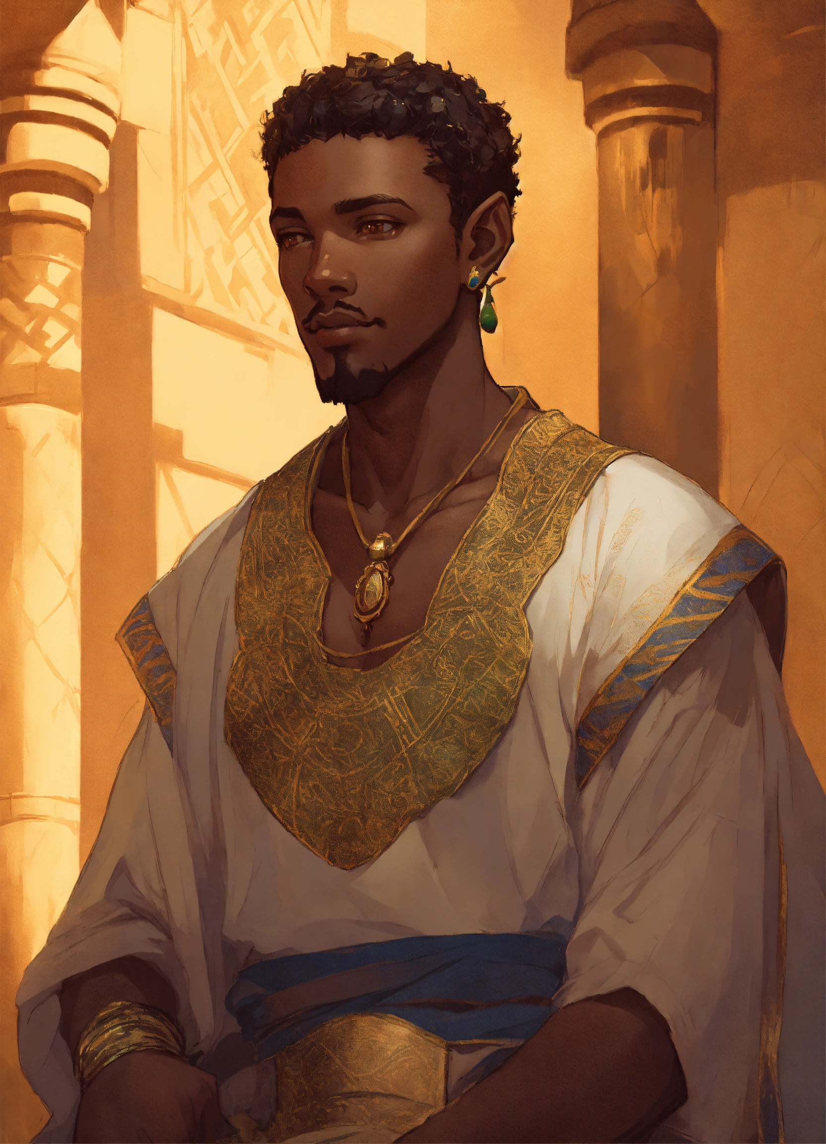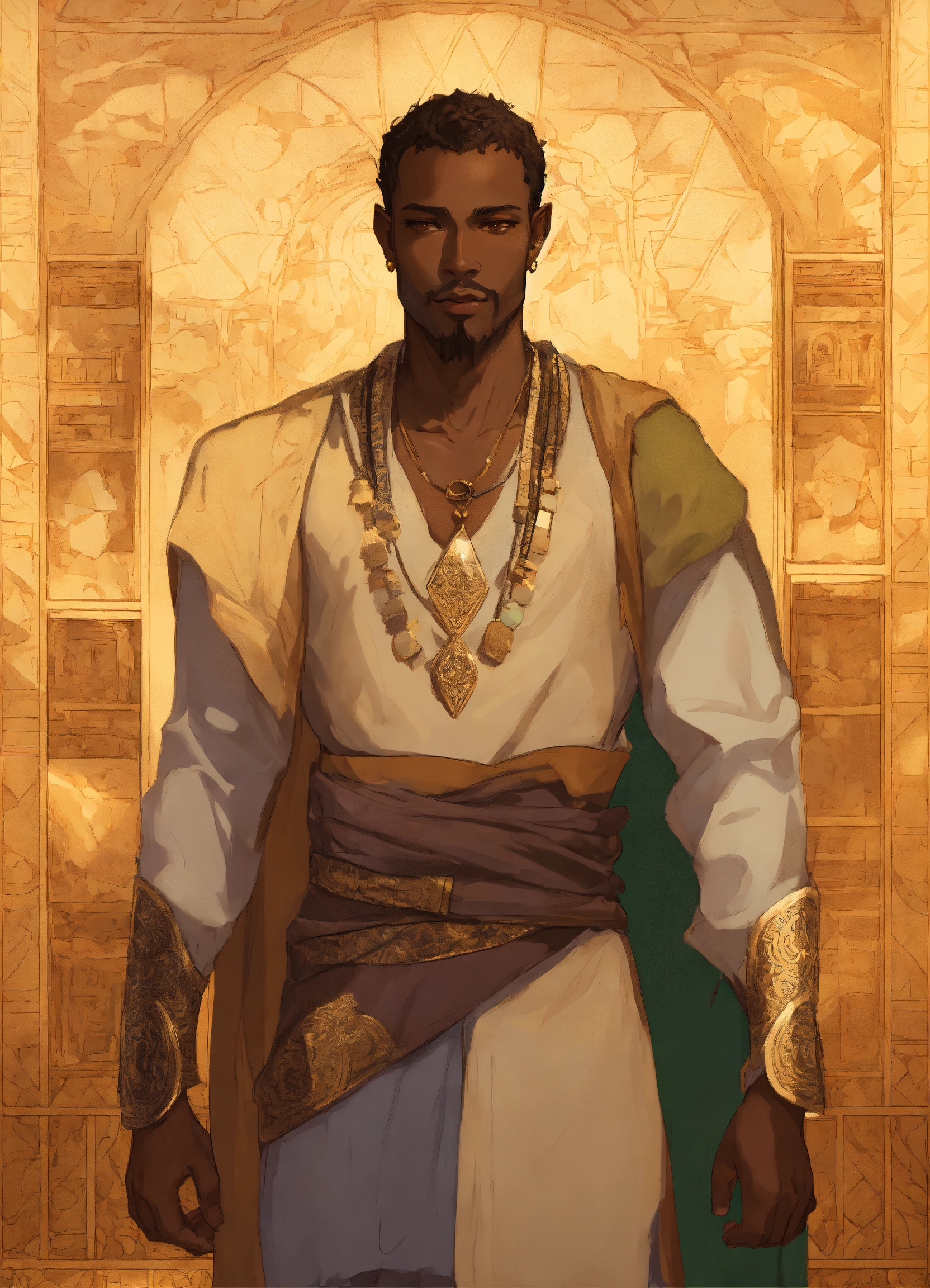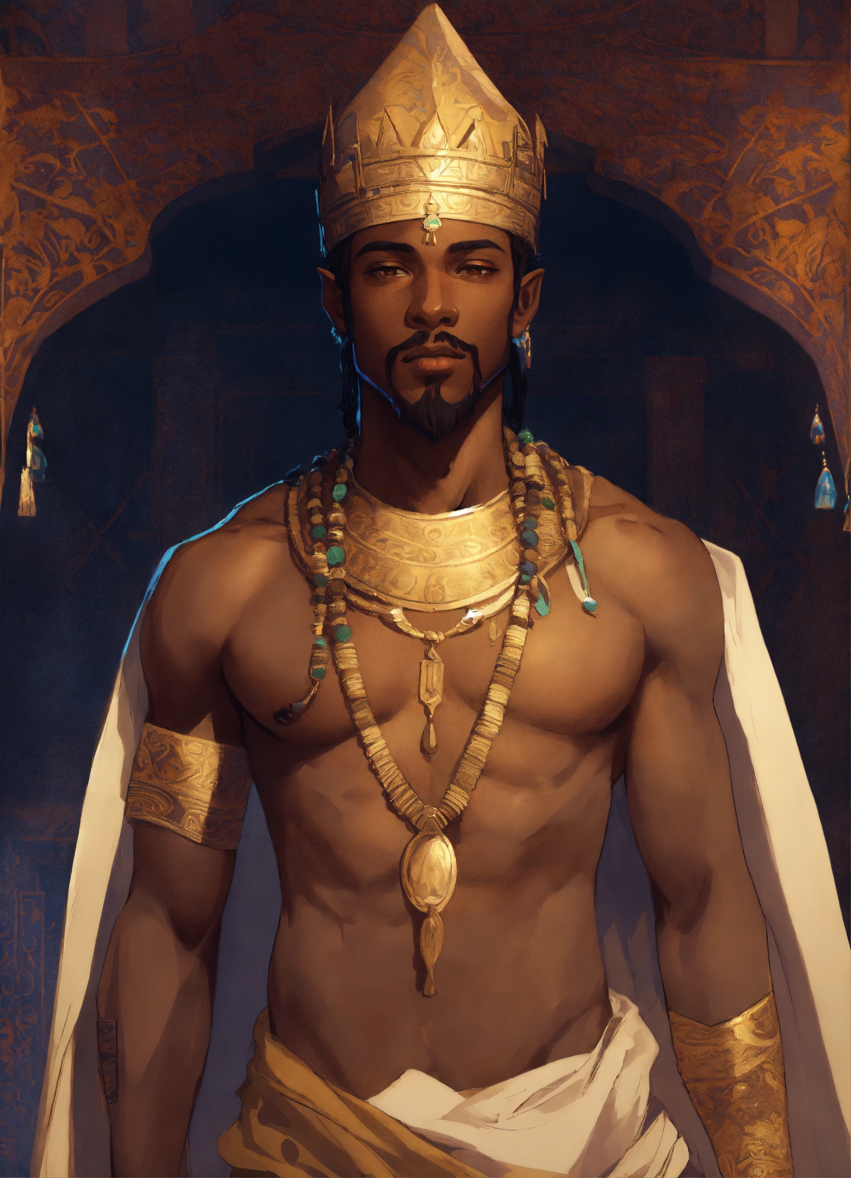 Elf male with dark brown skin based on mansa musa, mali, brown eyes, high cheekbones, toned, african, timbuktu, greg rutkowski, makoto shinkai, alphonse mucha, stylized, full body