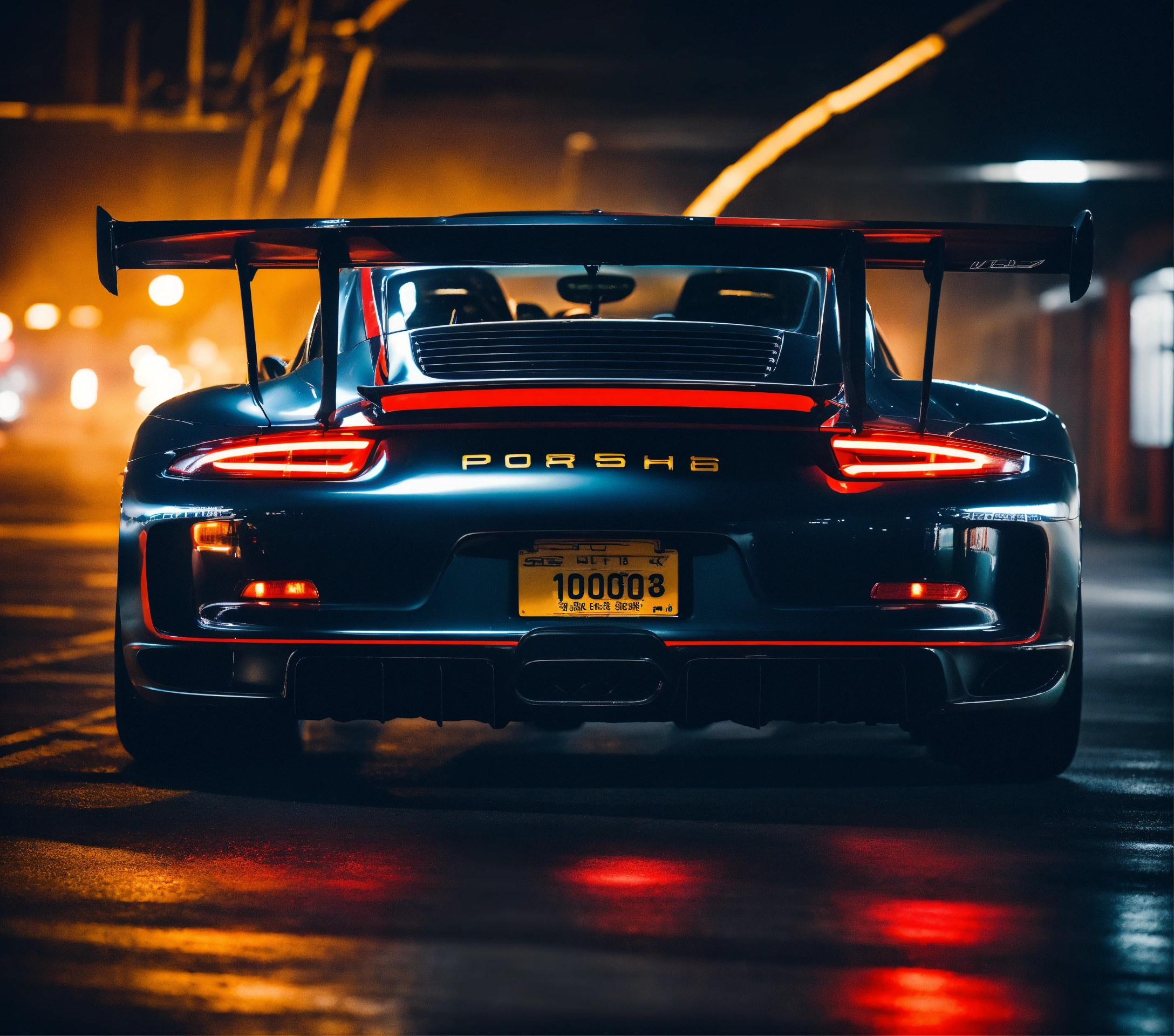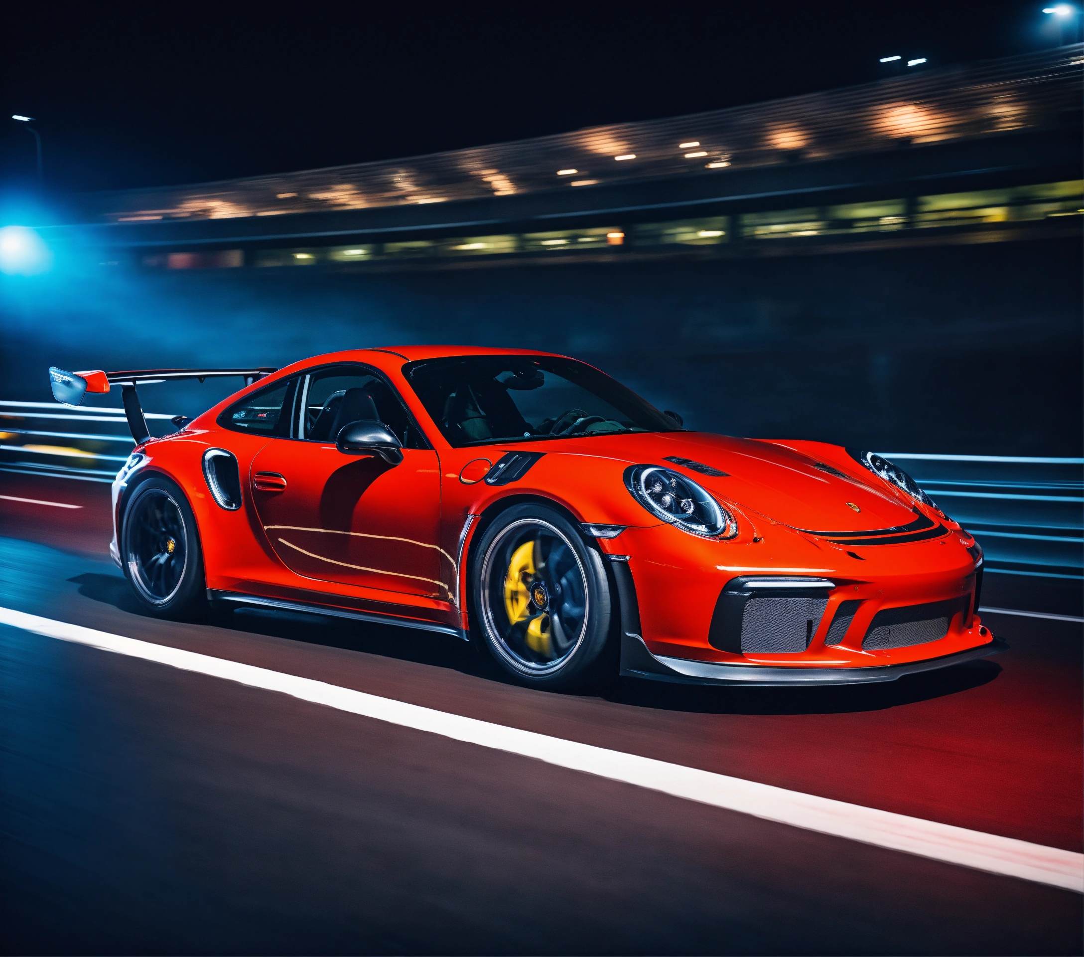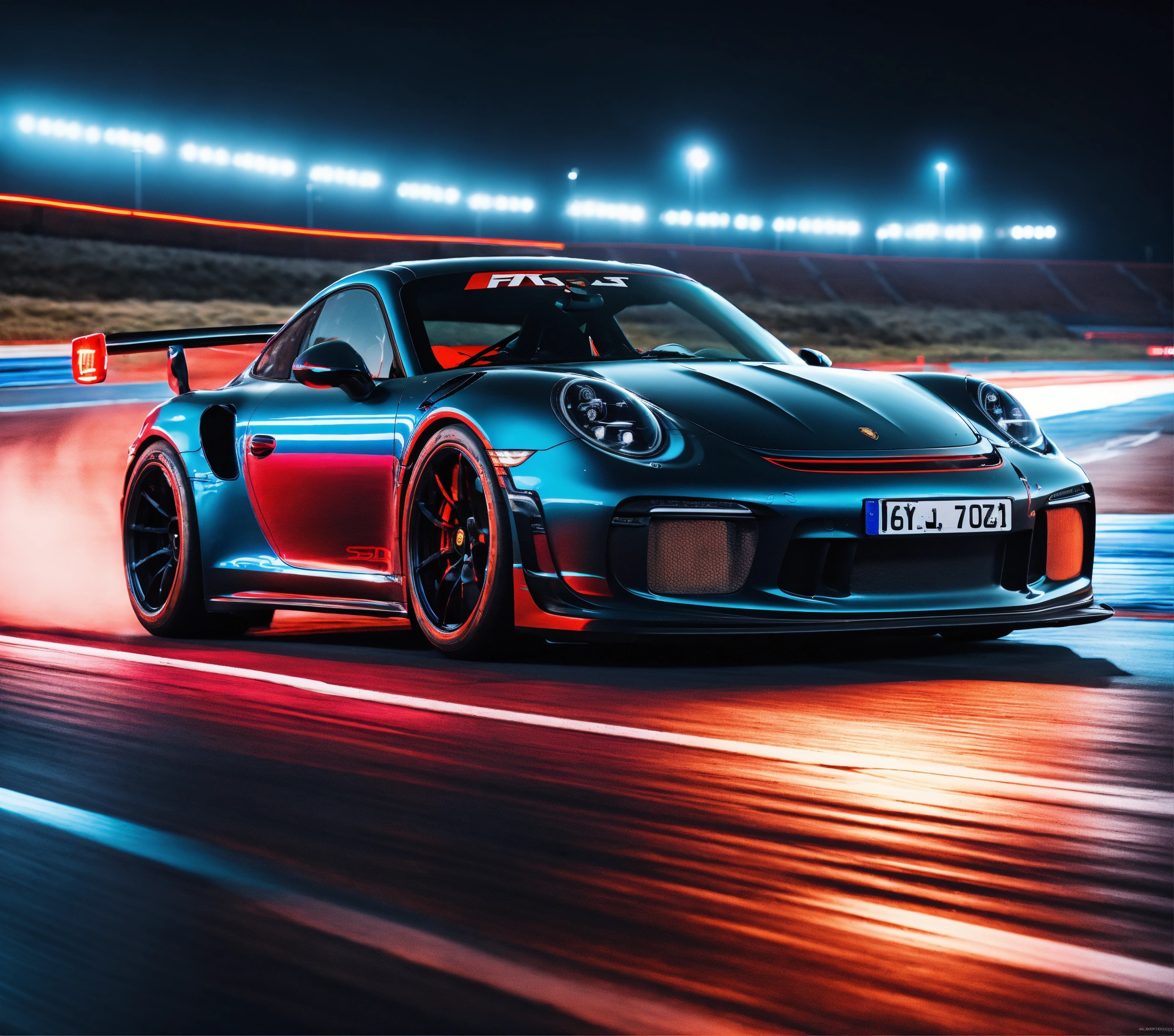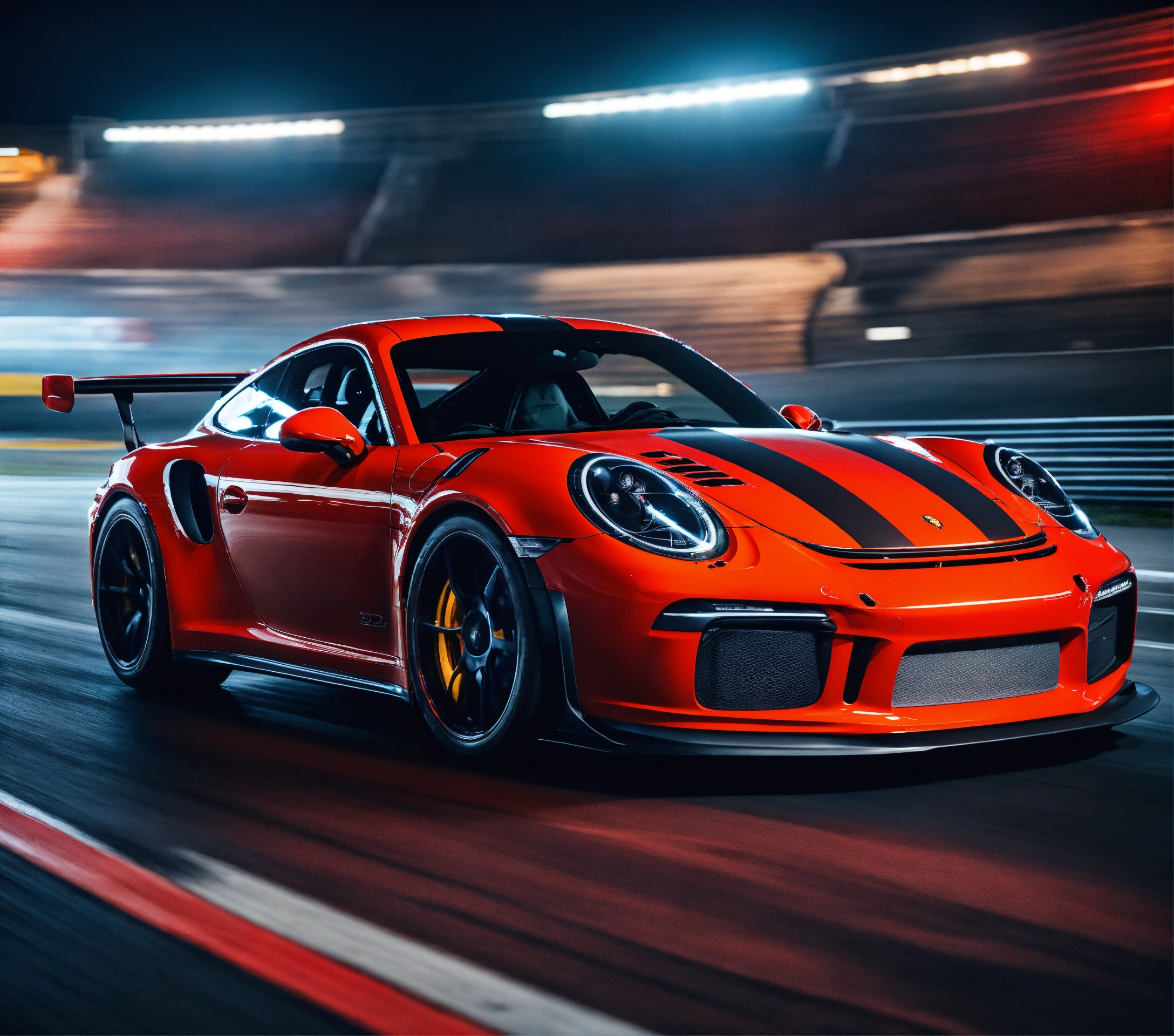 Ultra-realistic 16k night photo, black and red porsche with speed effect, porsche gt3 rs, at full speed, with fast car movement, with feeling of speed, automobile photographer, man circuit in the stands, speed, track, cinema atmosphere, ultra-realistic, with a black background and a palette inspired by the variant of the film "blue lagoon". composition taken with a canon eos-1d.