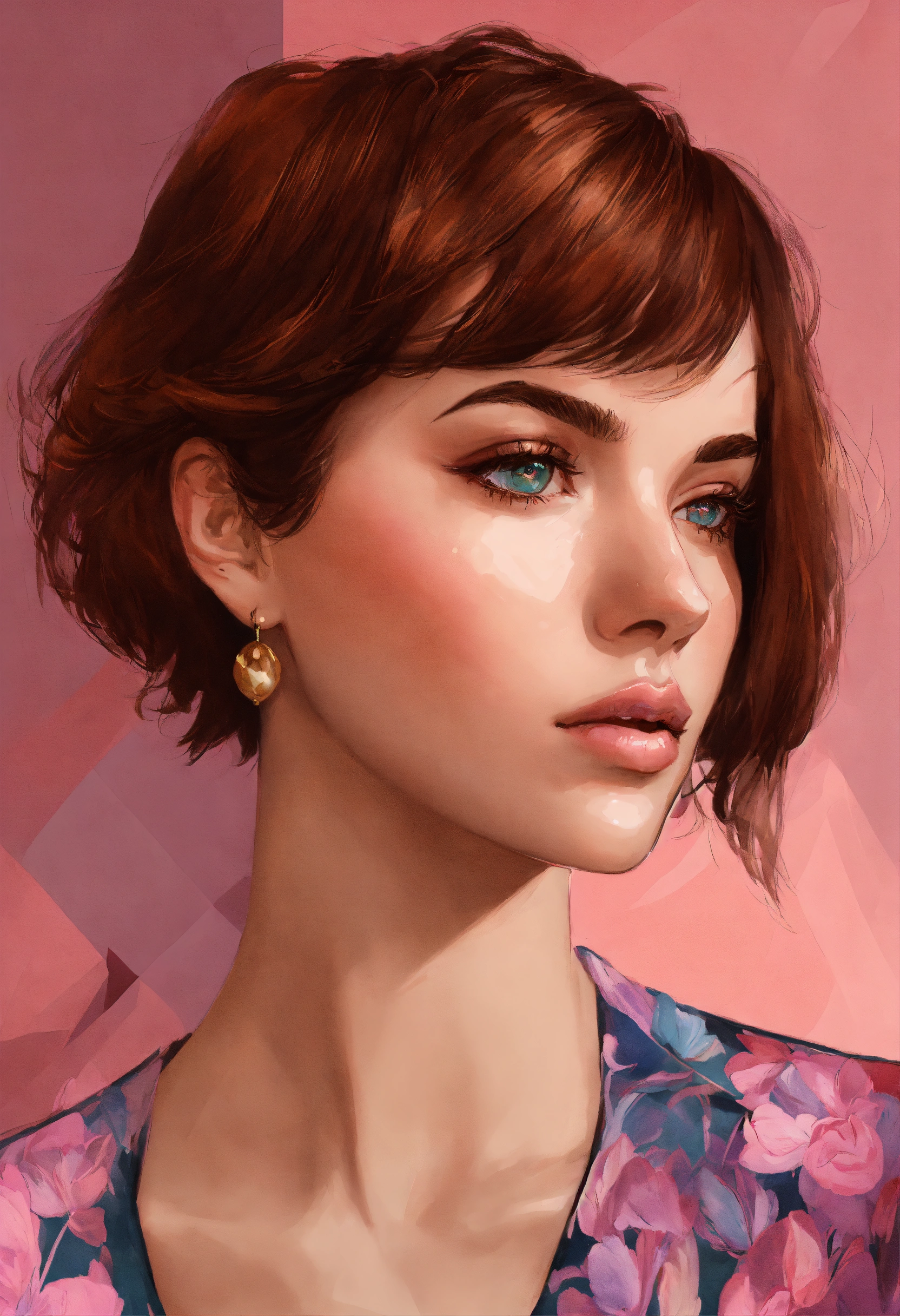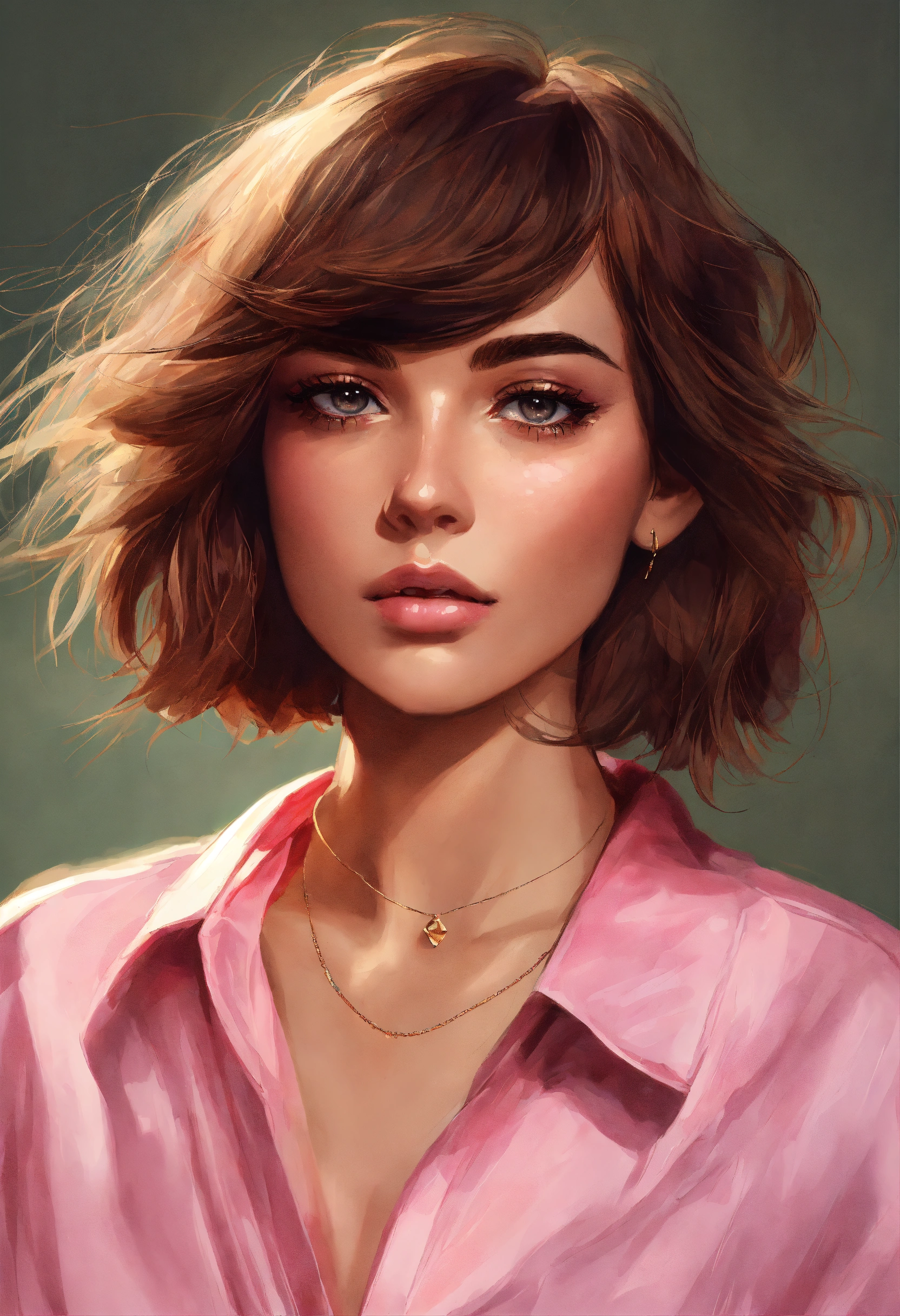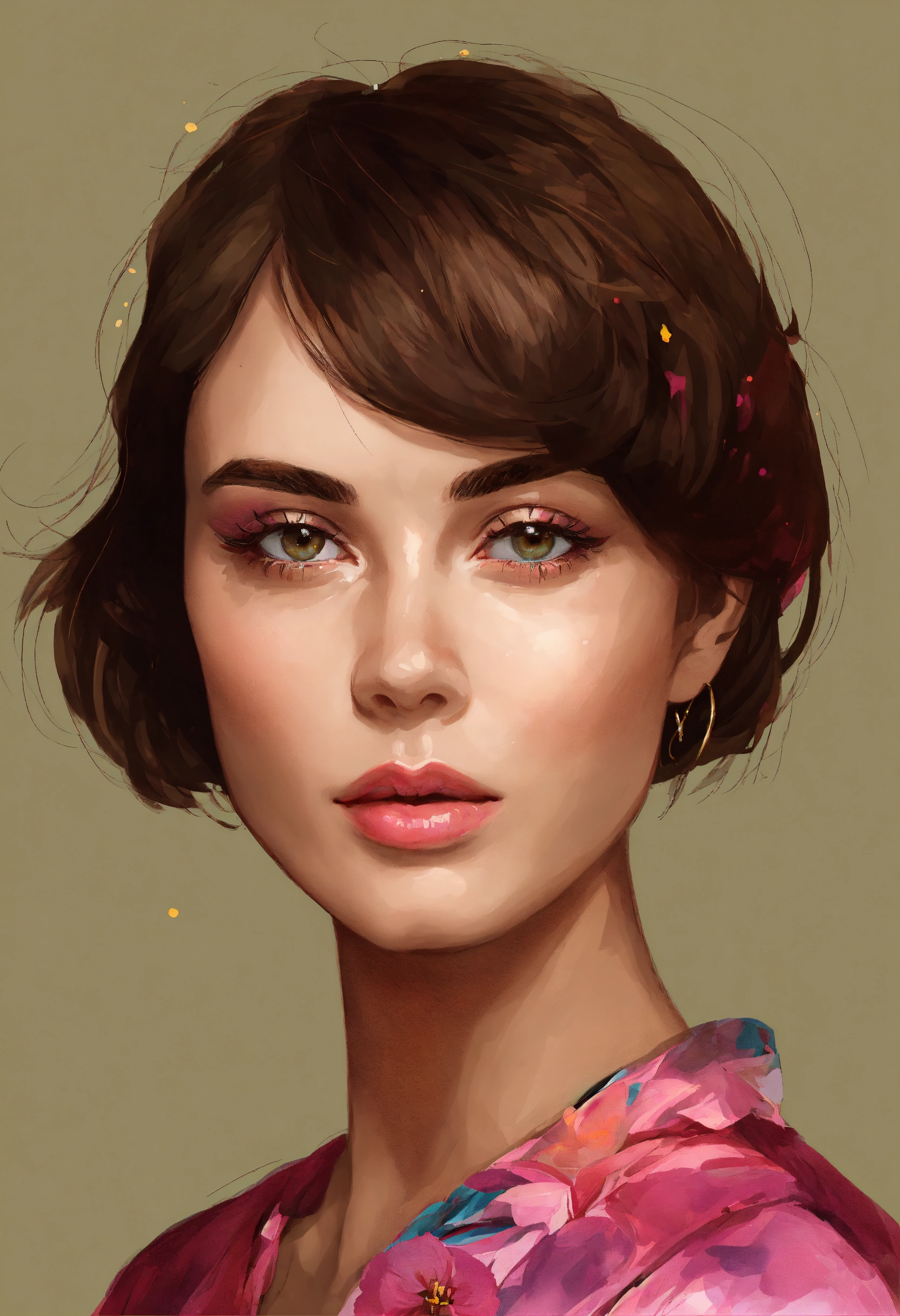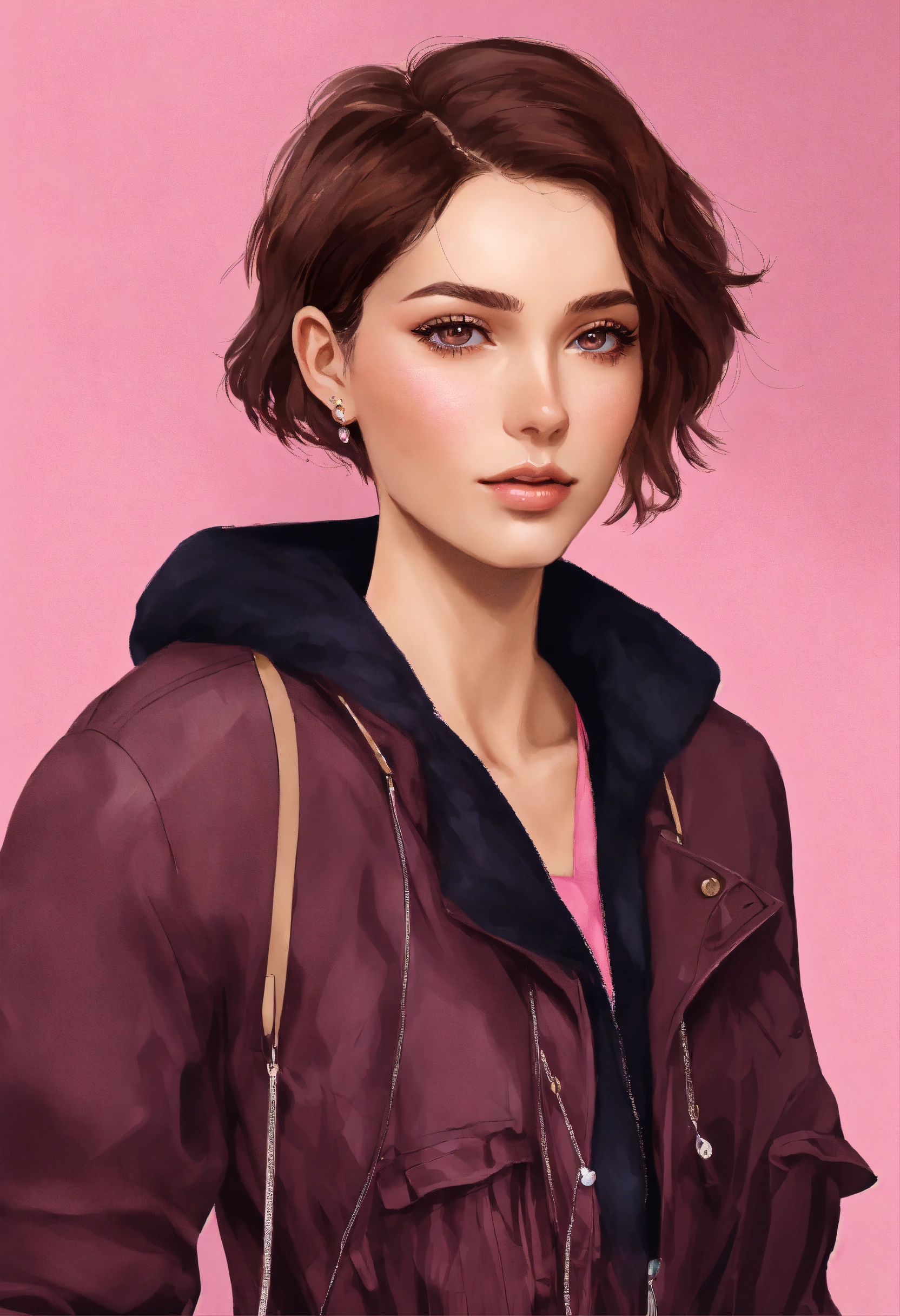 A digital portrait of a female fashion designer, she has short brown hair and long eyelashes, she has pink irises