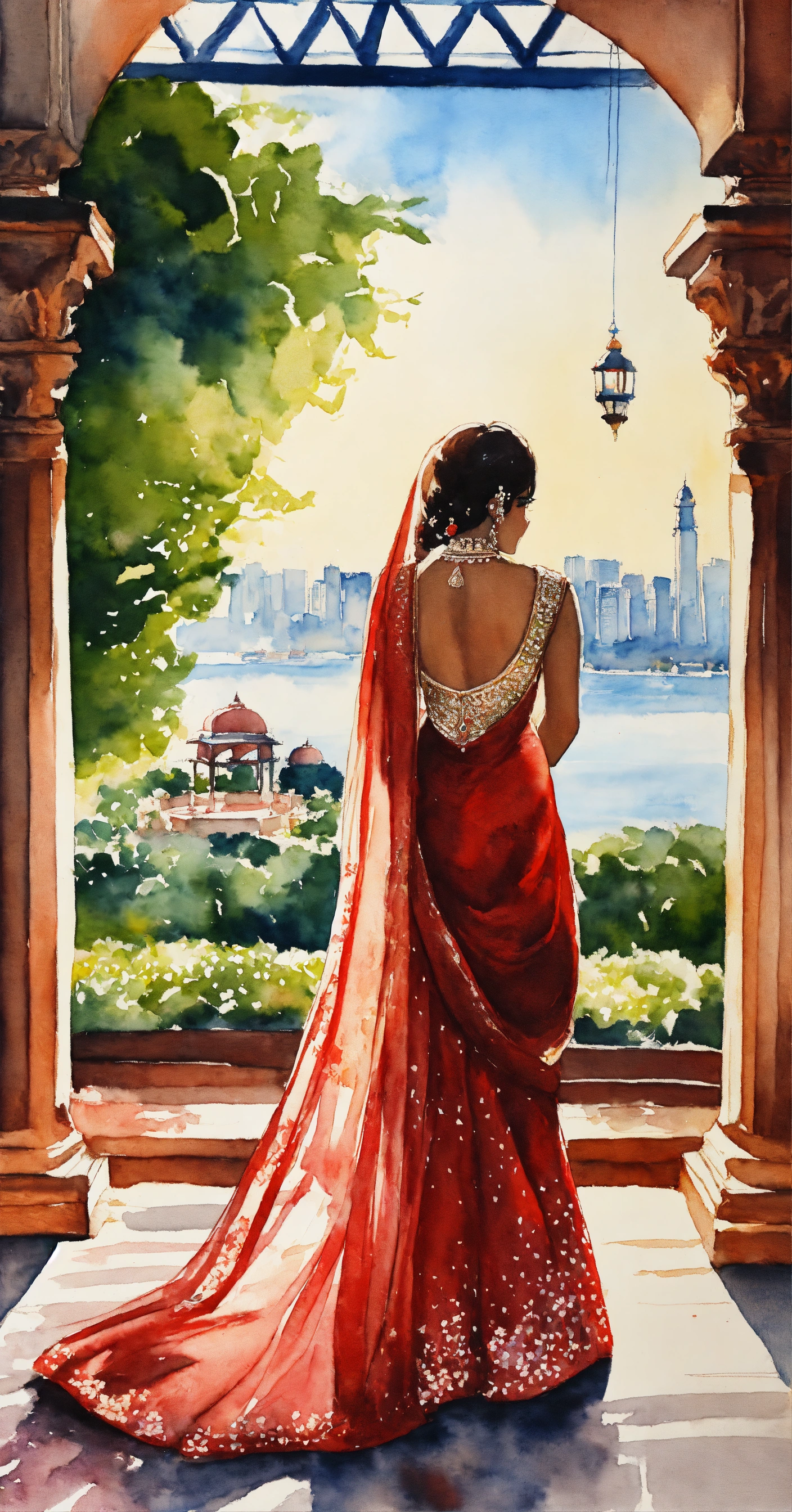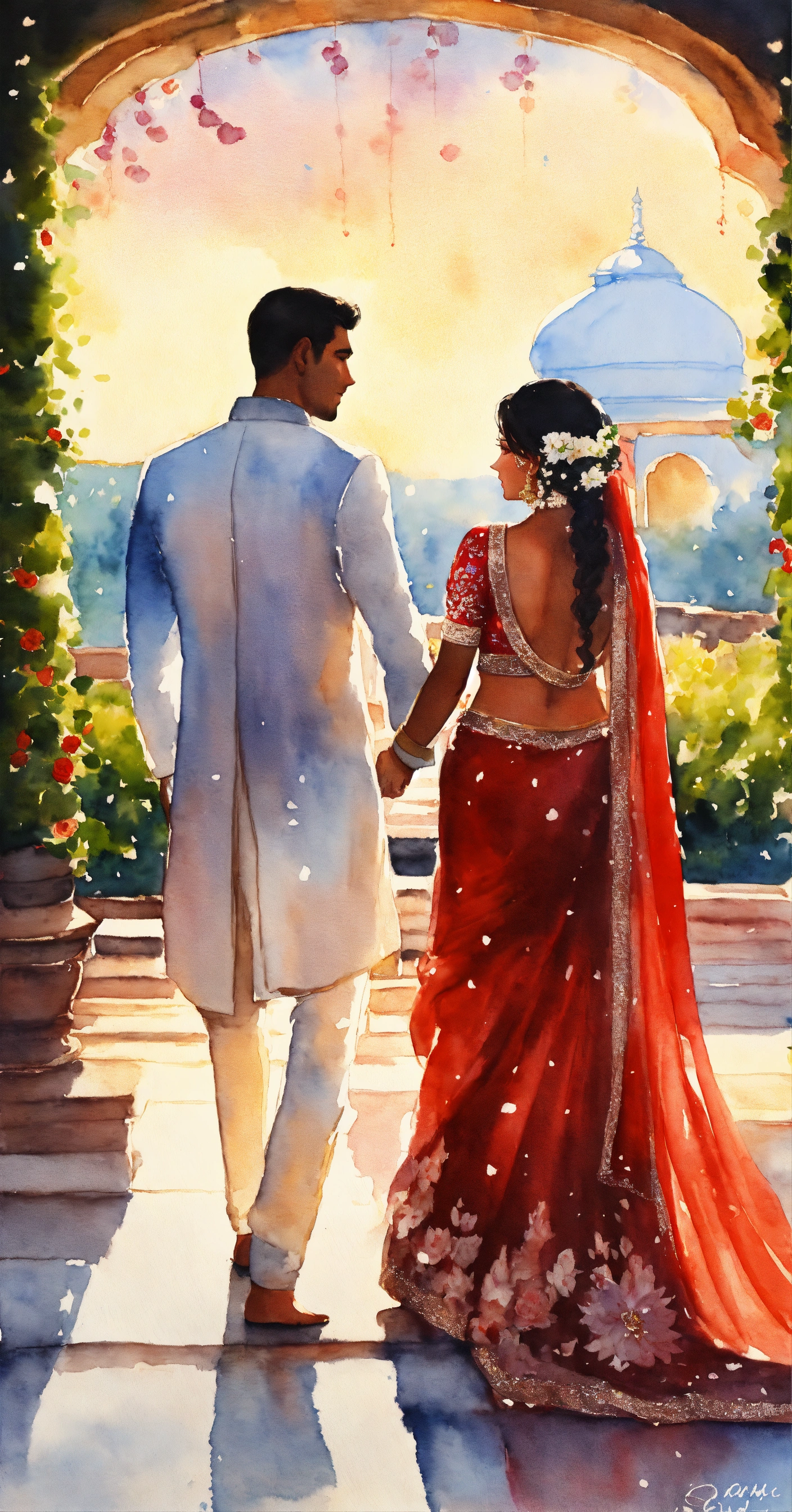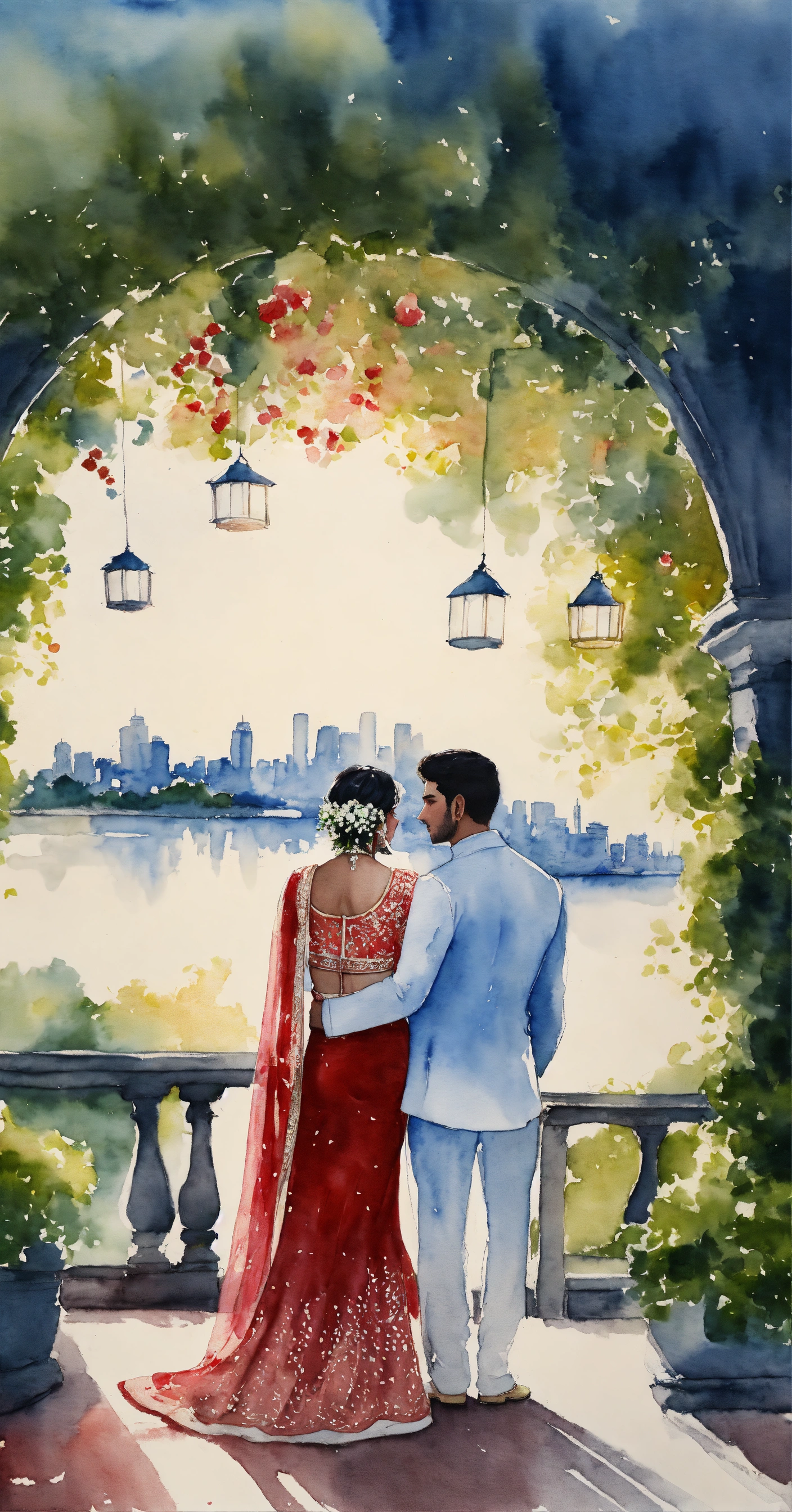Watercolour painting, back view, indian bride, red saree, indian groom, white kurta, blue sky, garden, trees, fairy lights, wedding gazebo, white flowers, city skyline, sea