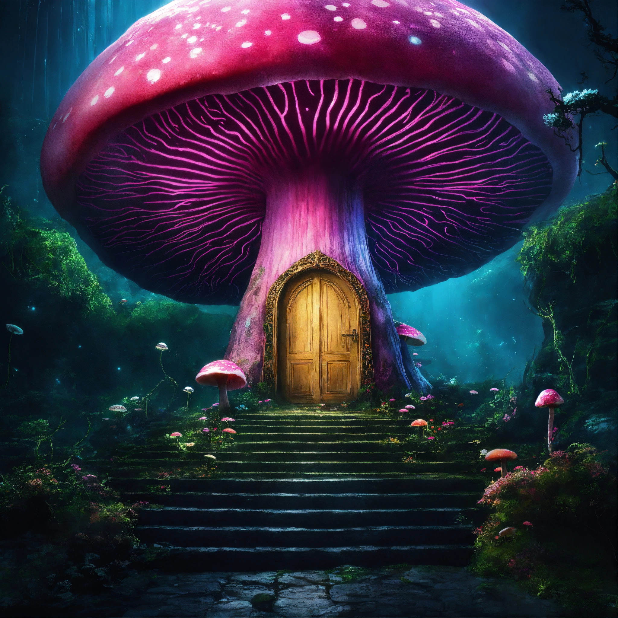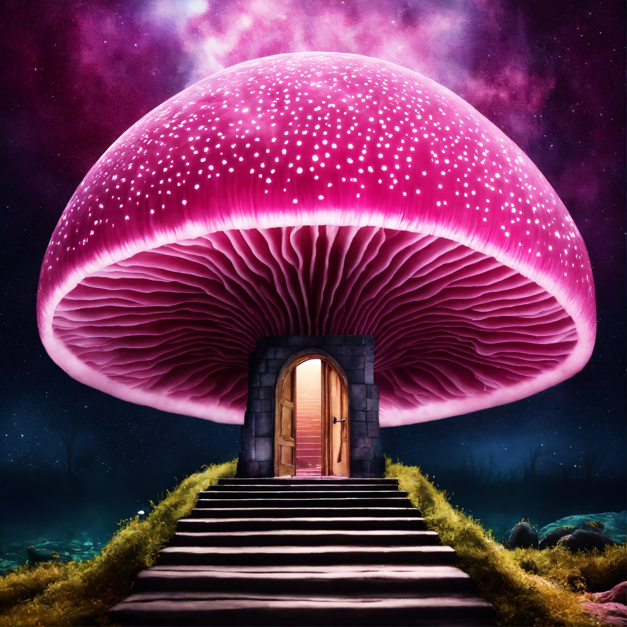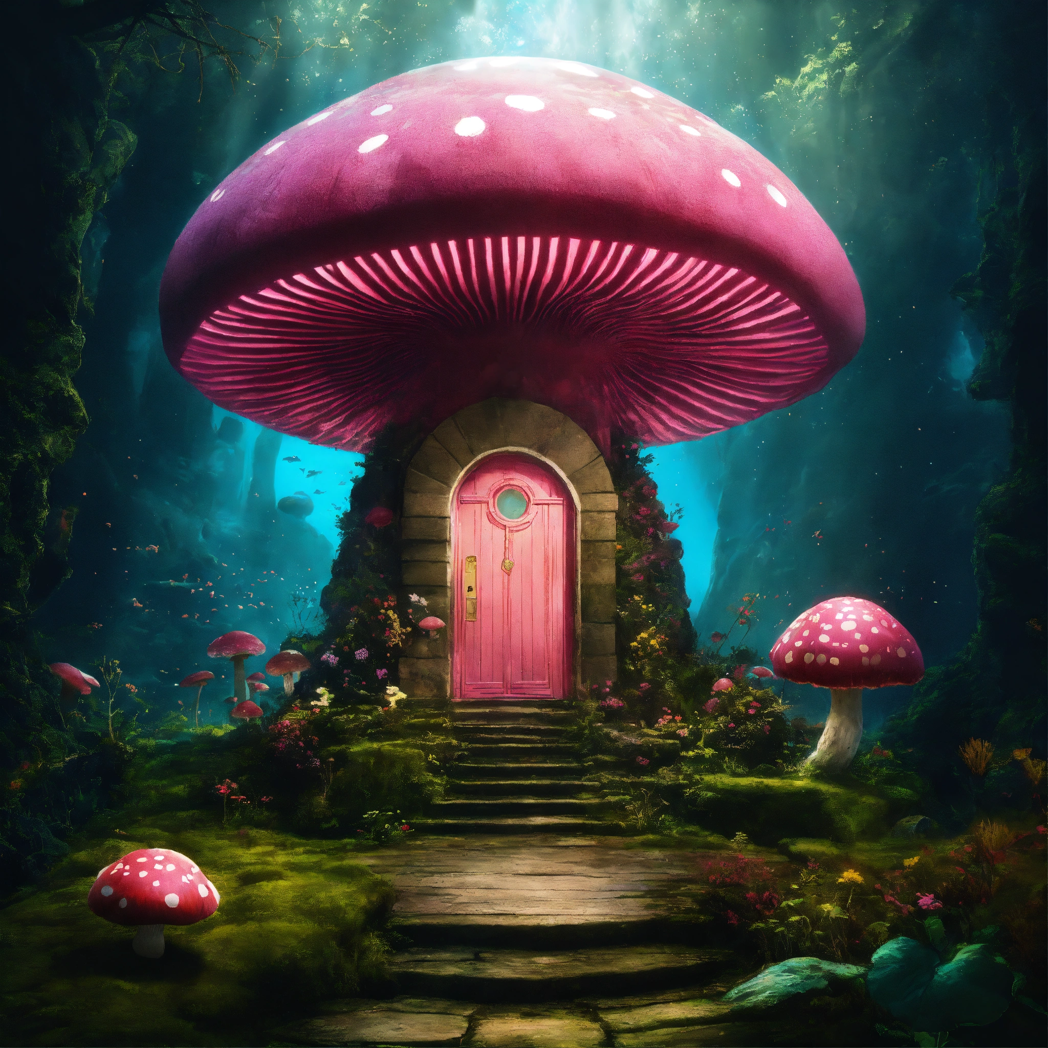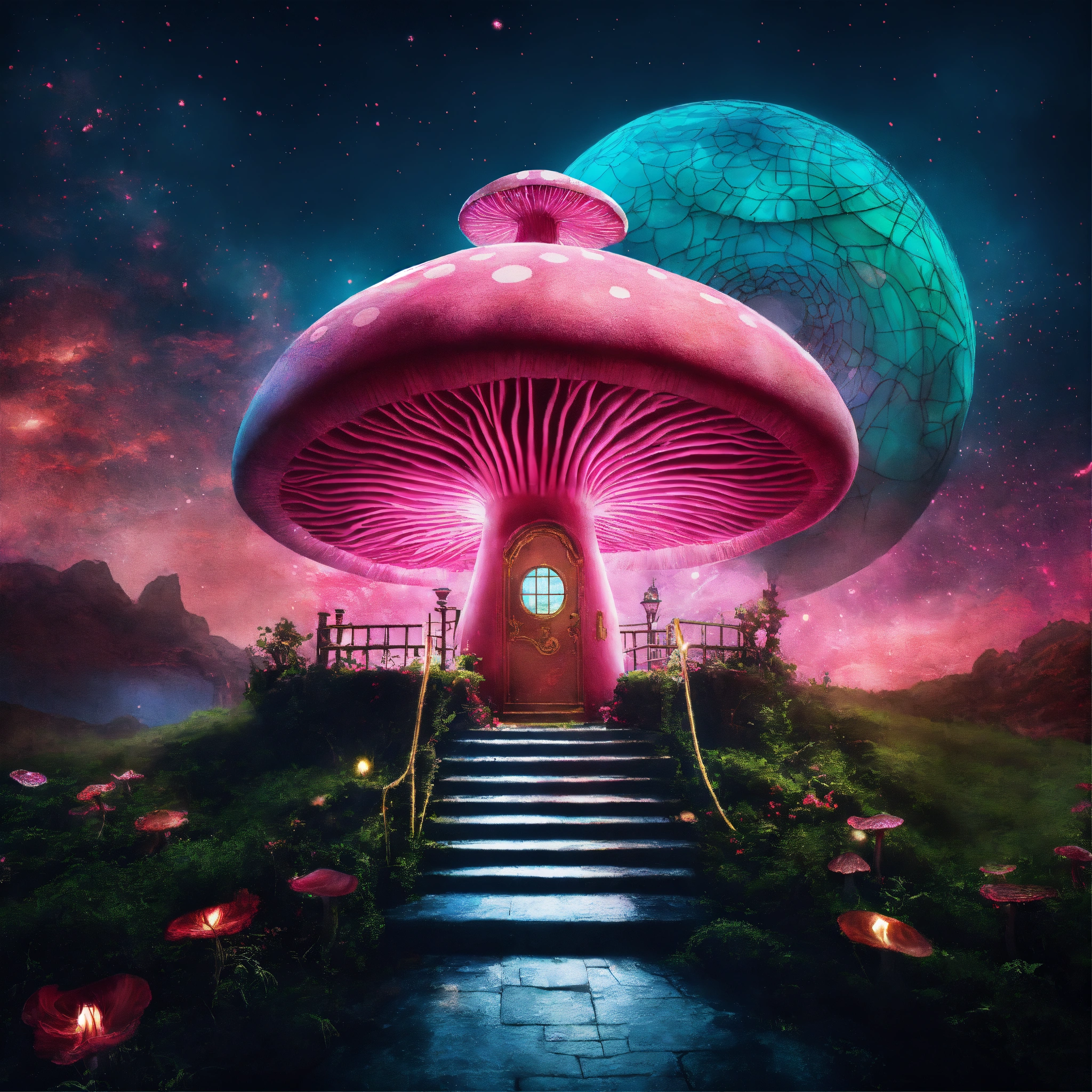 Underwater long exposure photography, a giant pink mushroom with a door and stairs flying in the cosmos with orbs and portals, x-ray style, in the style of tim burton, lion king, the chronicles of narnia, beauty and the beast, and peter pan. with sacred geometric patterns on the body. enchanting aura. the chronicles of narnia, wizard of oz, and alice in wonderland background