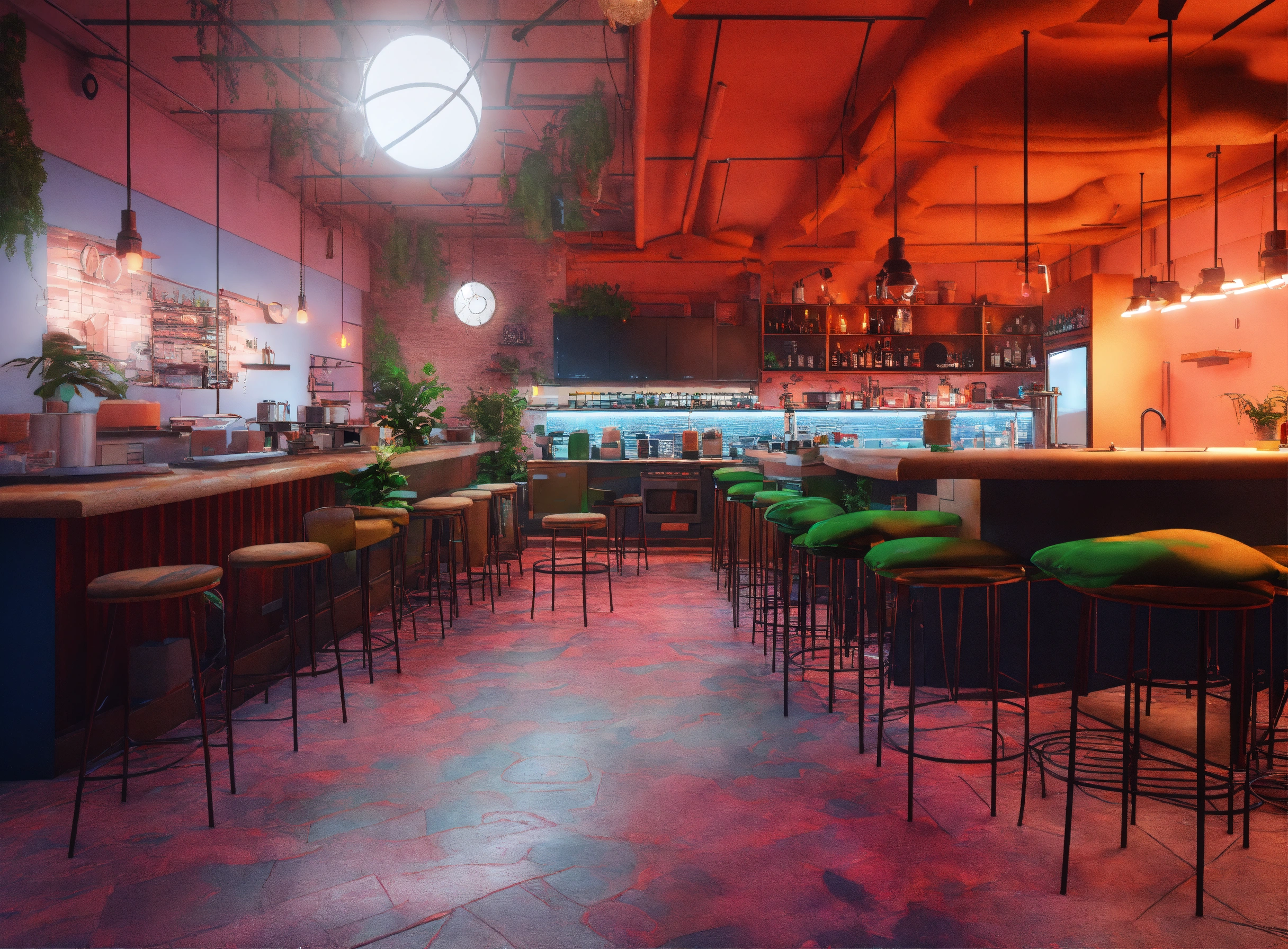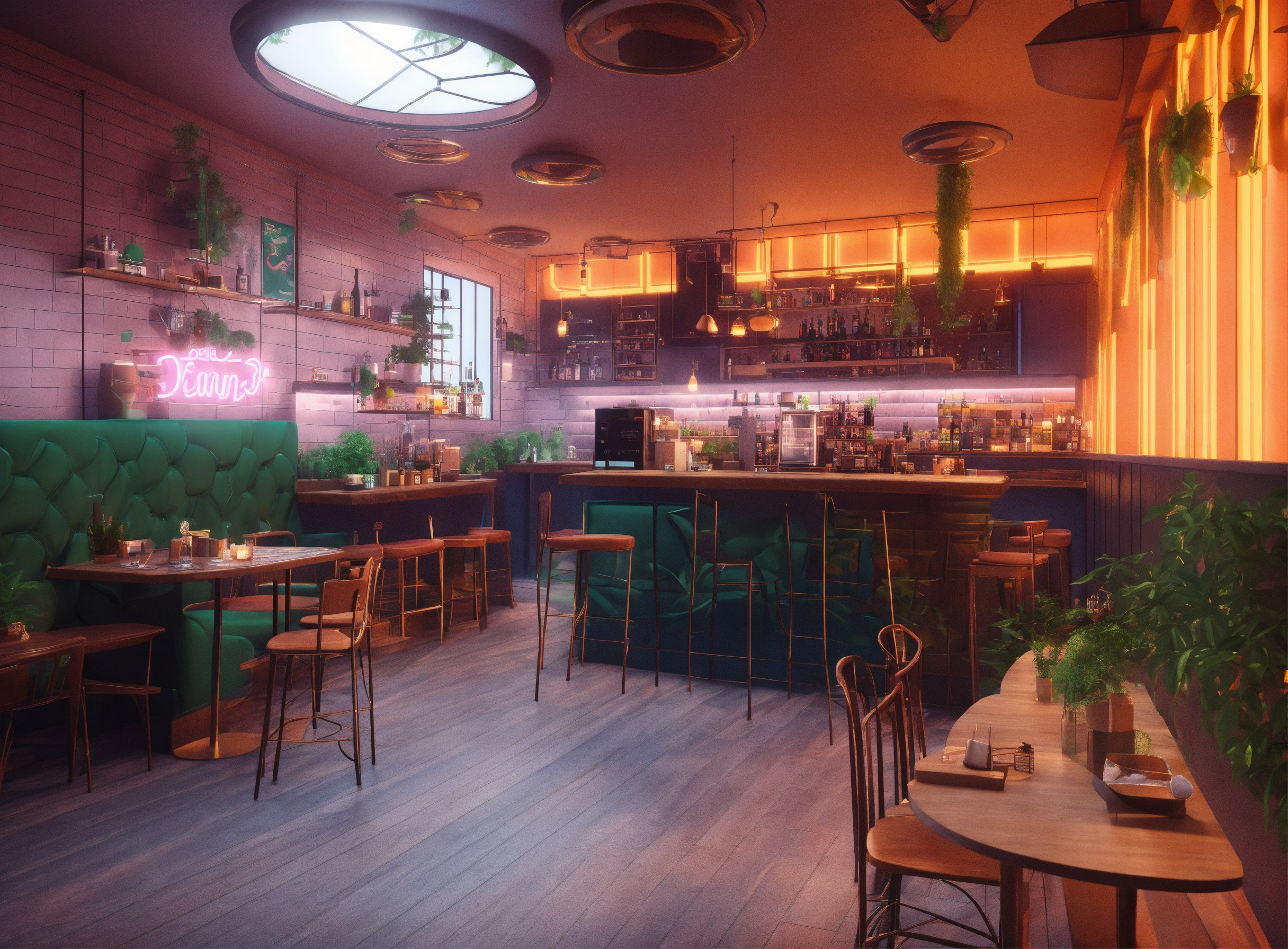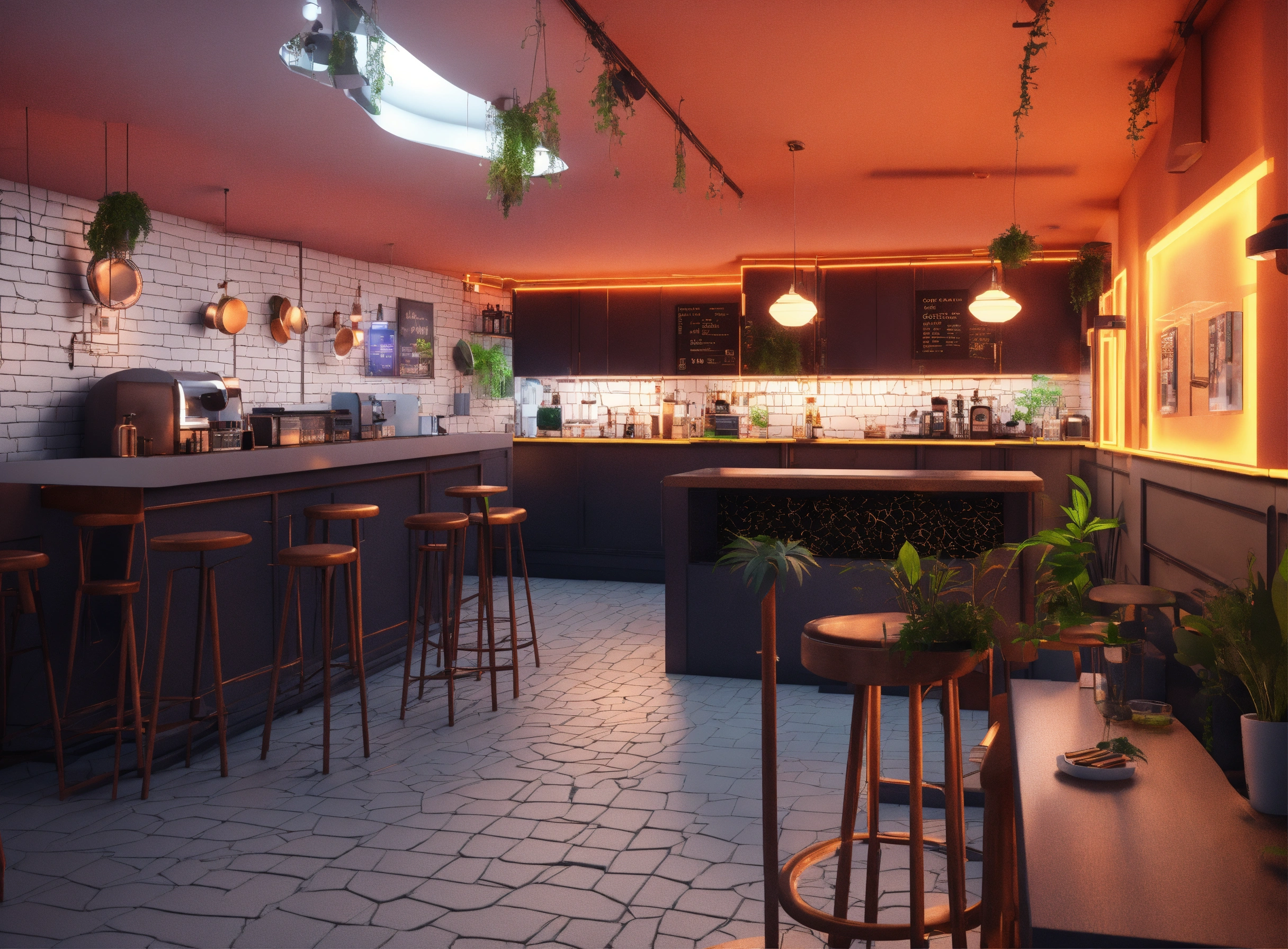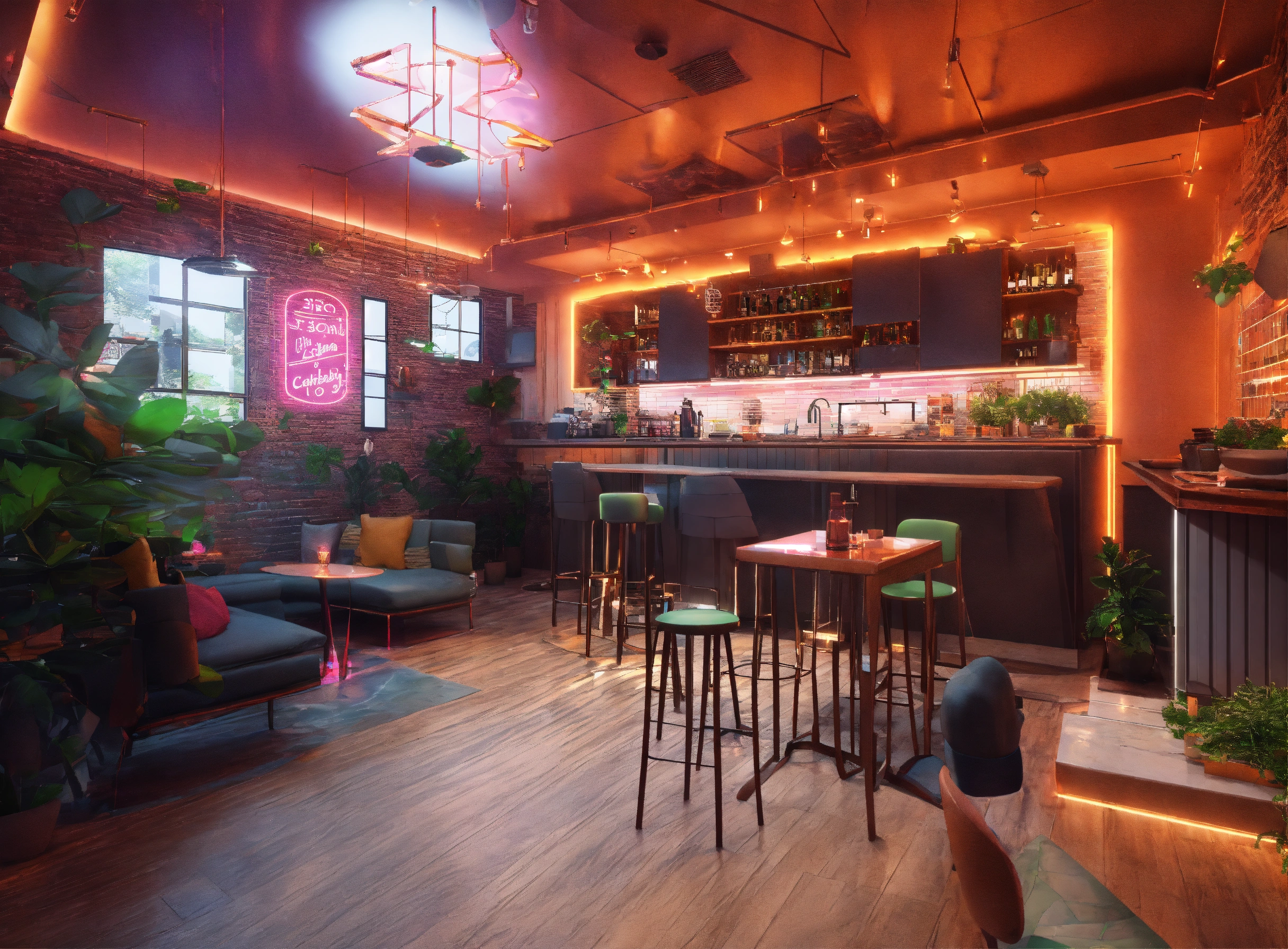 A photorealistic 3d render of ganja coffeeshop in cozy neon style with kitchen and a bar