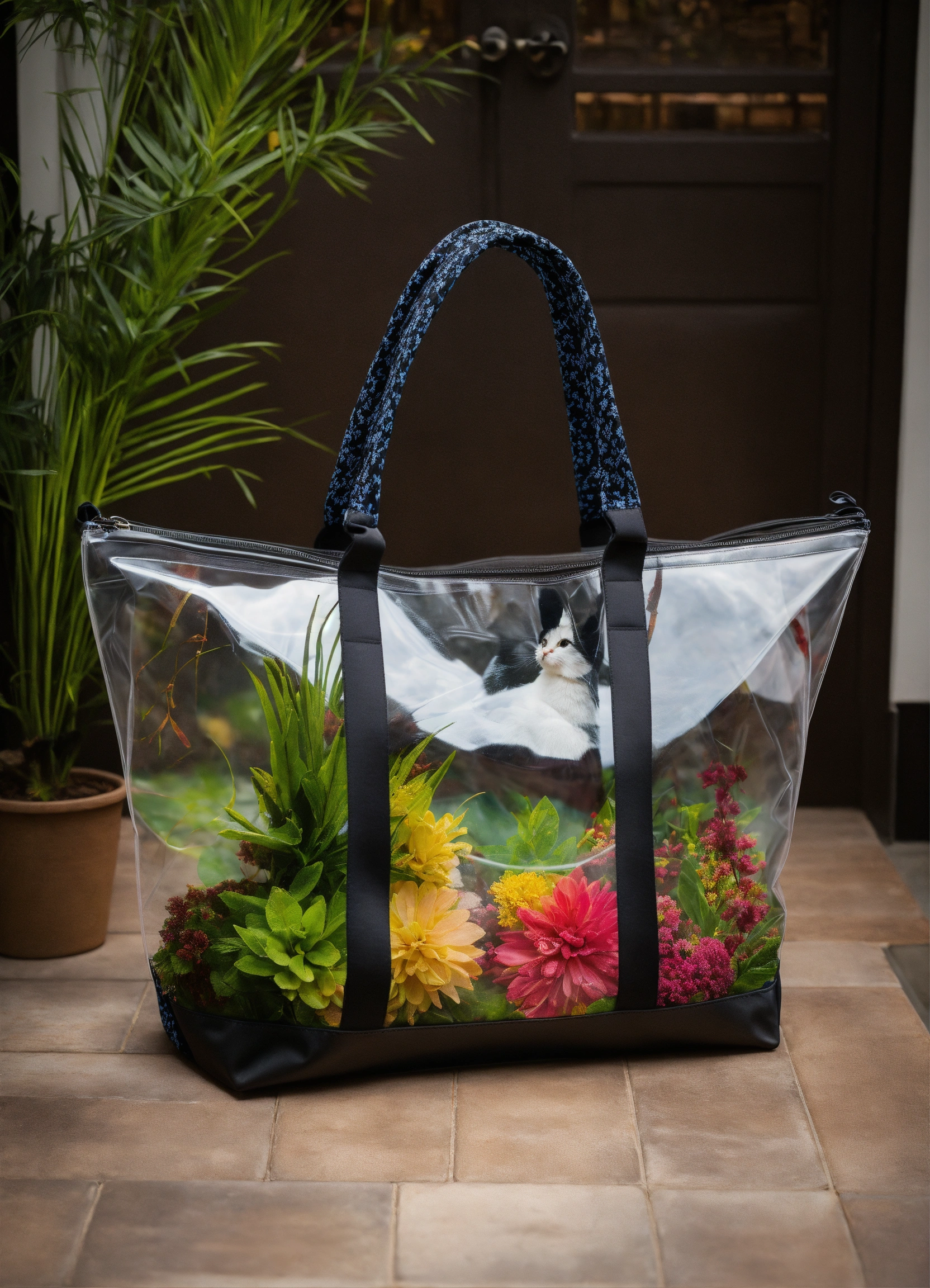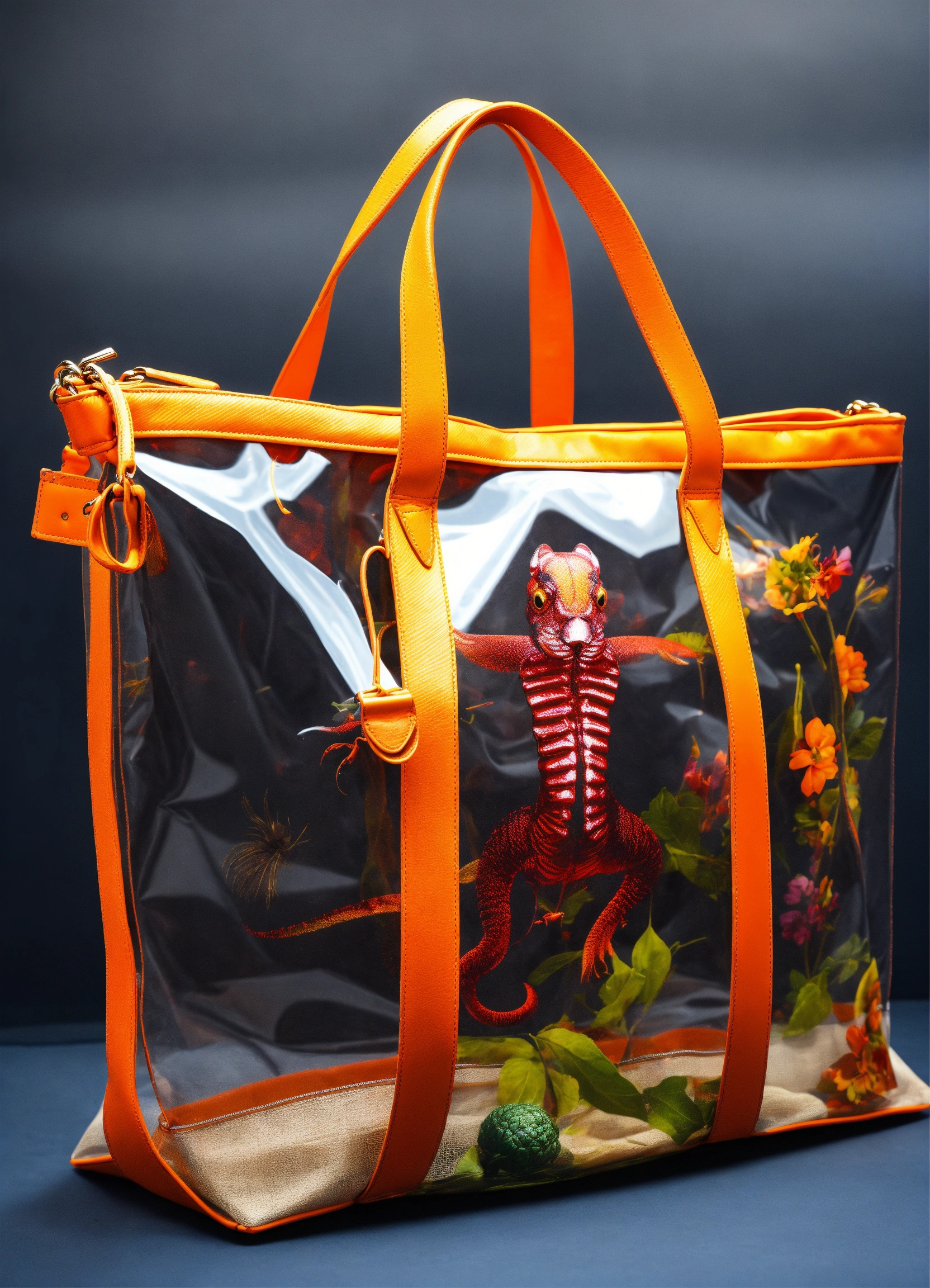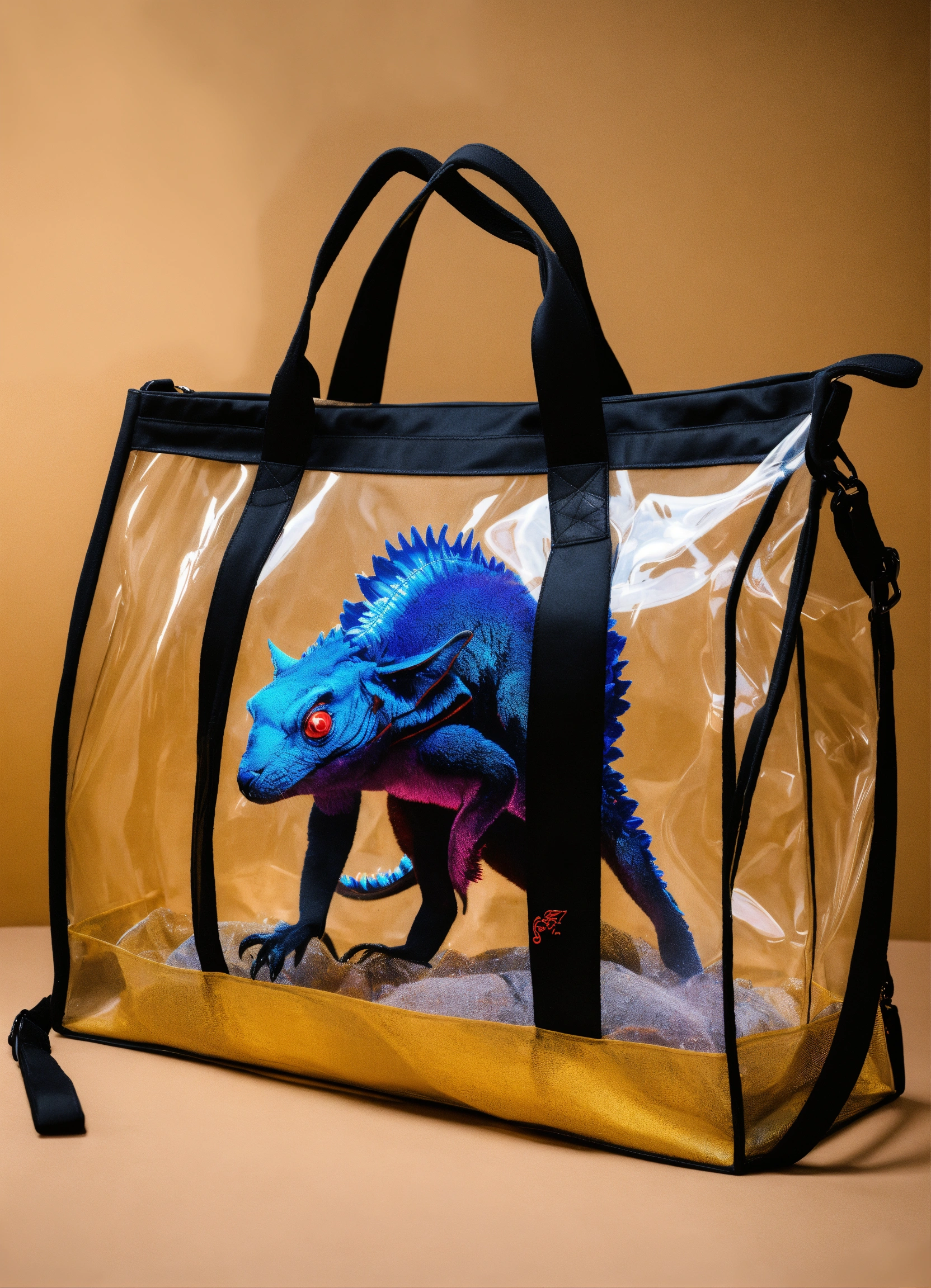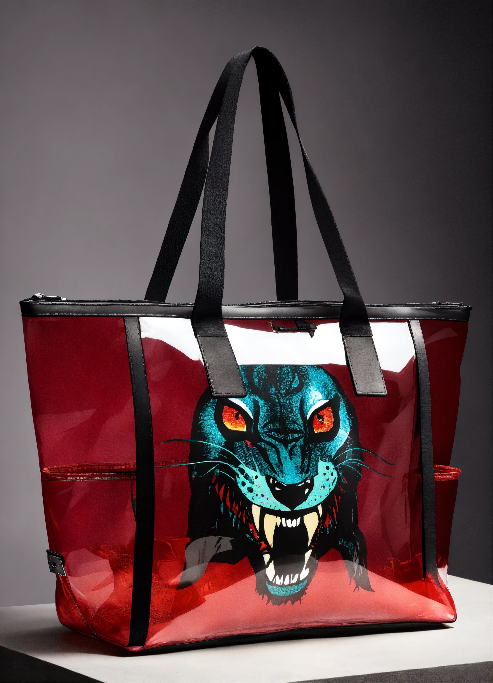 Transparent weekender tote bag without straps with chupacabra inside, no shine in backround, dark backround, front view