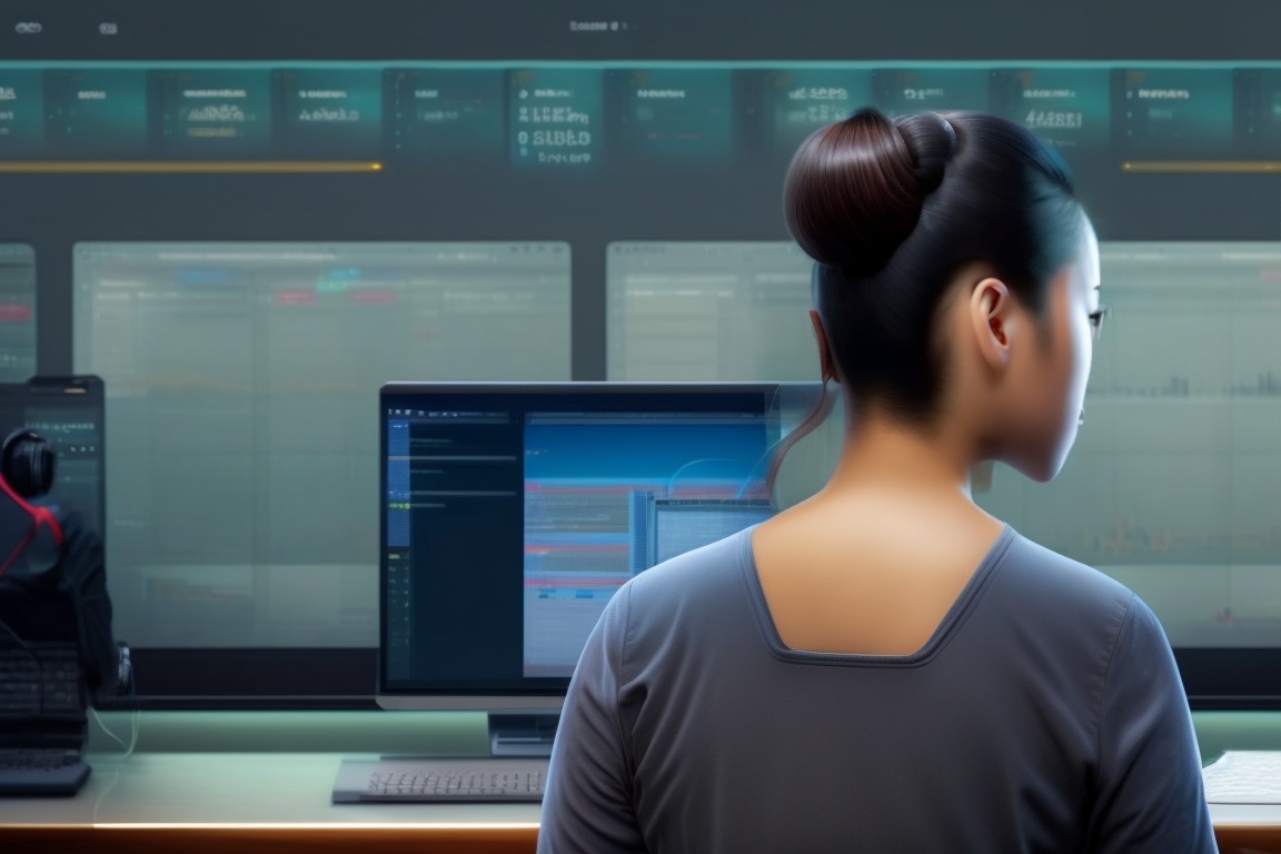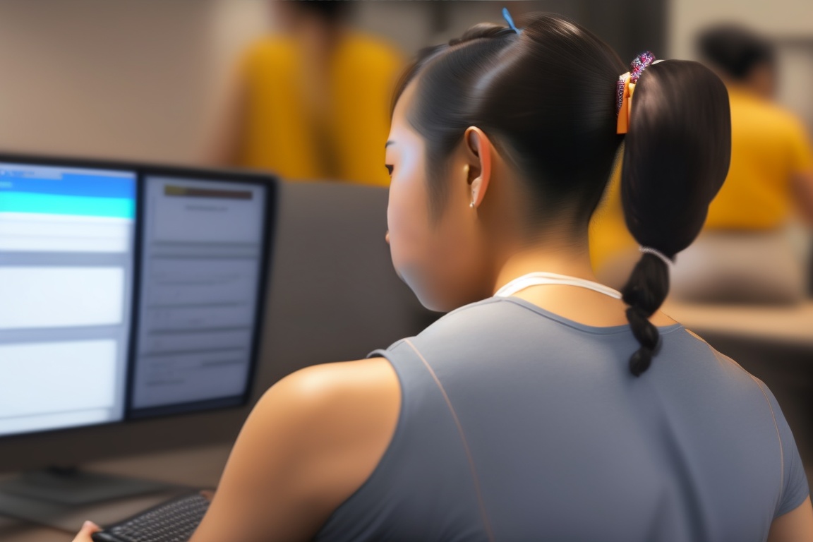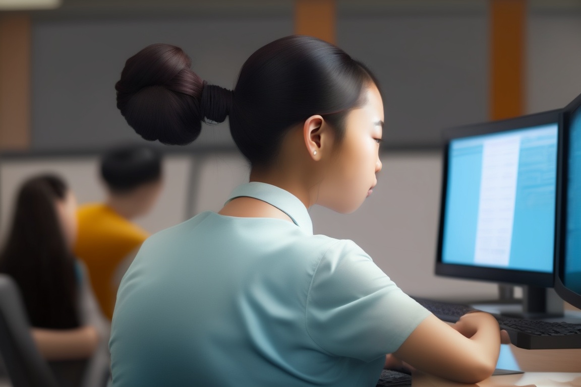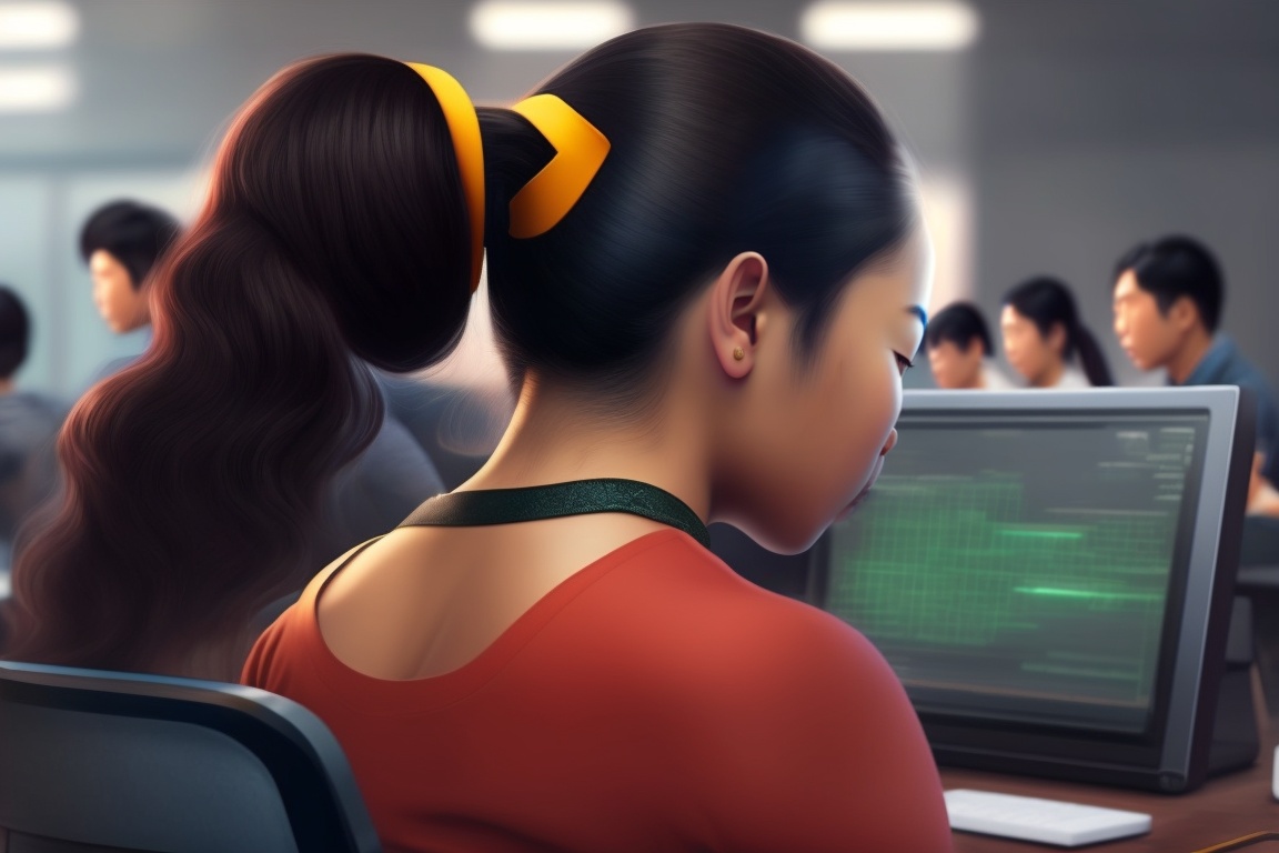An asian woman in ponytail that is at a computer engineering class but its a shoulder shot and her back is fully turned at us