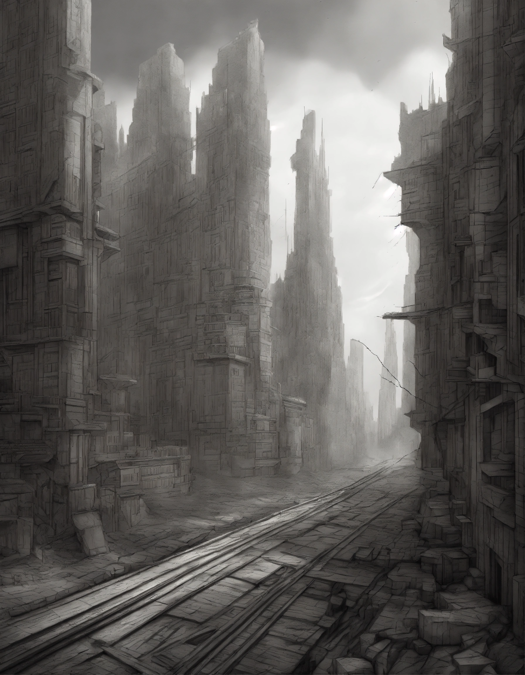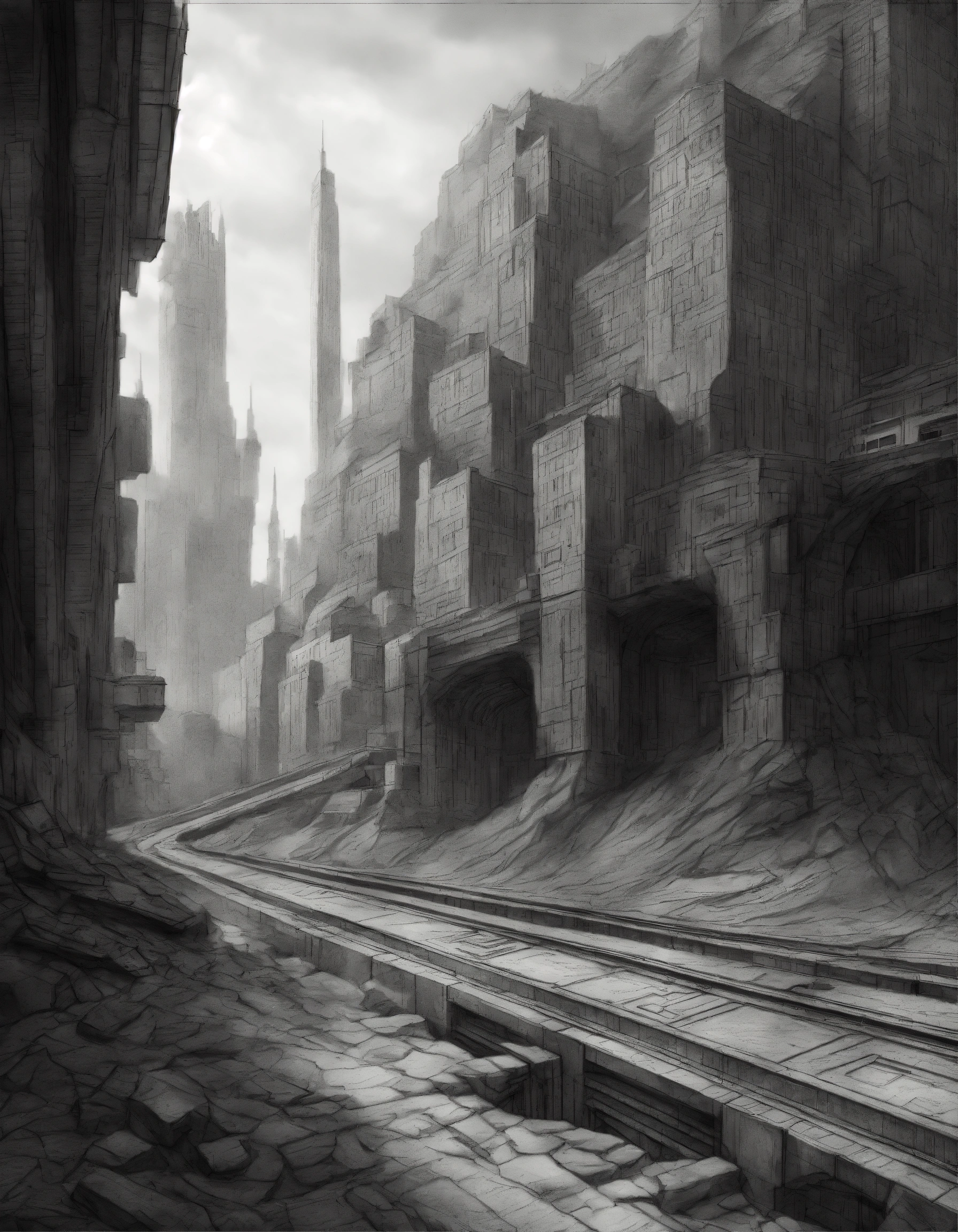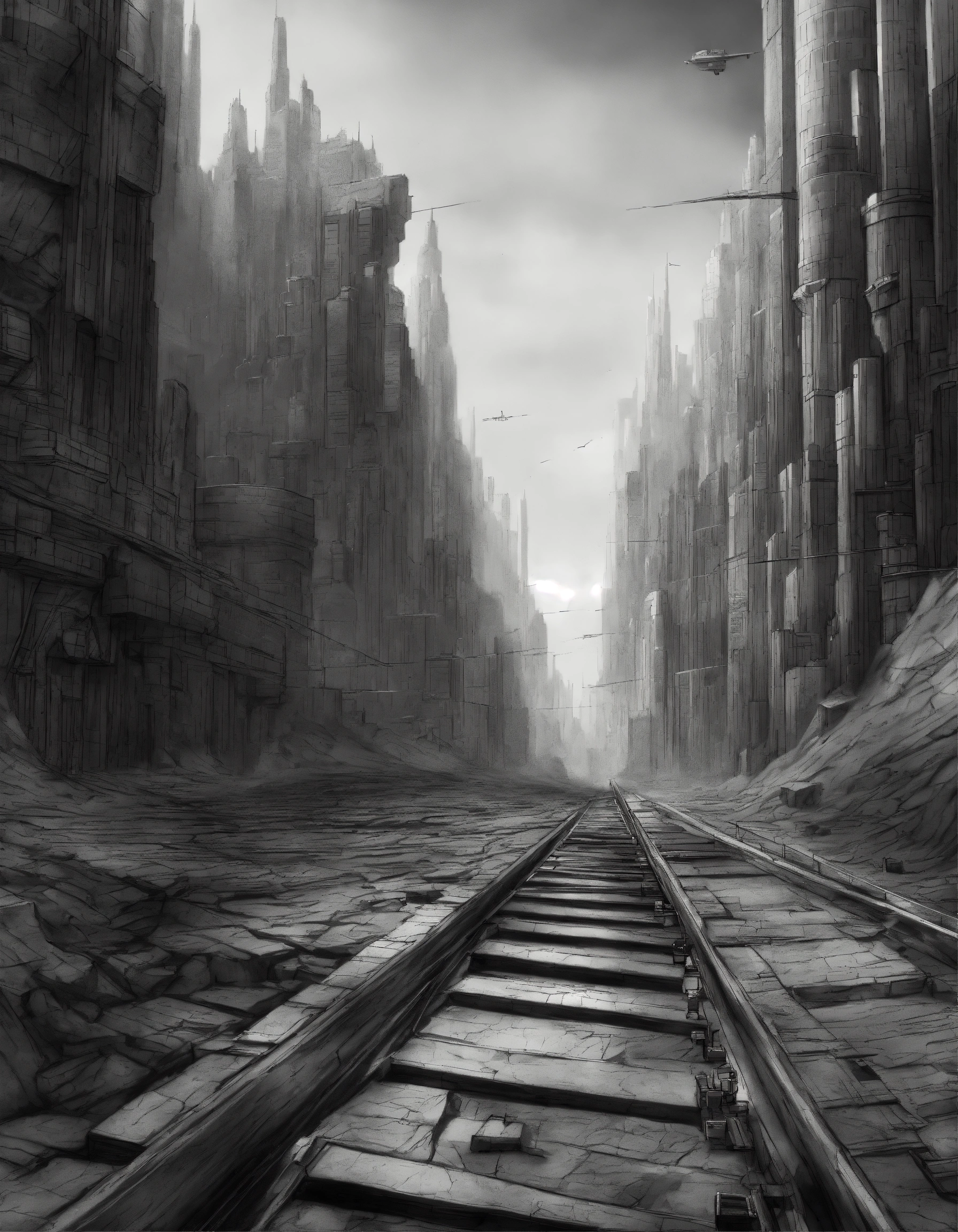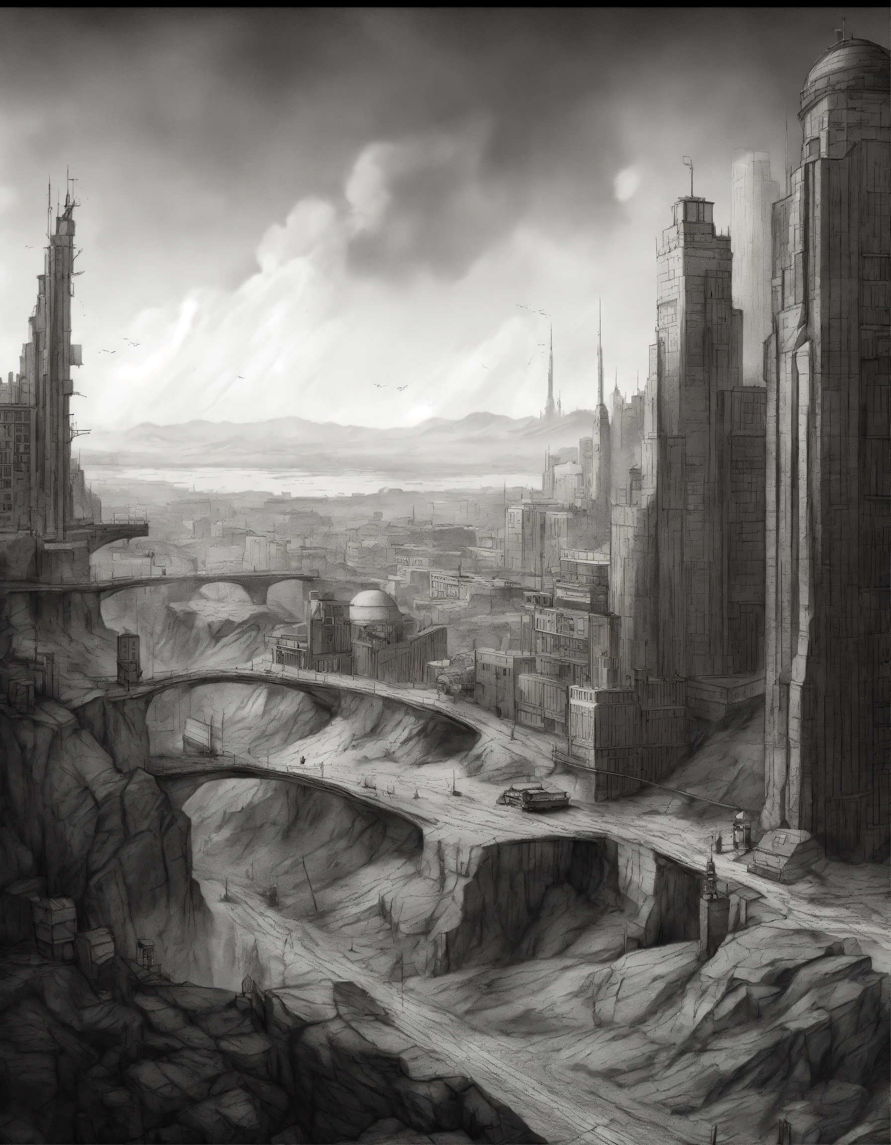 A pencil sketch depicting a crack in the terrain of a giant city. realistic high detailed, 4k greyscale, steampunk, retro futuristic