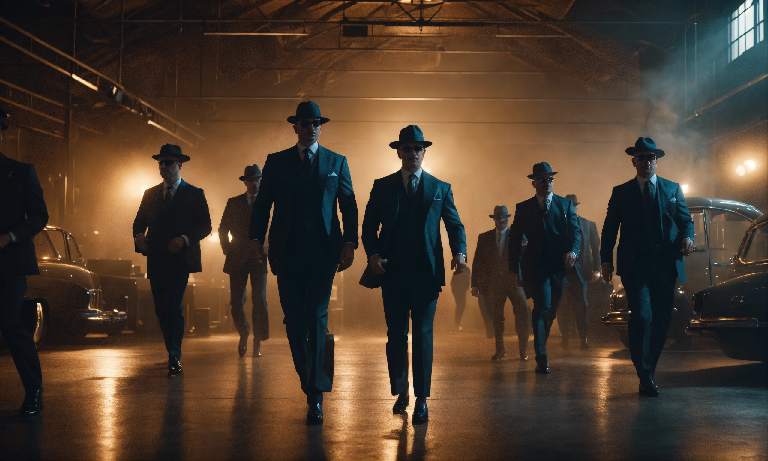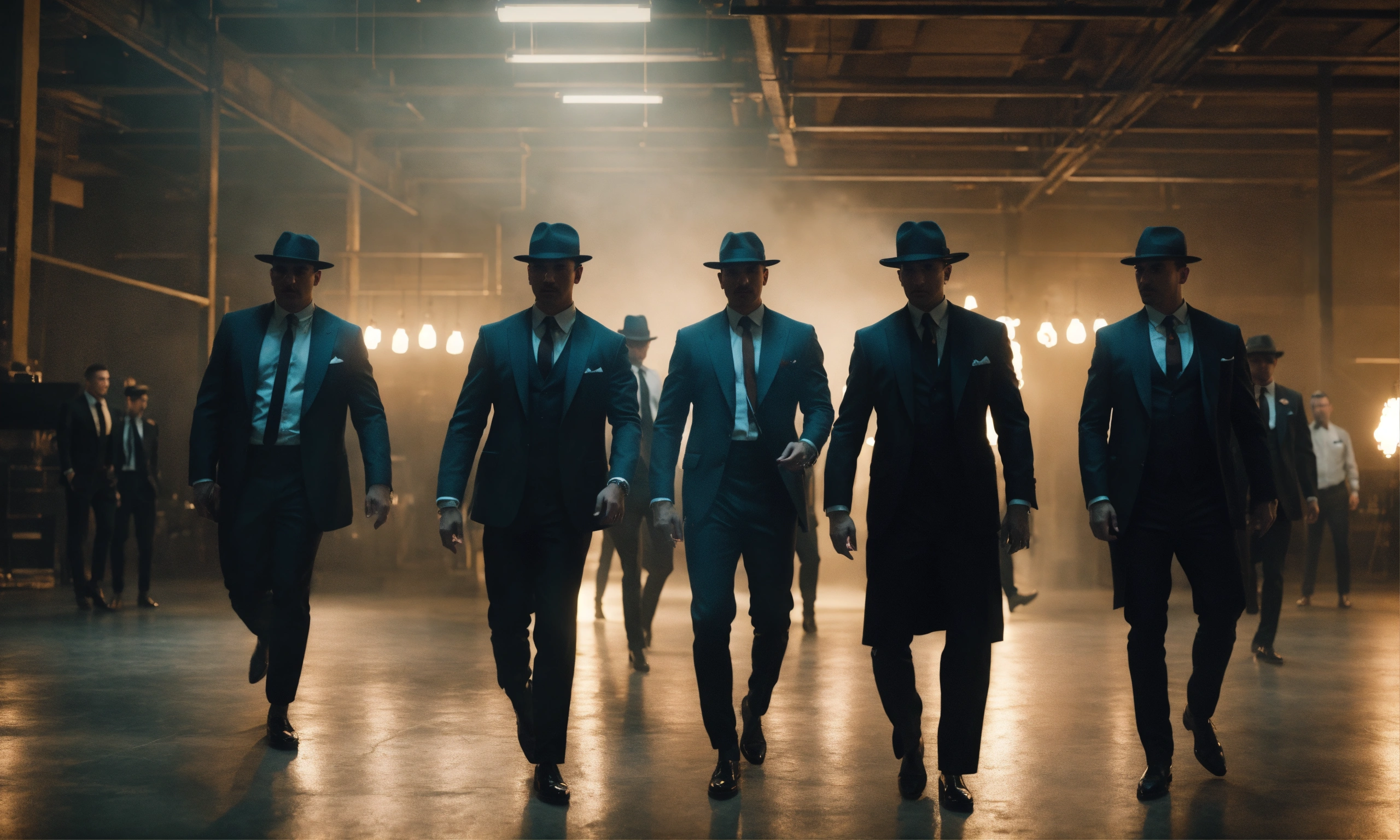 Group of mafia gangsters dancing in fashion warehouse, smoky mood lighting, wide front shot, night time, 8k, luxcorerender, earthly colour, cinematic photography, real humans, real images, matte finish, shot on arri anamorphic, extreme wide shot, smooth, sharp focus, ornate, highly dynamic, particulate, hyperreal, wide shot.
