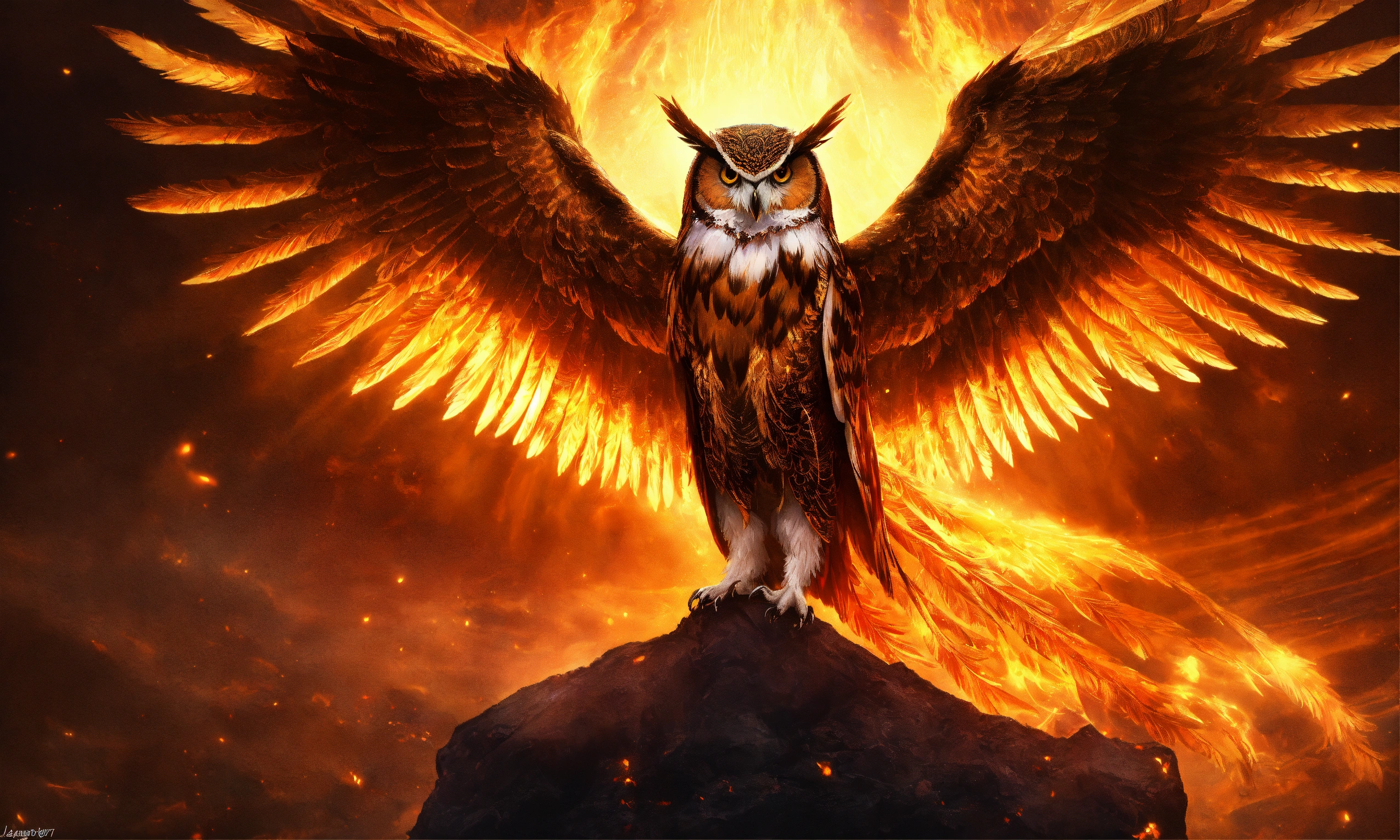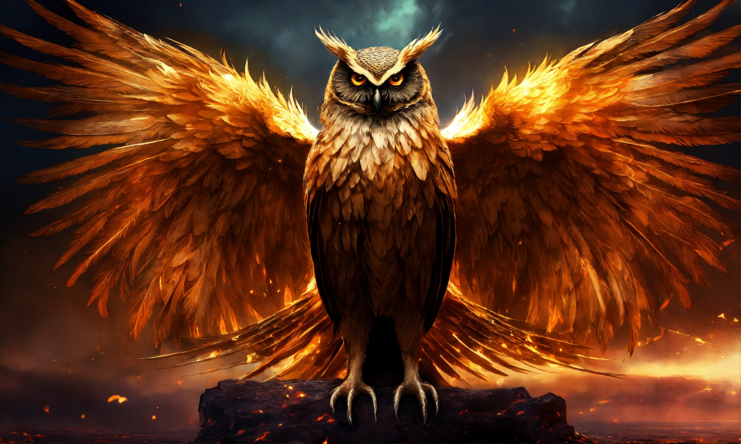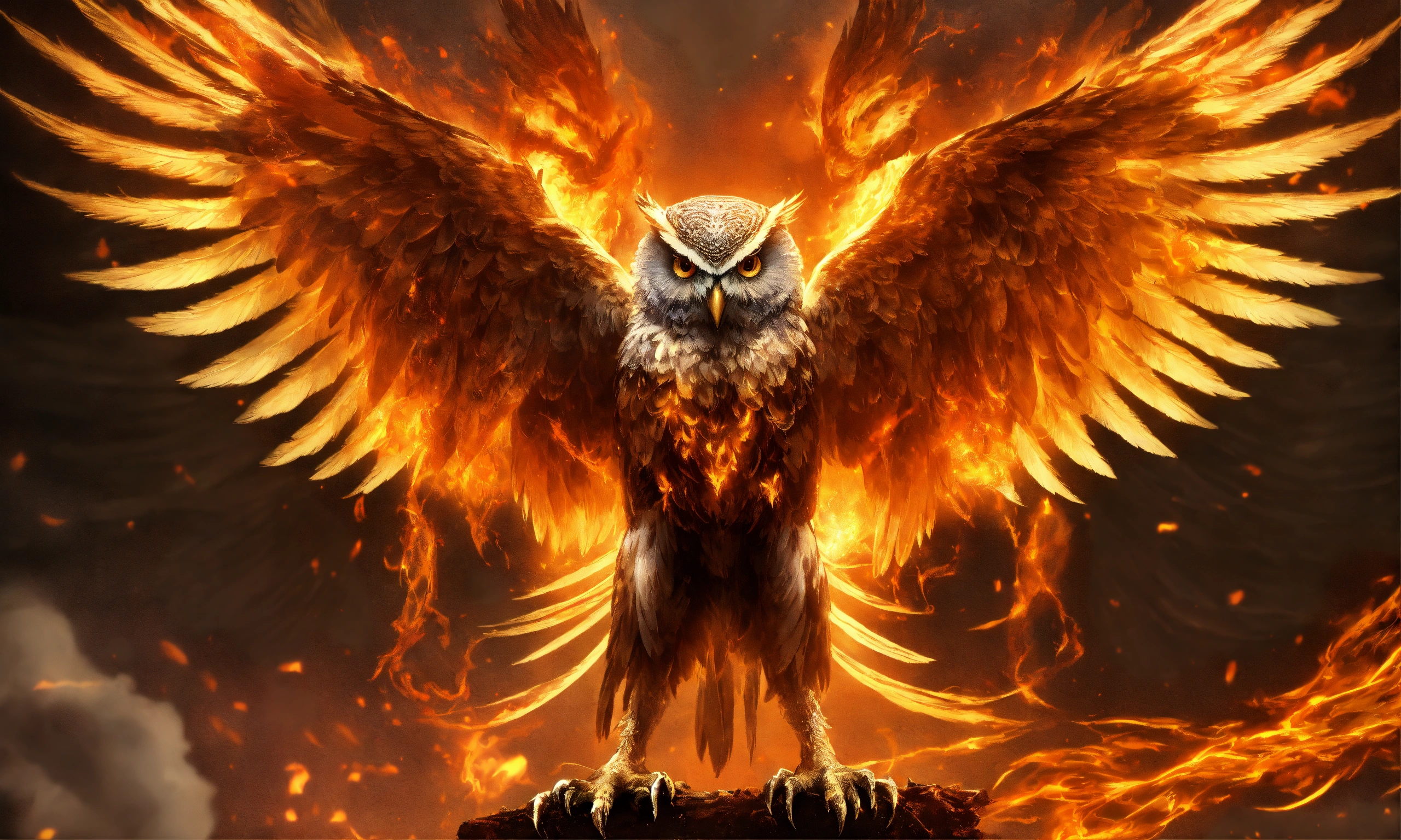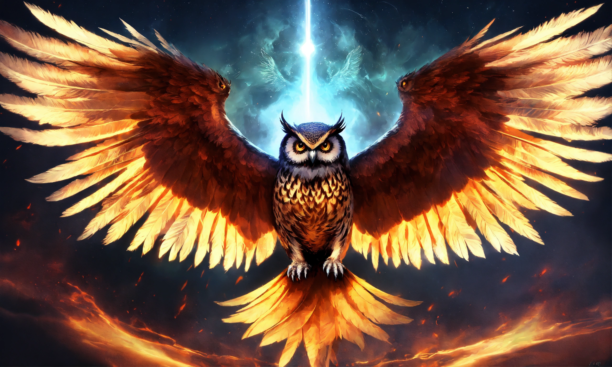 Ominous owl phoenix hybrid spirit creating opposing dualitys, extremely creative and unique, lexica created, designed by lucifer and apollyon, designed by hr geiger and thoth, incredibly inspiring, 1666, armageddon, disintegration of purity, immaculate detail, symbolic in itself immensely, inspired by lexica and lucifer