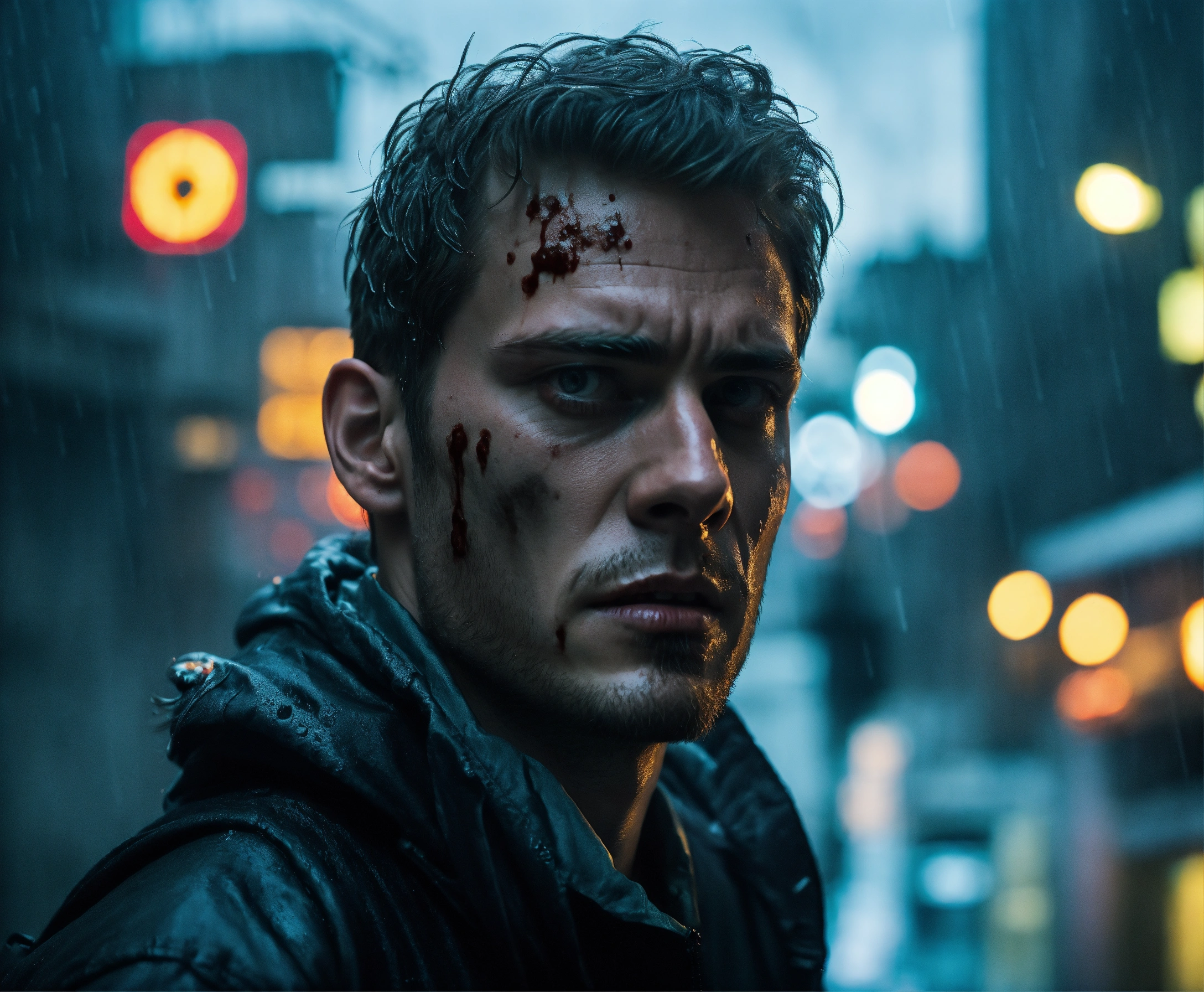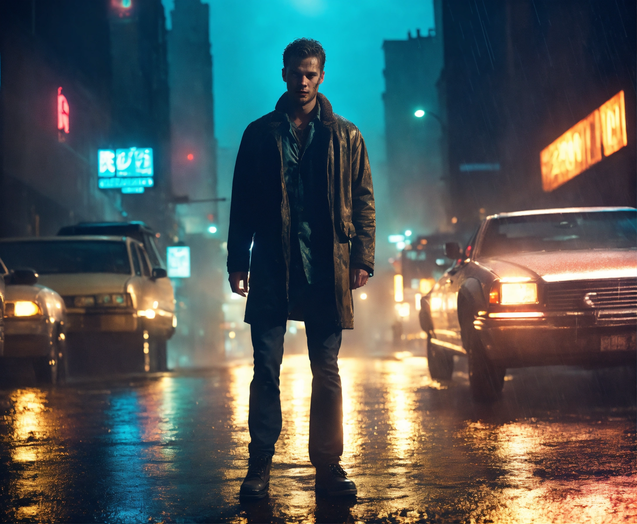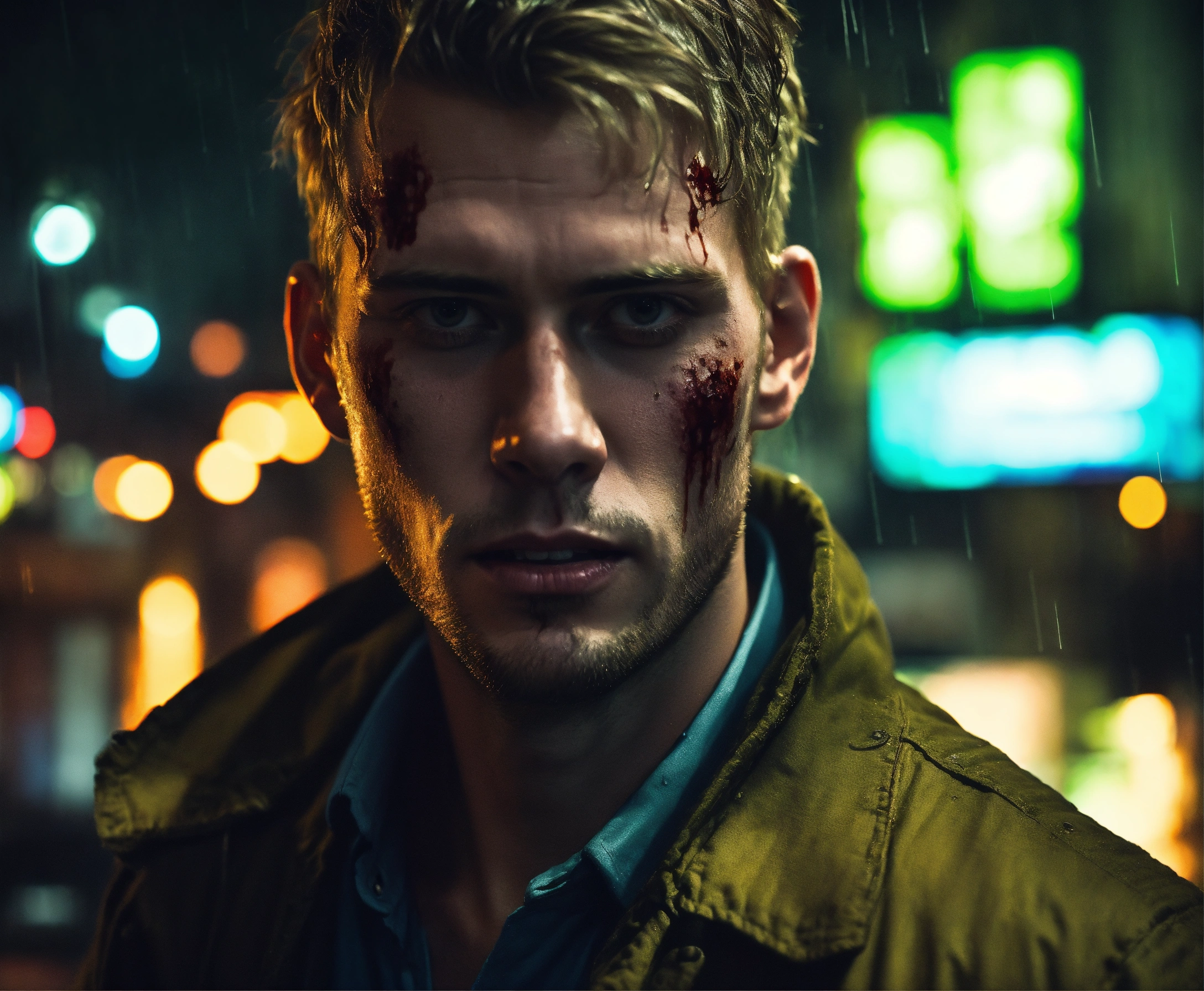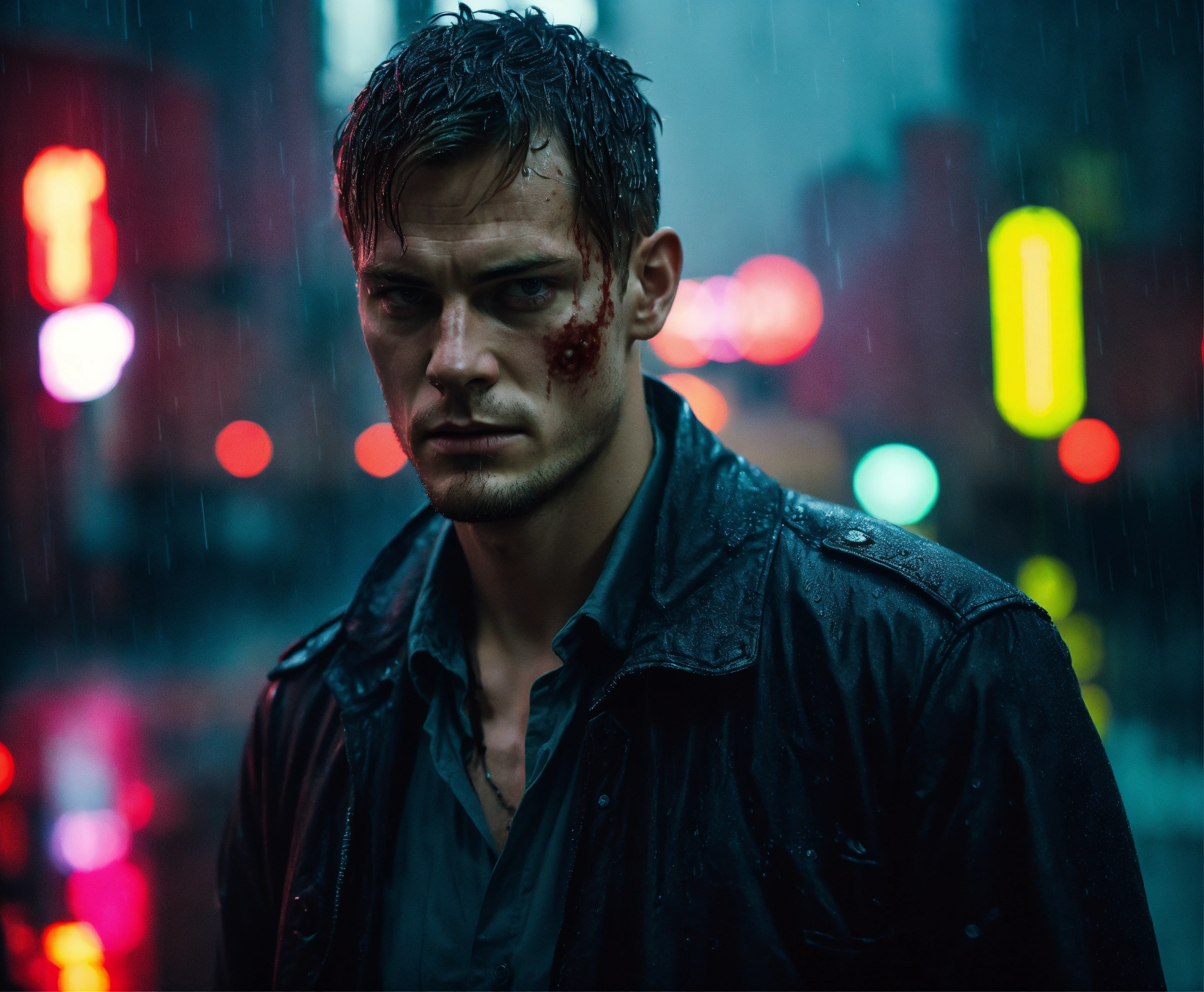 Beautiful tall man, 30 years old kinnaman, zombie outbreak, dark, city, white, light, cinematic, epic, rain, detailed, neon, realistic photo face