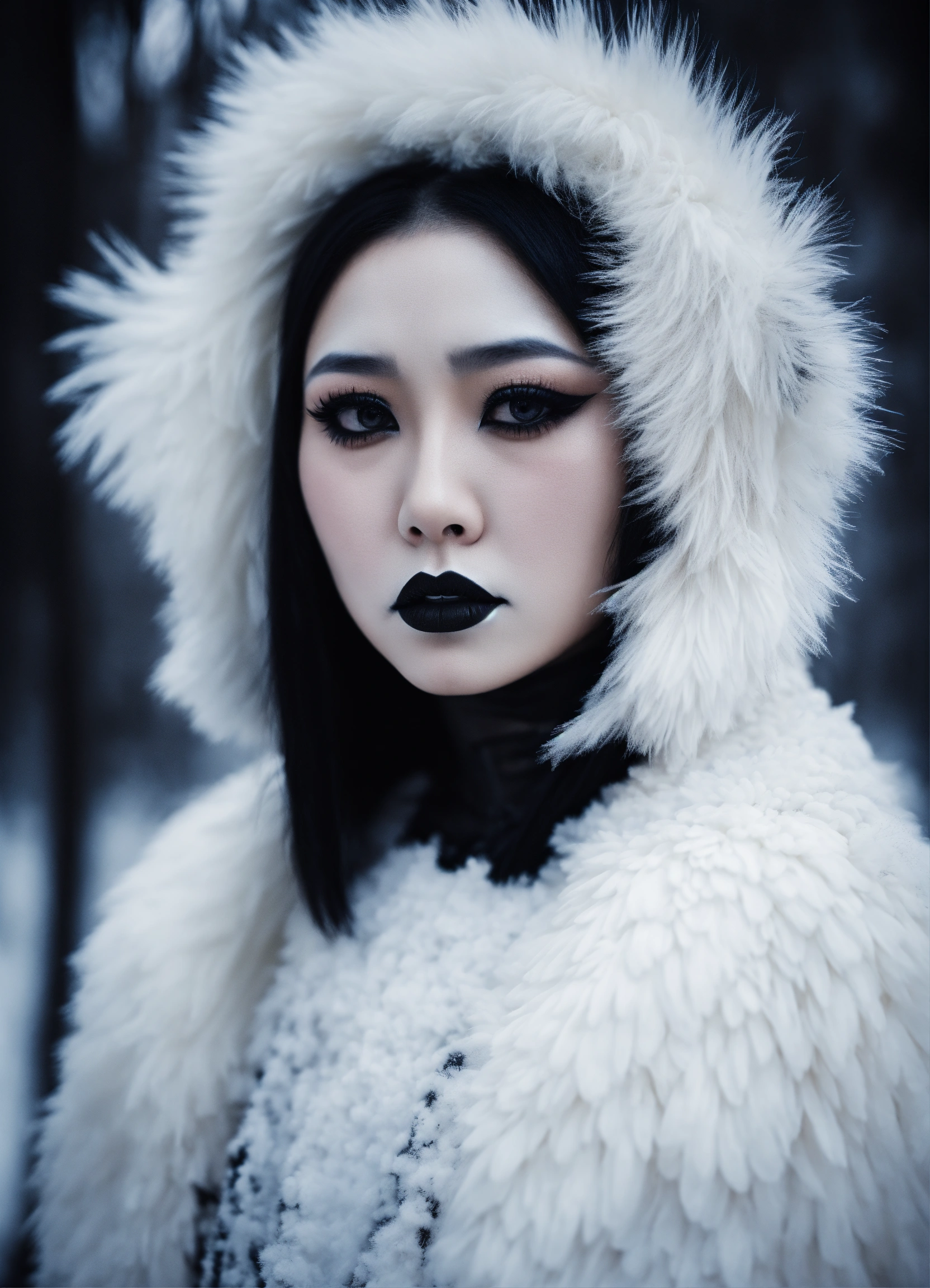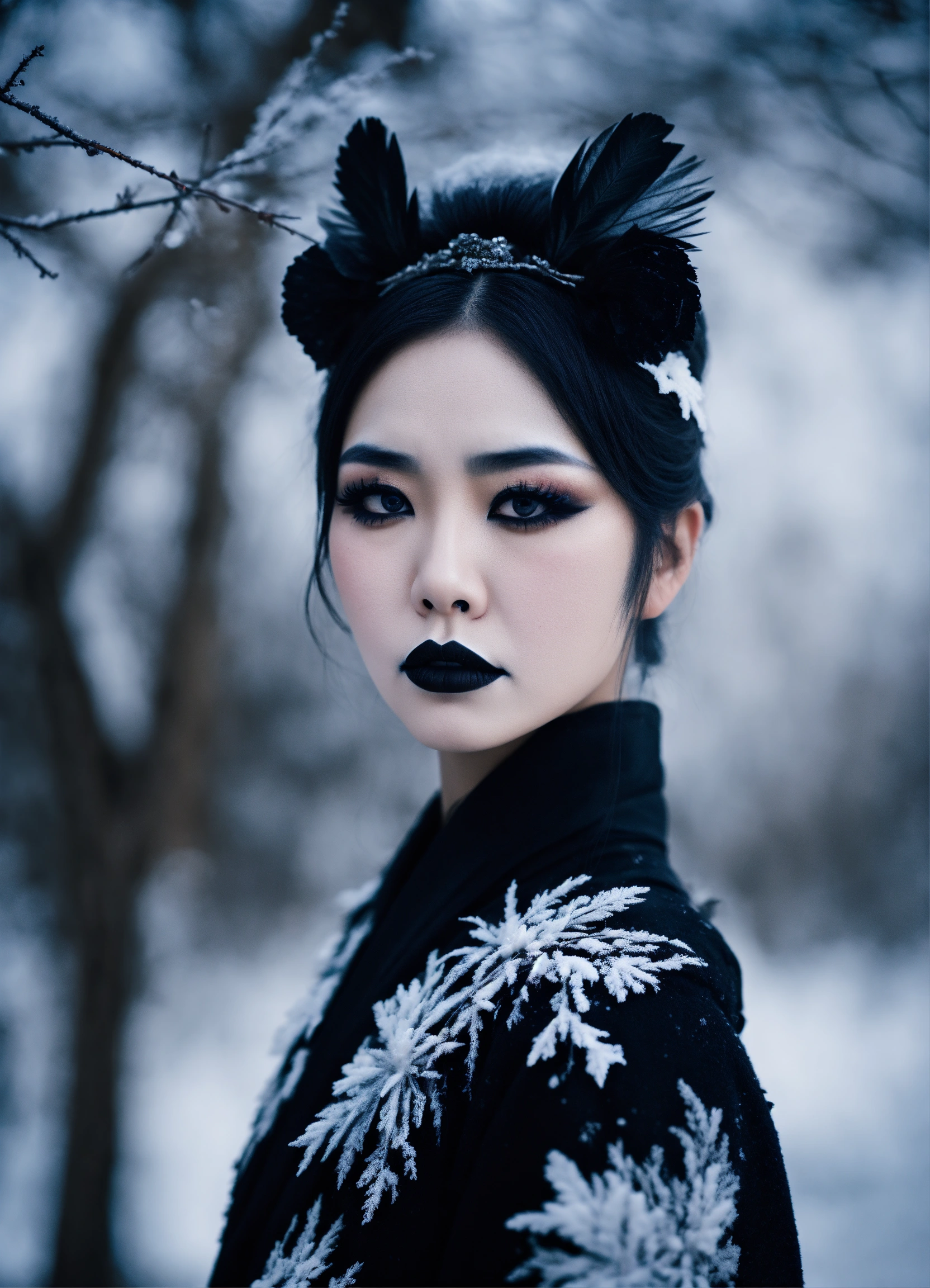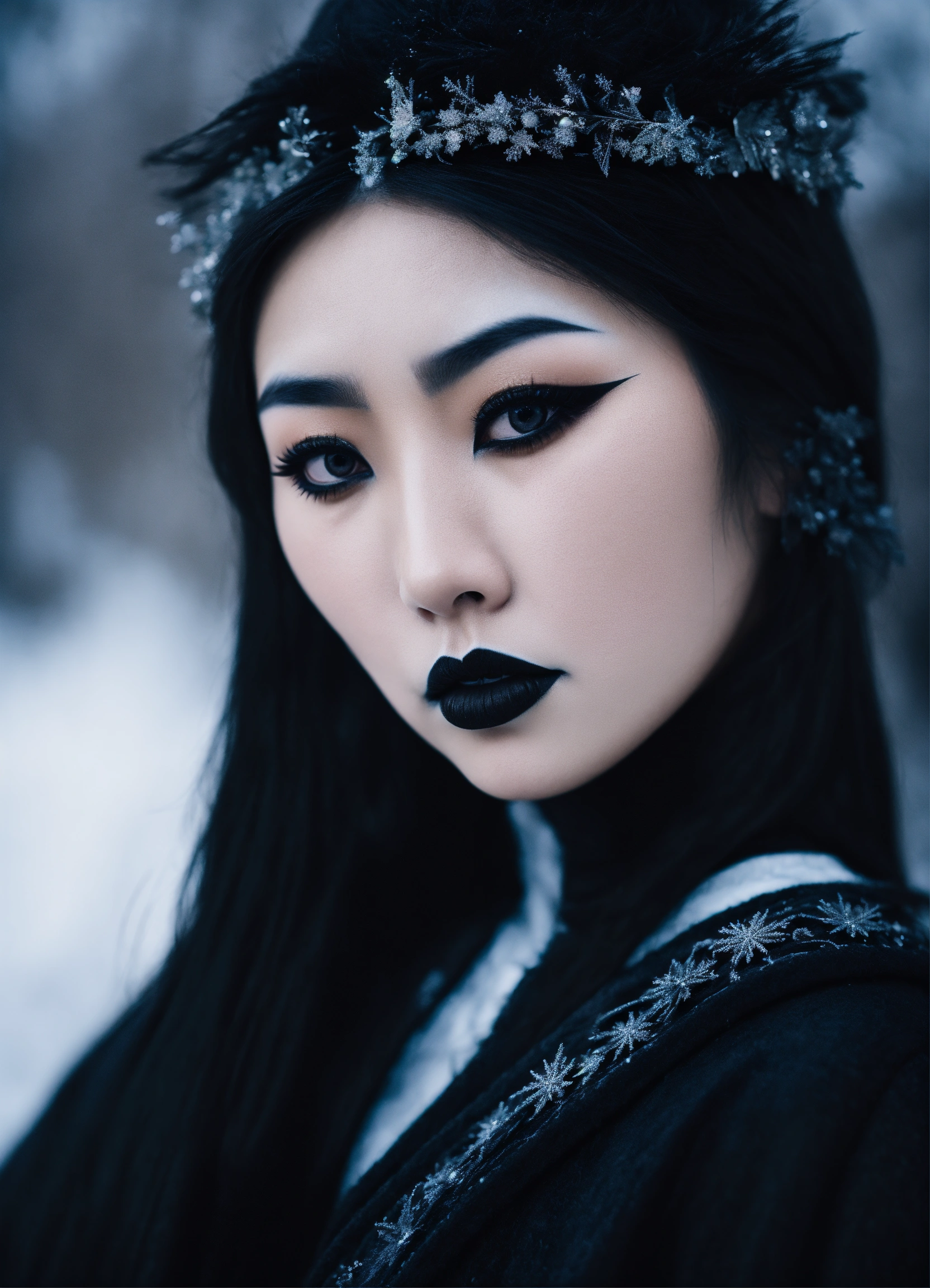 High contrast portrait of a japanese woman, gothic, white painted face, dramatic winged black eyeliner, black lips, serious look, winter landscape