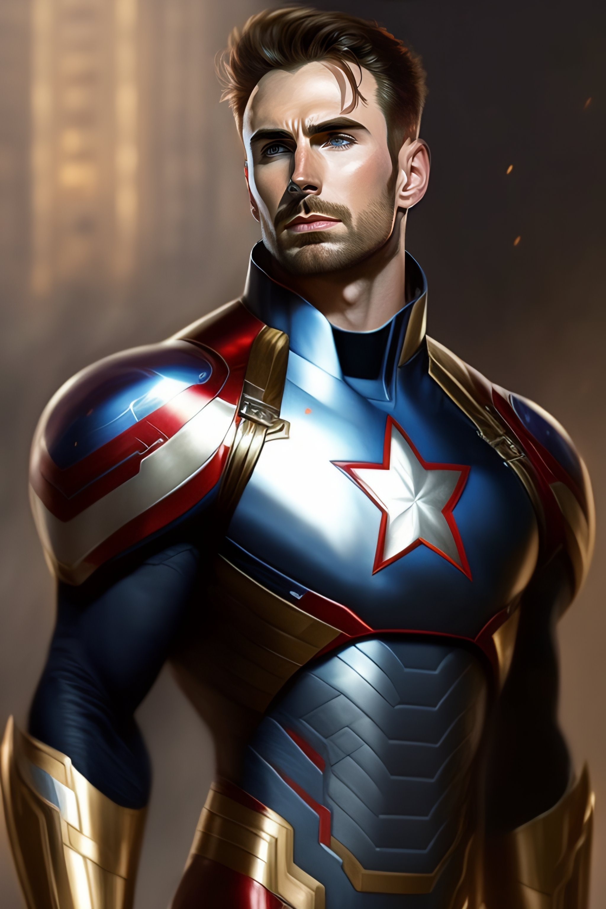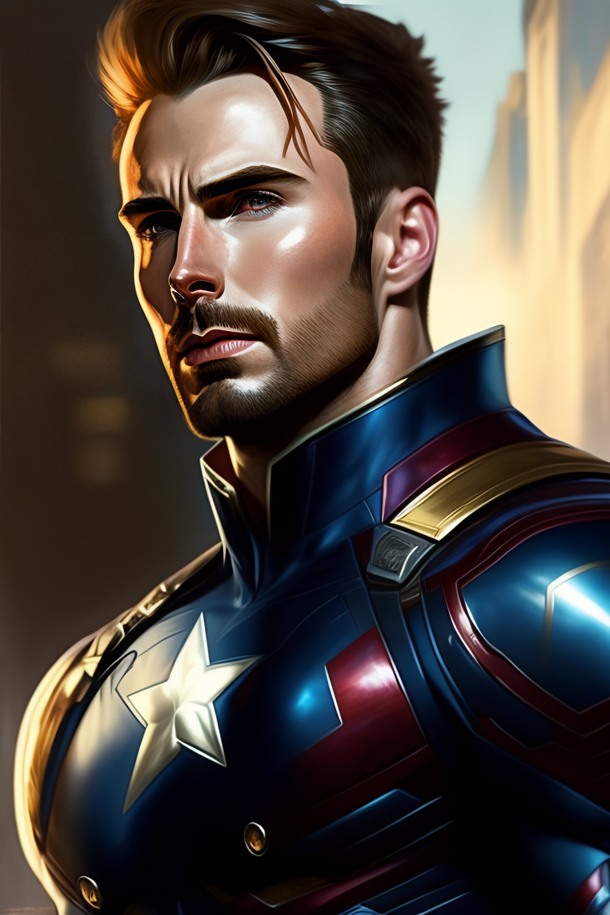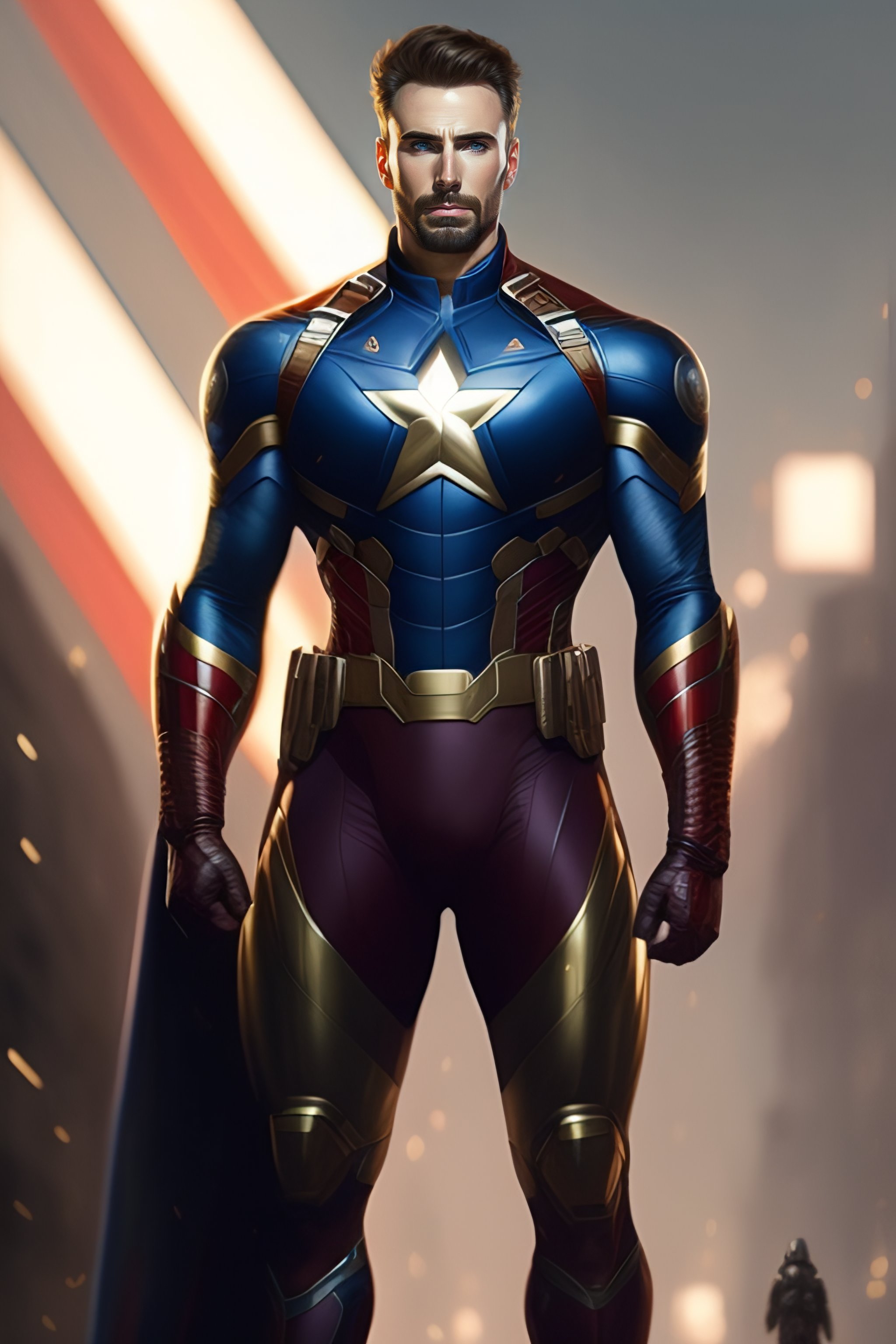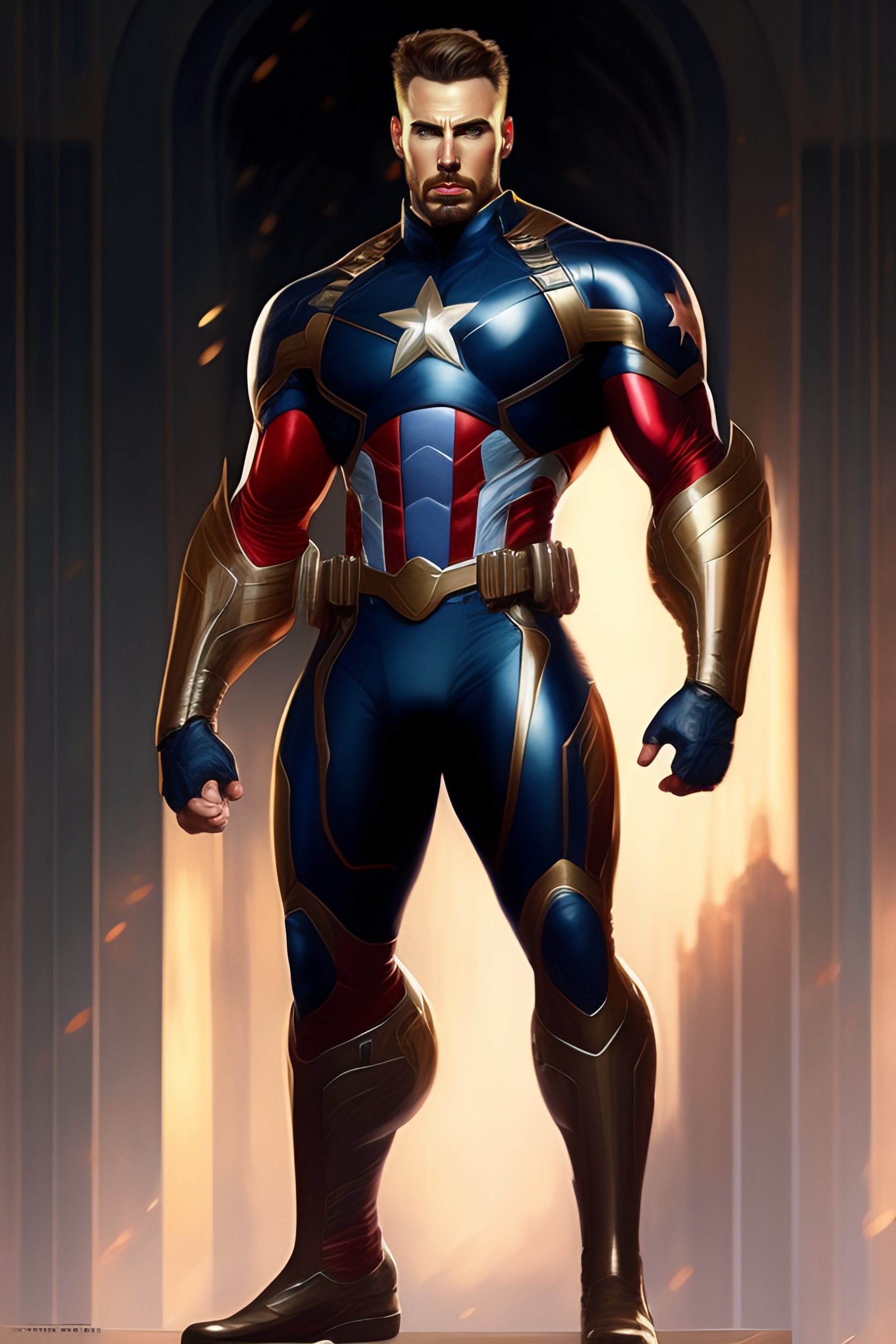 Full body potrait thin muscular chris evans in captain america civil war suit standing with a confident, nonchalant expression on his face anime version, his unassuming appearance belying his incredible strength, hyper detailed, sharp focus art by greg rutkowski and alphonse mucha