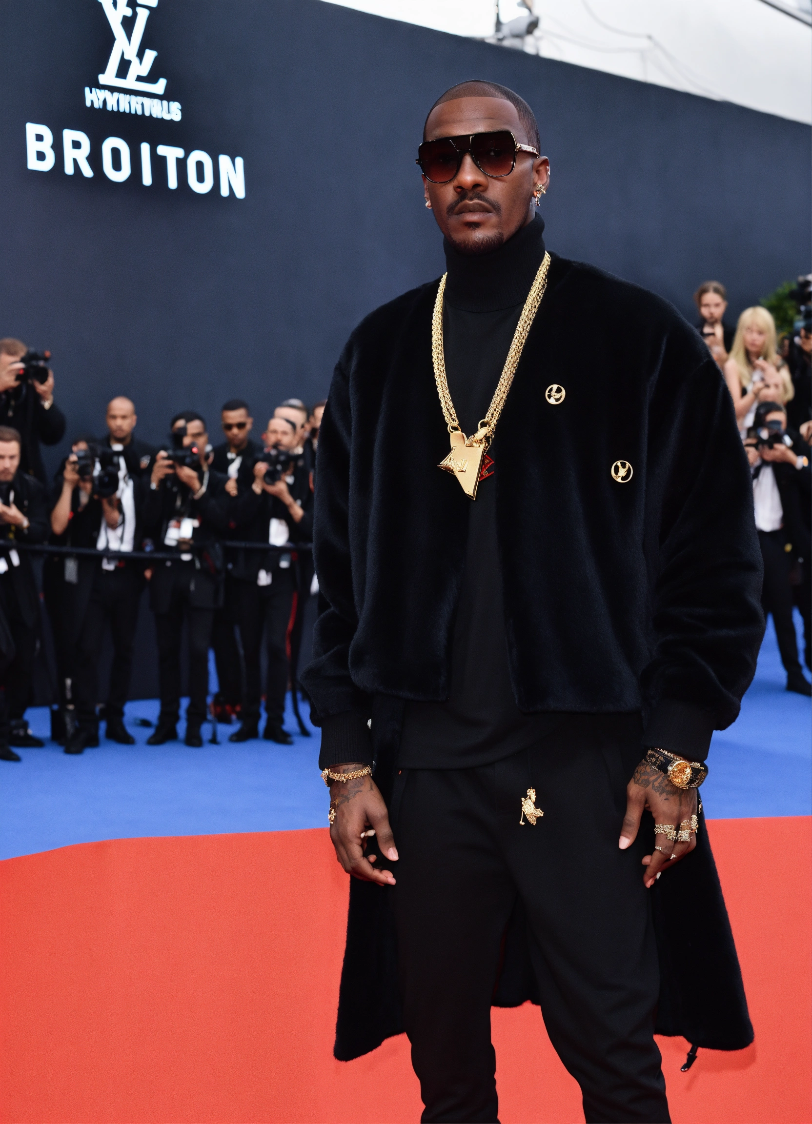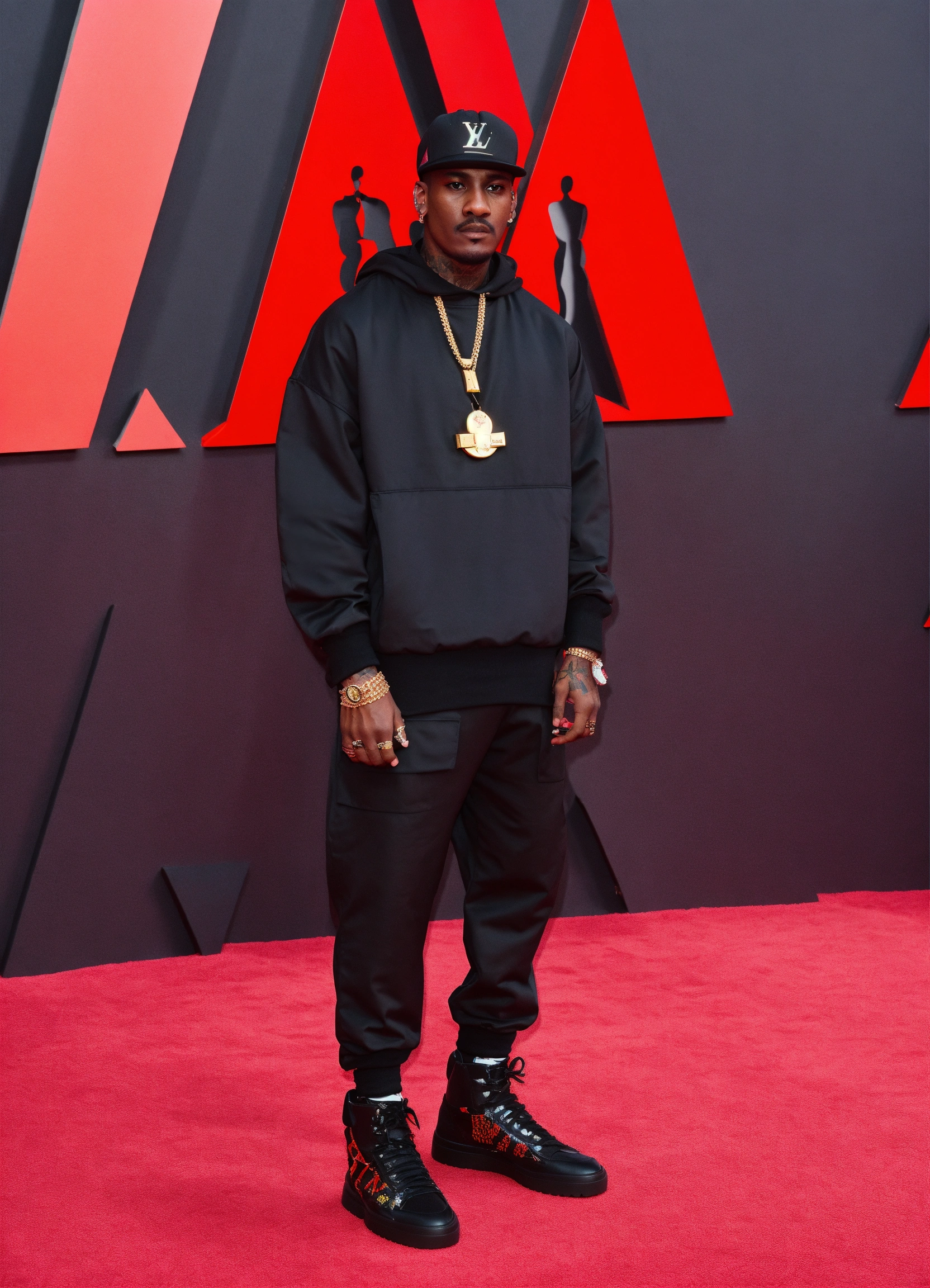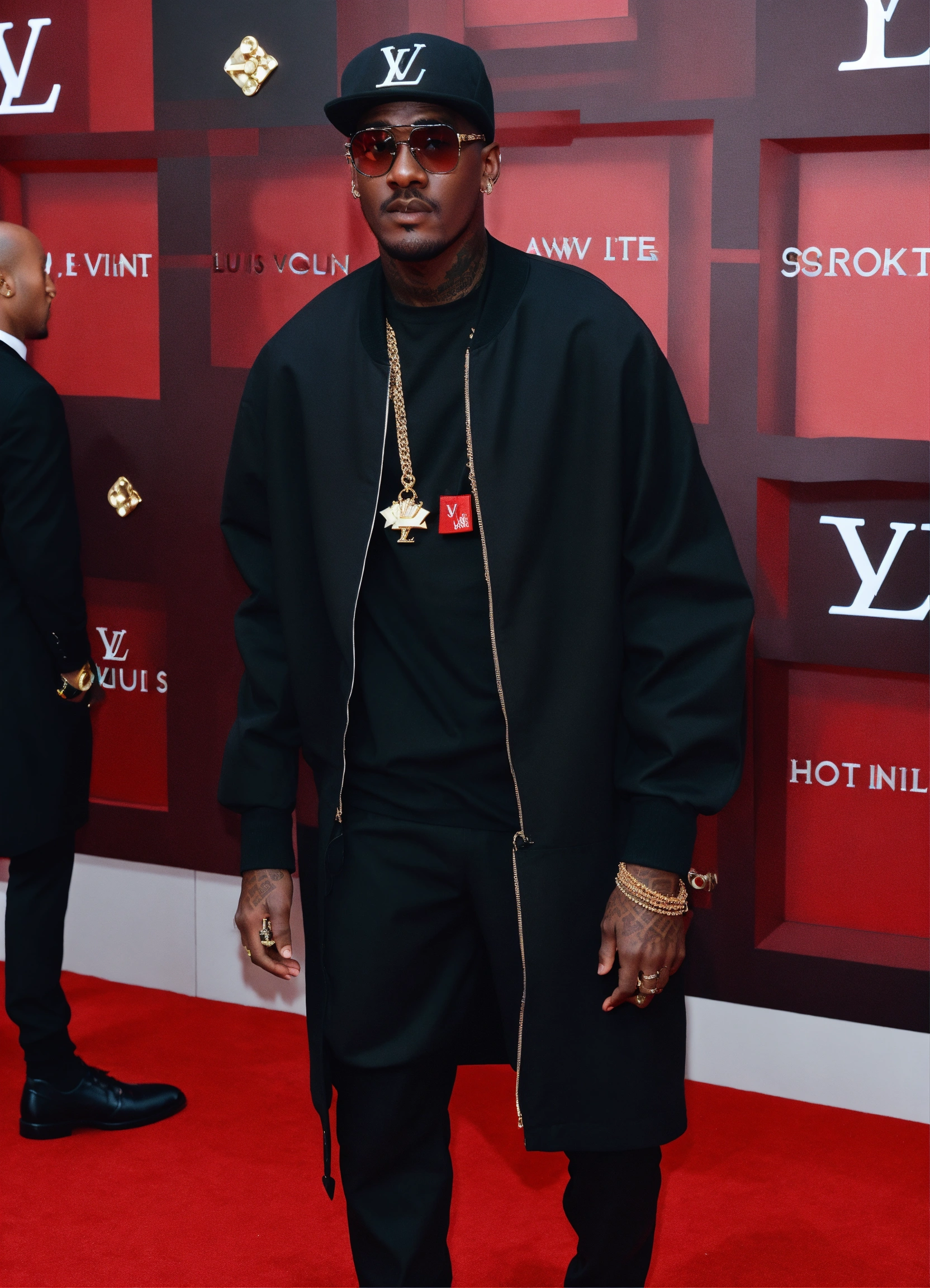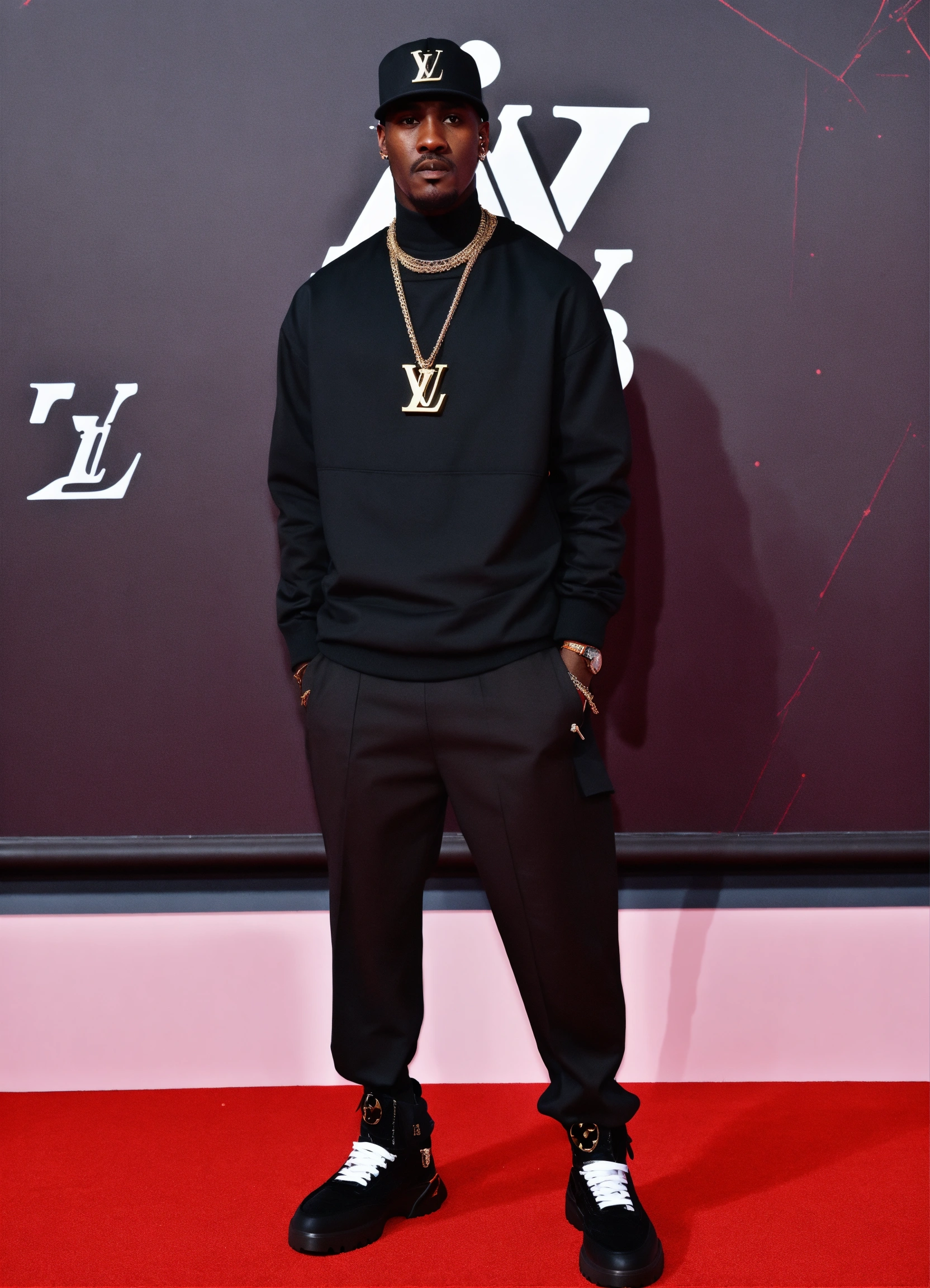 Skepta, wearing all black, standing on red carpet, event, avant-garde, minimalist 8k resolution, hyper realistic, mid day, 35mm film, editorial, high fashion, louis vuitton, by virgil abloh.