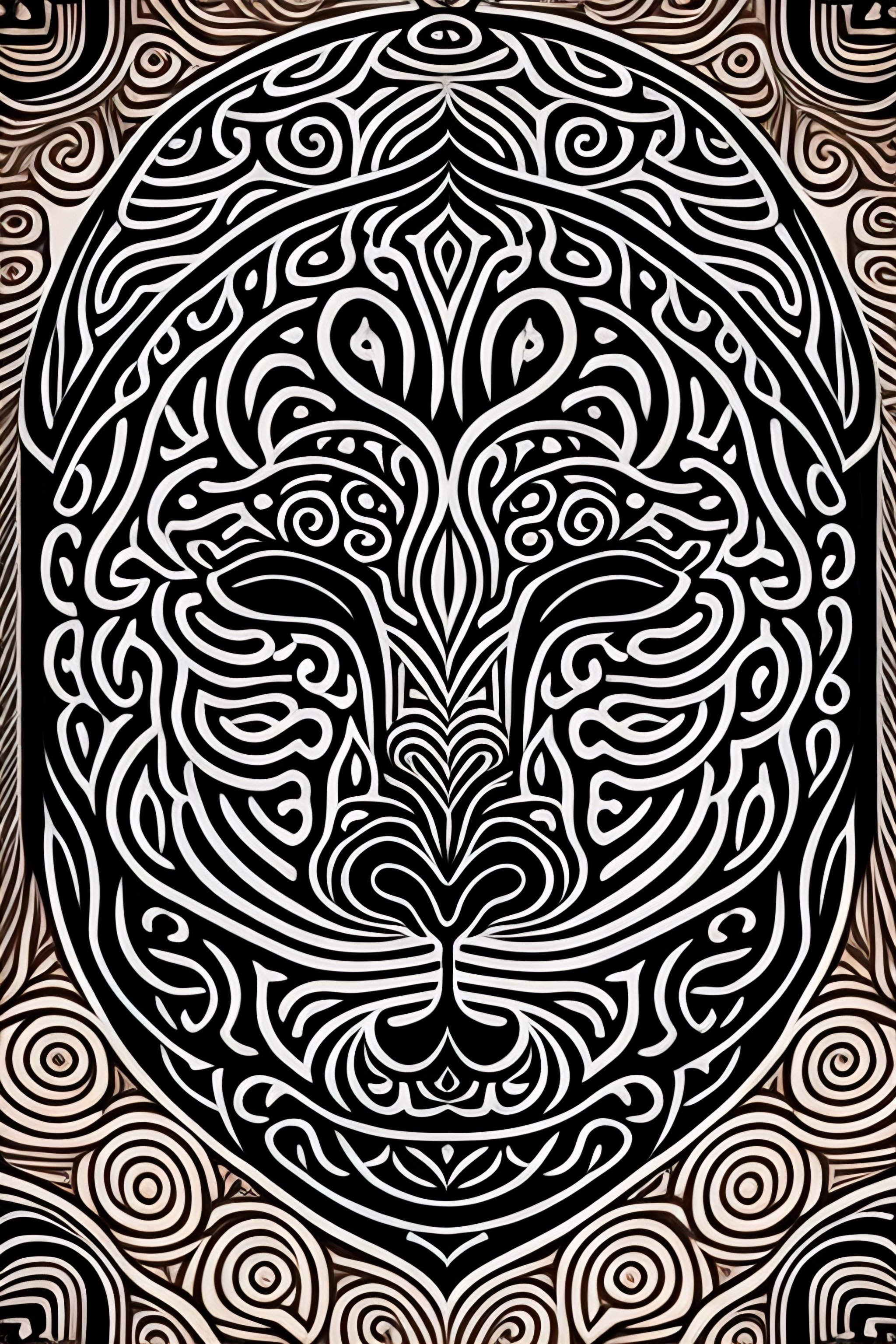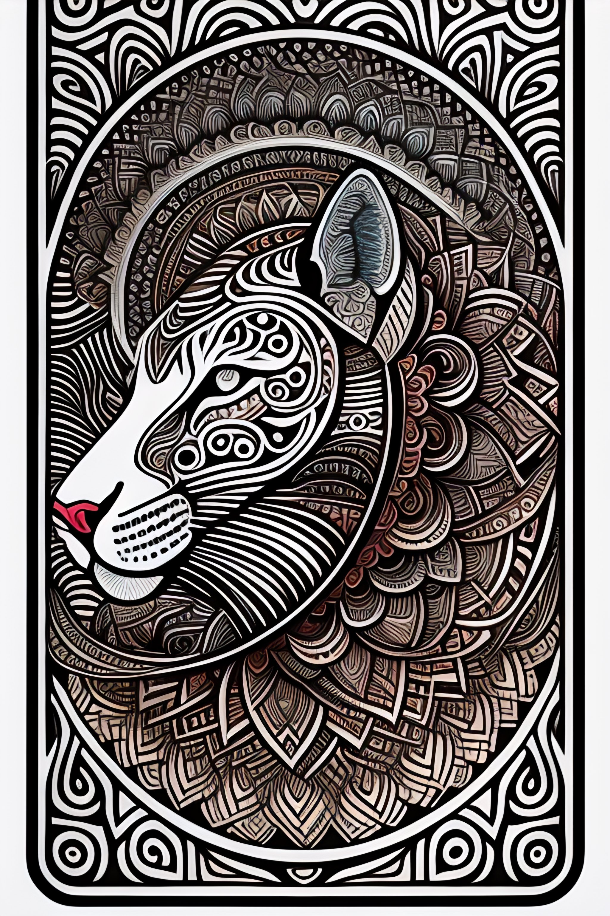 Coloring book, mandala style, connected lines, symmetry, one jaguar head, facing front, black and white, thick line work, big patterns, negative space, thick pattern, beautiful forest pattern background, ink fine line art stylized, vector, adobe illustrator, eps, design for tattoo, african pattern, only black and white, no black bars, no black patches, lots of space between lines, lines are all the same thickness, no colors, monotone, monochromatic