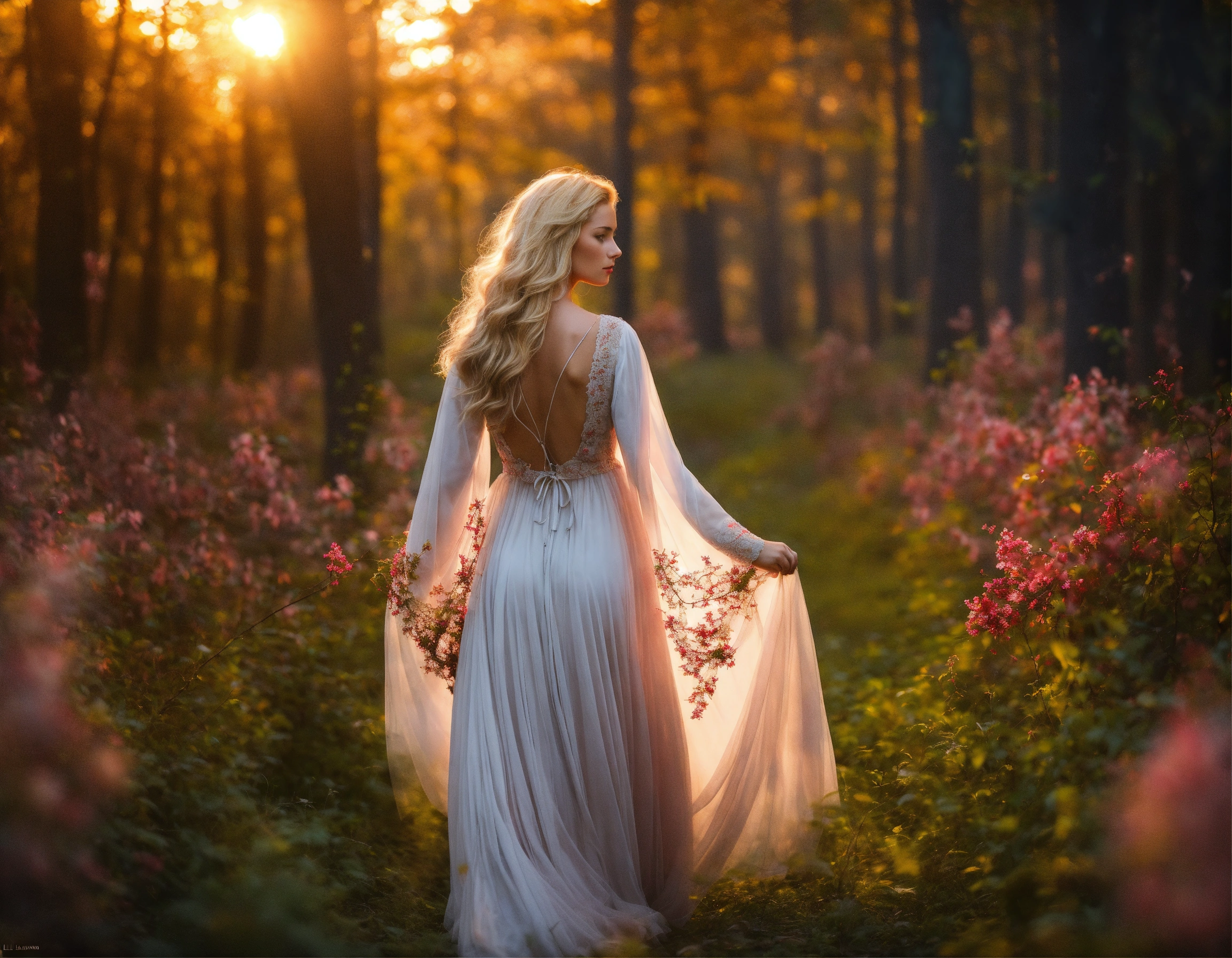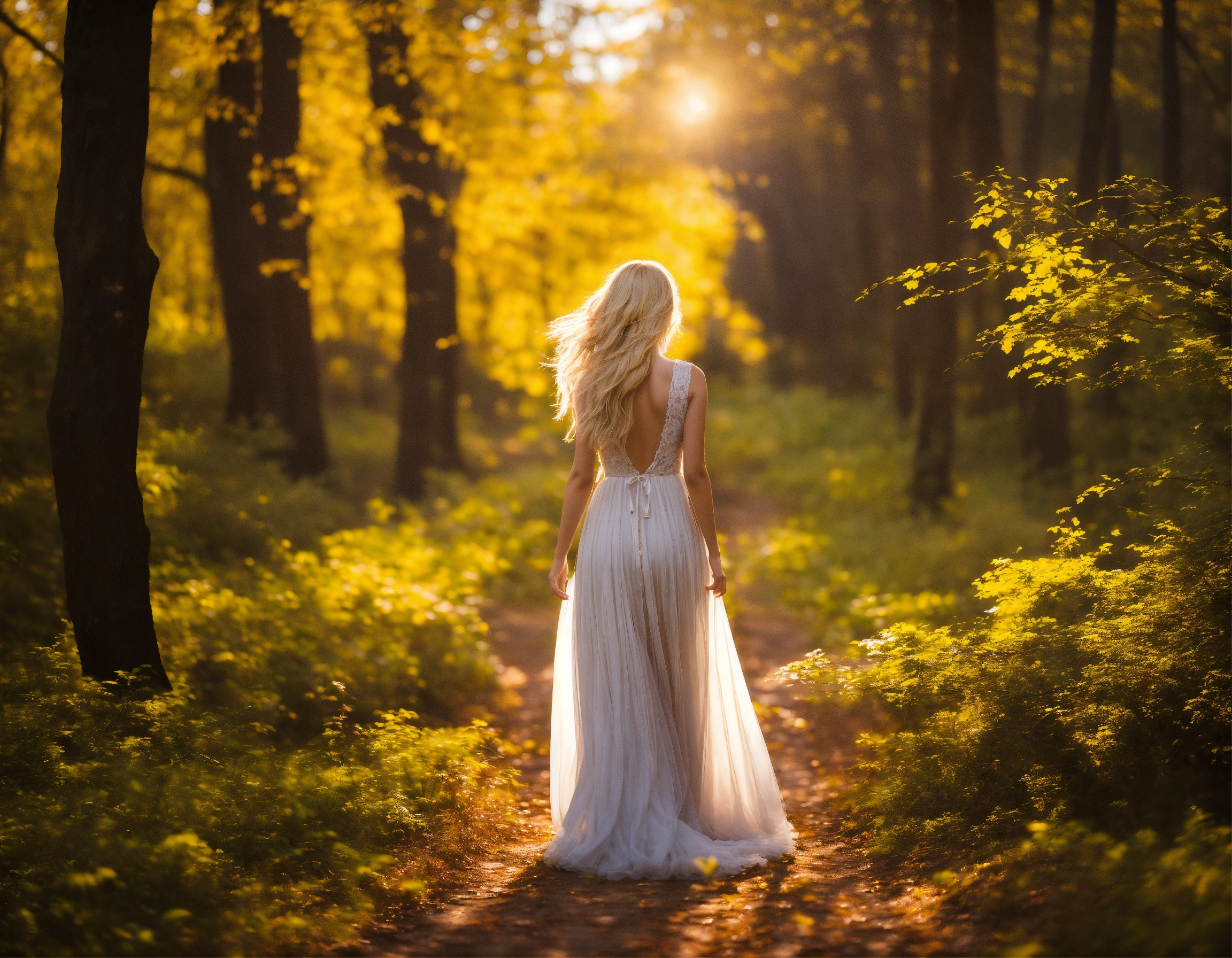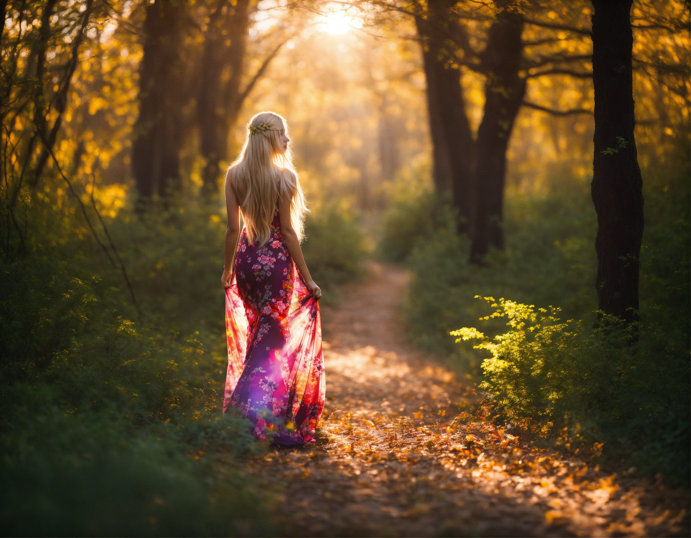 Femme blonde aux longs cheveux qui marche de dos dans la forêt, robe longue et fleurie, image réaliste et lumineuse qui fait rêver