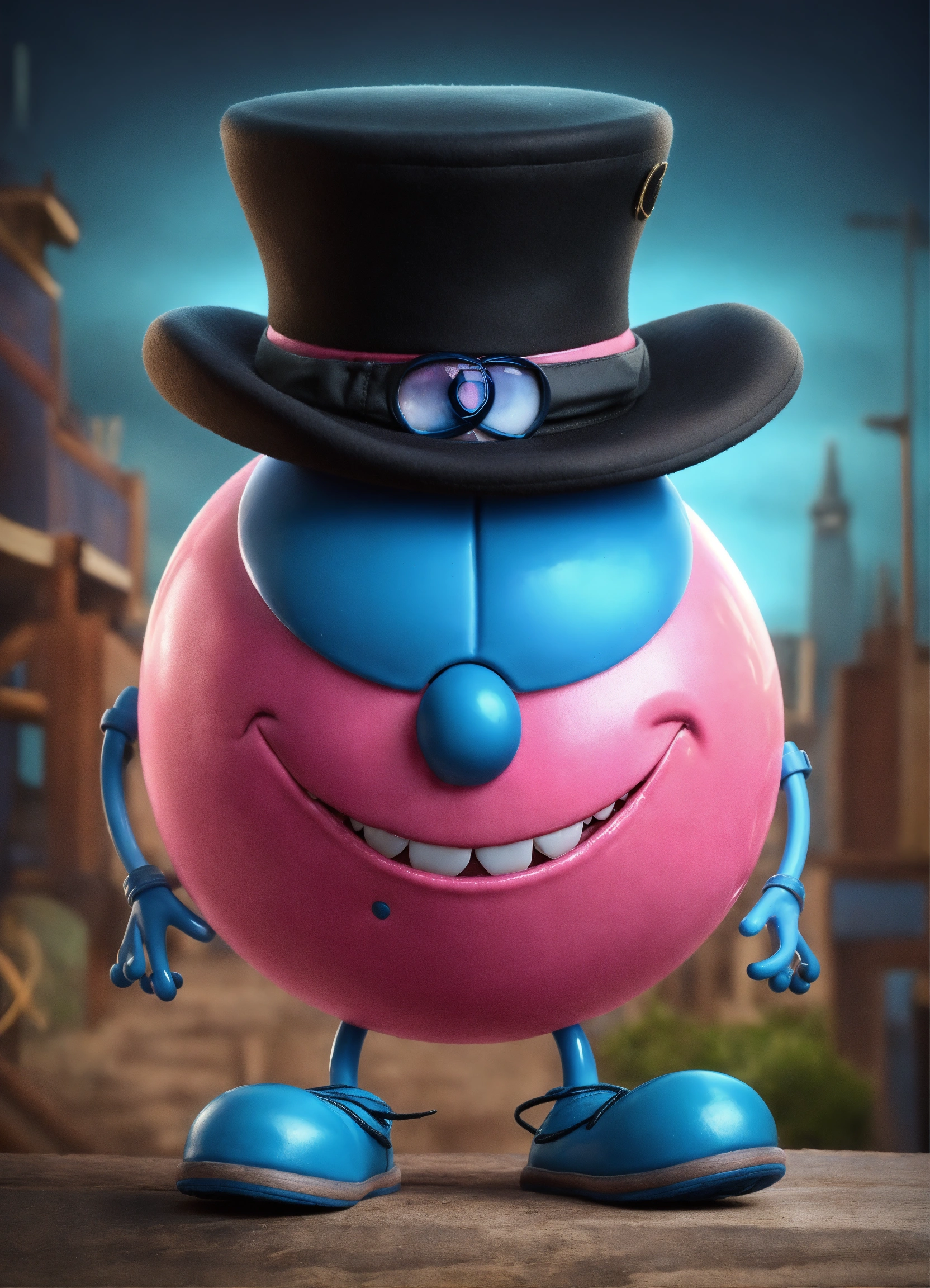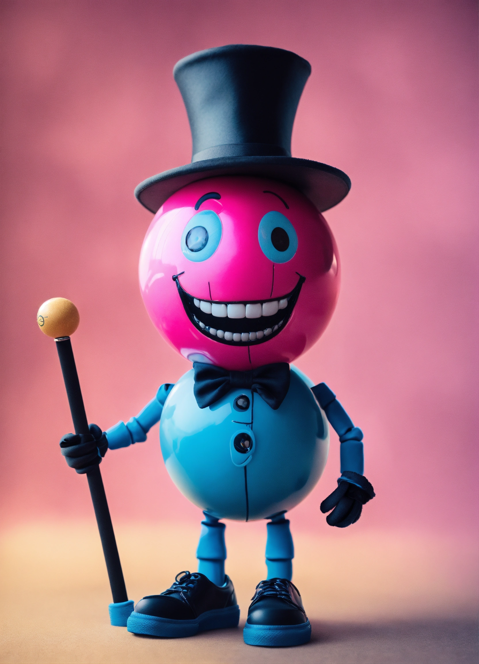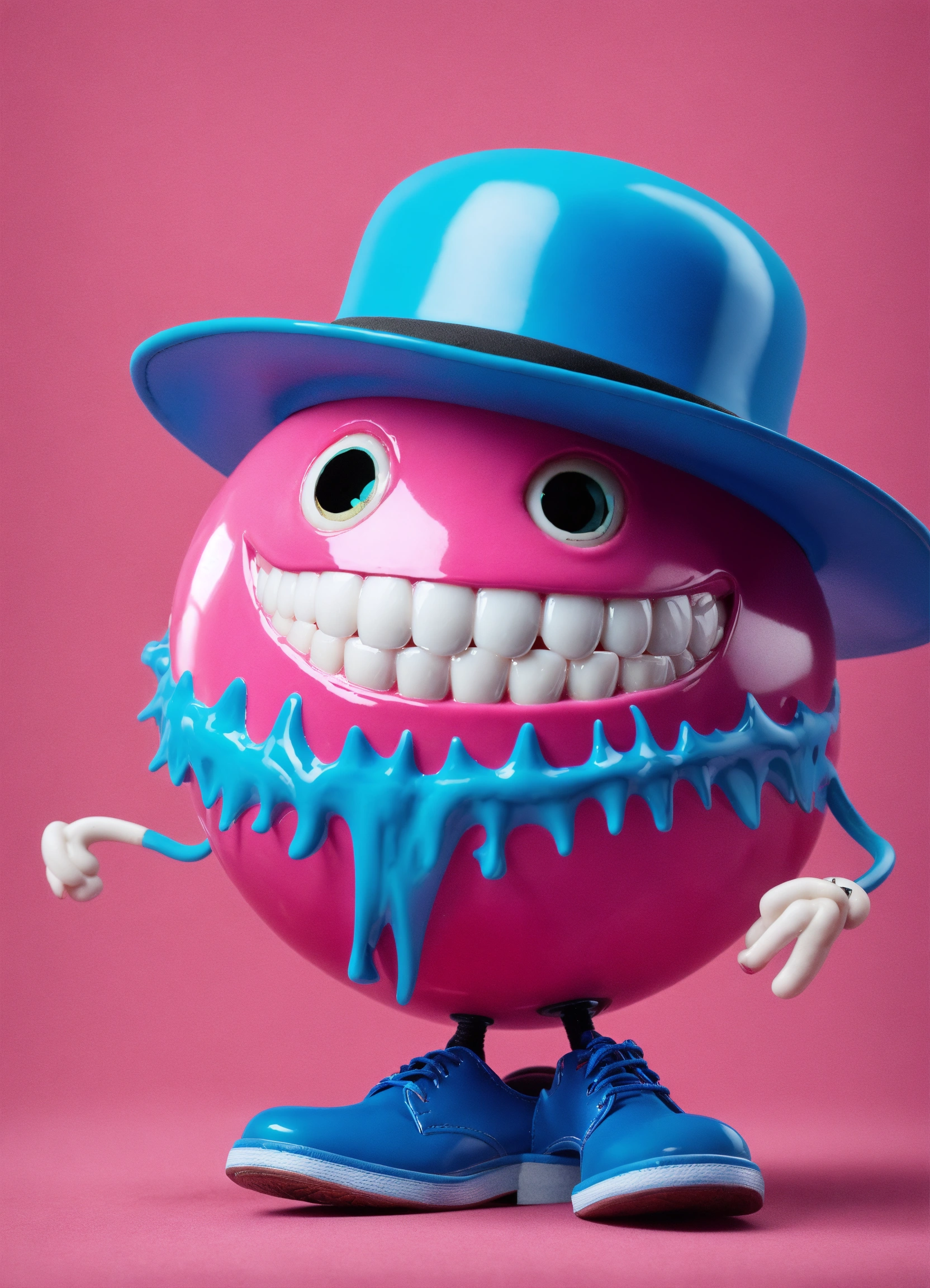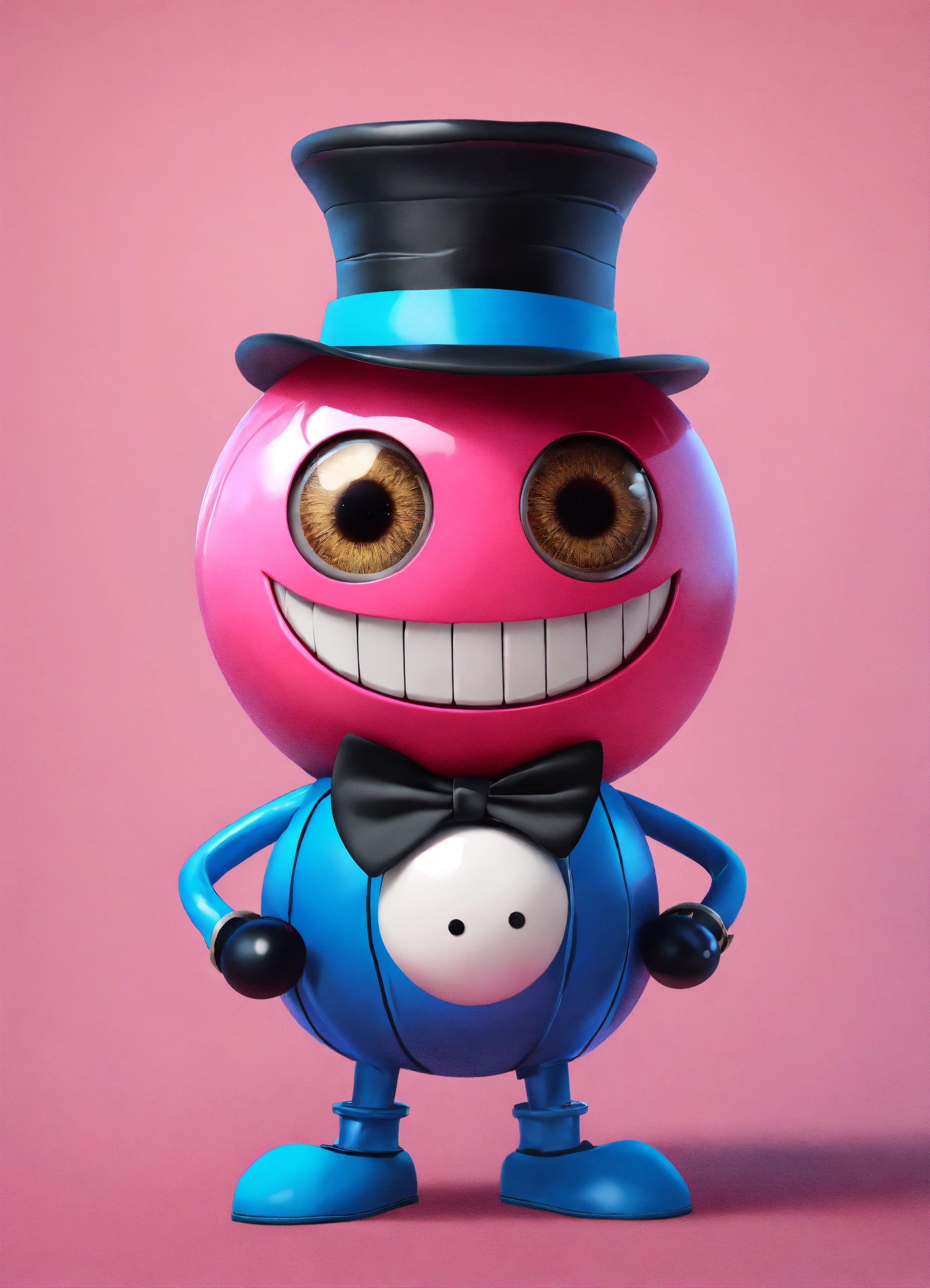 A pink ball with a big toothed grin, he has blue stick legs and blue shoes, he wears a black bowler hat his eyeballs are hazel colored