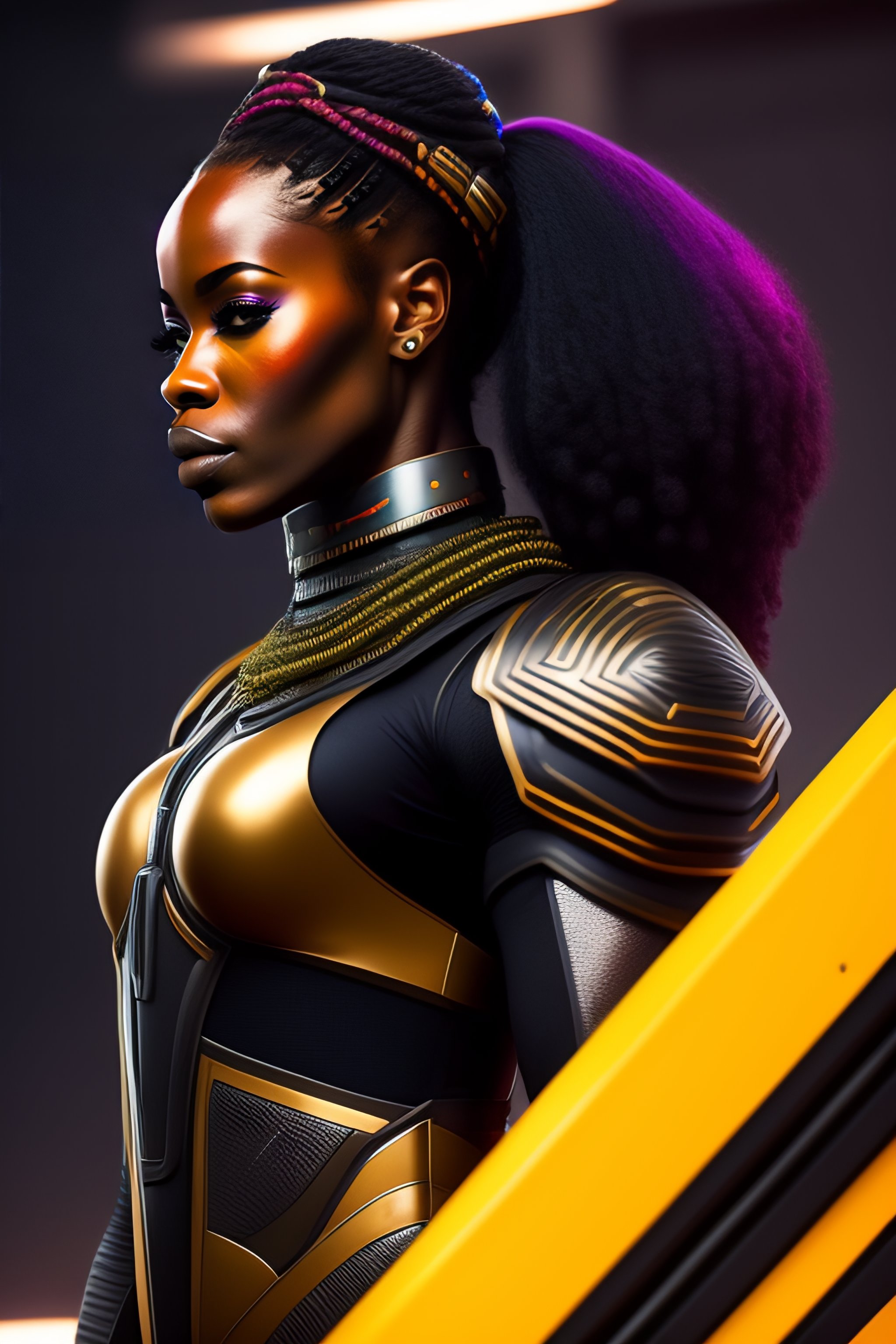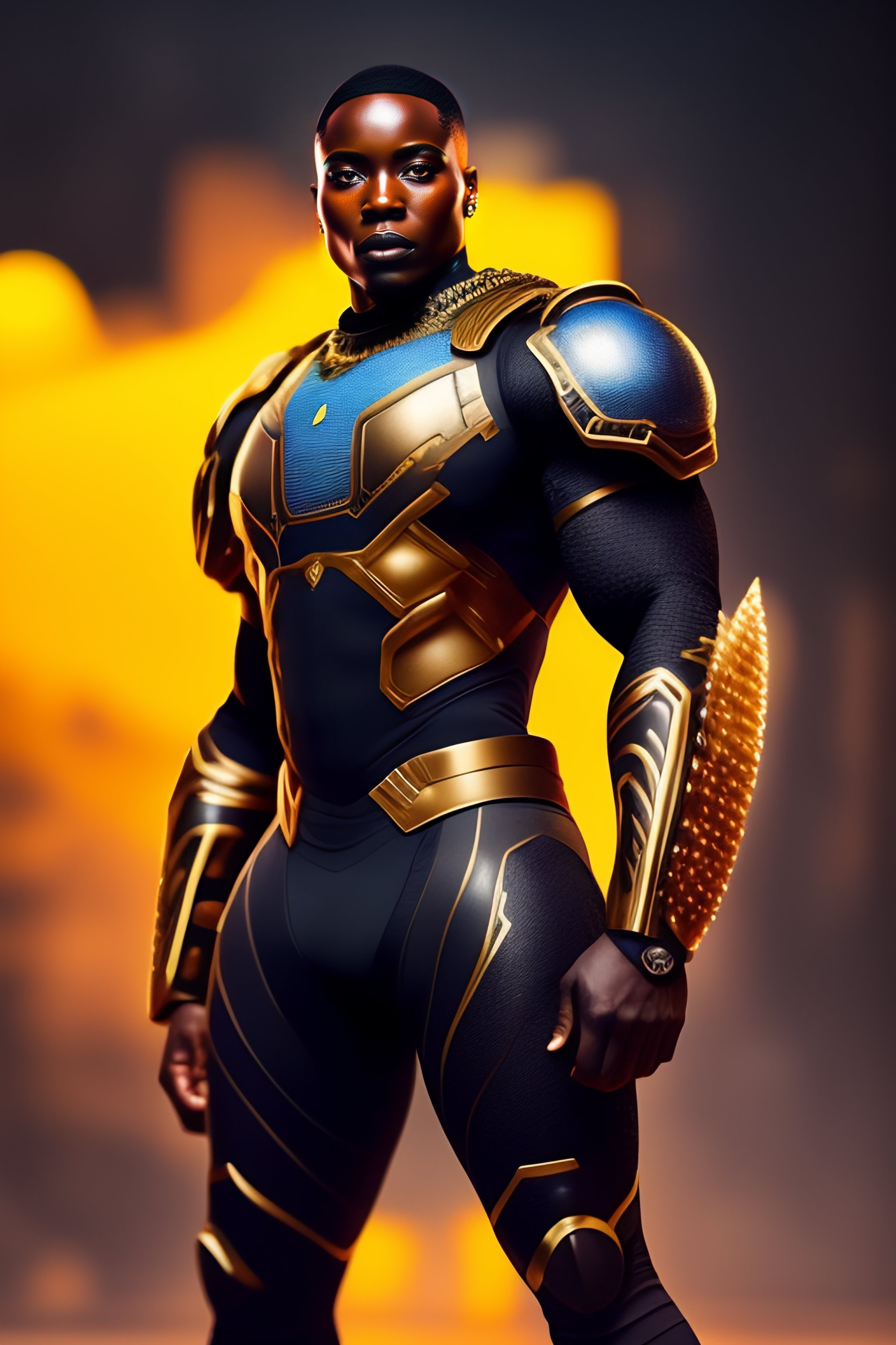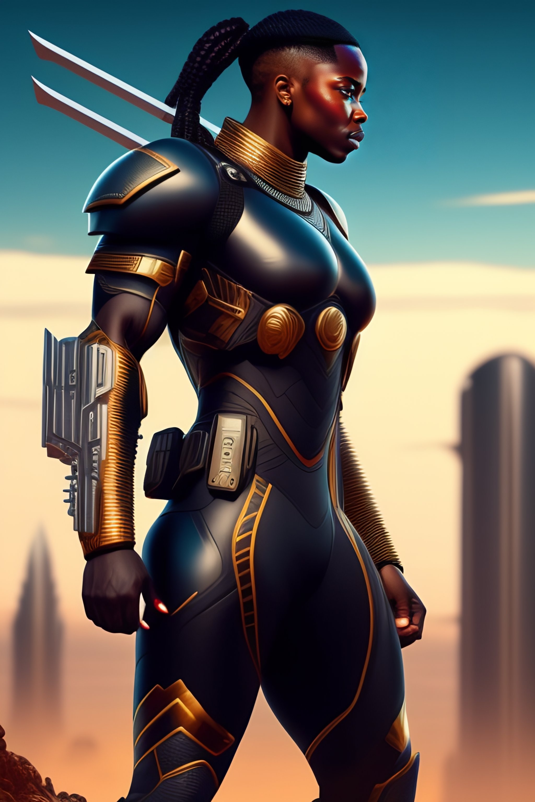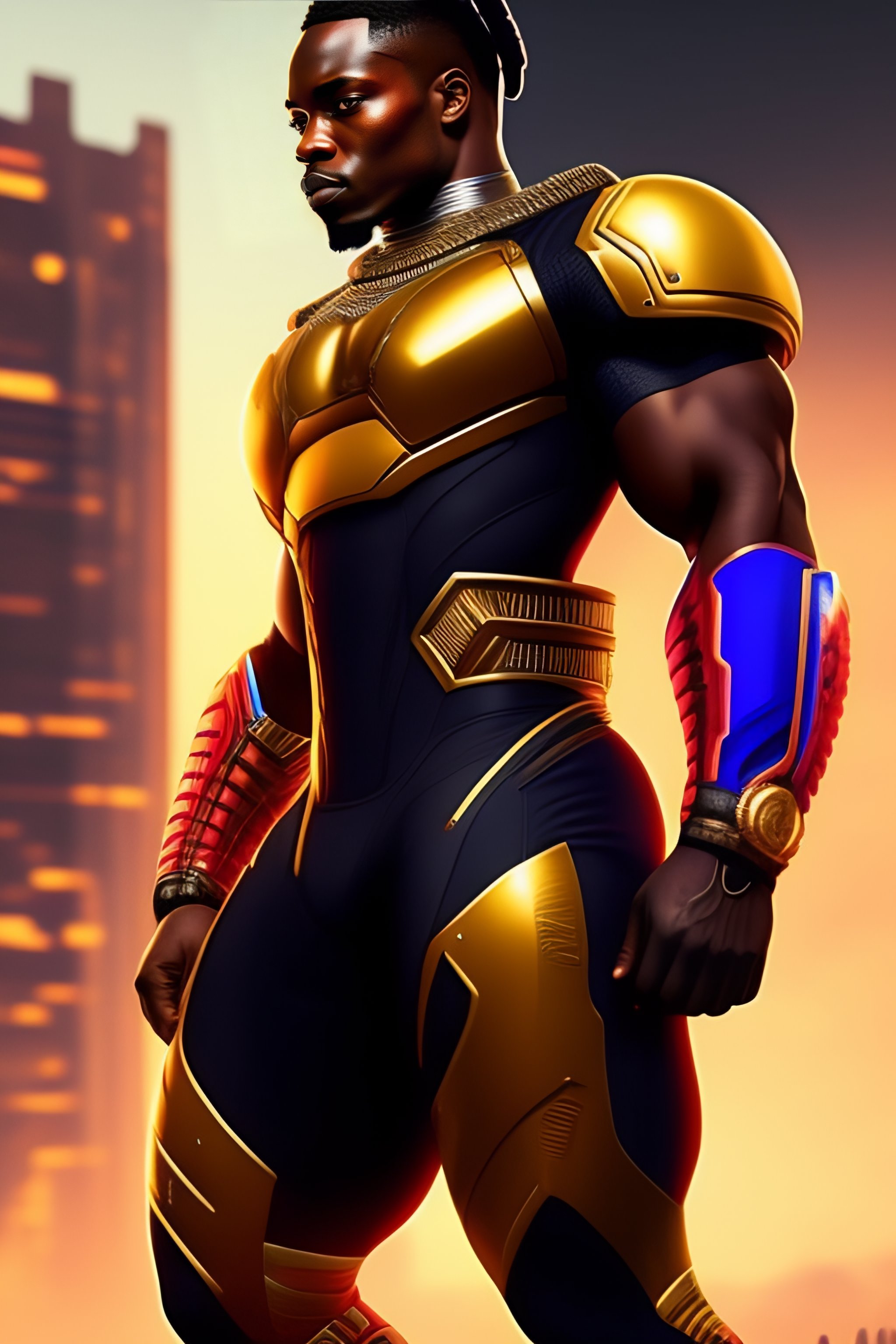 Strong african solider, cyberpunk, symmetric, futurist, bodily, with armored chest, strapped legs, painted, ultimately detailed, wakanda