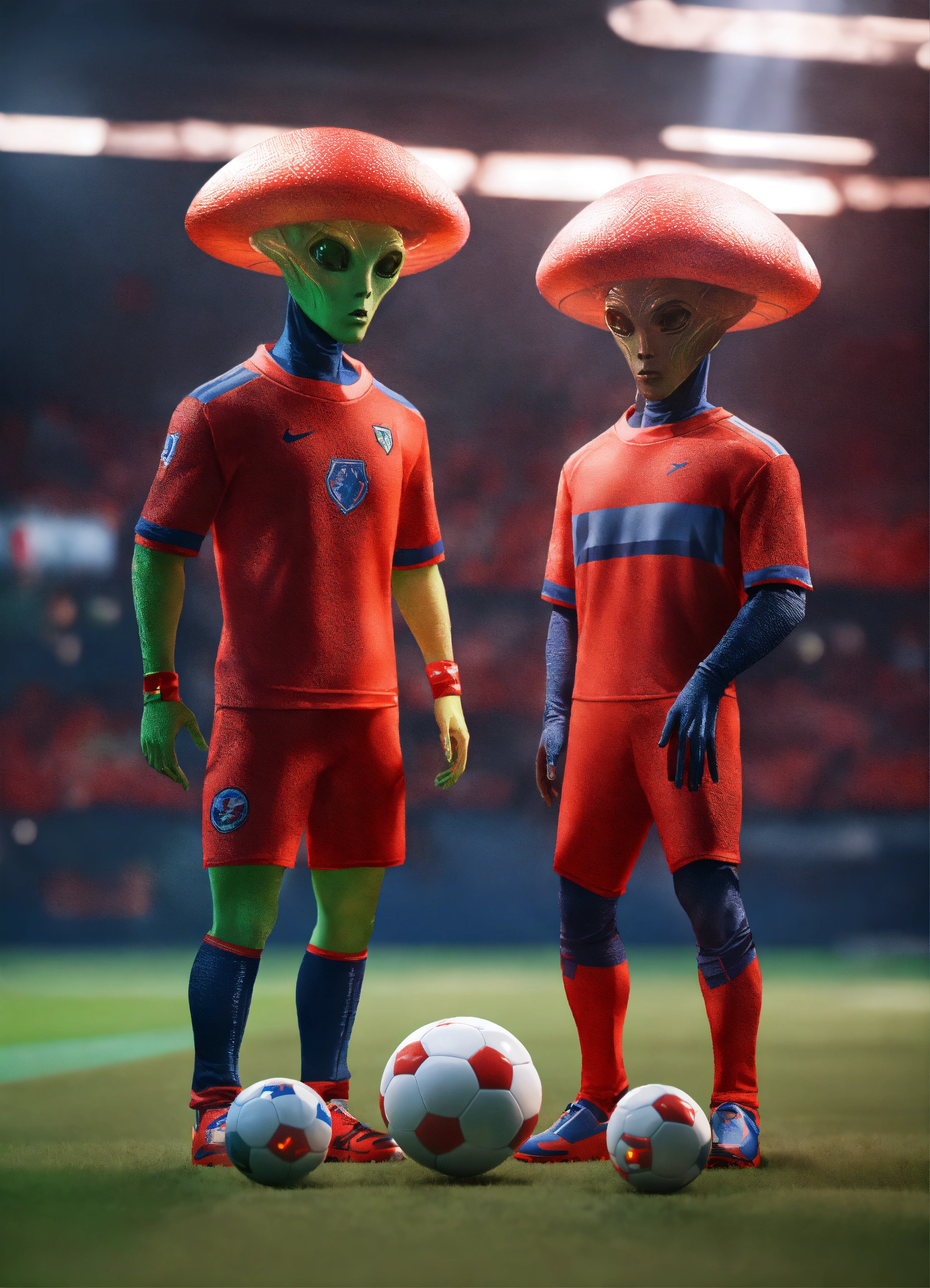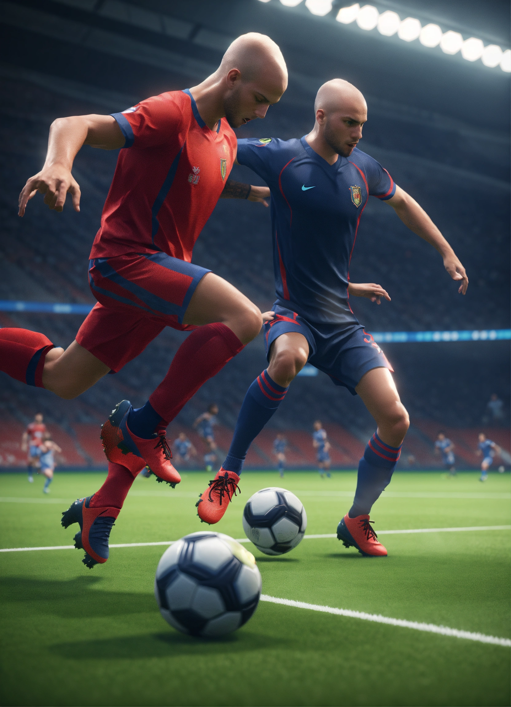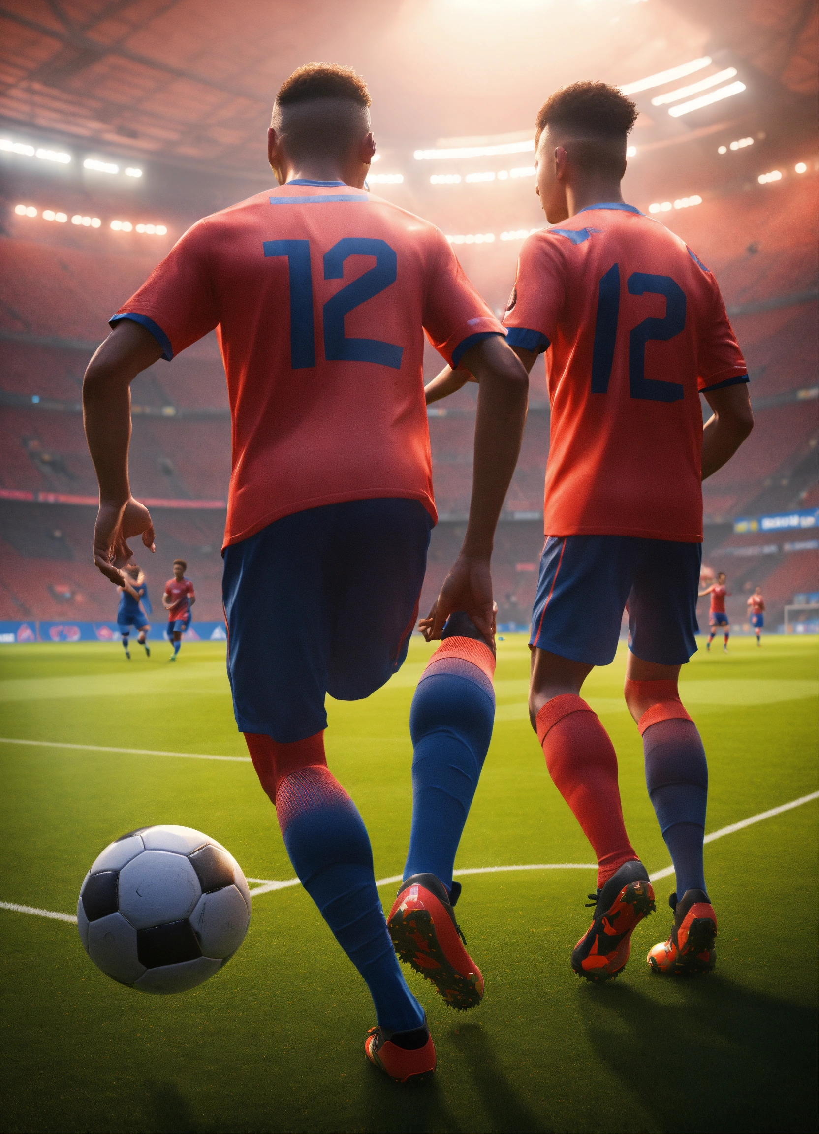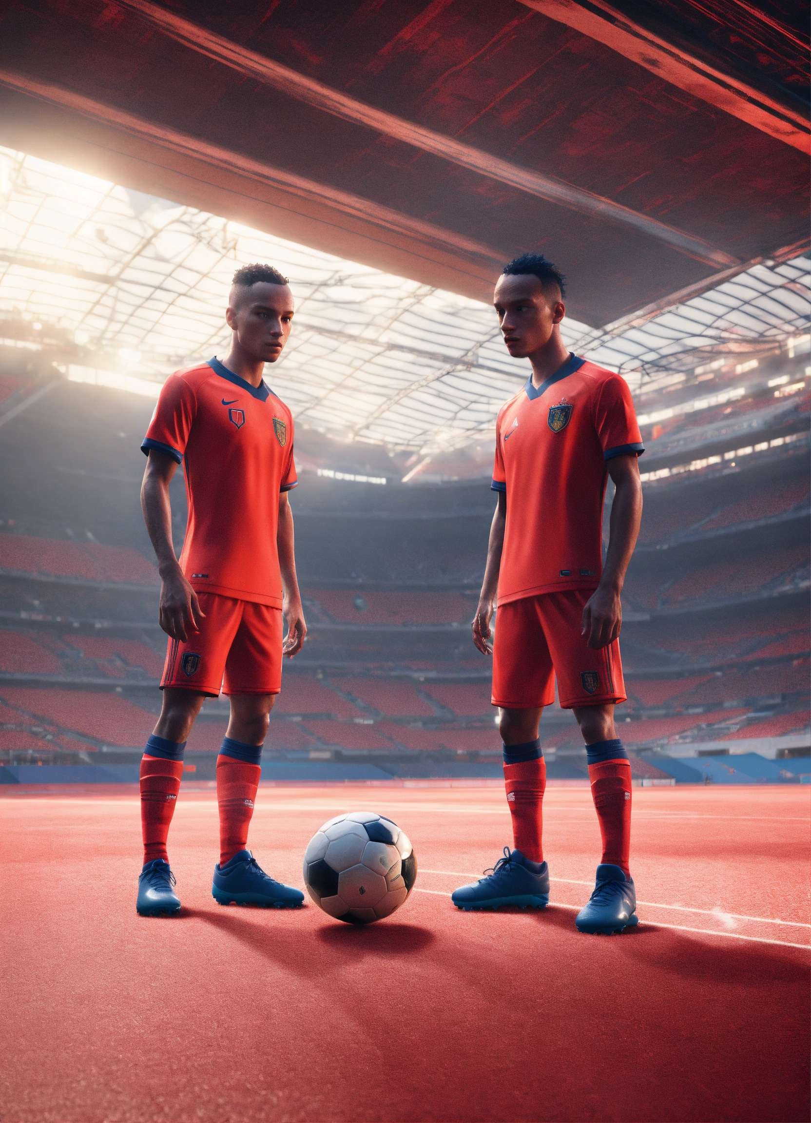 Two alien soccer players are playing a game of soccer, in the style of videogame, light red and light navy, hyperrealist, unreal engine --ar 12885 --s 50 --style raw