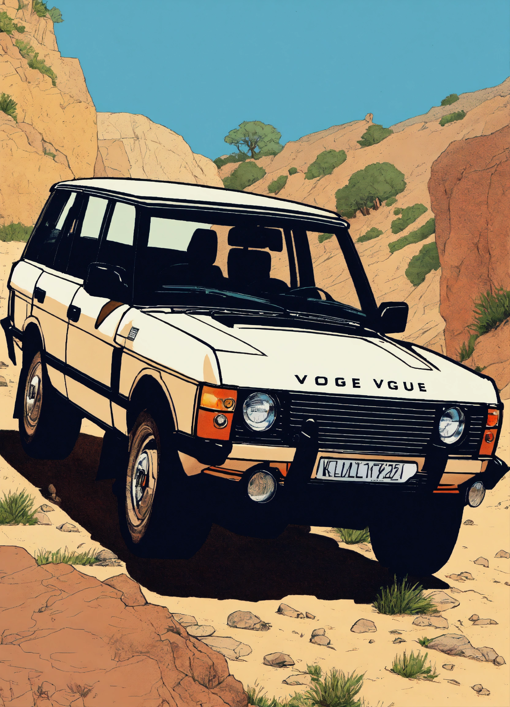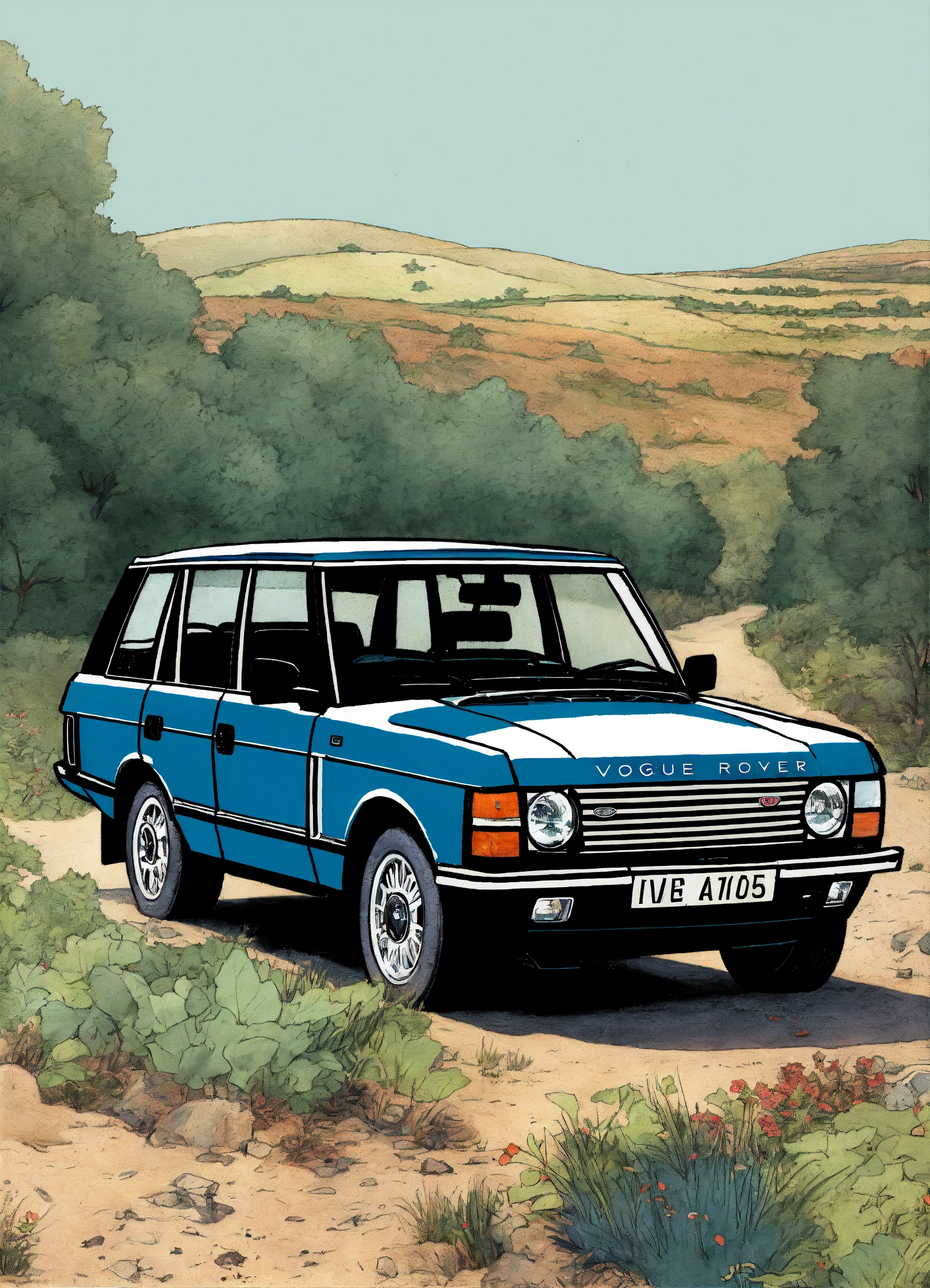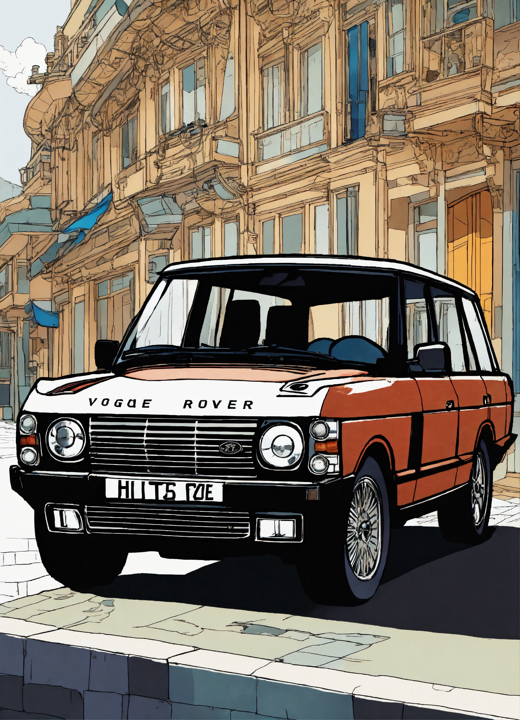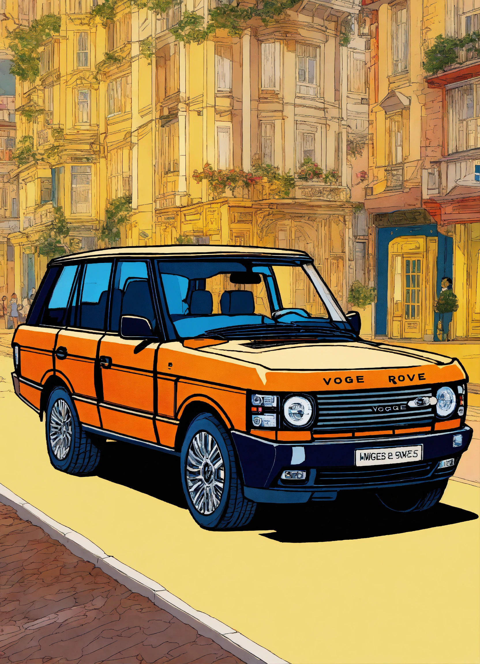 Detailed pen and ink illustration of a modern range rover vogue 2016, dark color of the car, by herge, in the style of tin-tin comics, colorful, detailed, high quality, minimalism, aesthetic