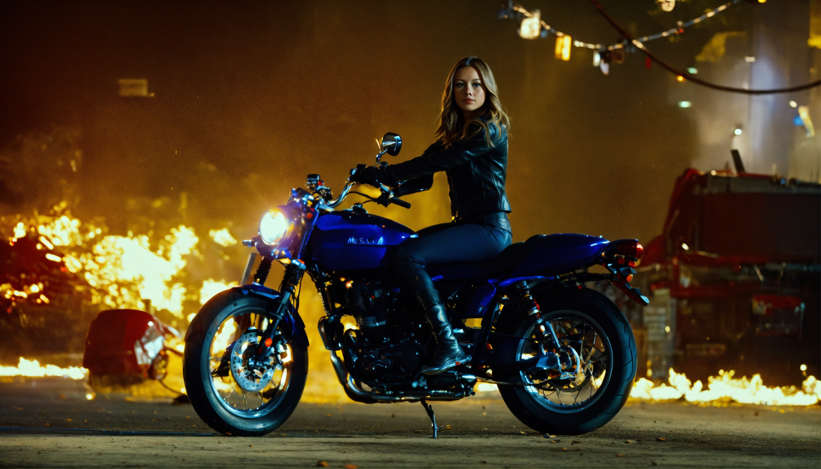 Generate images of melissa benoist dressed as a motorcyclist. laura vandervoort should be wearing a leather or cordura jacket, boots, and gloves. she should also be wearing jeans or other pants that are appropriate for riding a motorcycle. the images should be realistic and depict melissa benoist in a variety of poses, such as riding a motorcycle, standing next to a motorcycle, or posing for a picture. melissa benoist should be facing the camera, with her helmet off.