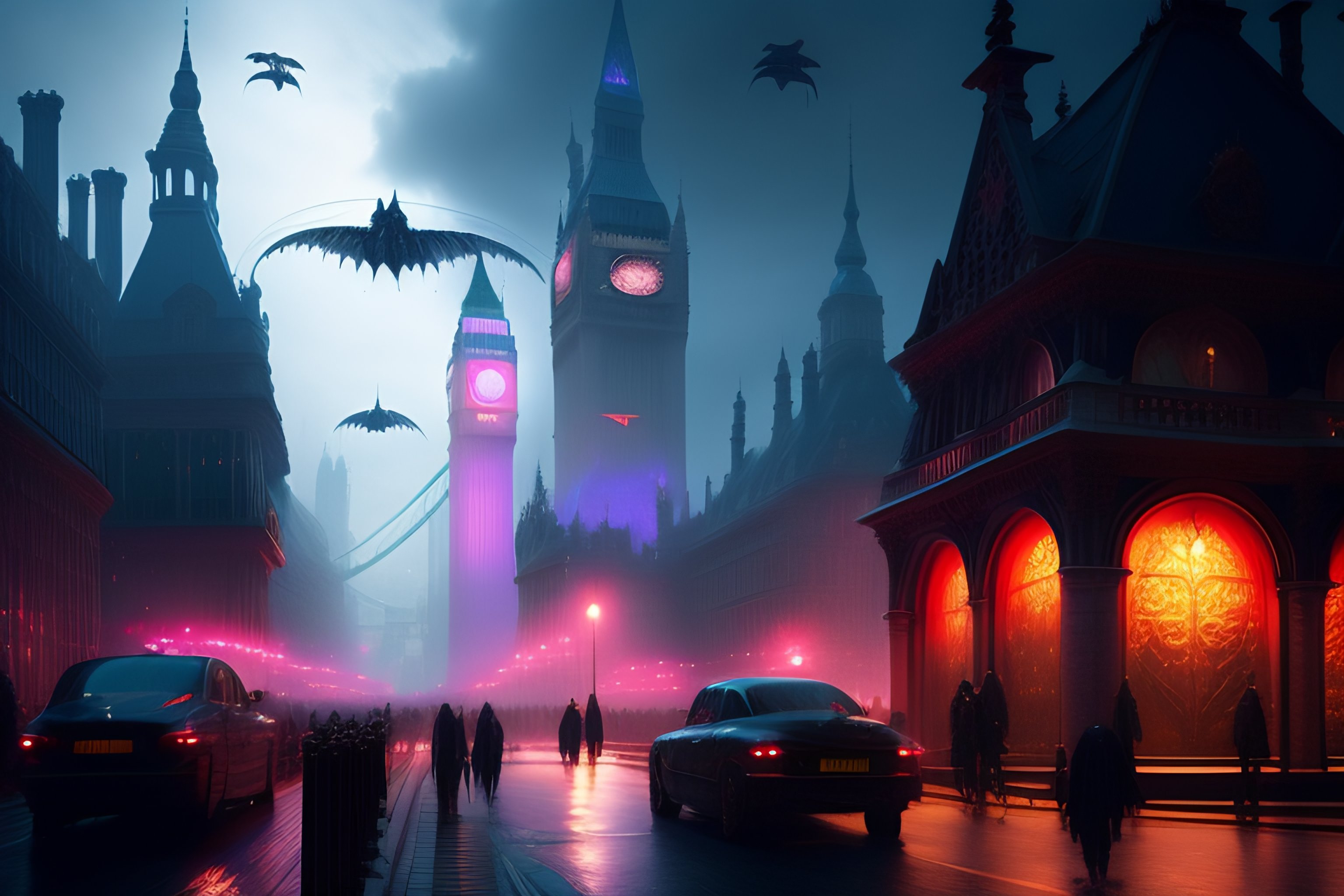Vampire invasion of london, fantasy art, johan grenier, hyperrealism, greg rutkowski, cinema 4d, cinema 4d, national geographic photo, digital painting, matte painting, beautiful, photorealistic, vibrant, eldritch, detailed, complex, colorful, cute
