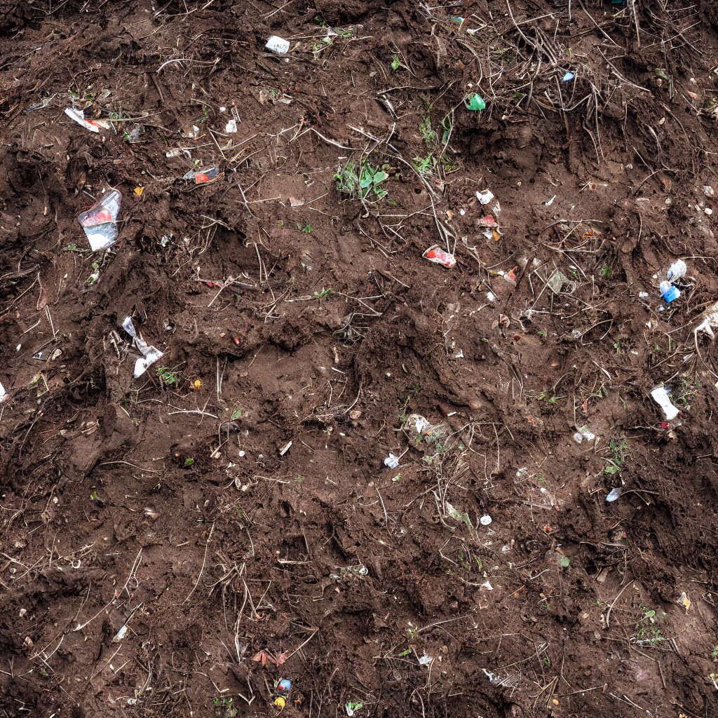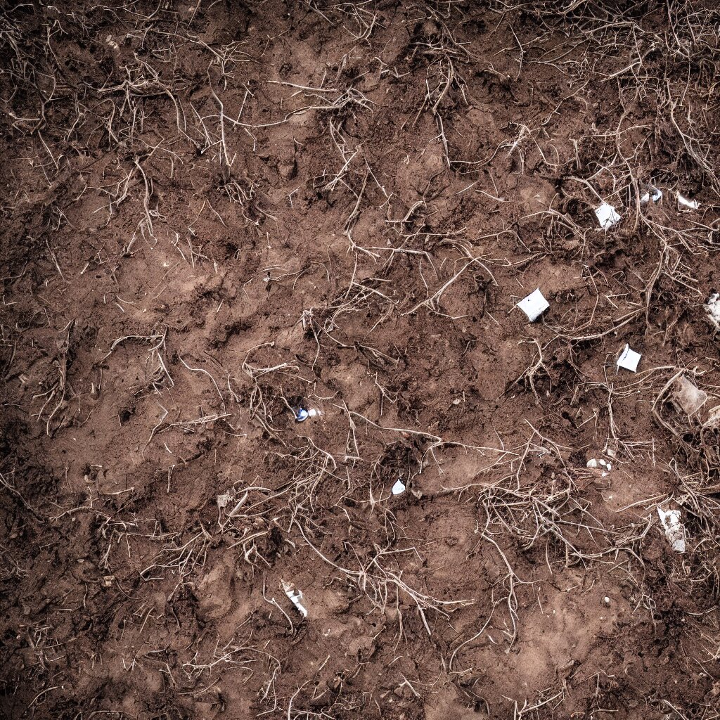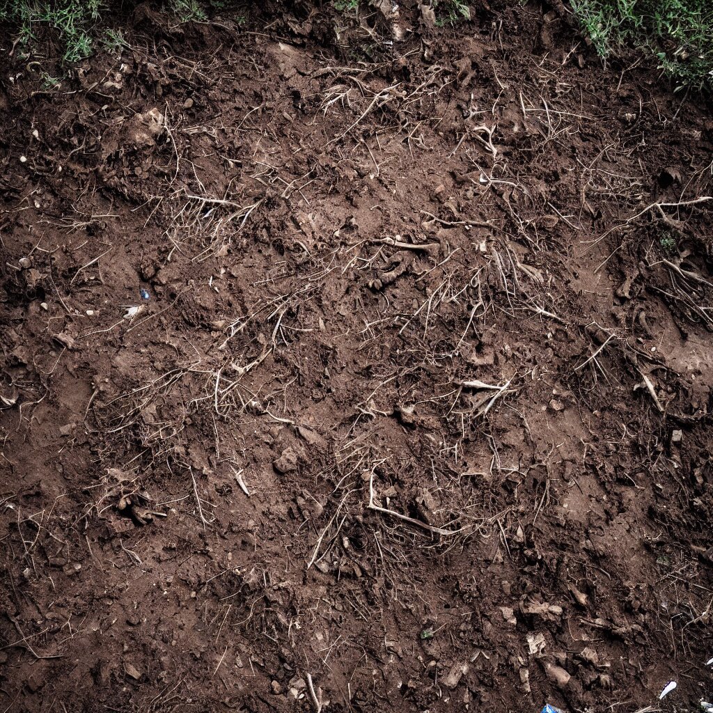 A high camera topdown picture of nightmare horror dirt with trash, bricks, giant thick tree roots and many muddy dark faces rising from the ground. dark.