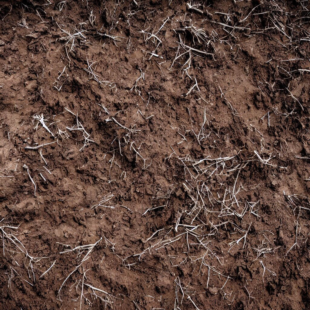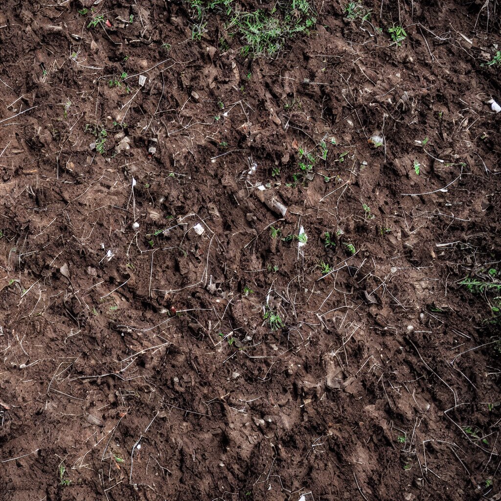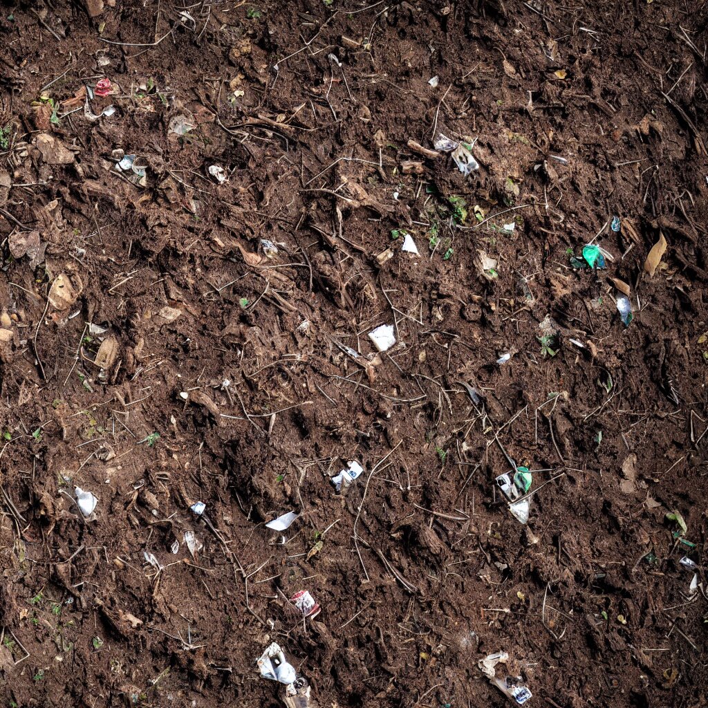 A high camera topdown picture of nightmare horror dirt with trash, bricks, giant thick tree roots and many muddy dark faces rising from the ground. dark.