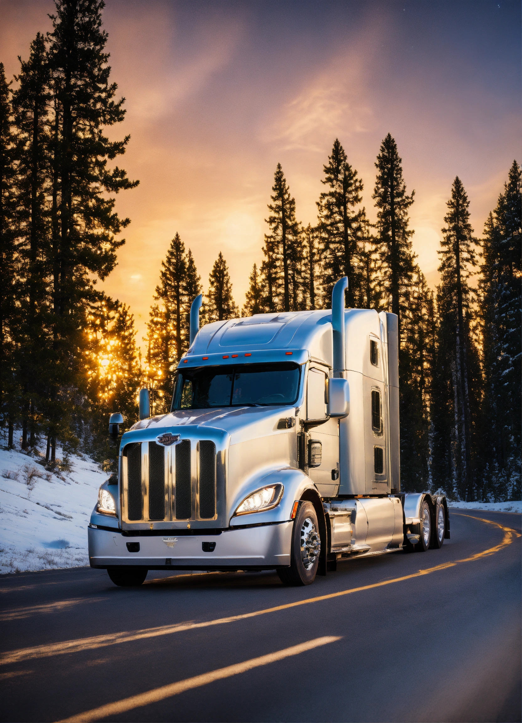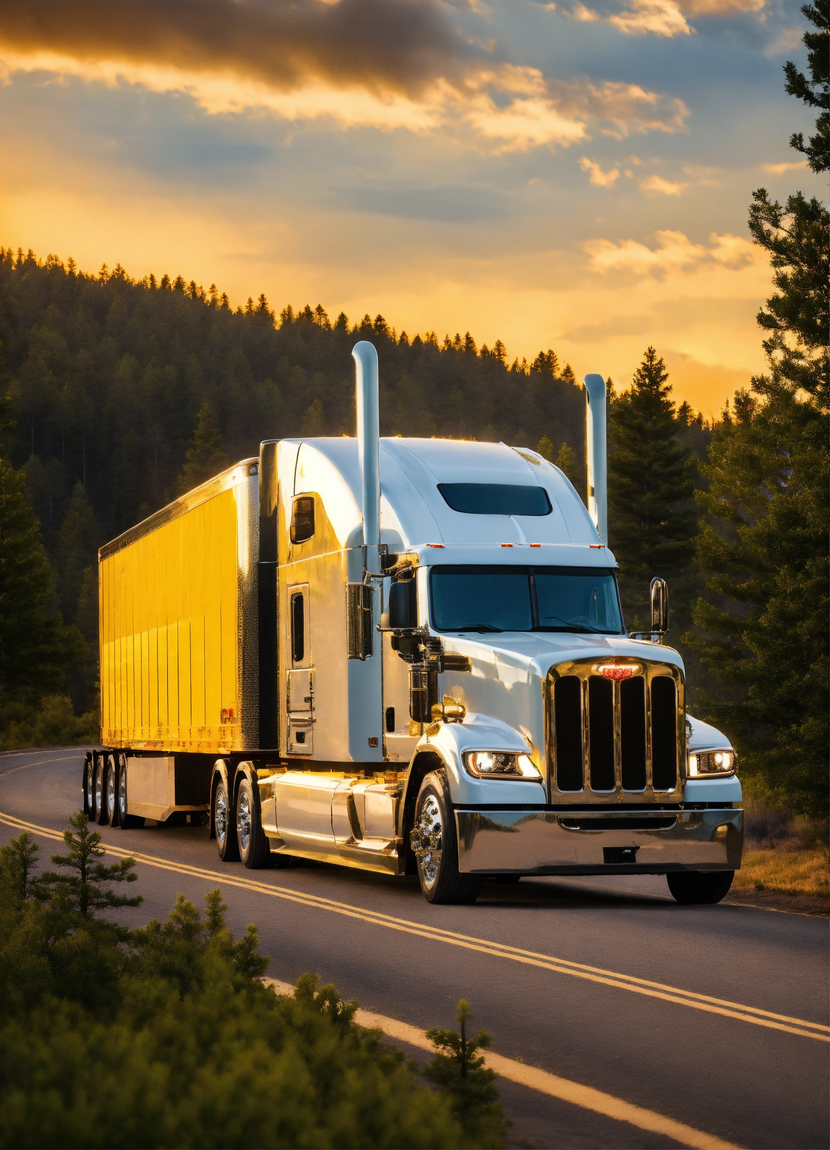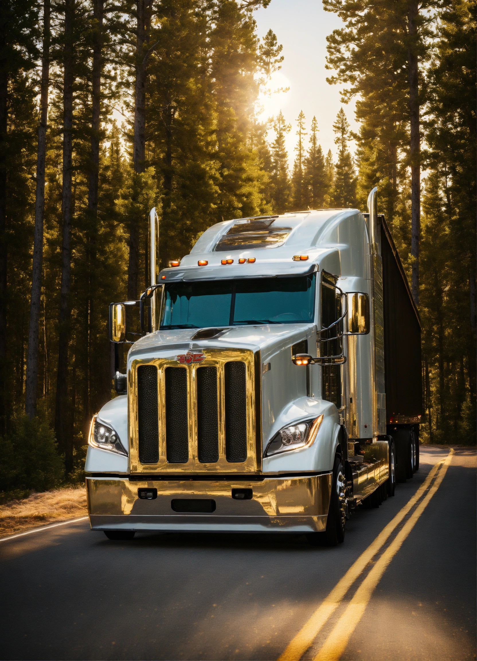 2023 peterbilt 579 white and gold trim with woodland pine trees landscape and golden moonlight landscape