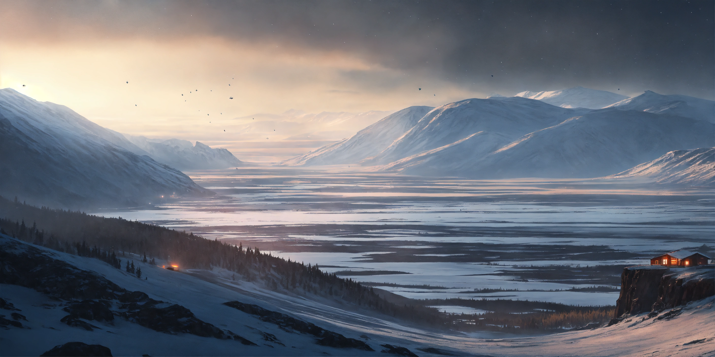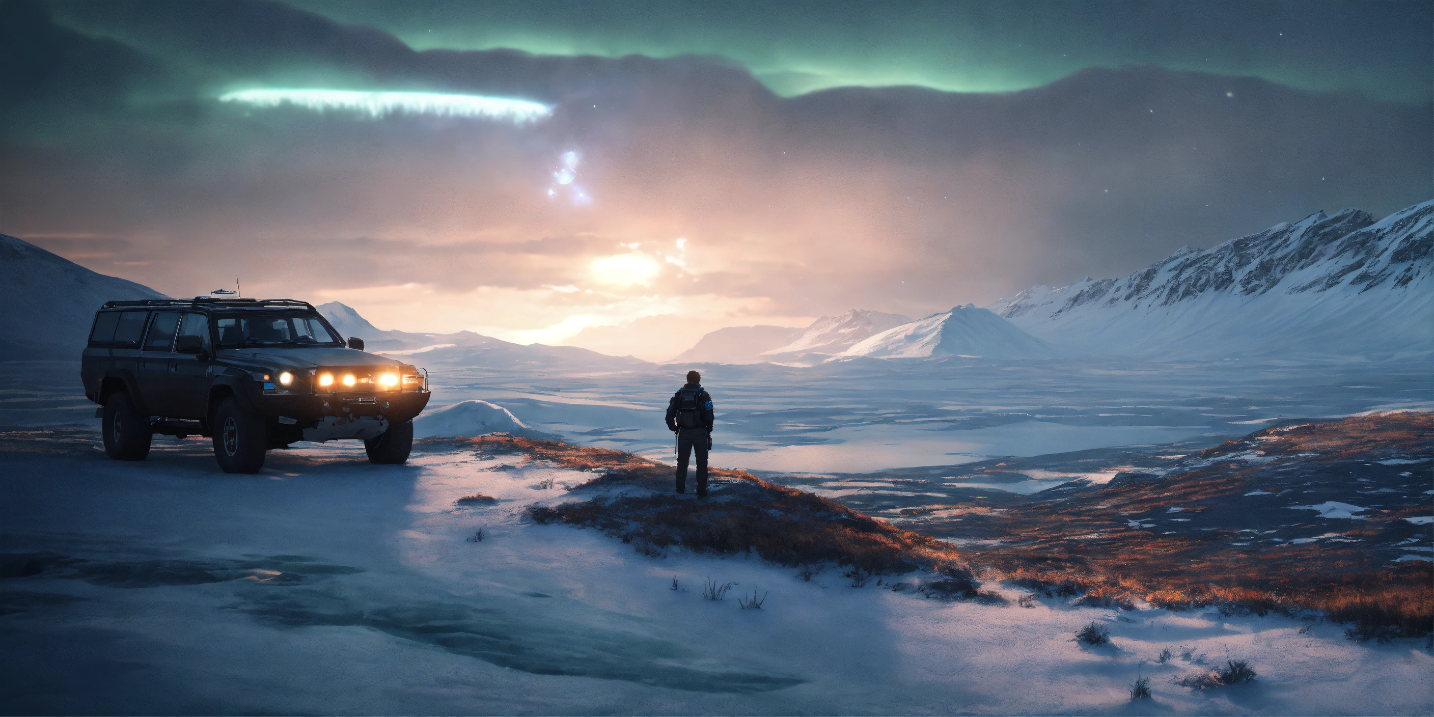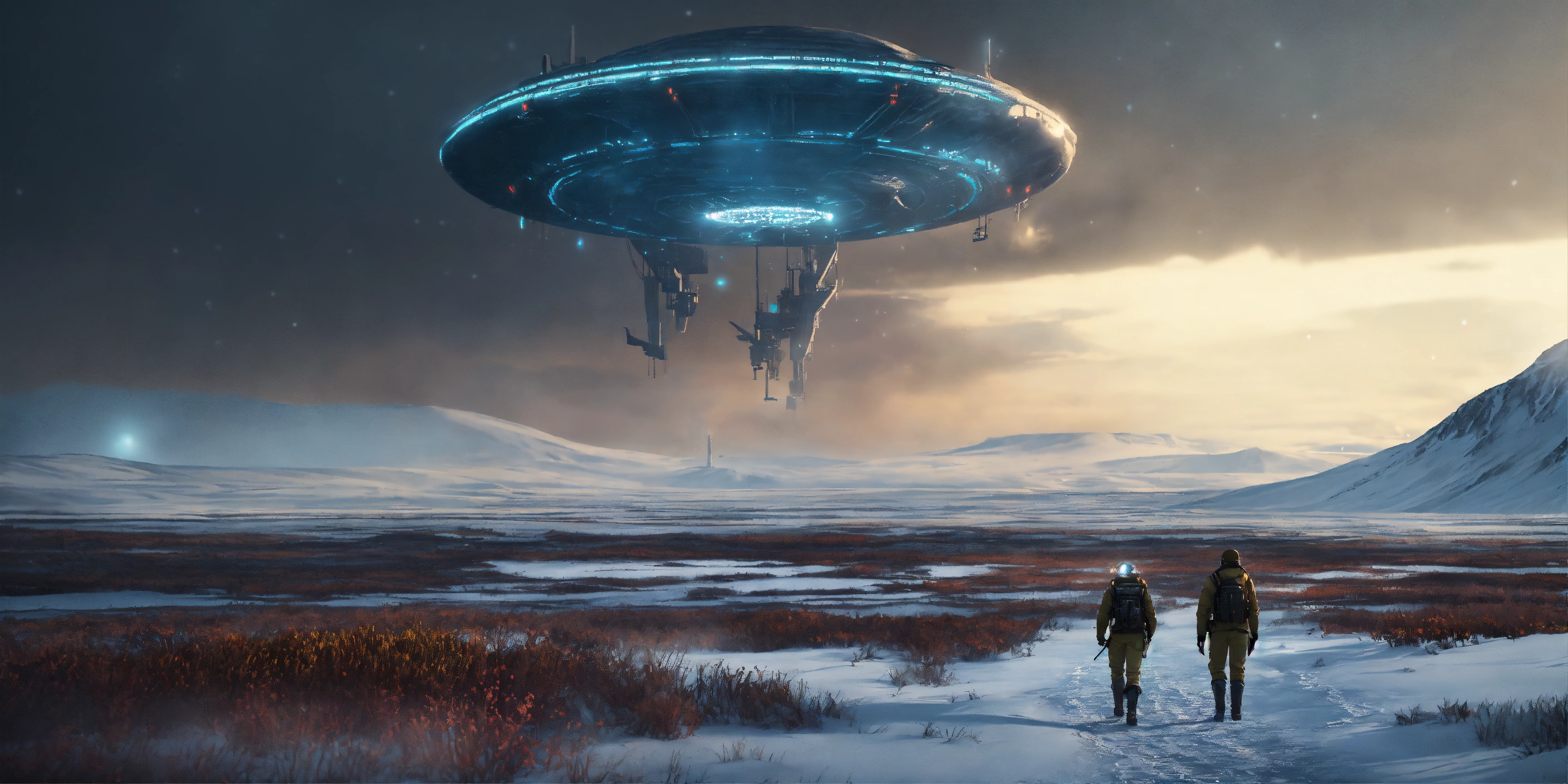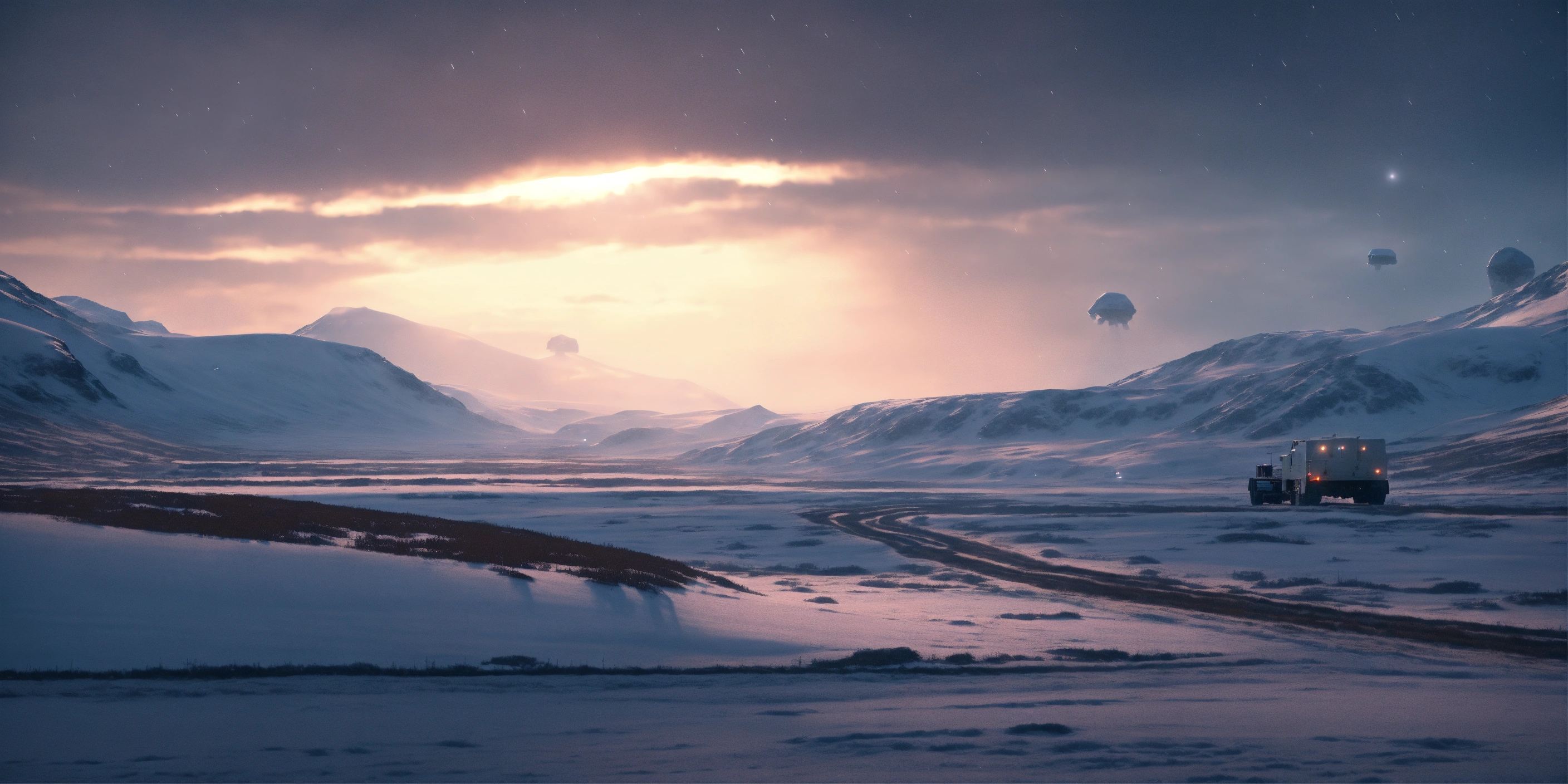 Step into cinematic world of an alien invasion where the line between human and artificial intelligence is blurred, and explore the vast and breathtaking landscapes of the arctic tundra that serve as the backdrop for this dark and introspective cinematic scene. photorealistic and highly detailed.