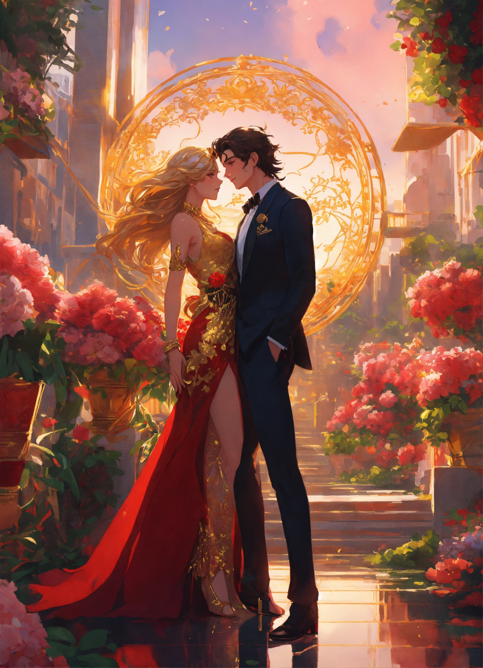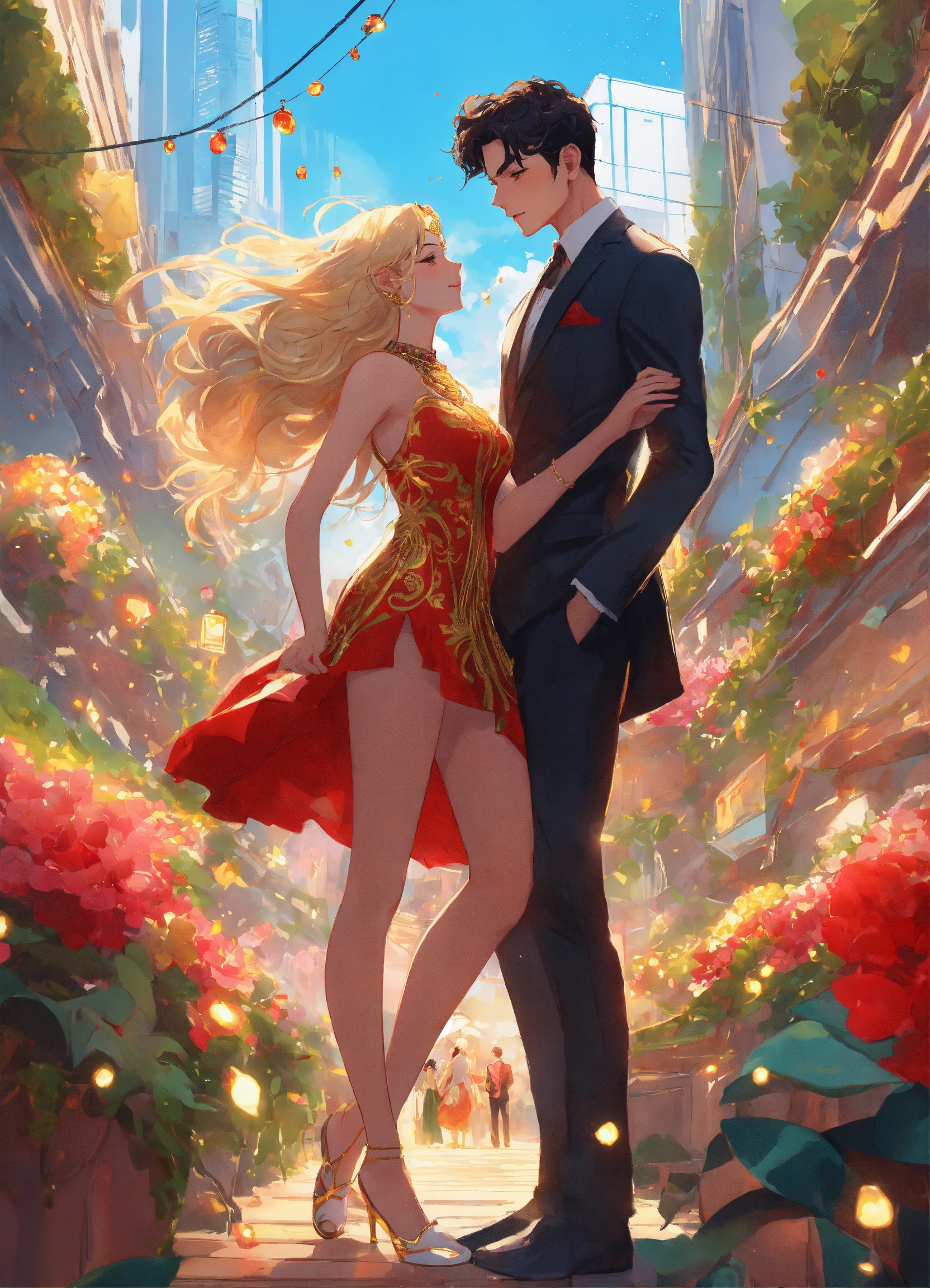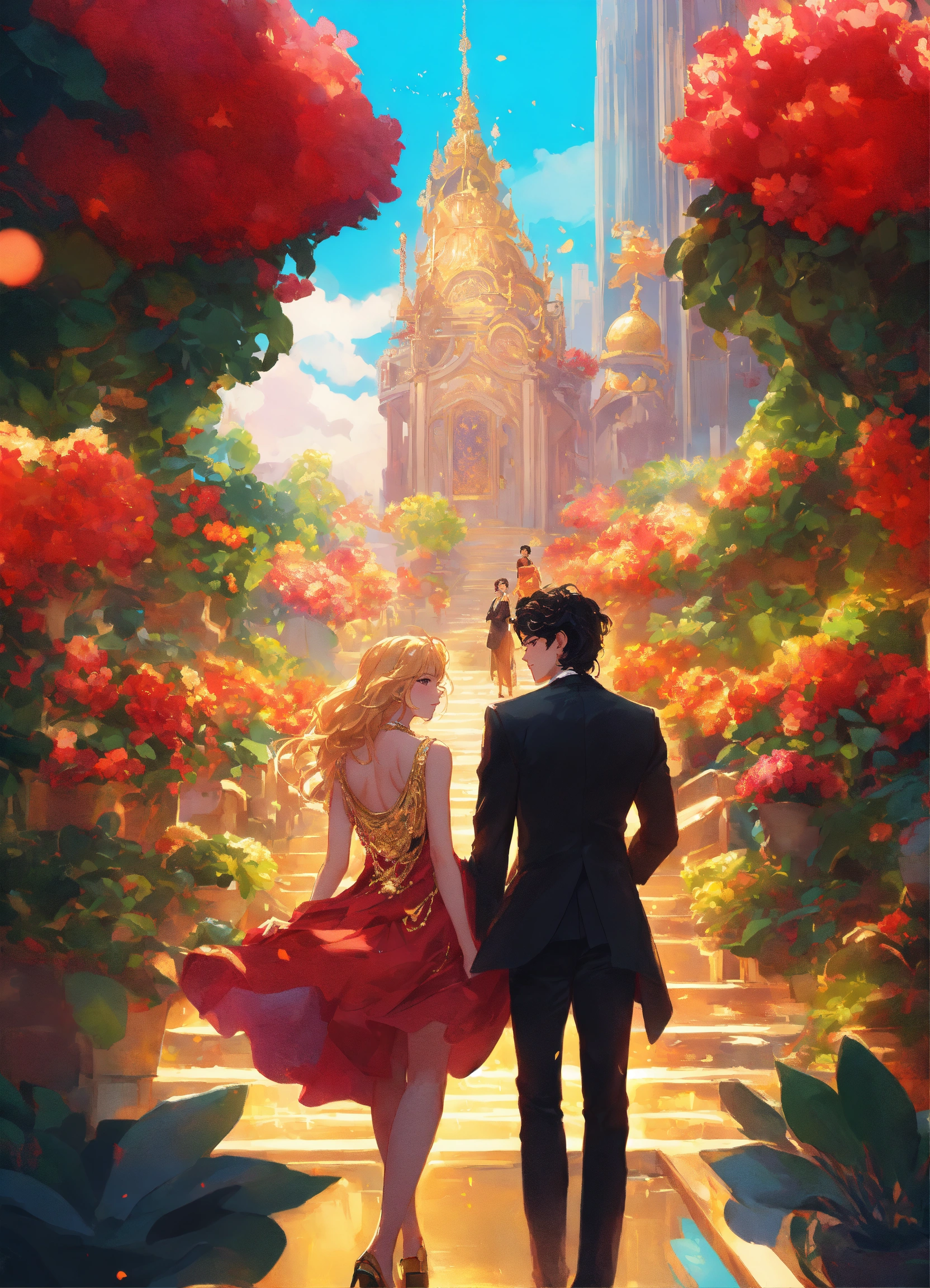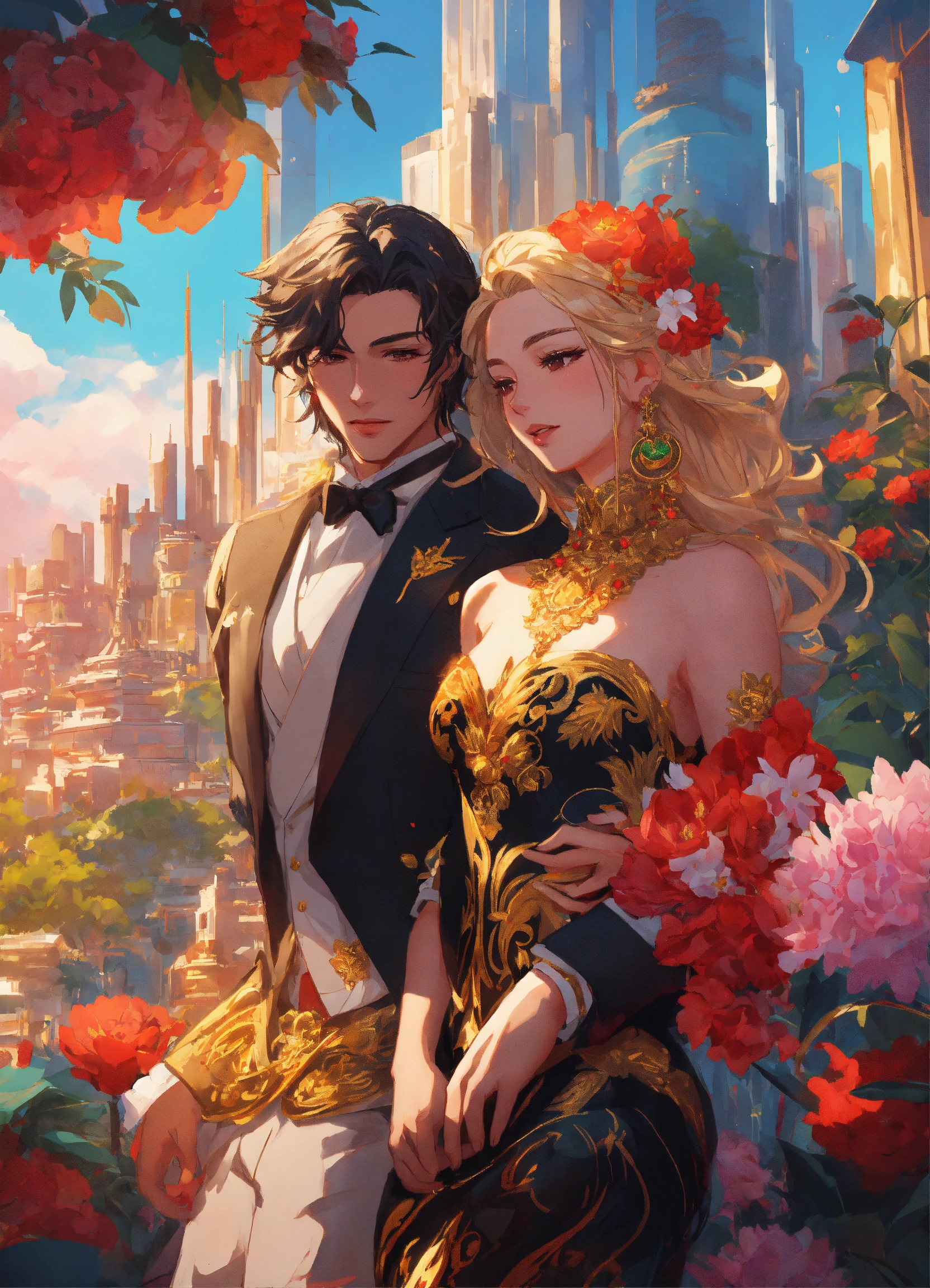 Illustration of beautiful city of towering skyscrapers, islands, vibrant colors, fair skin, the young man wears a intricate black suit with gold ornaments, has wavy black tousled hair, the golden haired woman wears a red intricate dress with gold adornments that shows legs, maximalist, 8k photo, animestyle, by artgerm, by rossdraws, trending on artstation, garden, windy, flowers, circular perspective, romantic, facing each other