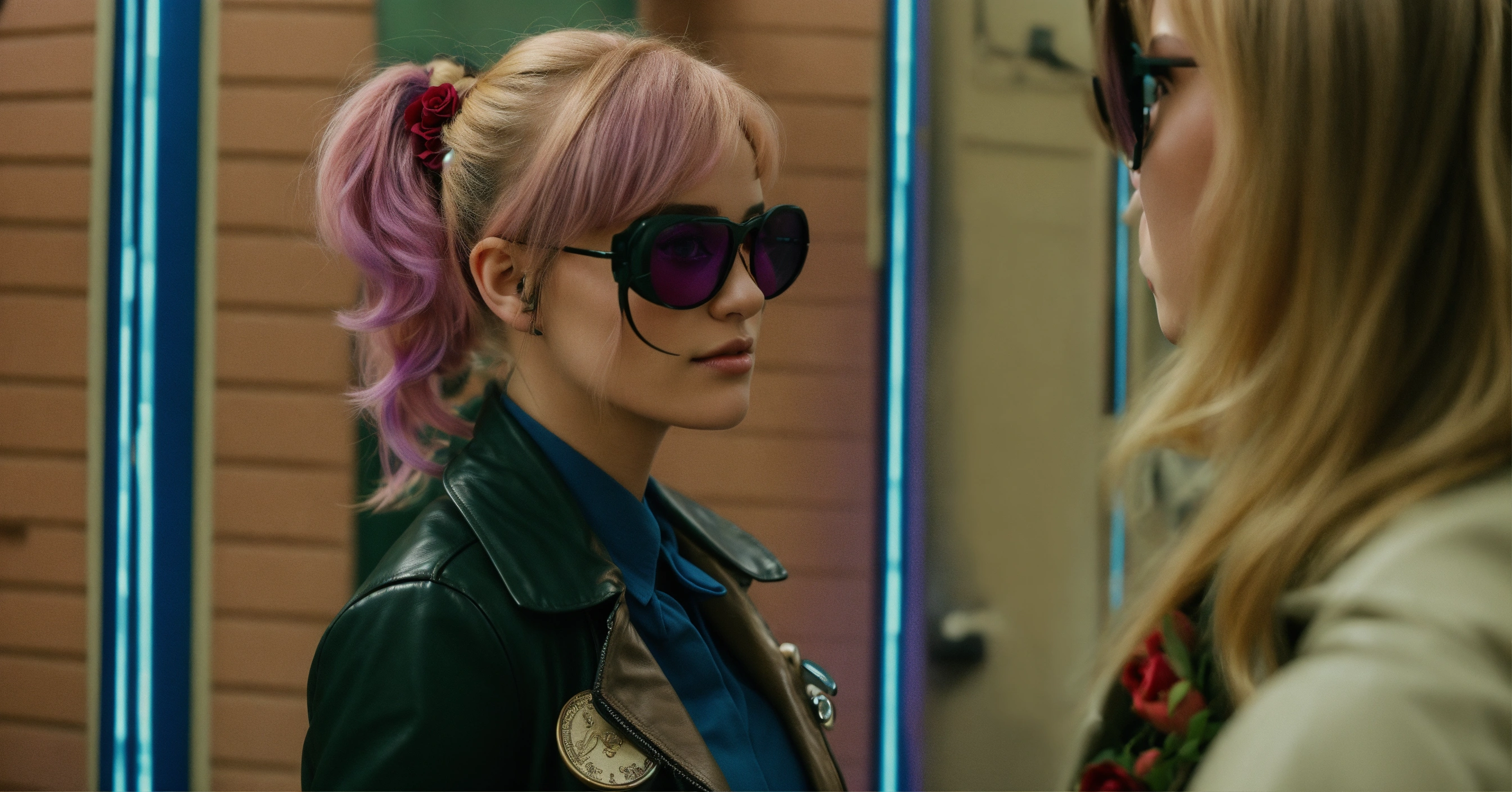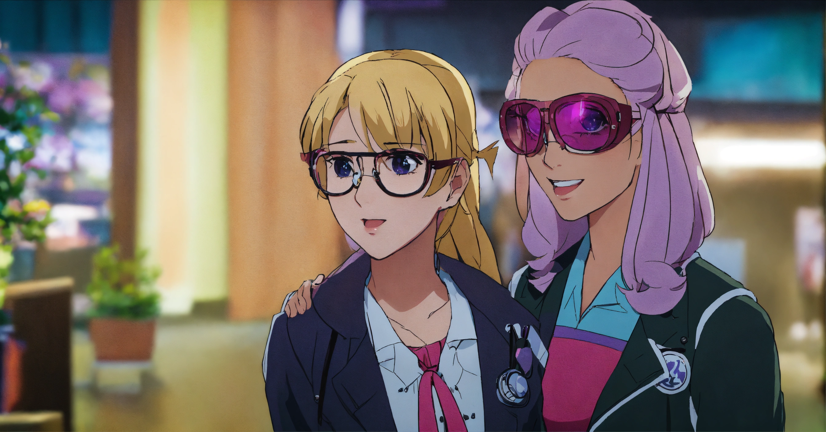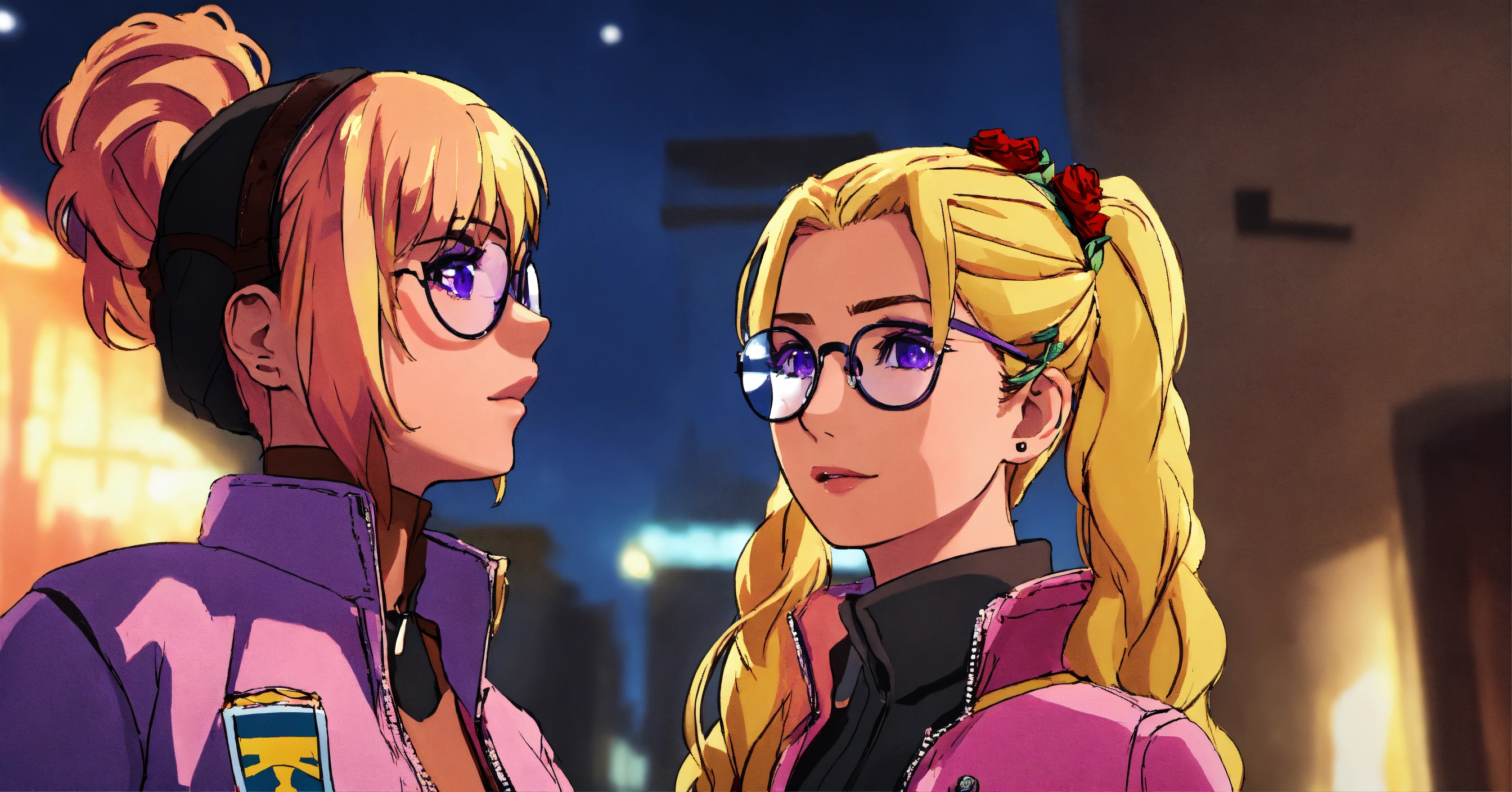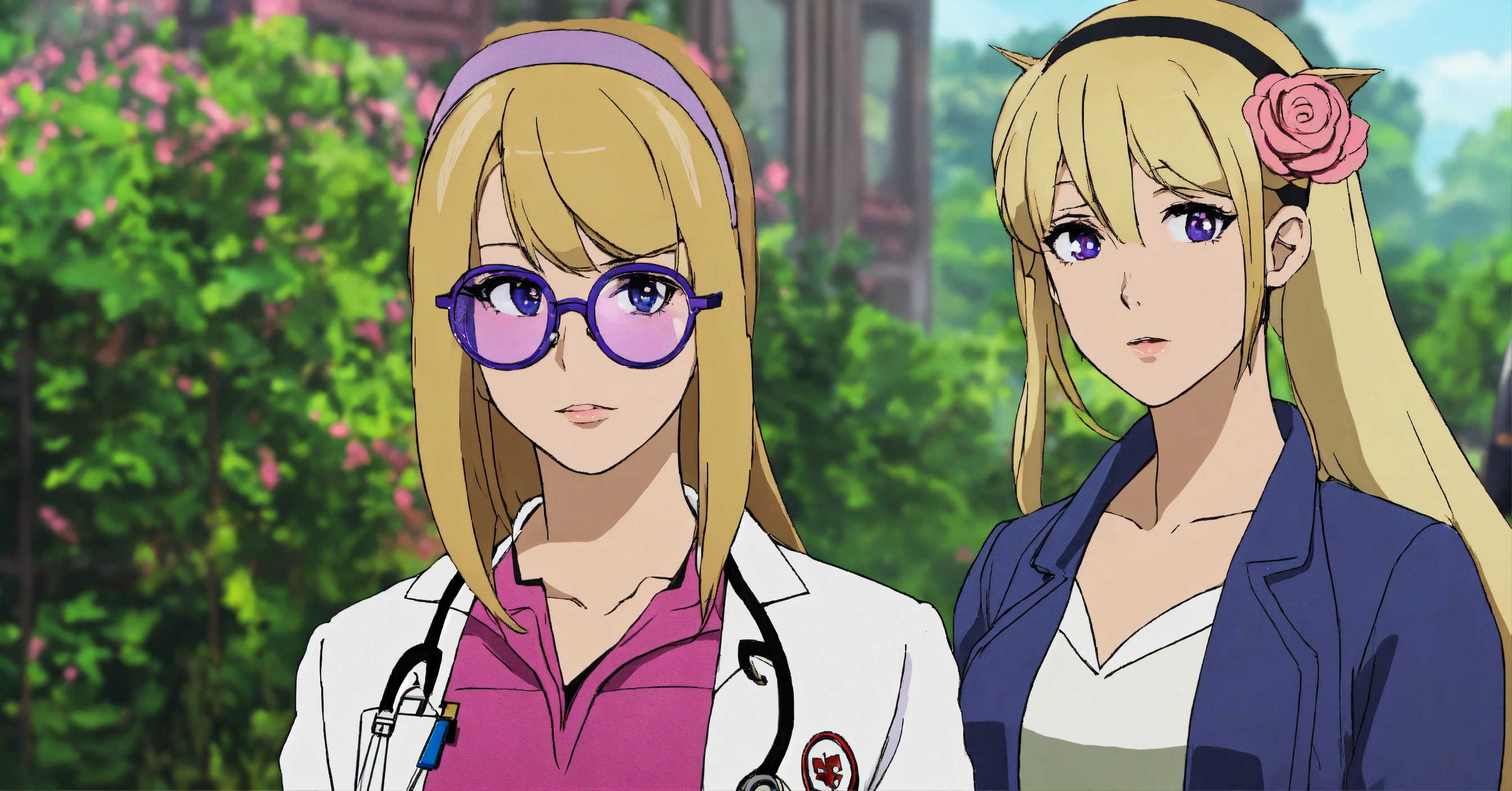 Two women standing next to each other. one is a blonde woman with her hair in a ponytail and a streak in the front, she is wearing a pair of aviator-style glasses with purple lenses and a leather jacket with roses at shoulder level. the second is a woman in a doctor's coat, long pink hair and a headband with cat ears, she wears glasses. the blonde girl doesn't have any accessories in her hair. in anime style.
