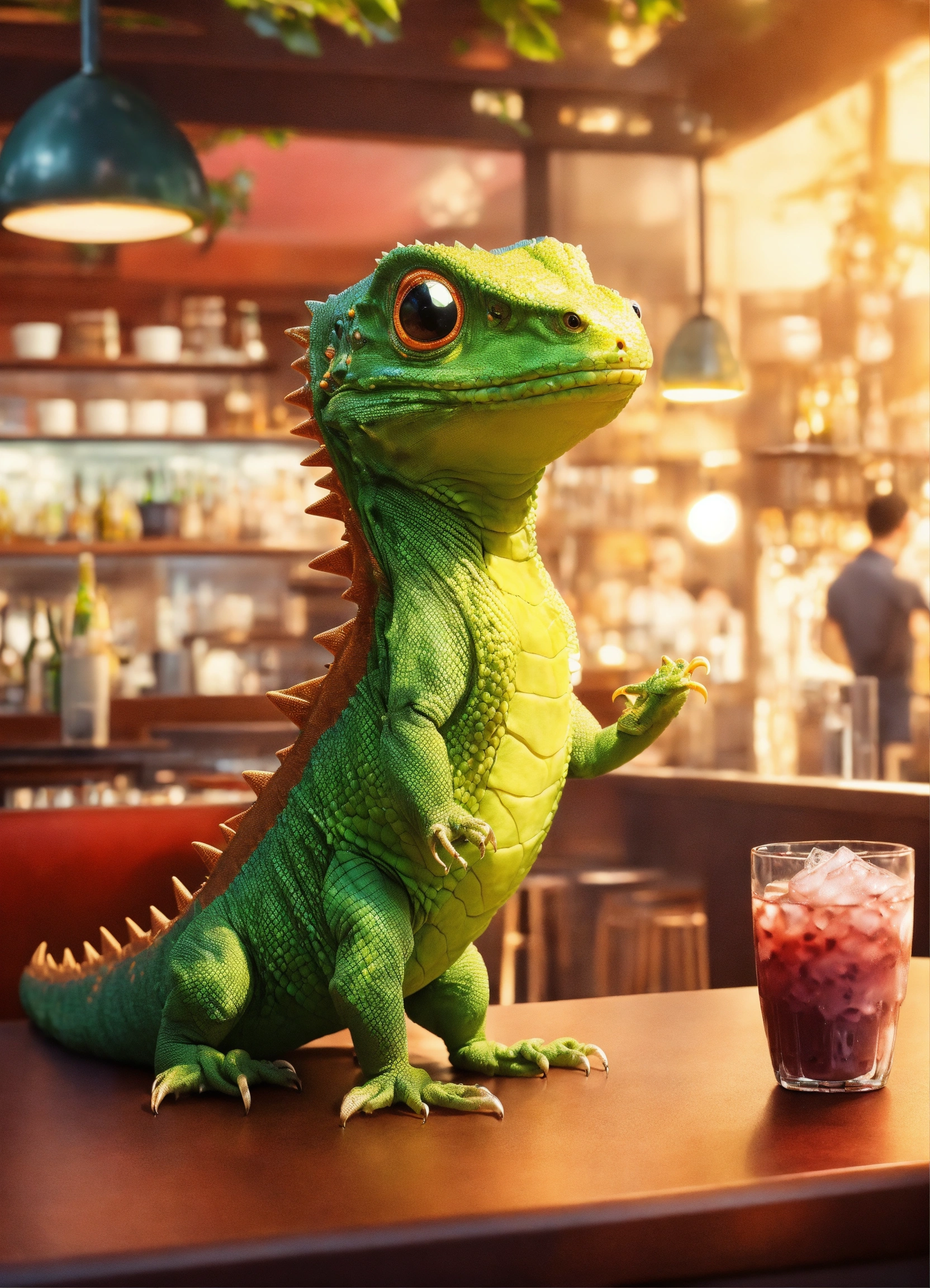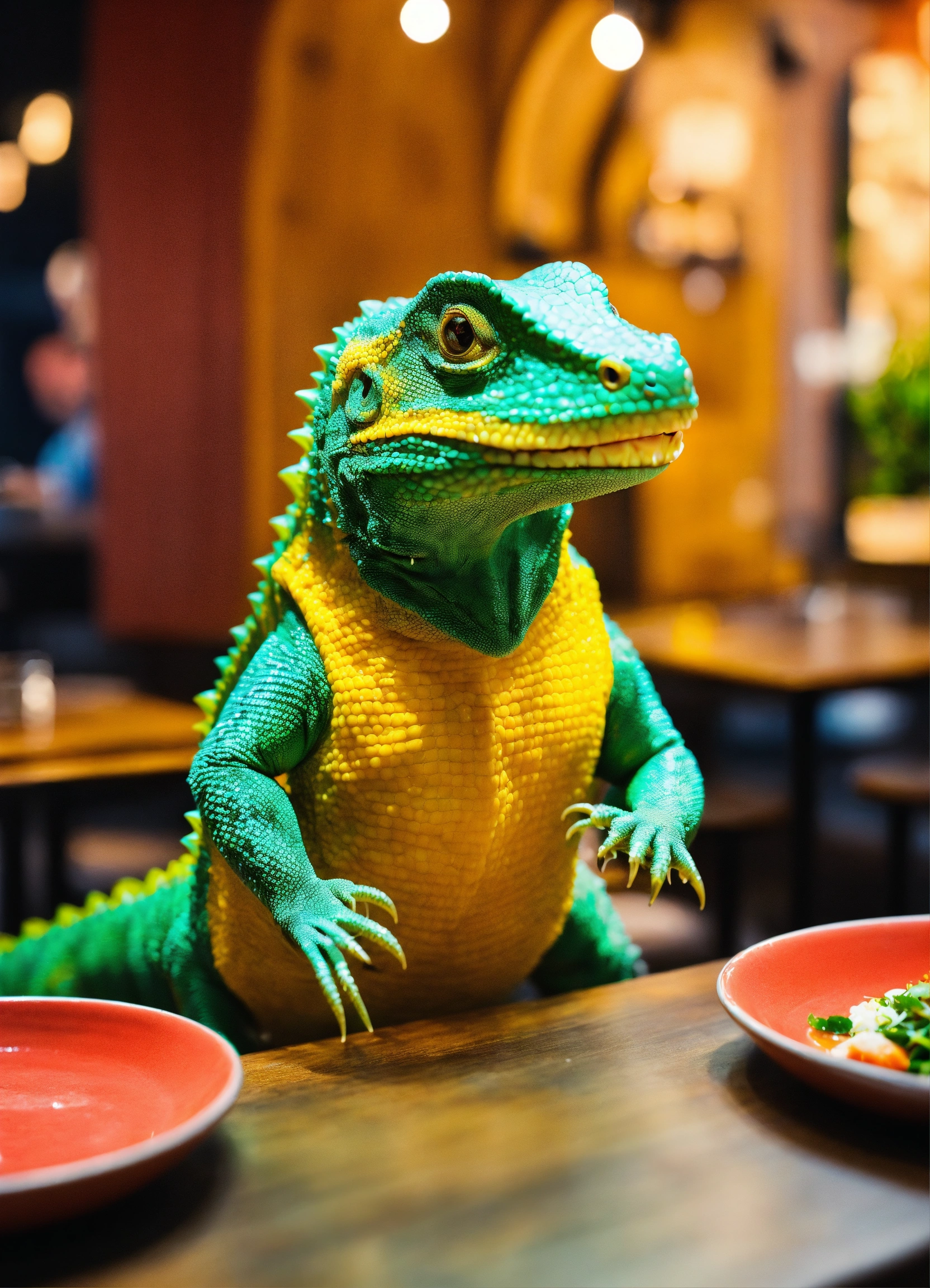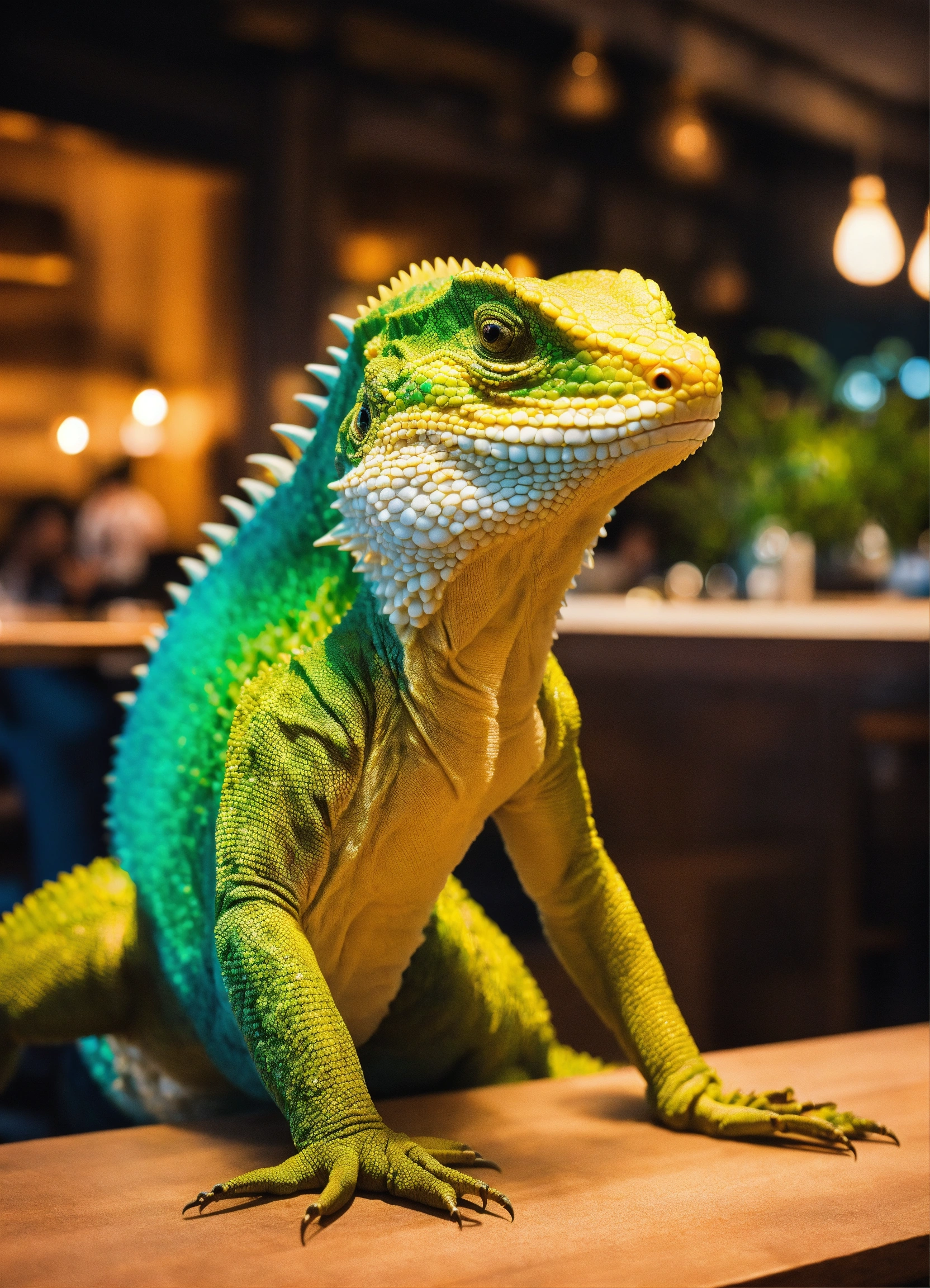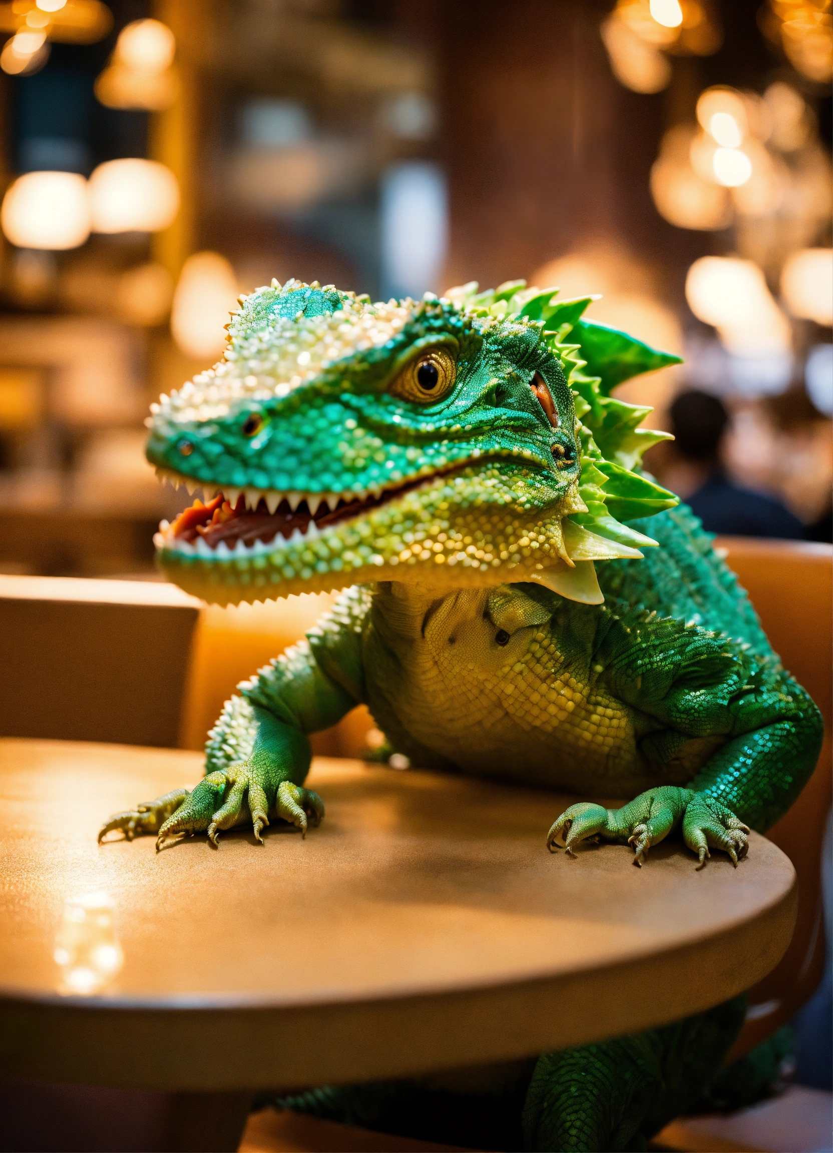 A cute and friendly big lizard, sparkling eyes, only mid upper body, inviting customers to a modern, instagramable restaurant with mouthwatering cuisine and beverages as its catchphrase, oriented to people who want to enjoy the time with friends and family.